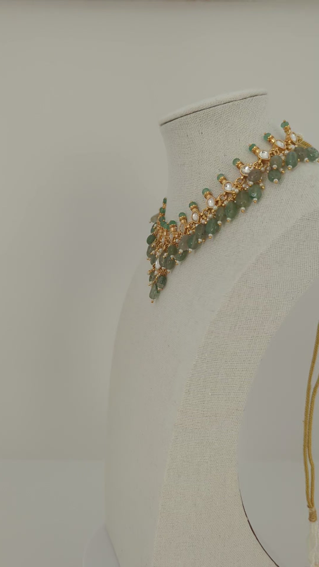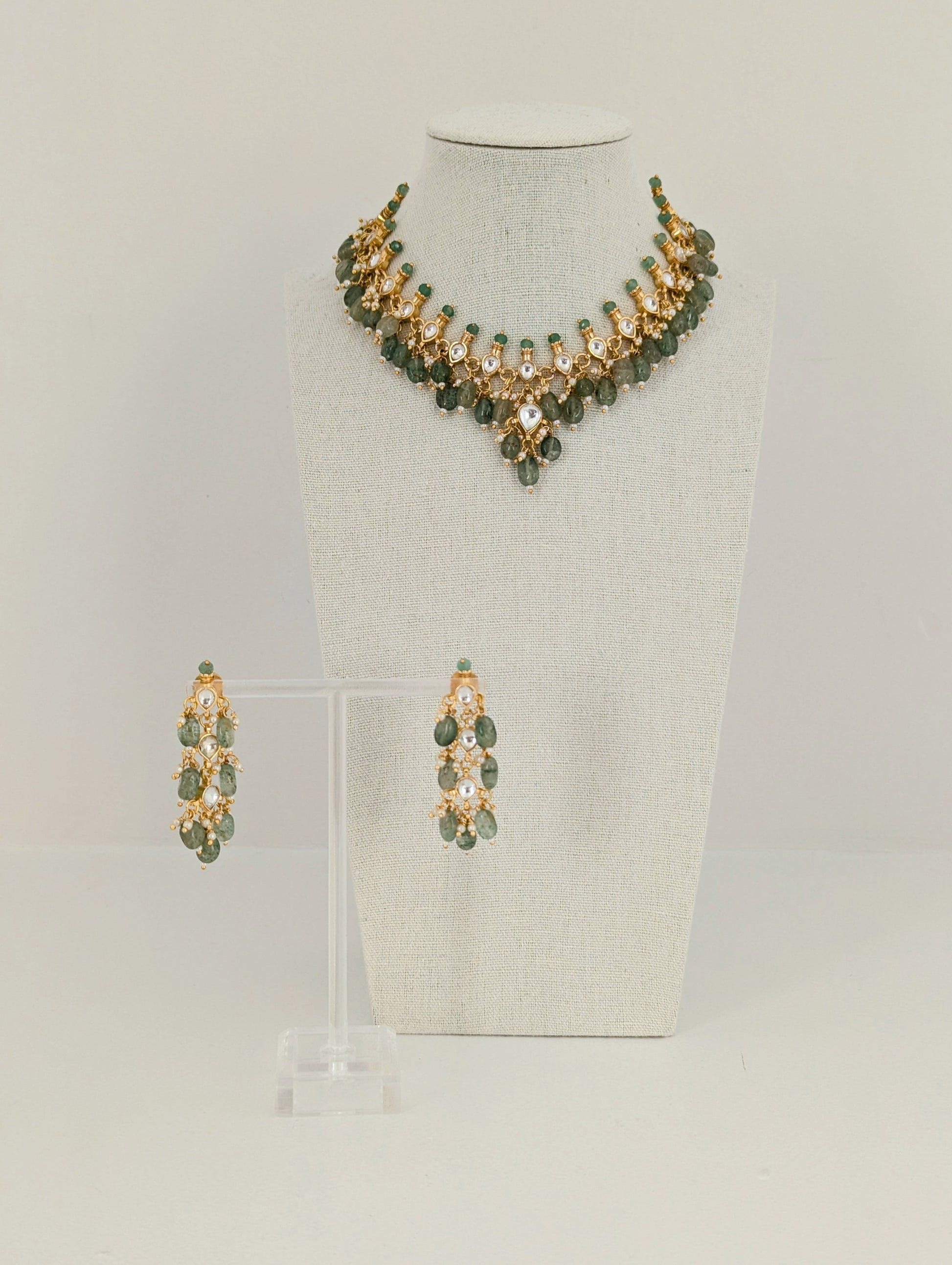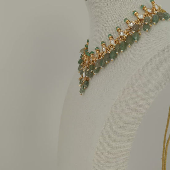 This jewelry set features a stunning choker-style necklace with intricate kundan work, adorned with deep green beads and teardrop drops that create a rich layered effect. Paired with matching cascading earrings, the set blends traditional elegance with a bold, regal charm—perfect for festive and formal occasions.