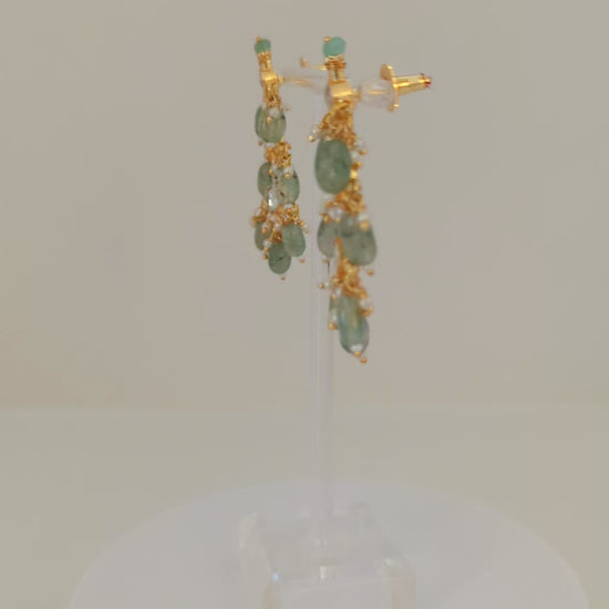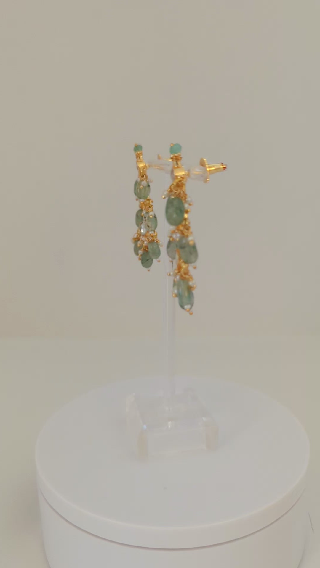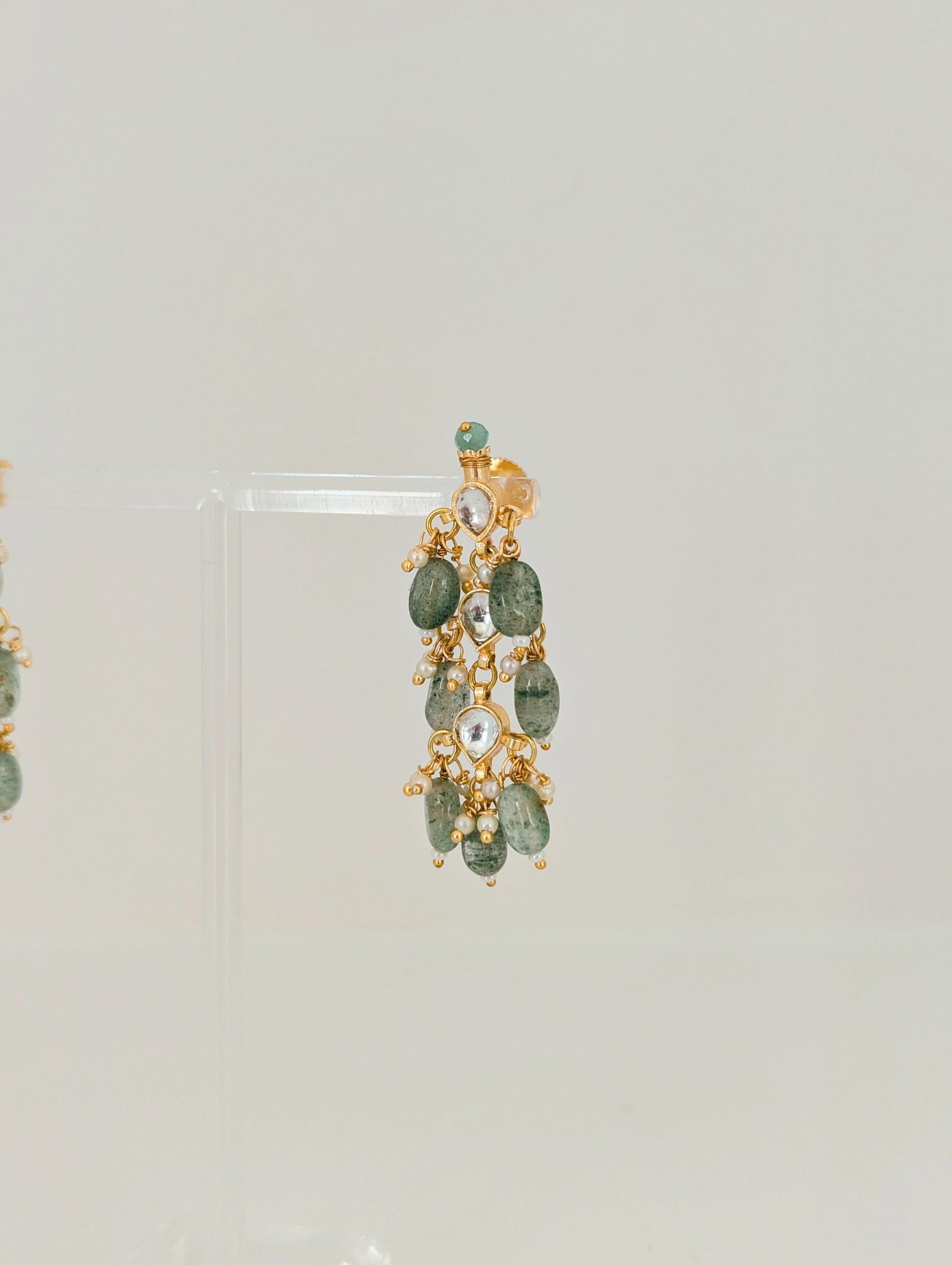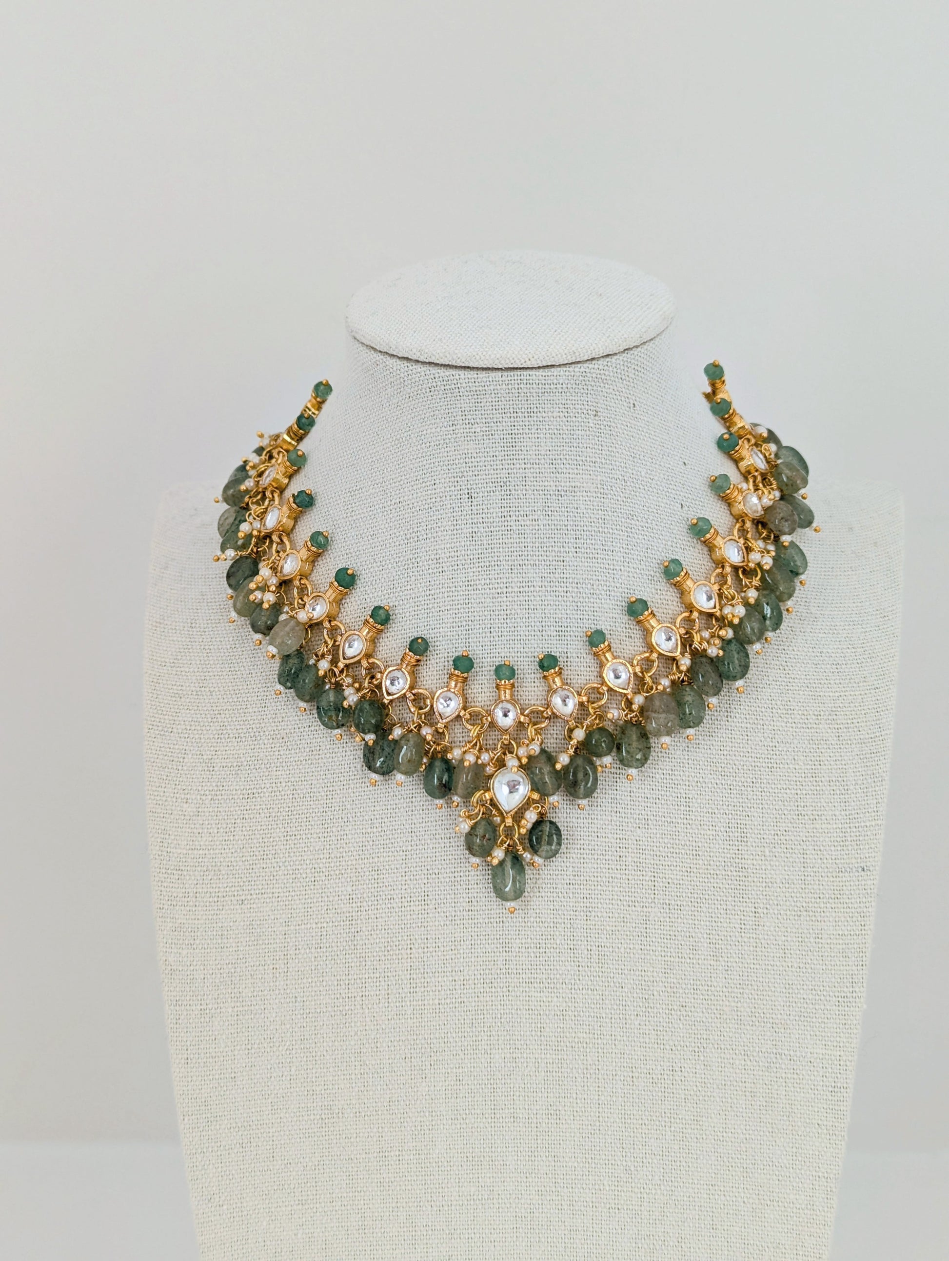 This jewelry set features a stunning choker-style necklace with intricate kundan work, adorned with deep green beads and teardrop drops that create a rich layered effect. Paired with matching cascading earrings, the set blends traditional elegance with a bold, regal charm—perfect for festive and formal occasions.