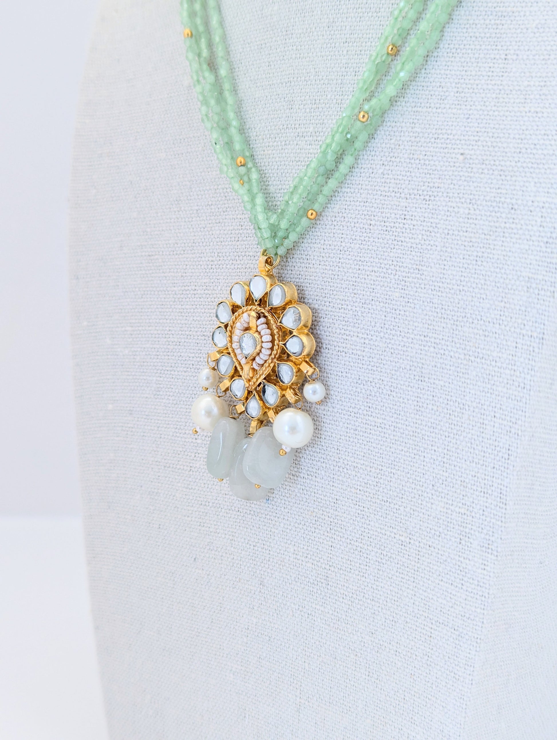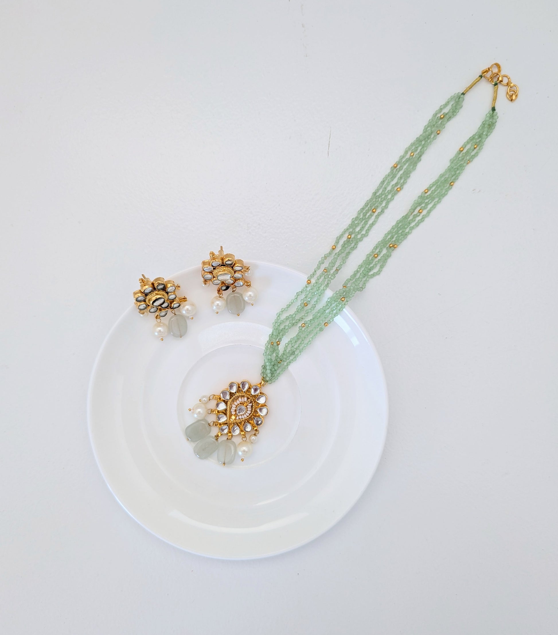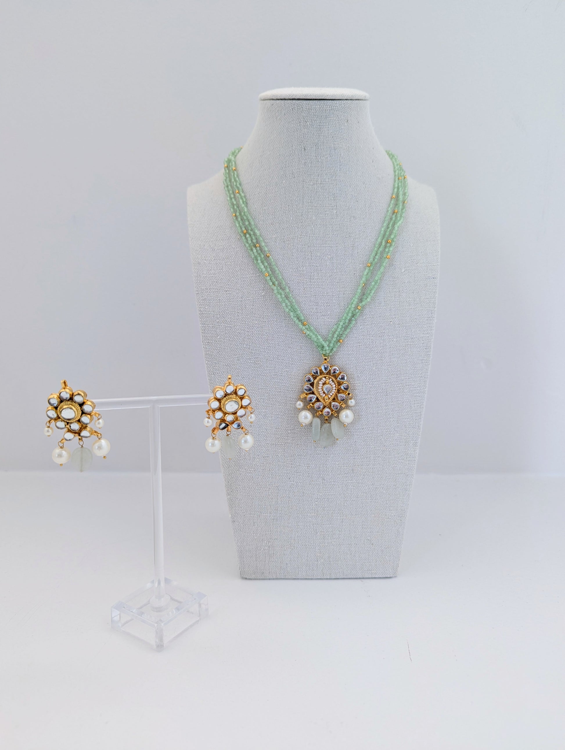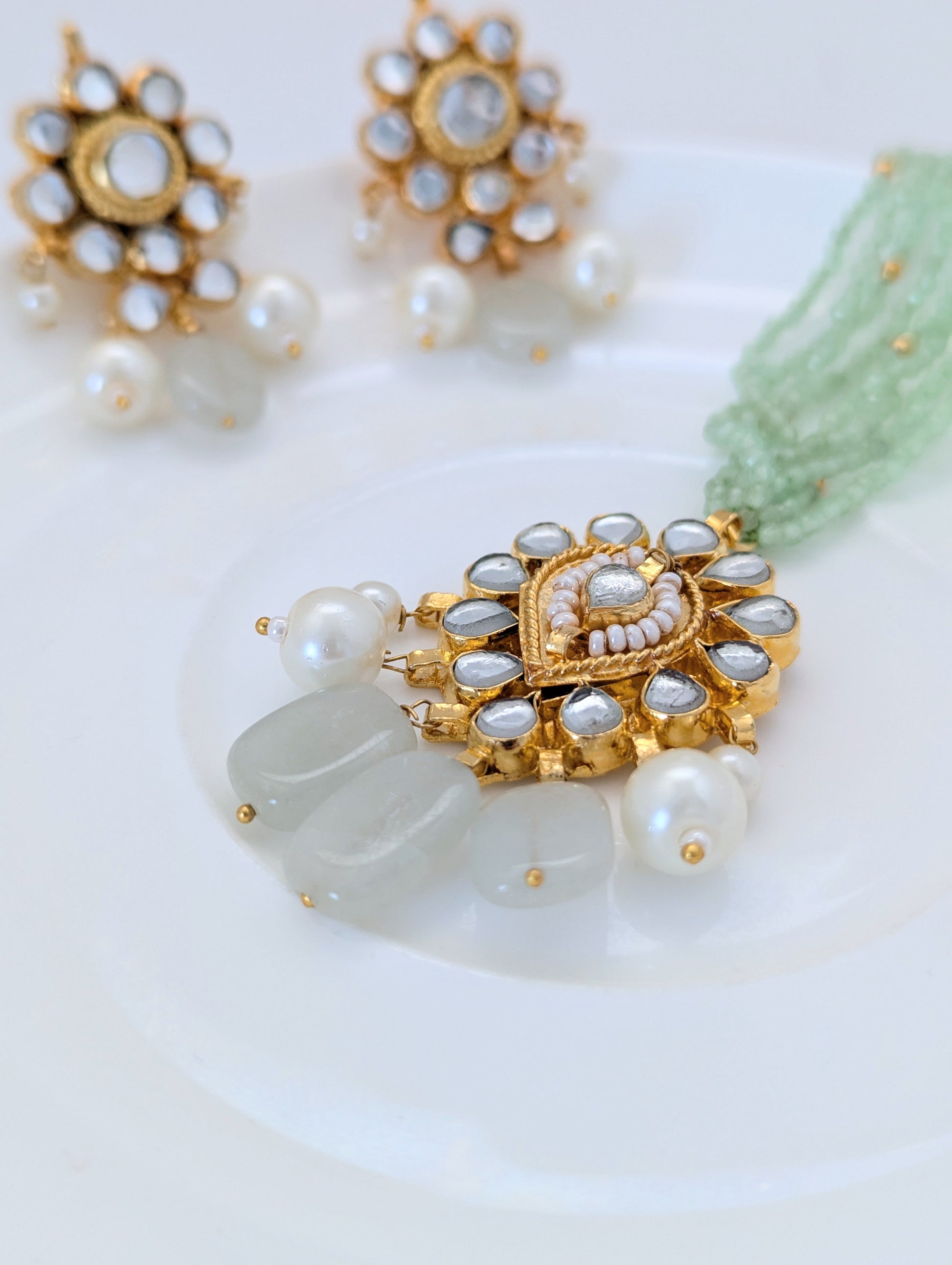 This elegant jewelry set features a stunning traditional design with intricate gold-tone detailing. The centerpiece is a pendant necklace adorned with delicate mint green beads, accented by small golden spacers, and finished with a striking pendant. The pendant showcases a combination of white kundan-style stones, pearls, and light green gemstone drops. The matching earrings mirror the pendant’s floral motif, embellished with similar kundan stones, pearls, and green stone drops, creating a harmonious and graceful set ideal for festive occasions or traditional attire.