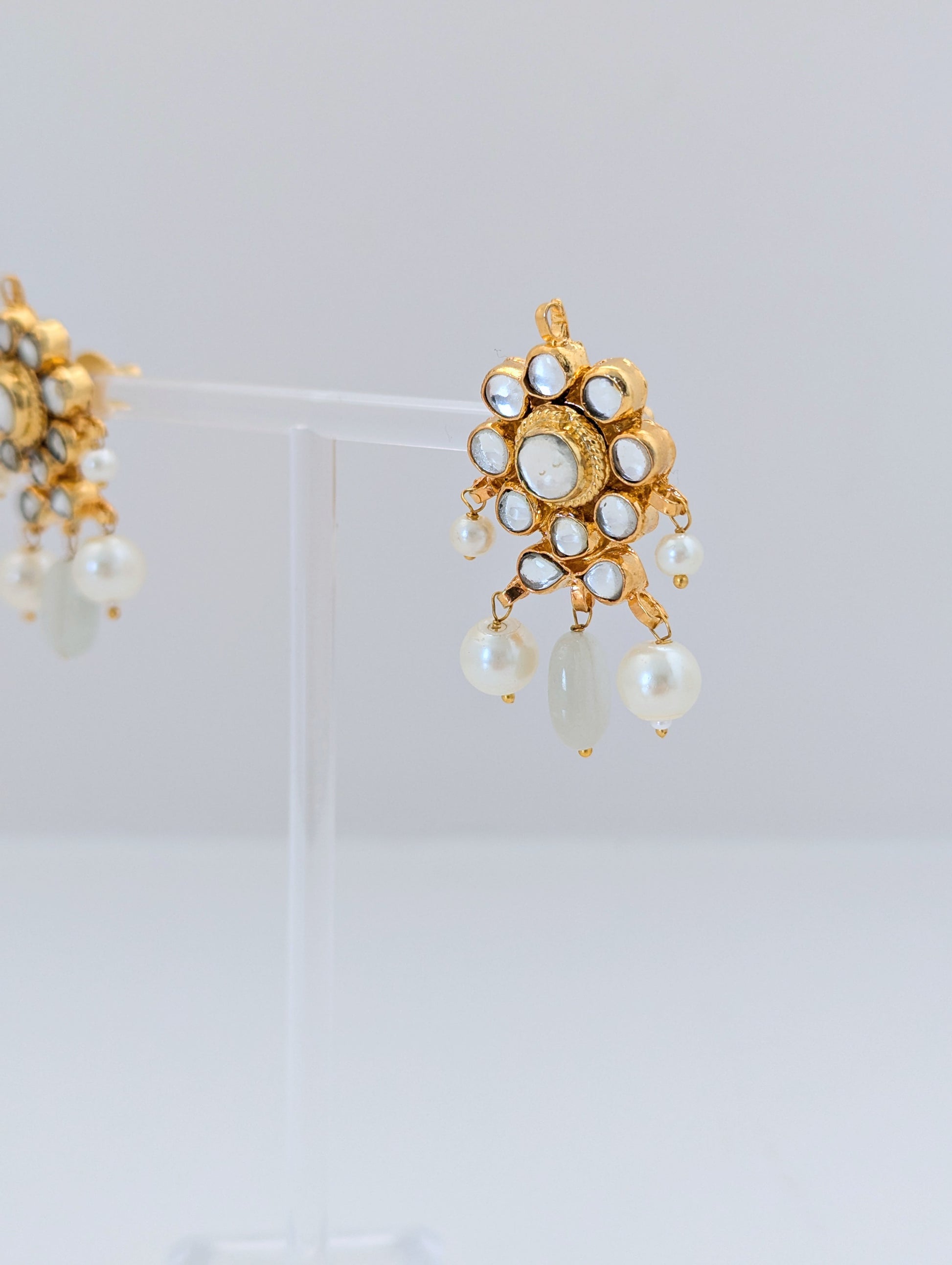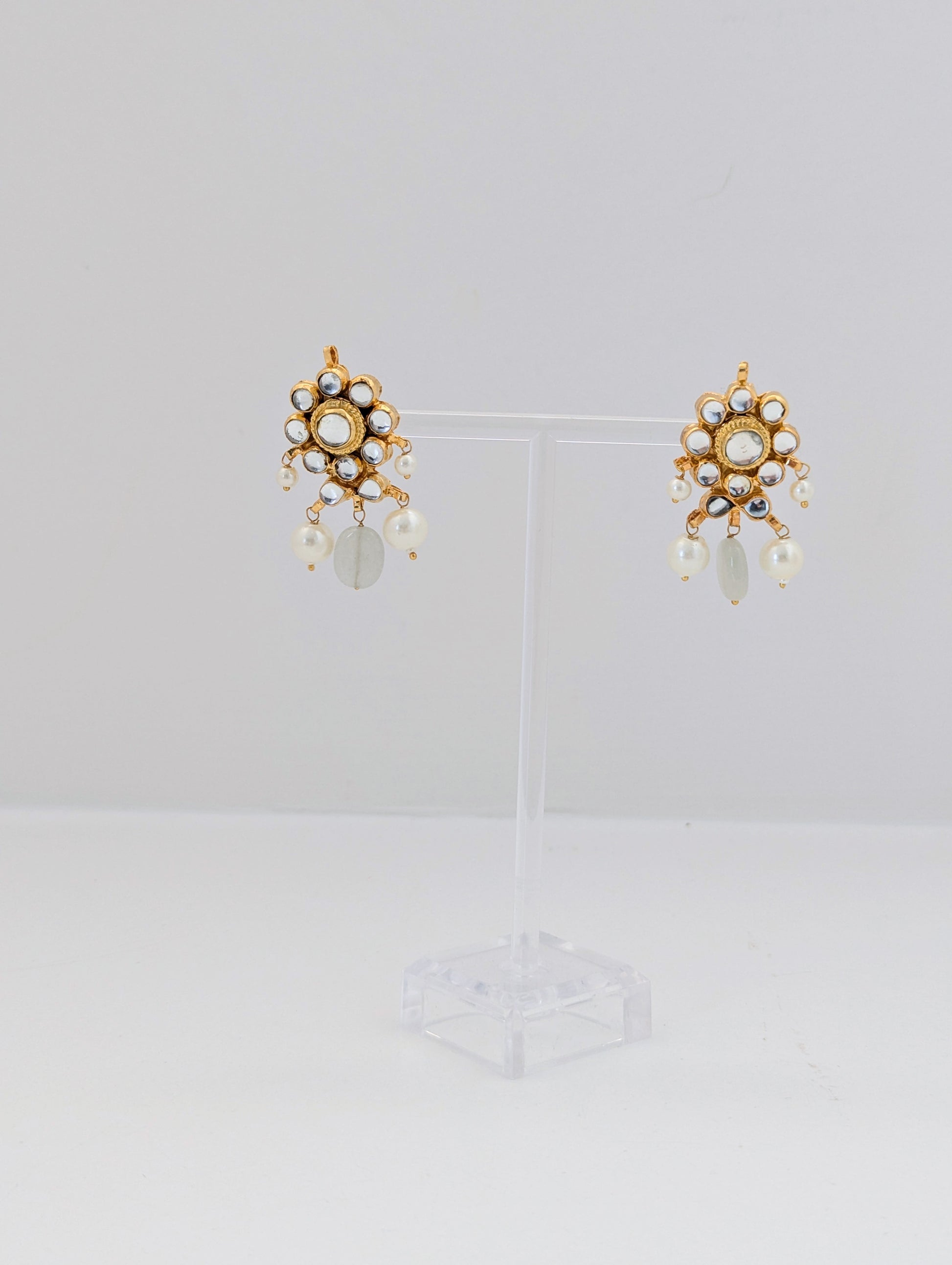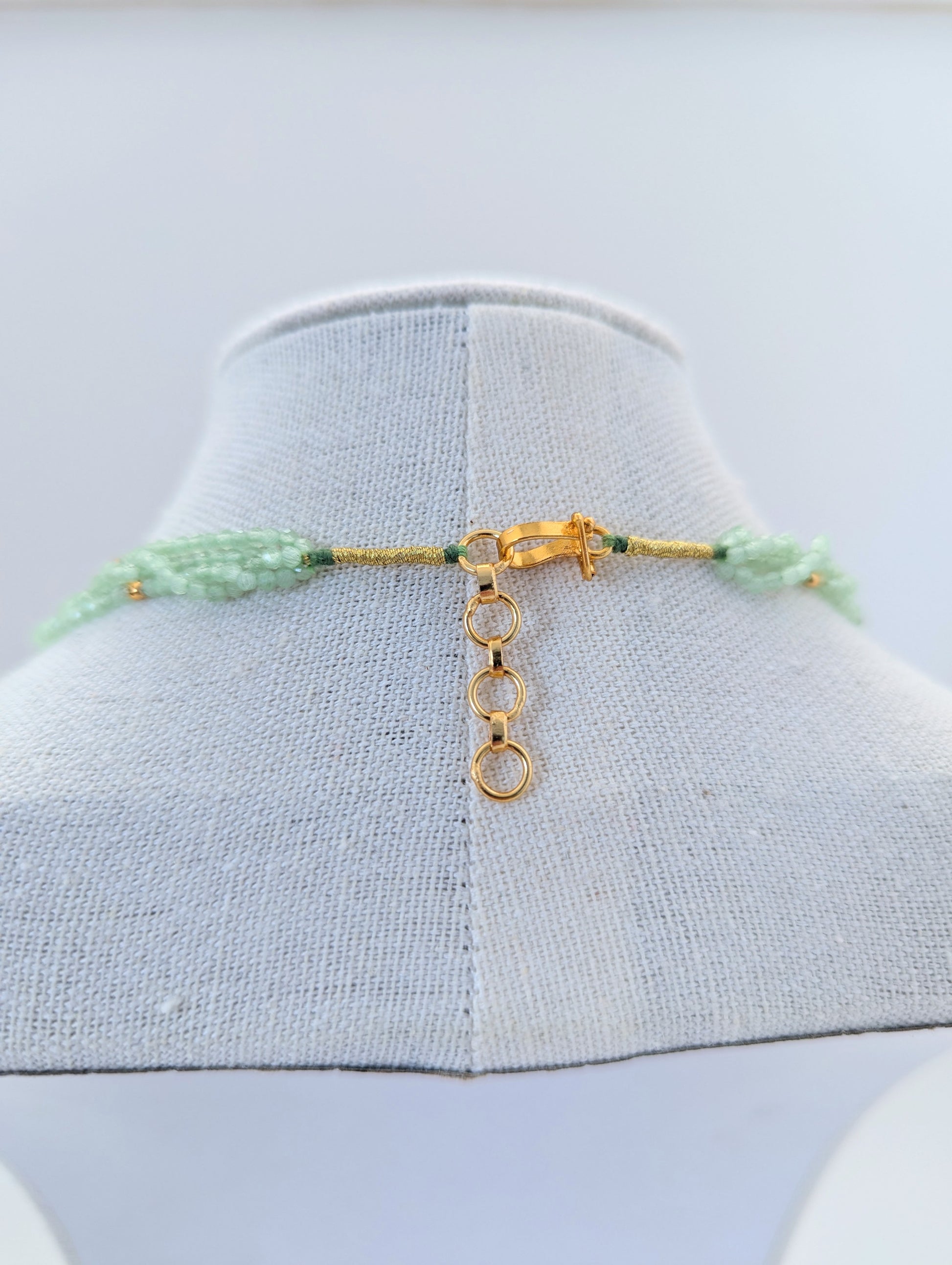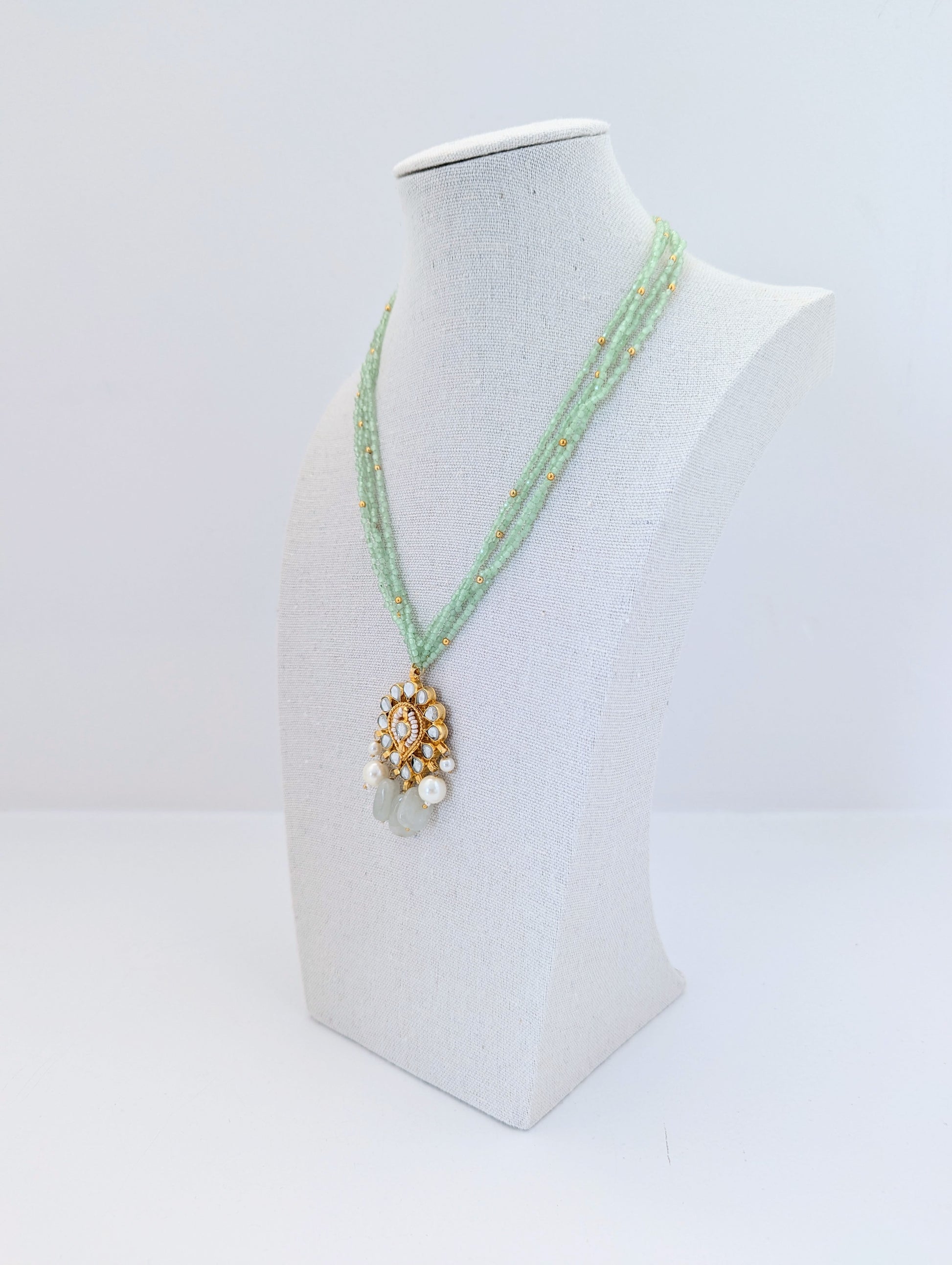This elegant jewelry set features a stunning traditional design with intricate gold-tone detailing. The centerpiece is a pendant necklace adorned with delicate mint green beads, accented by small golden spacers, and finished with a striking pendant. The pendant showcases a combination of white kundan-style stones, pearls, and light green gemstone drops. The matching earrings mirror the pendant’s floral motif, embellished with similar kundan stones, pearls, and green stone drops, creating a harmonious and graceful set ideal for festive occasions or traditional attire.
