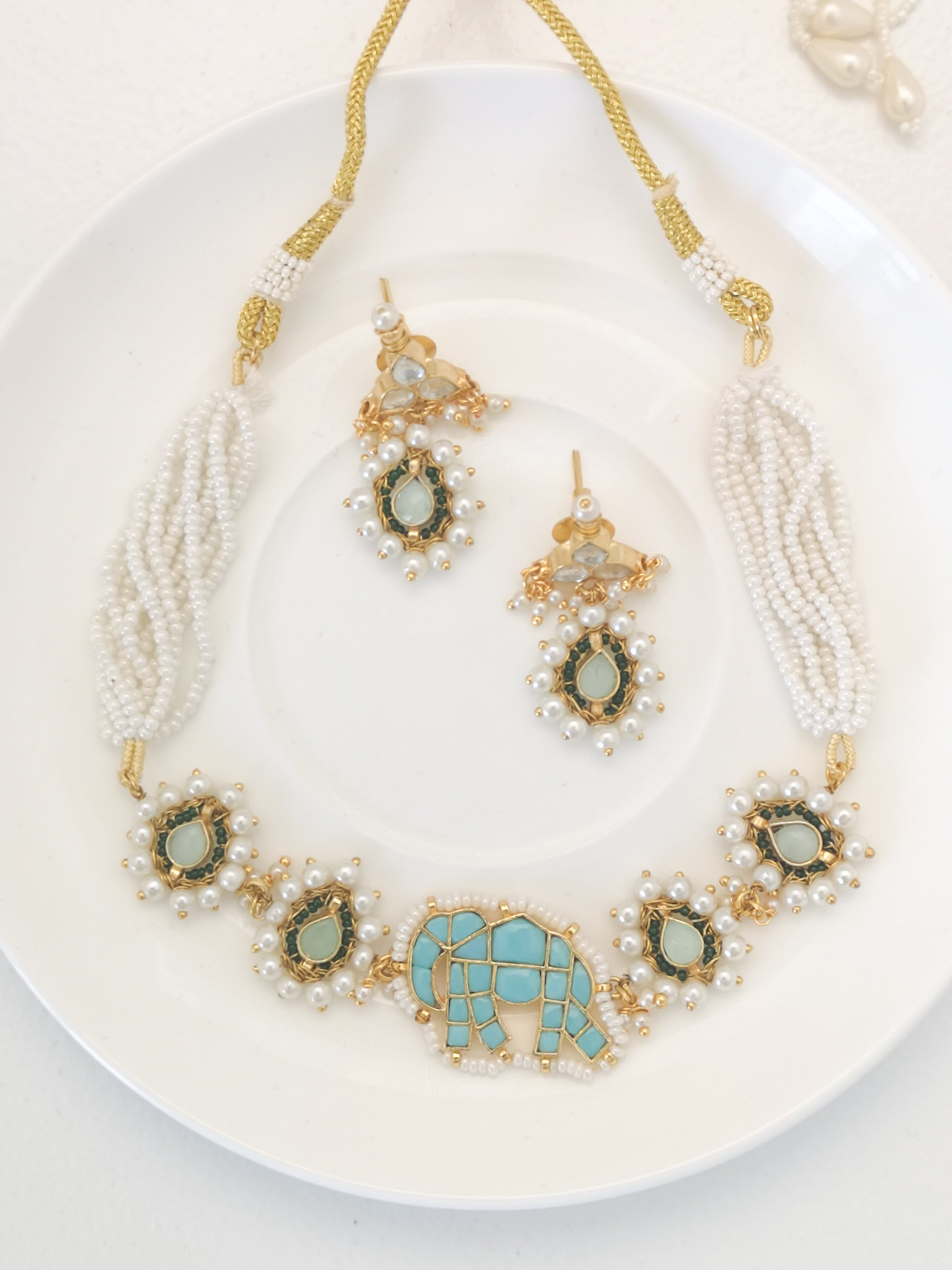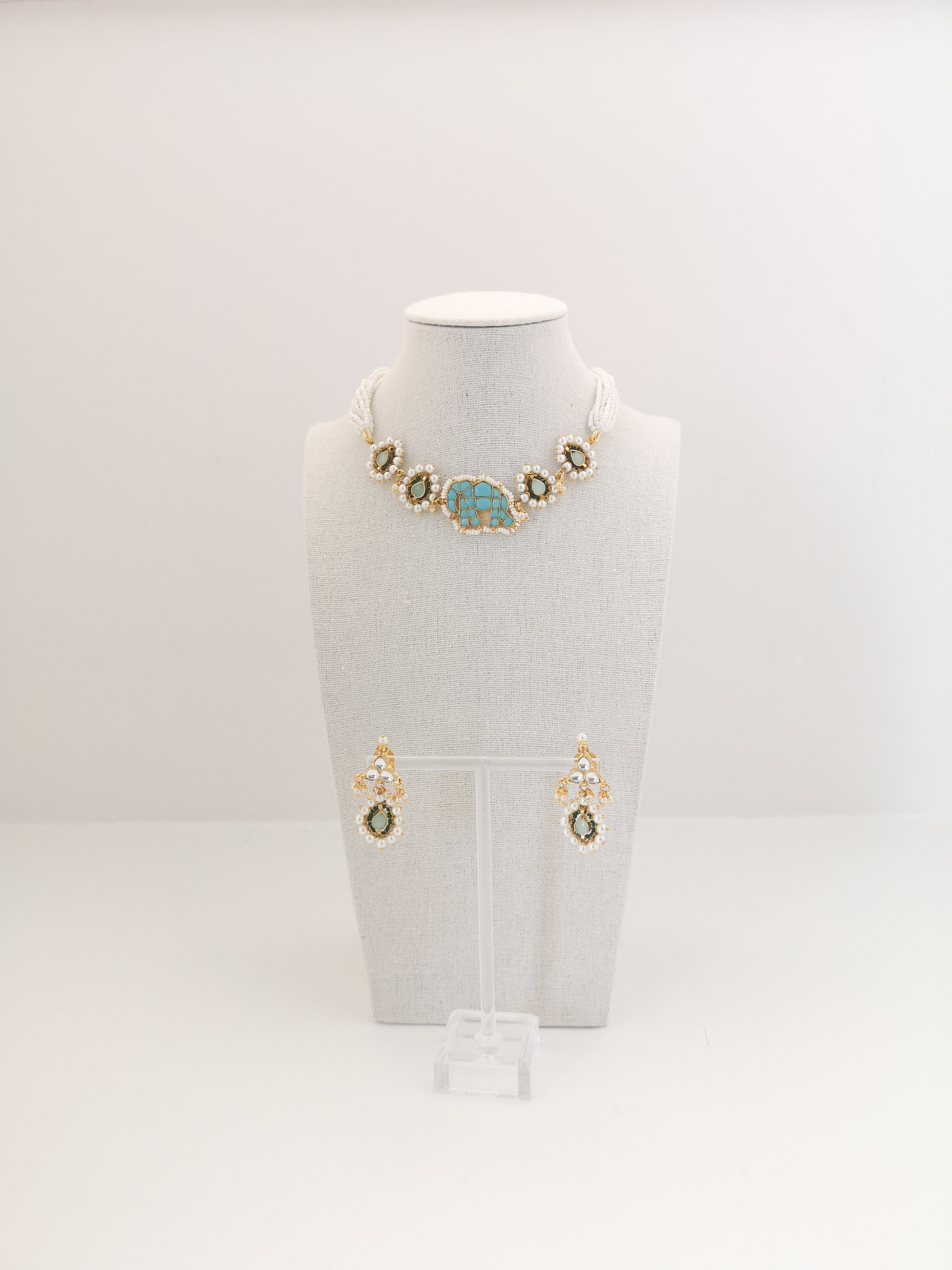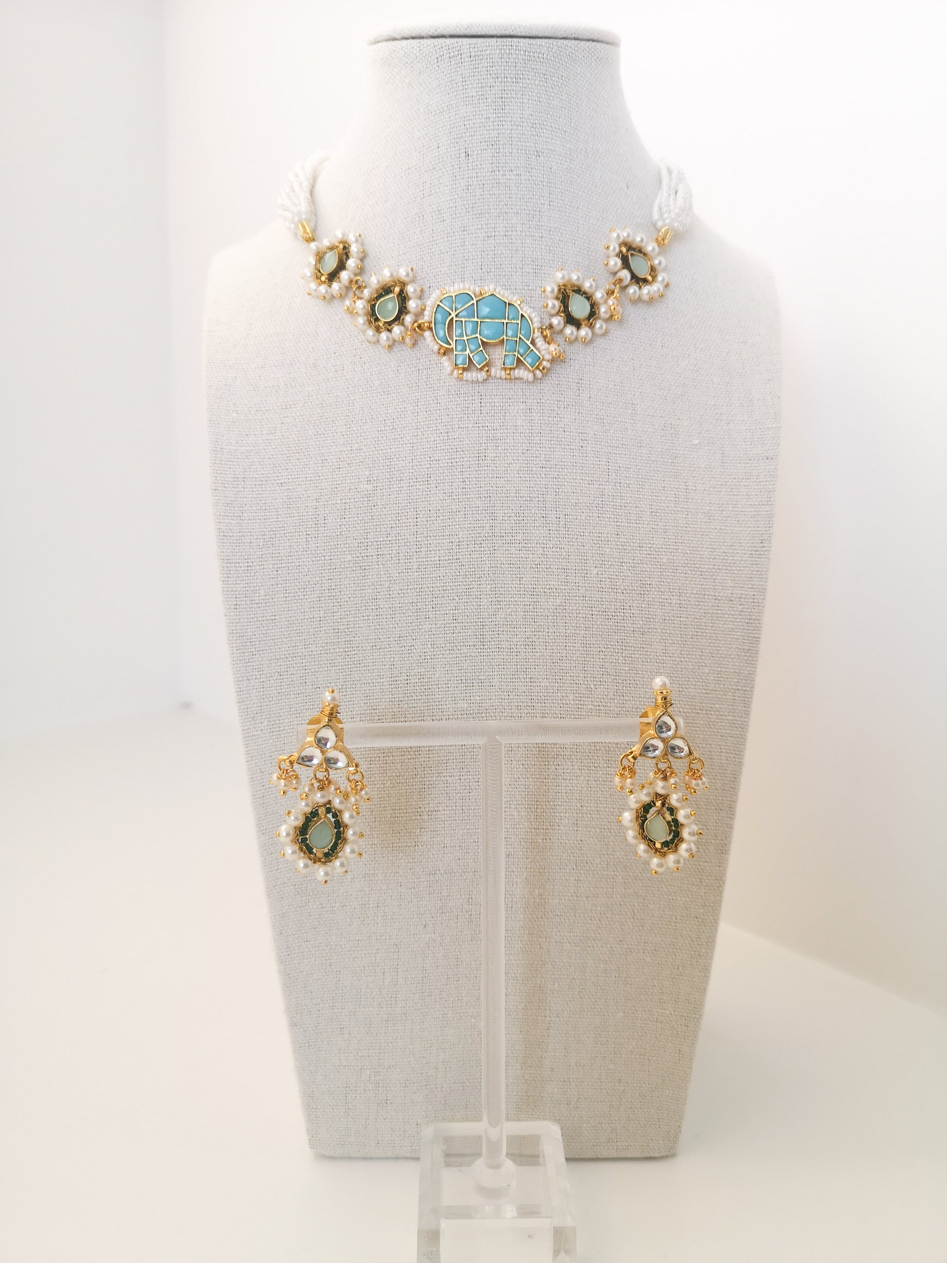 Pachi Kundan Set - Light Blue, Sage Green and Beige with an Elephant Statement piece