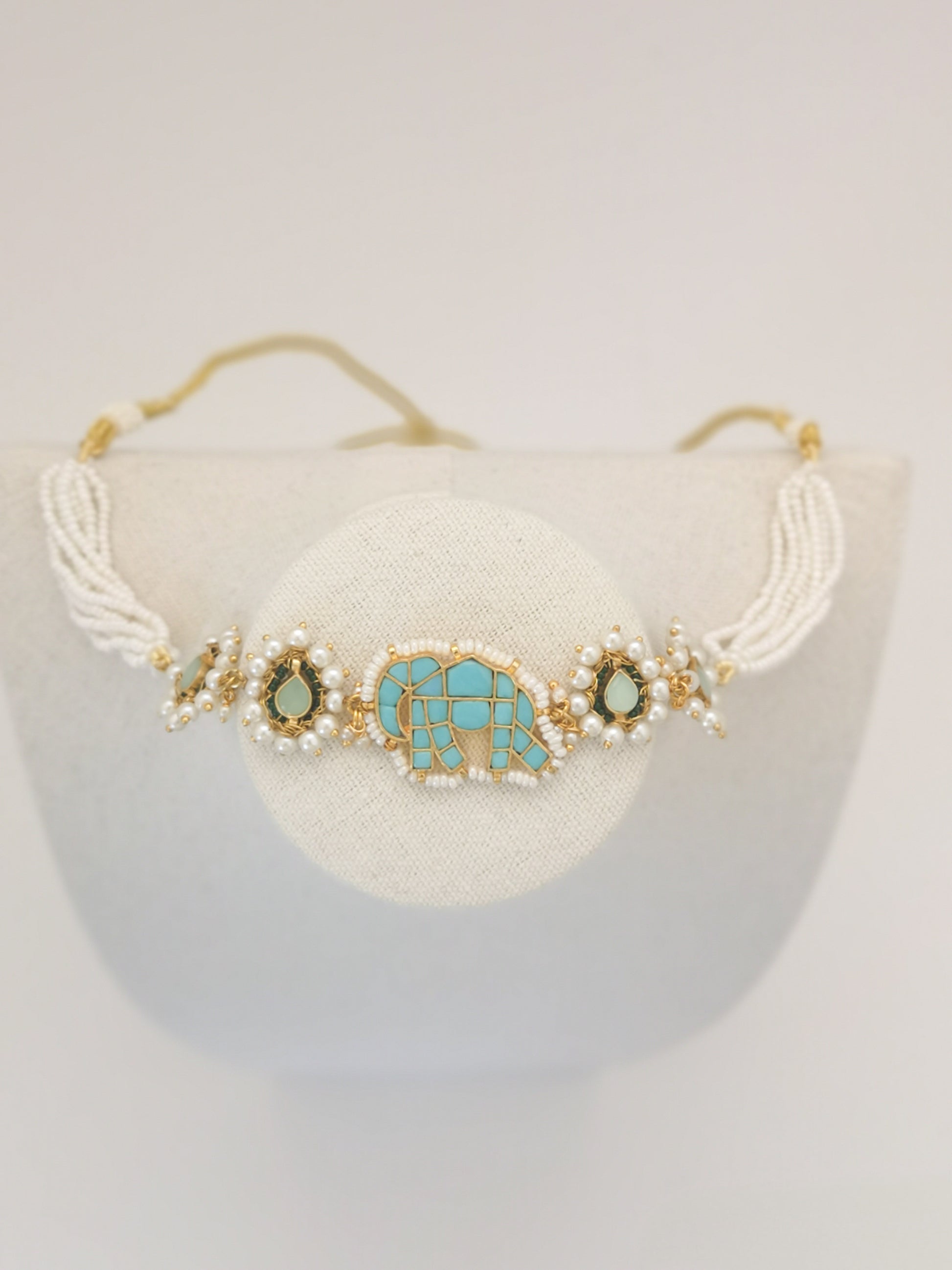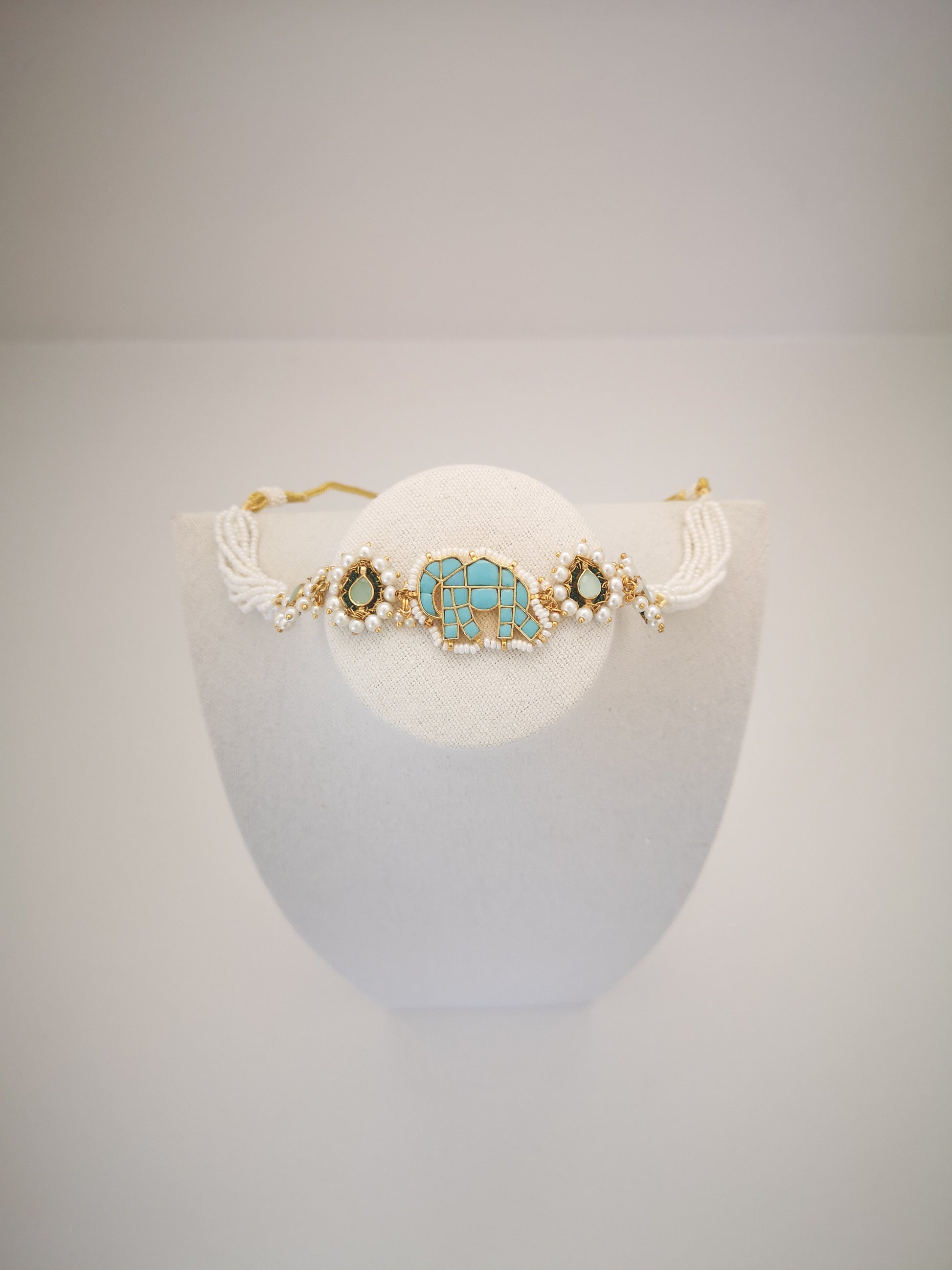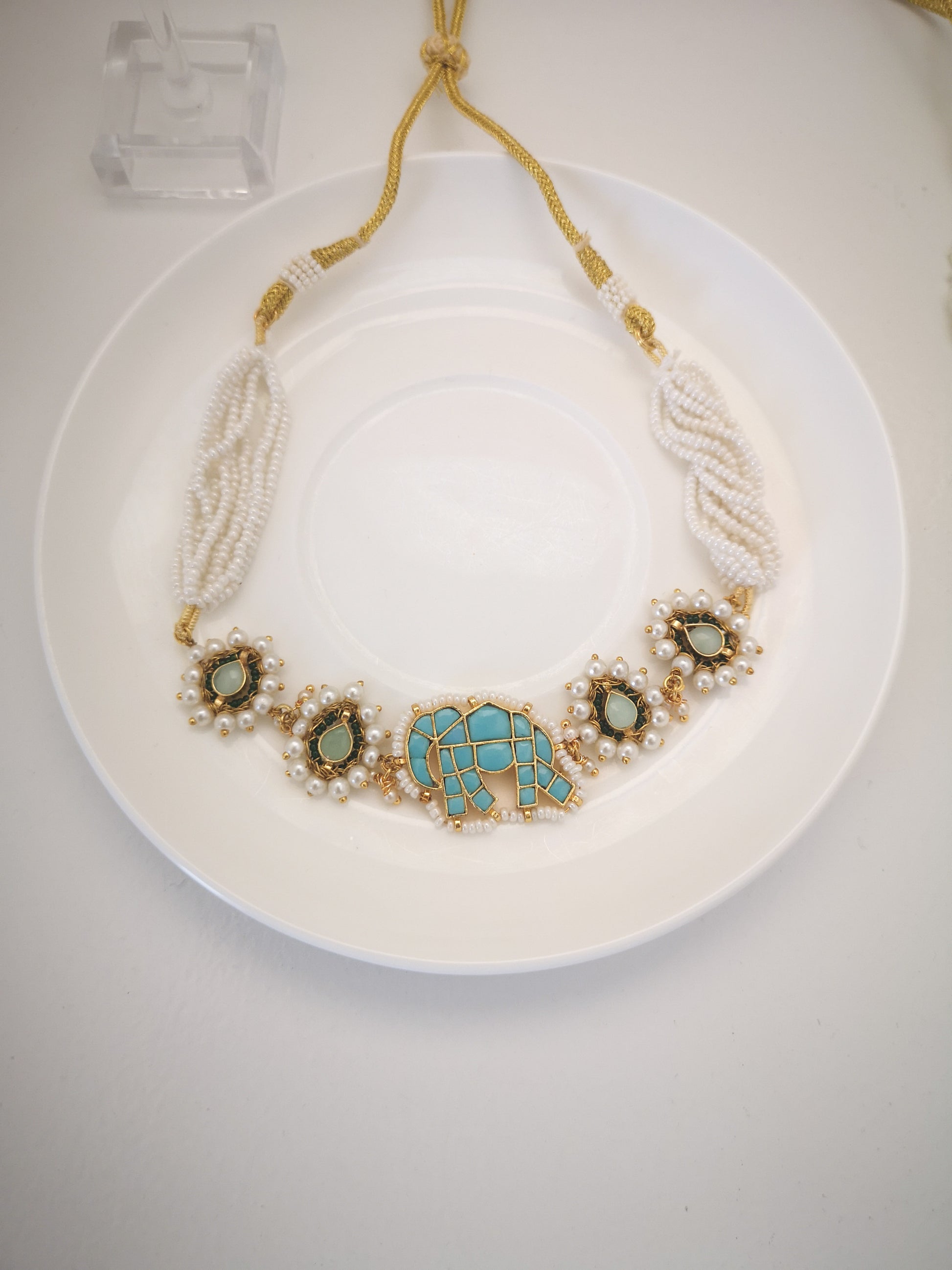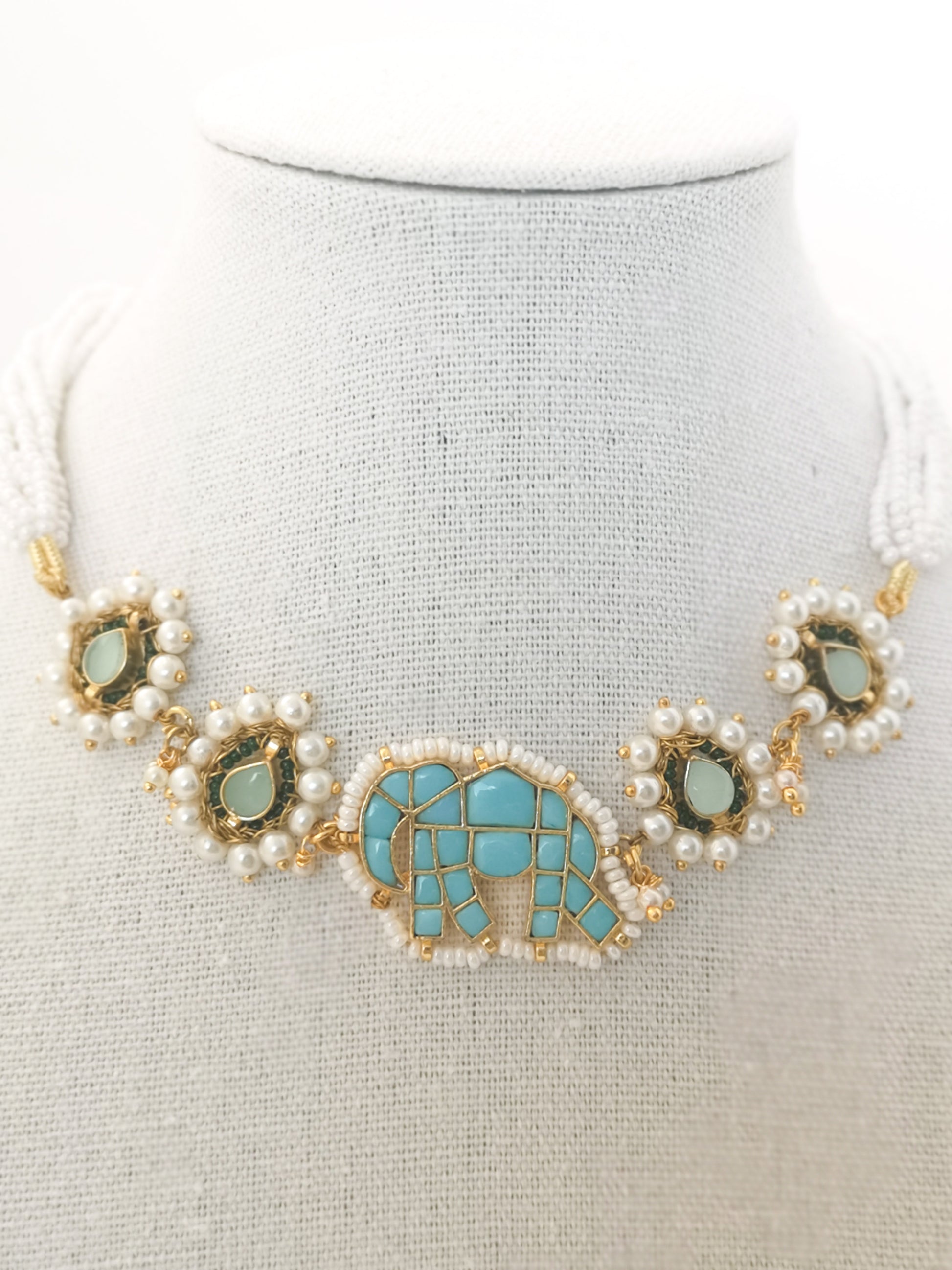 Pachi Kundan Set - Light Blue, Sage Green and Beige with an Elephant Statement piece