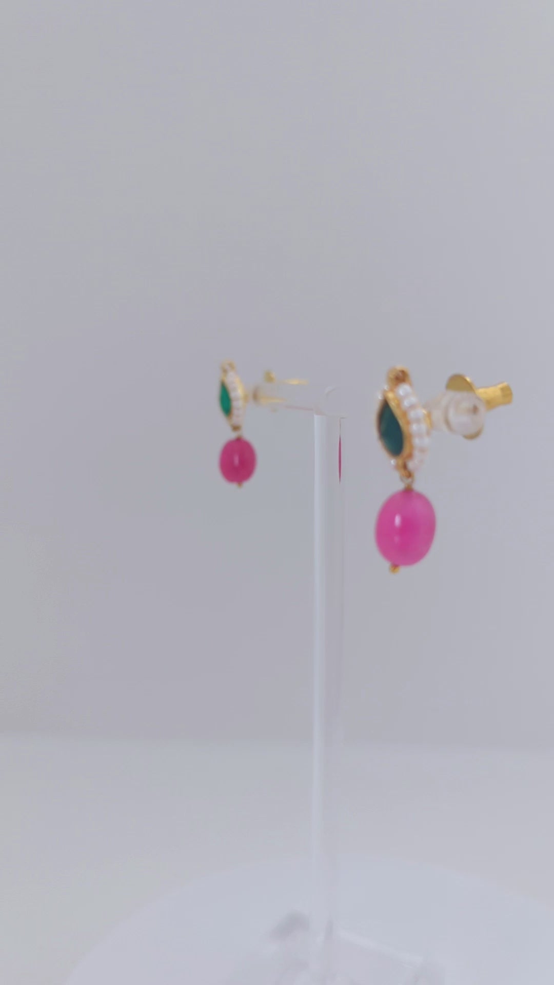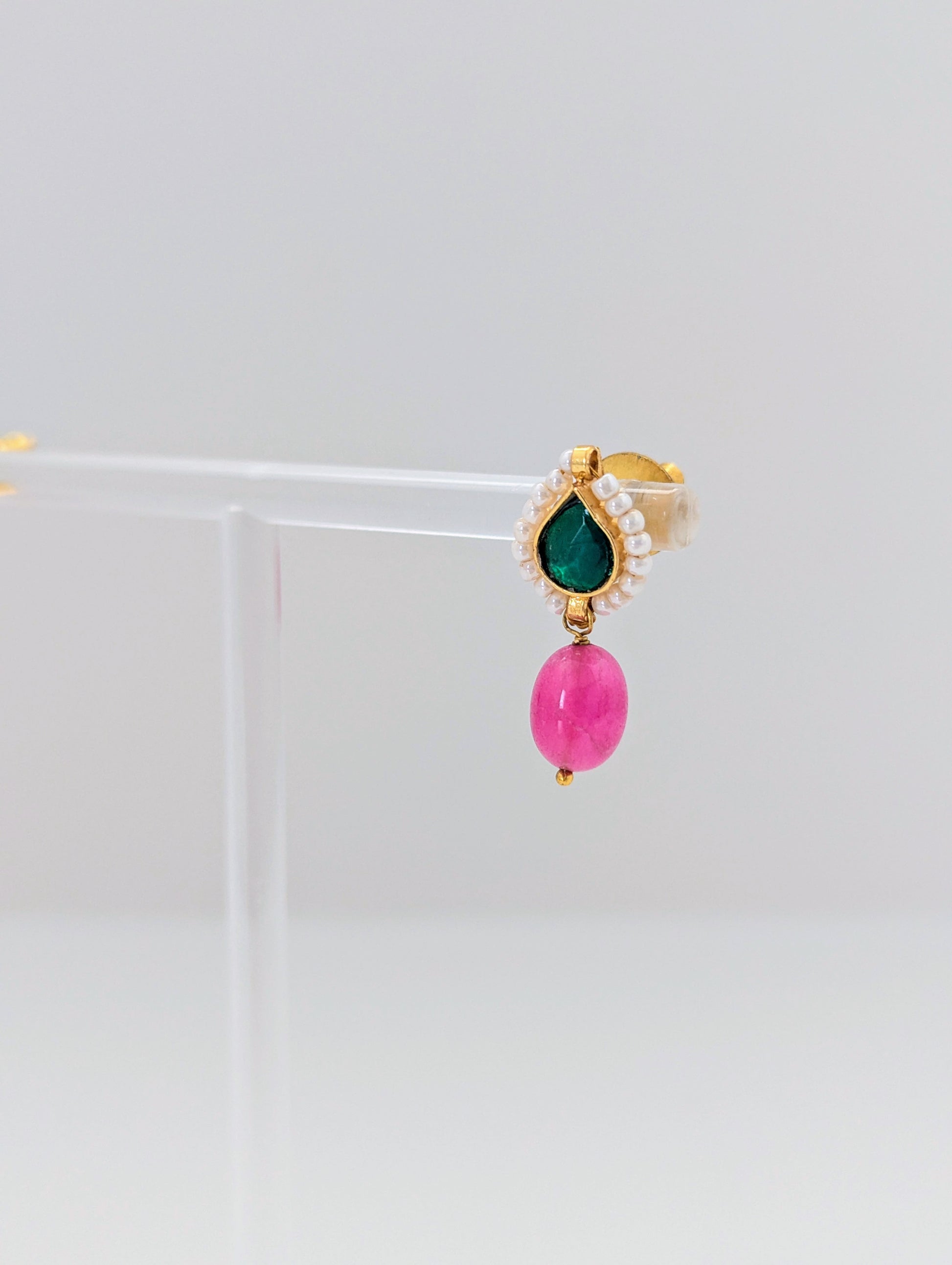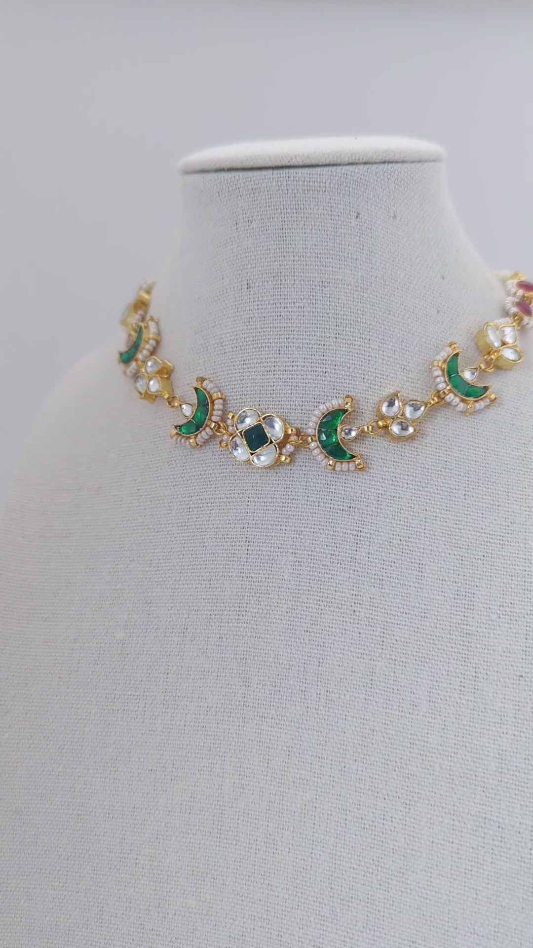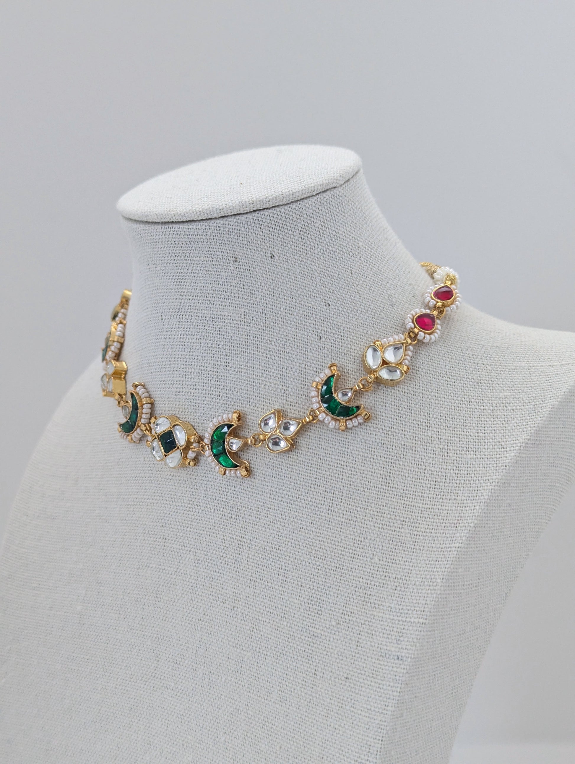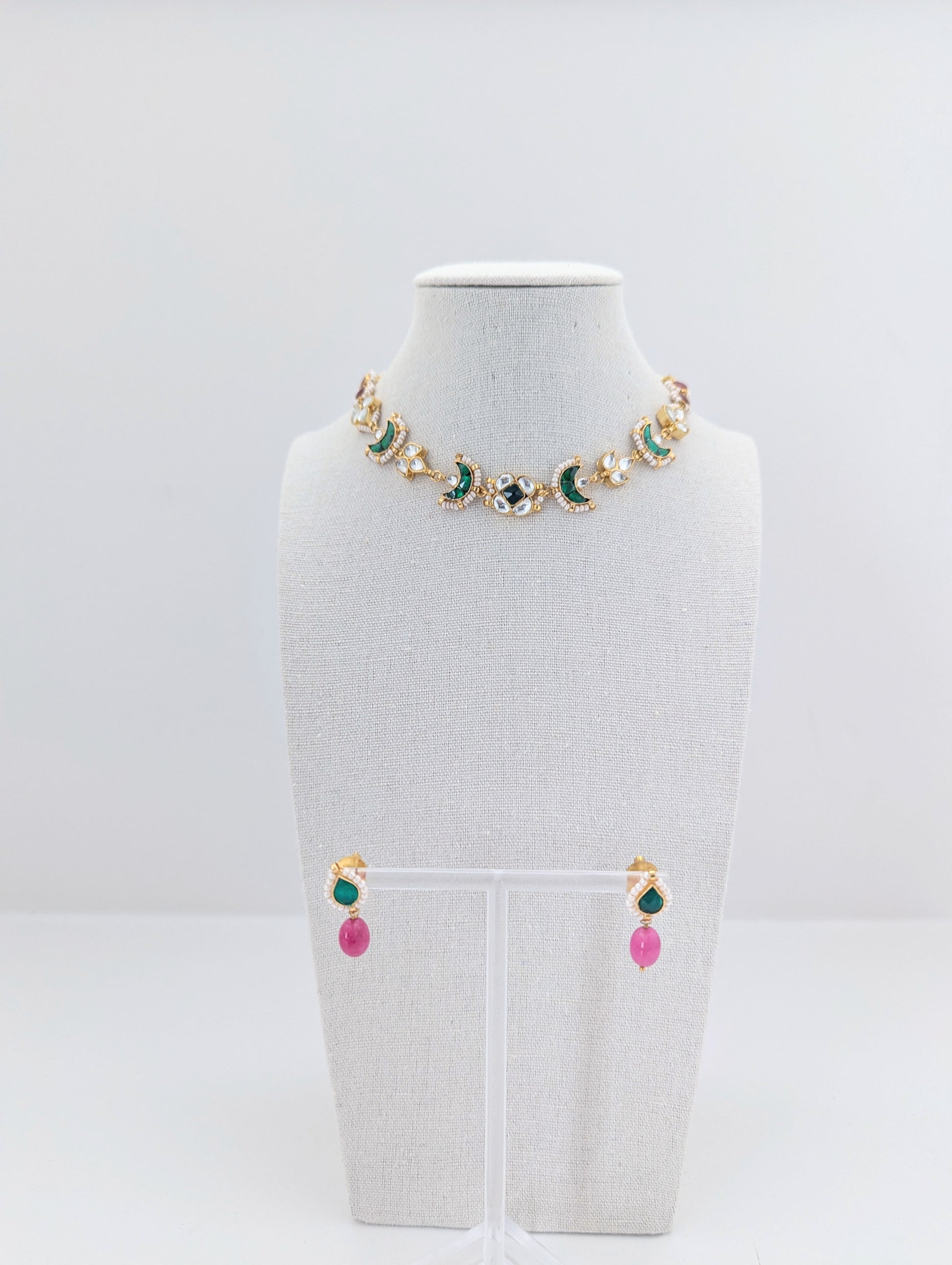 An exquisite handmade Pachi Kundan necklace and earrings set, adorned with crescent motifs, rich green enamel work, and delicate pearl accents. The earrings are beautifully finished with semi-precious pink gemstone drops, adding a graceful pop of color. A timeless piece reflecting the grandeur of traditional craftsmanship and regal elegance."