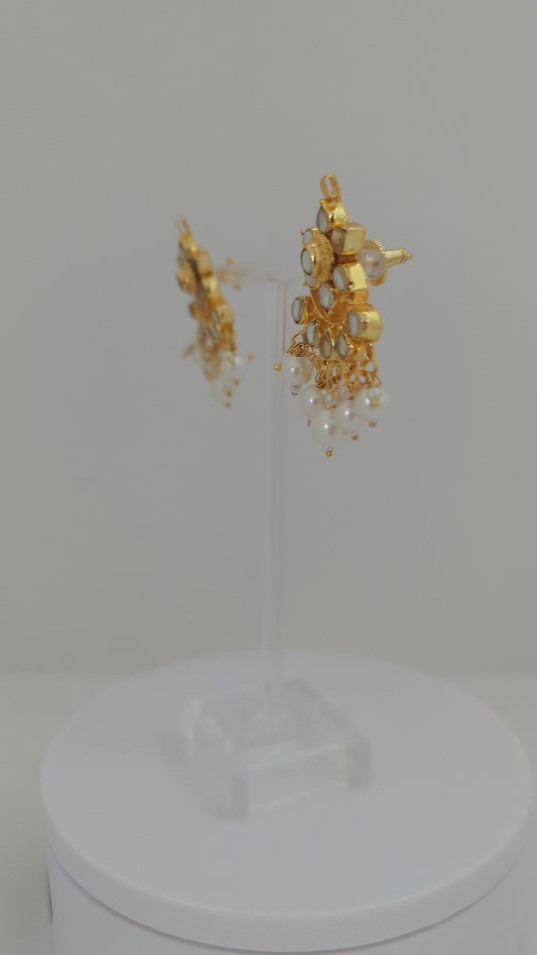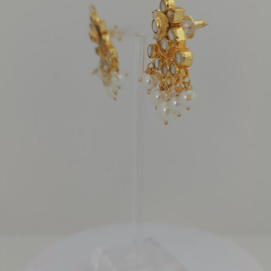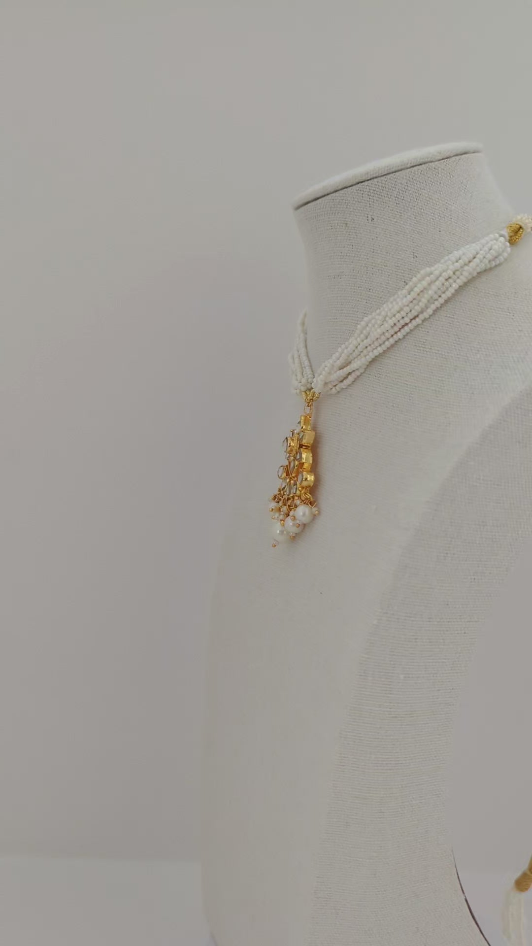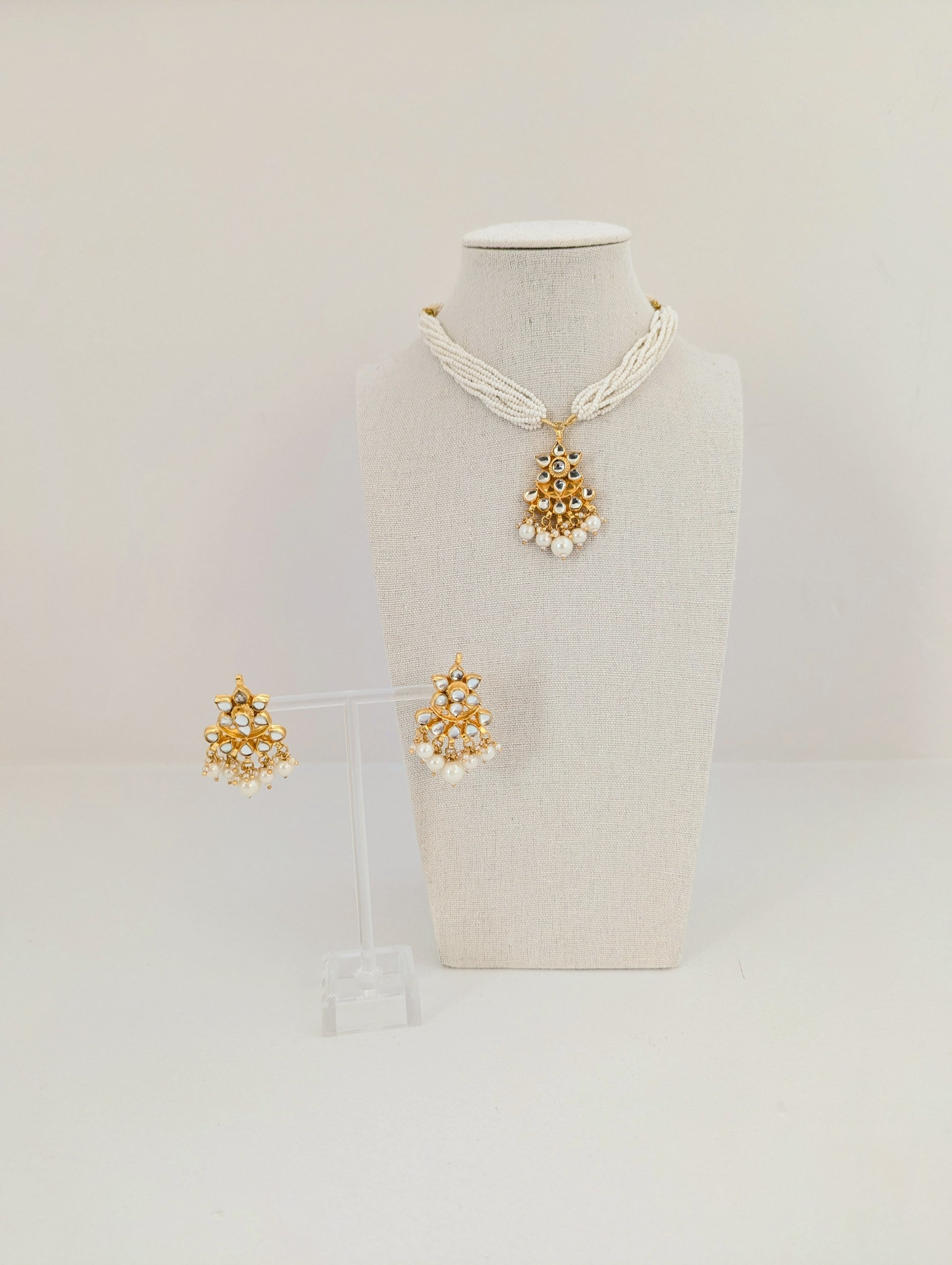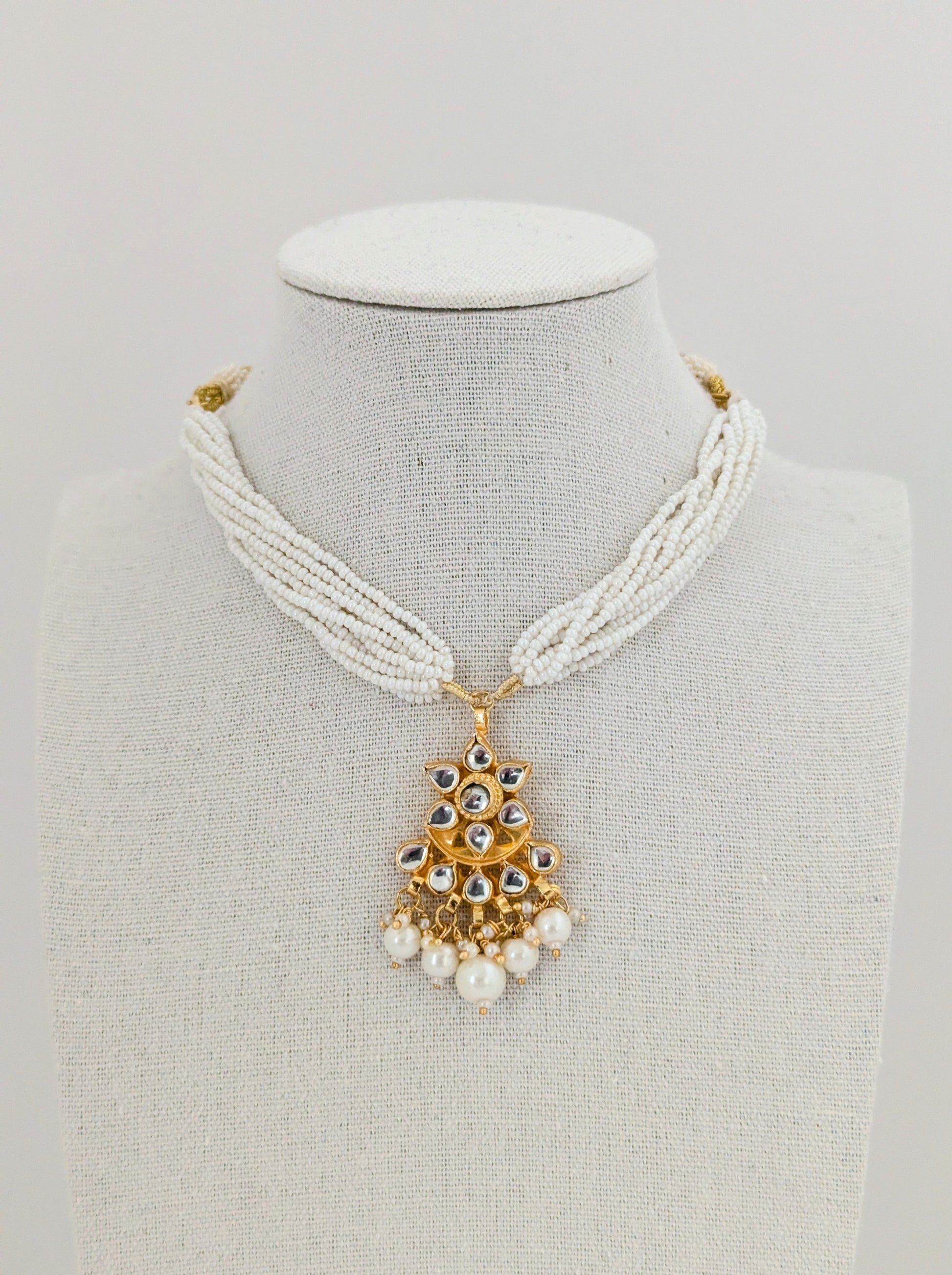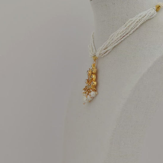 This jewelry set features a traditional design with timeless elegance. The necklace is crafted with multiple strands of delicate white seed beads, centered with a striking gold pendant adorned with mirror-polished stones in a floral pattern. Dangling pearls add graceful movement and sophistication. Paired with matching earrings, the set beautifully blends classic charm with refined detail, making it ideal for festive occasions, weddings, or cultural celebrations.
