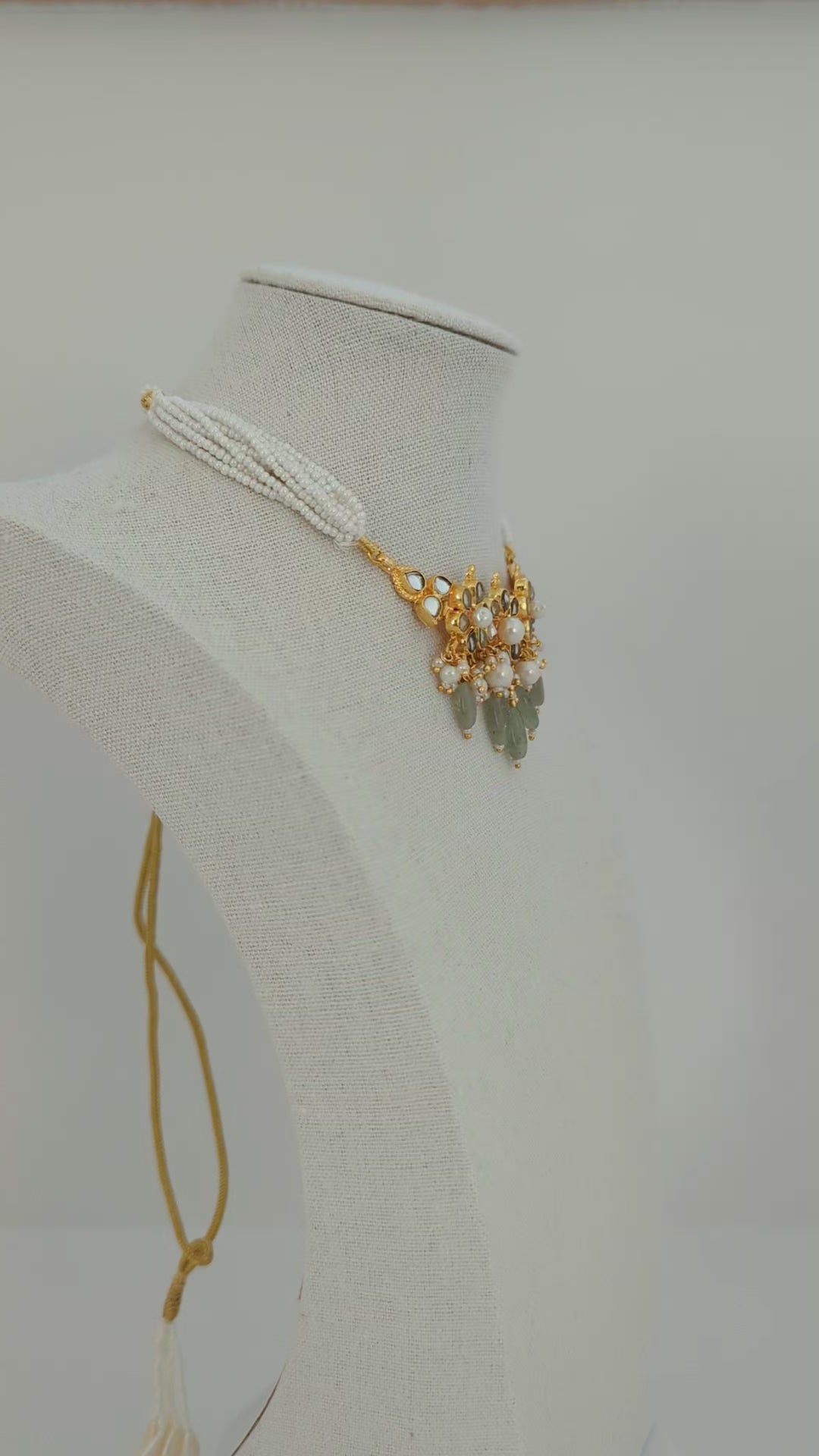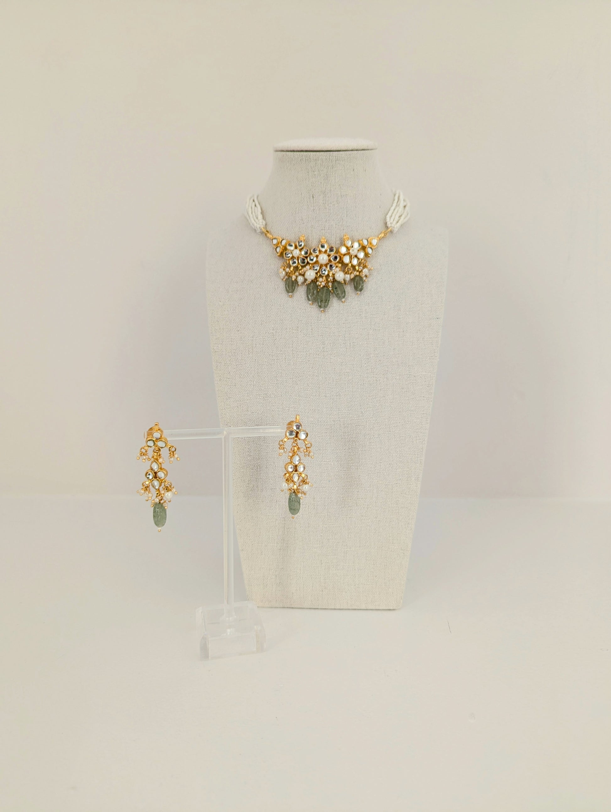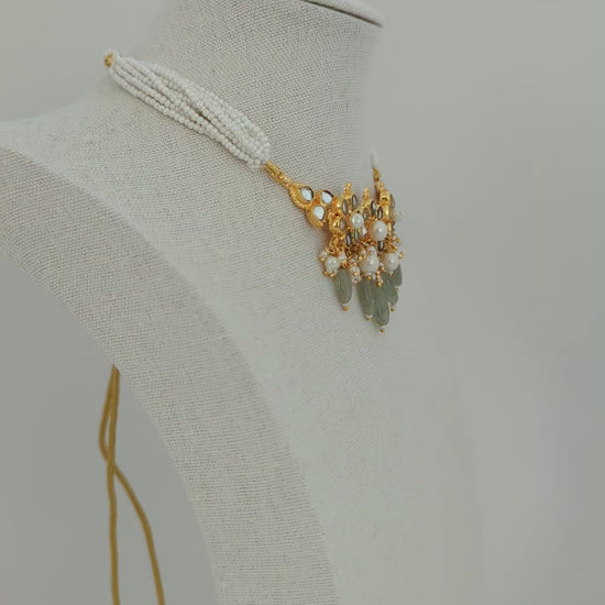 This elegant jewelry set features a stunning necklace with clusters of shimmering white stones, delicate pearls, and soft green teardrop beads, all set in a golden framework. The necklace is finished with strands of tiny white seed beads for a graceful touch. Paired with matching drop earrings adorned with mirror-like stones, pearls, and green bead accents, this set beautifully blends traditional charm with timeless sophistication.