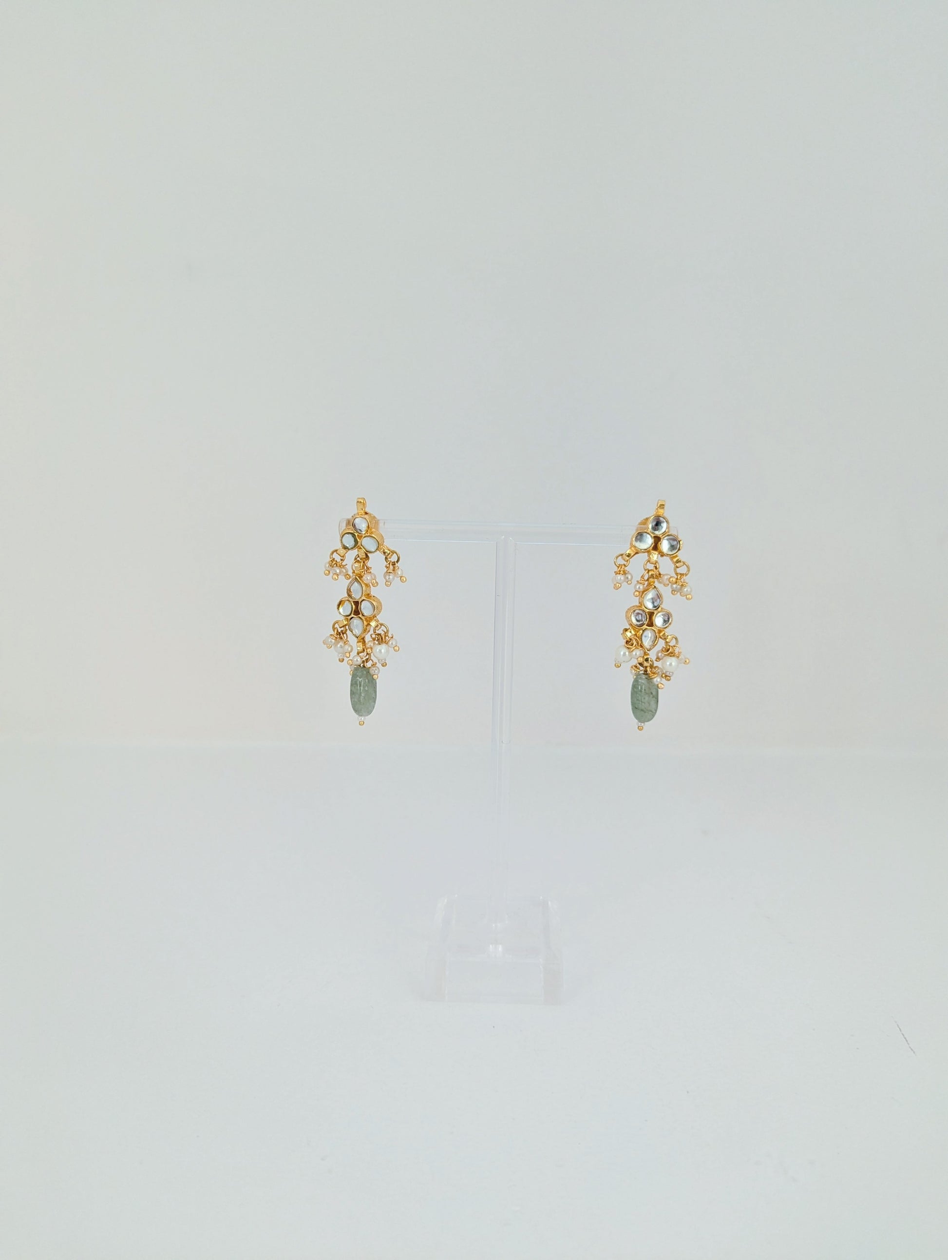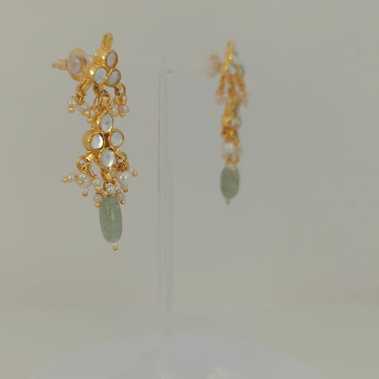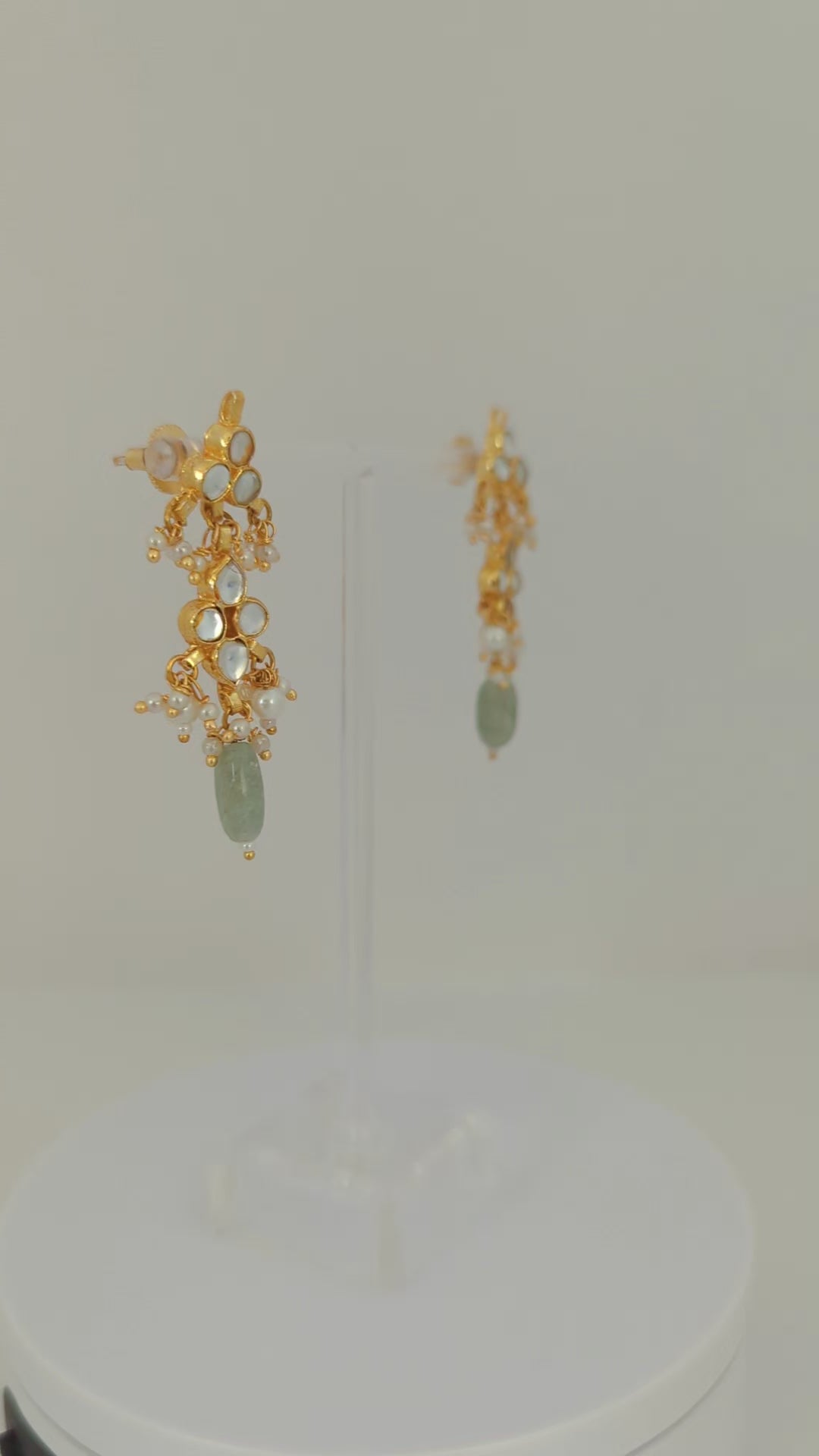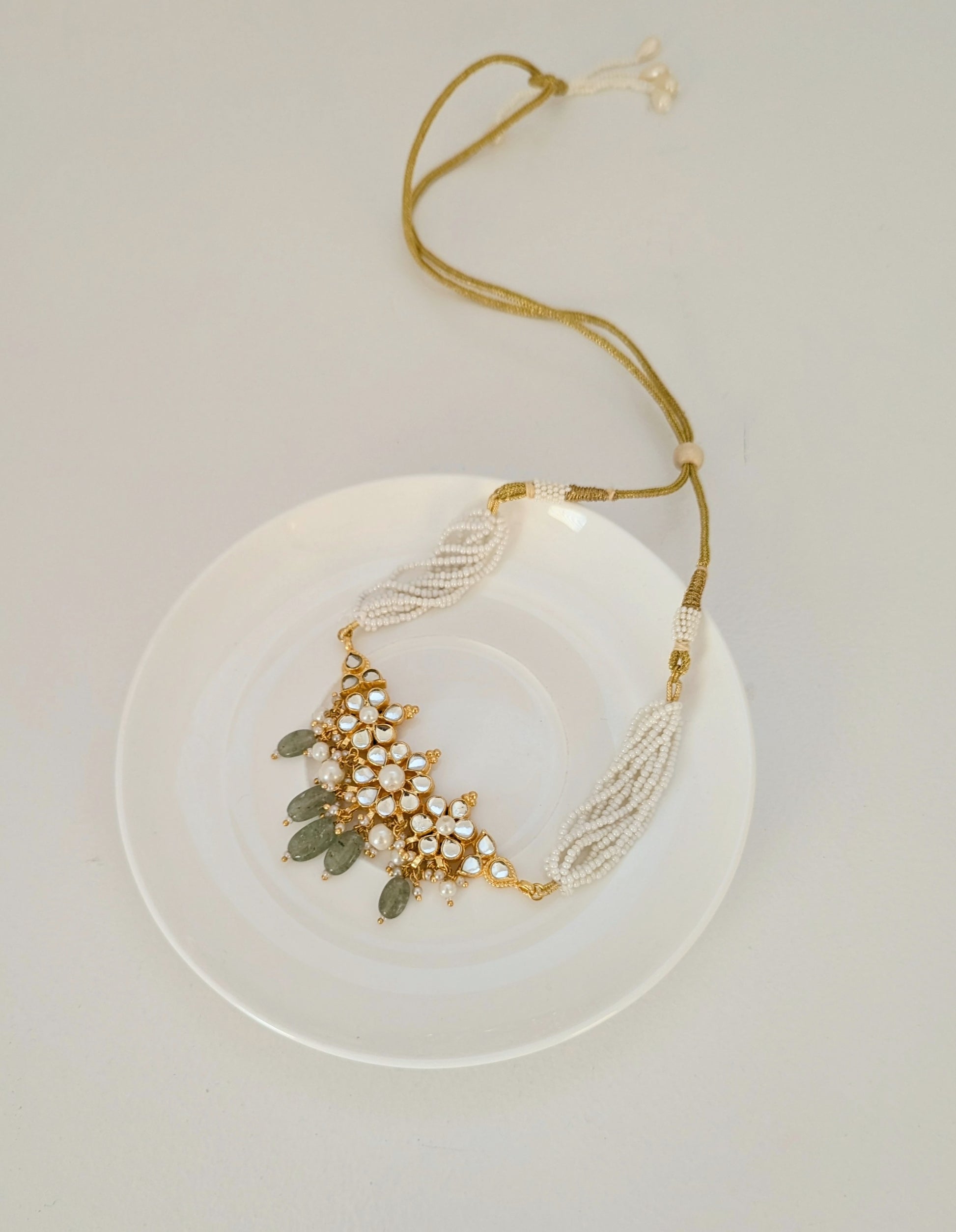 This elegant jewelry set features a stunning necklace with clusters of shimmering white stones, delicate pearls, and soft green teardrop beads, all set in a golden framework. The necklace is finished with strands of tiny white seed beads for a graceful touch. Paired with matching drop earrings adorned with mirror-like stones, pearls, and green bead accents, this set beautifully blends traditional charm with timeless sophistication.