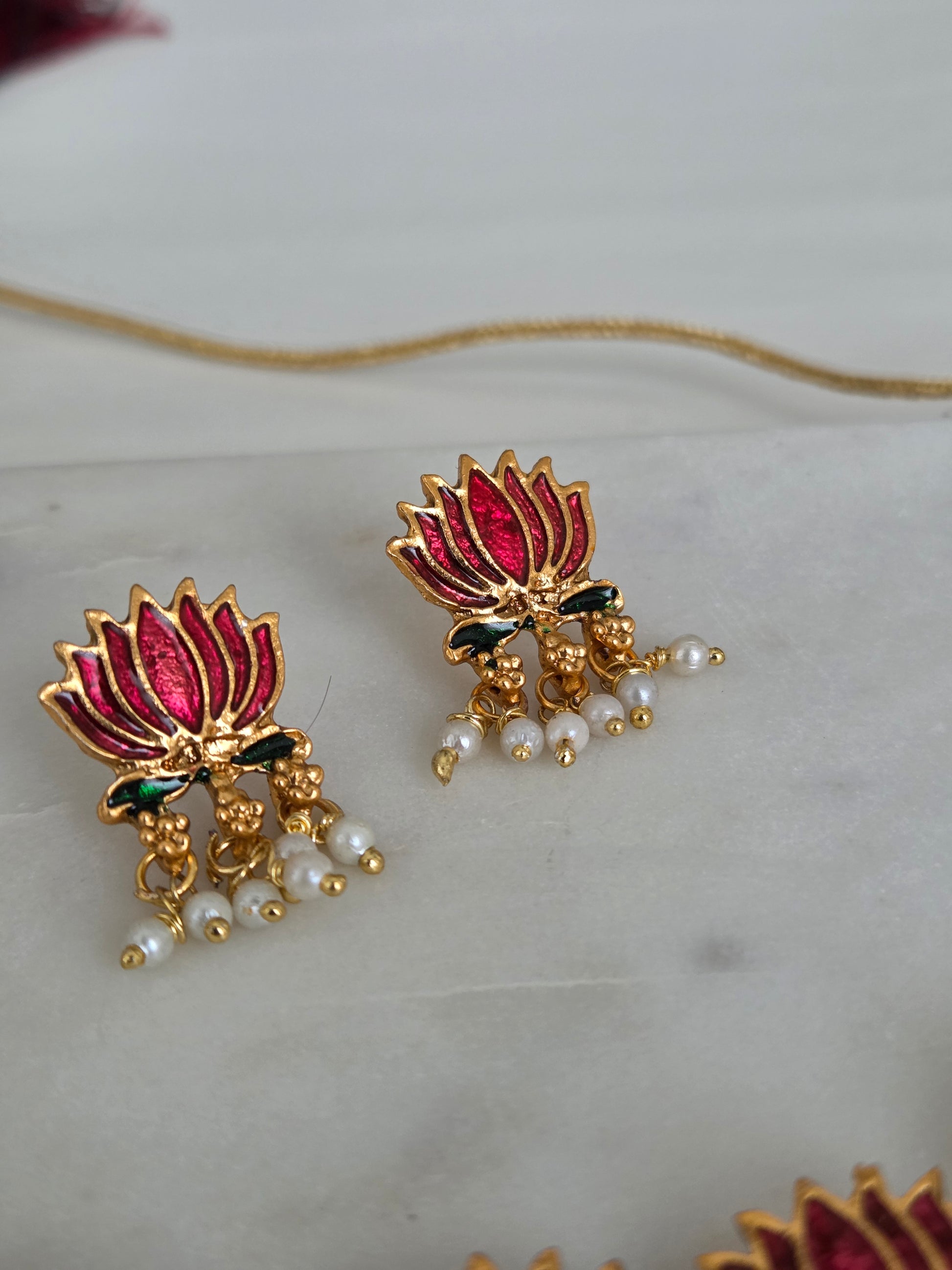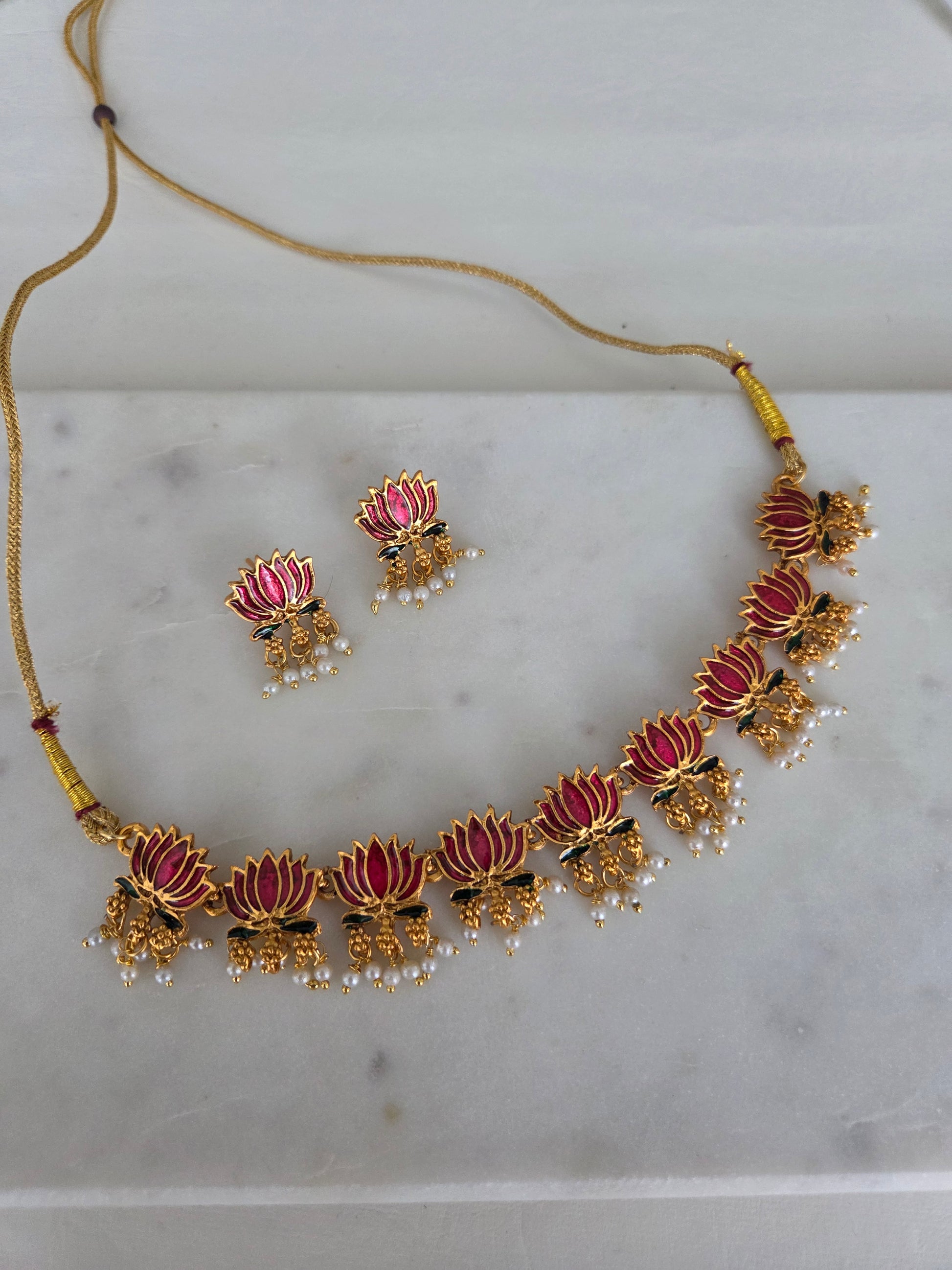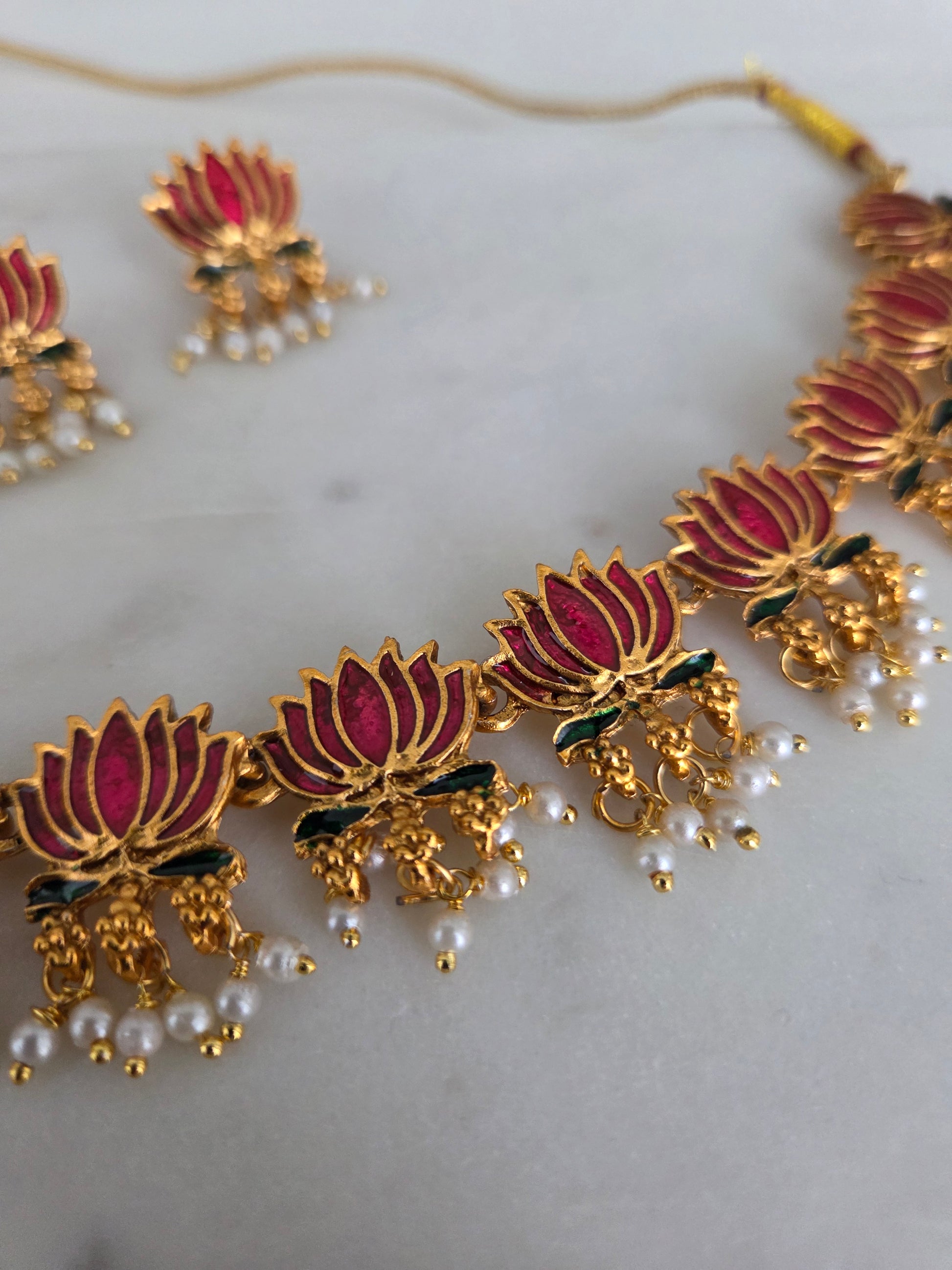 This exquisite necklace features a row of blooming lotus motifs in dark pink enamel, delicately outlined in gold. Each lotus is adorned with intricate green detailing at the base and finished with clusters of tiny white and gold beads that add graceful movement and charm. Elegant and symbolic, this piece captures the essence of divine beauty and timeless artistry — perfect for both traditional and contemporary ensembles.