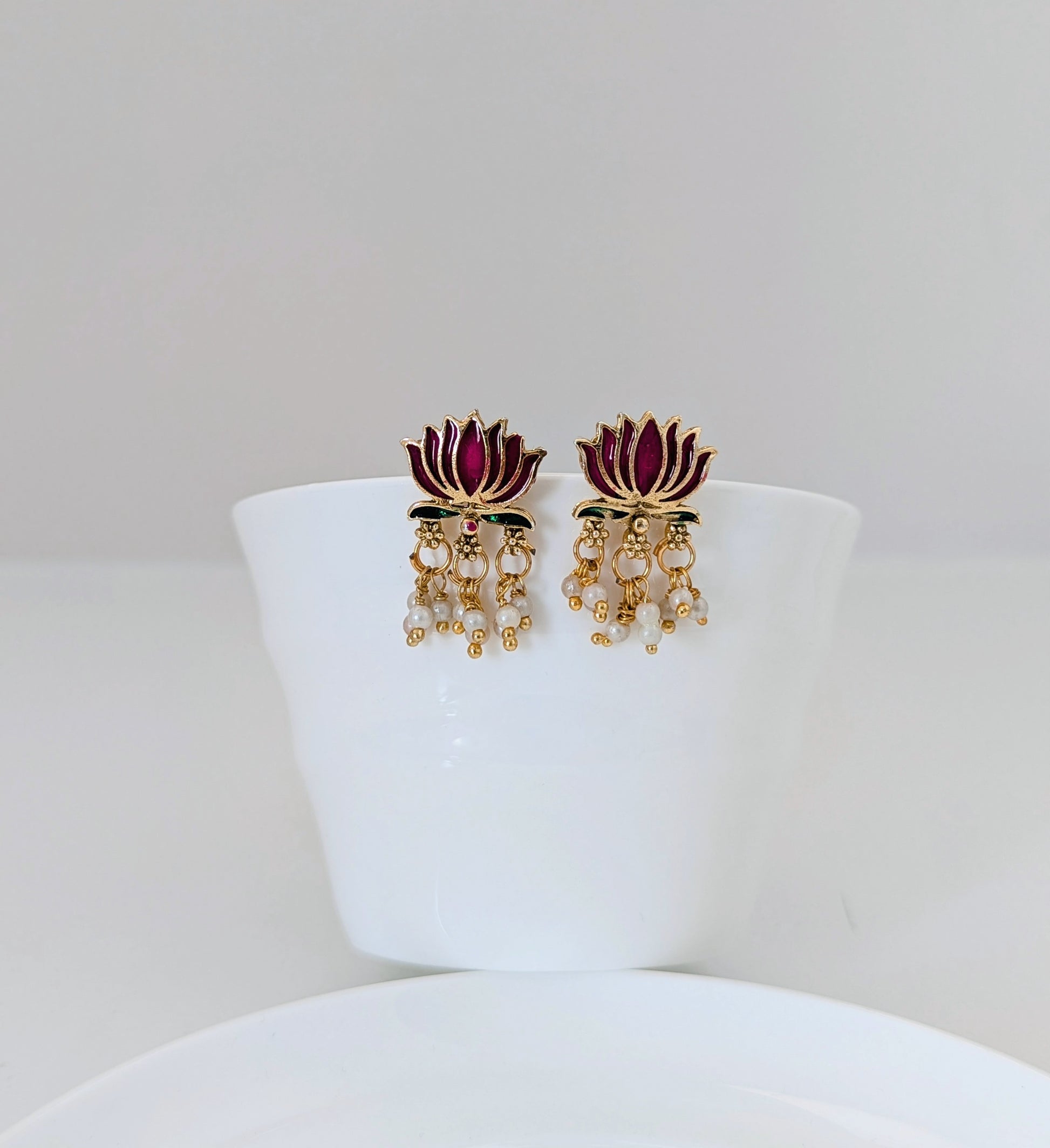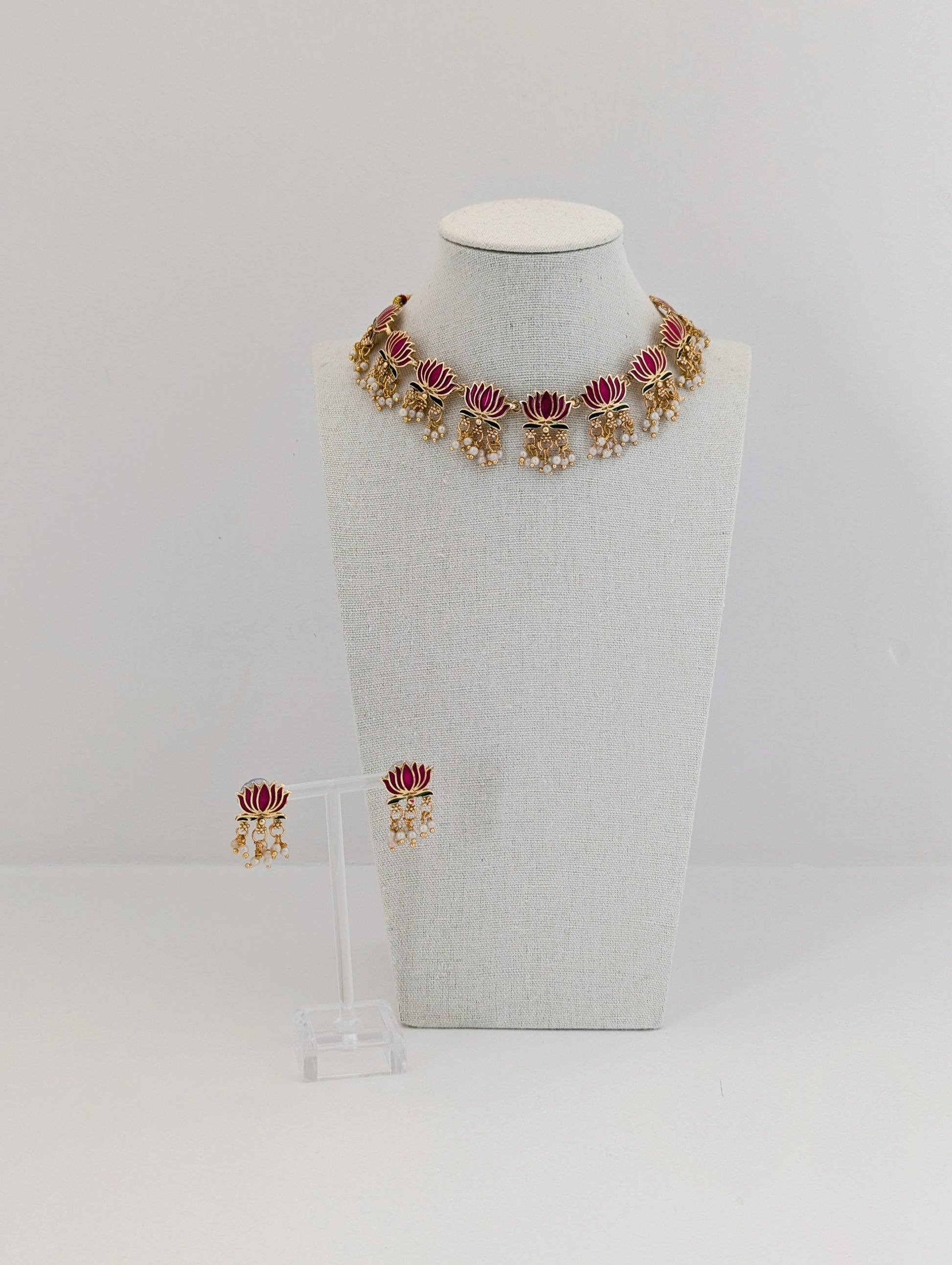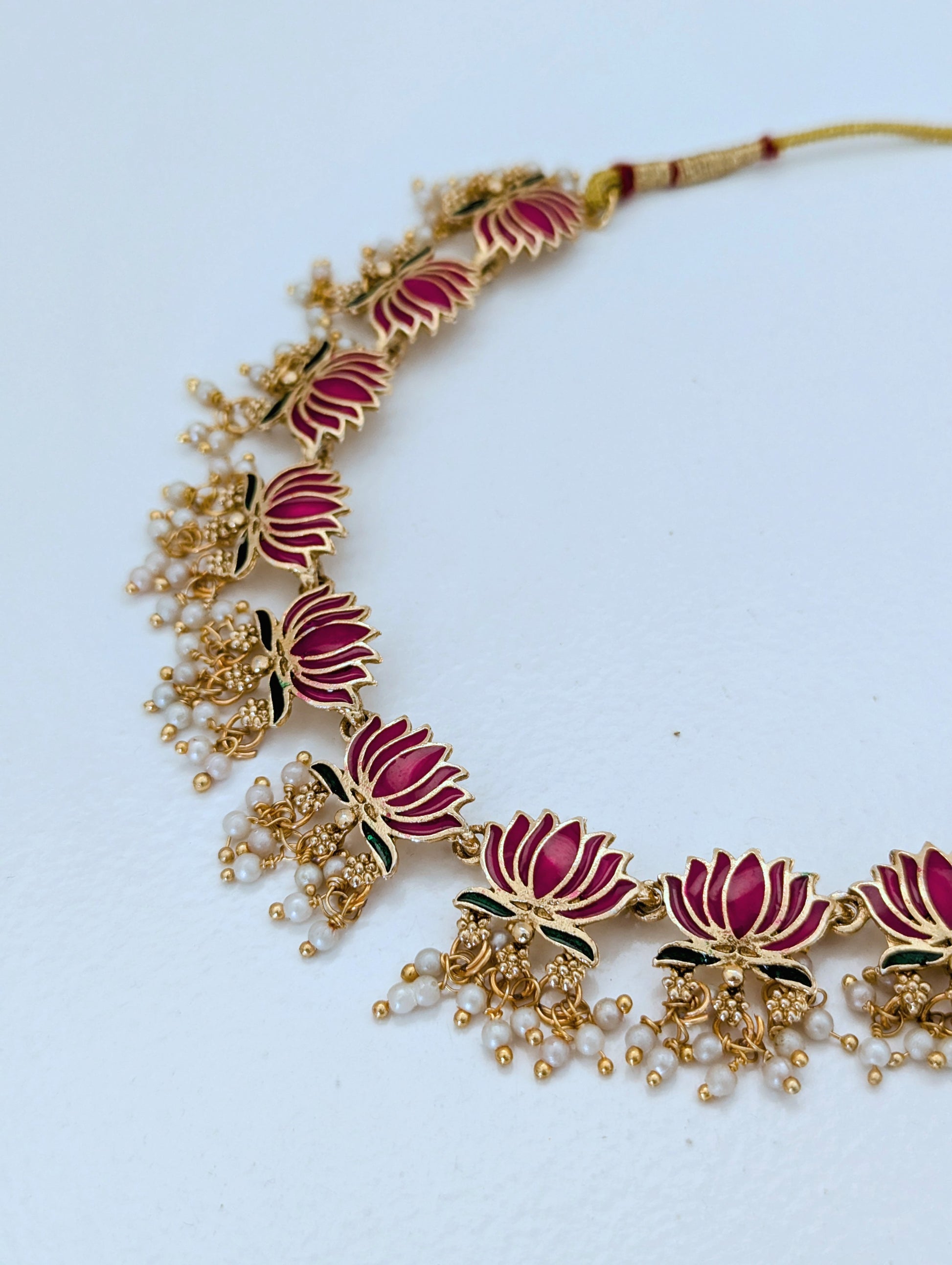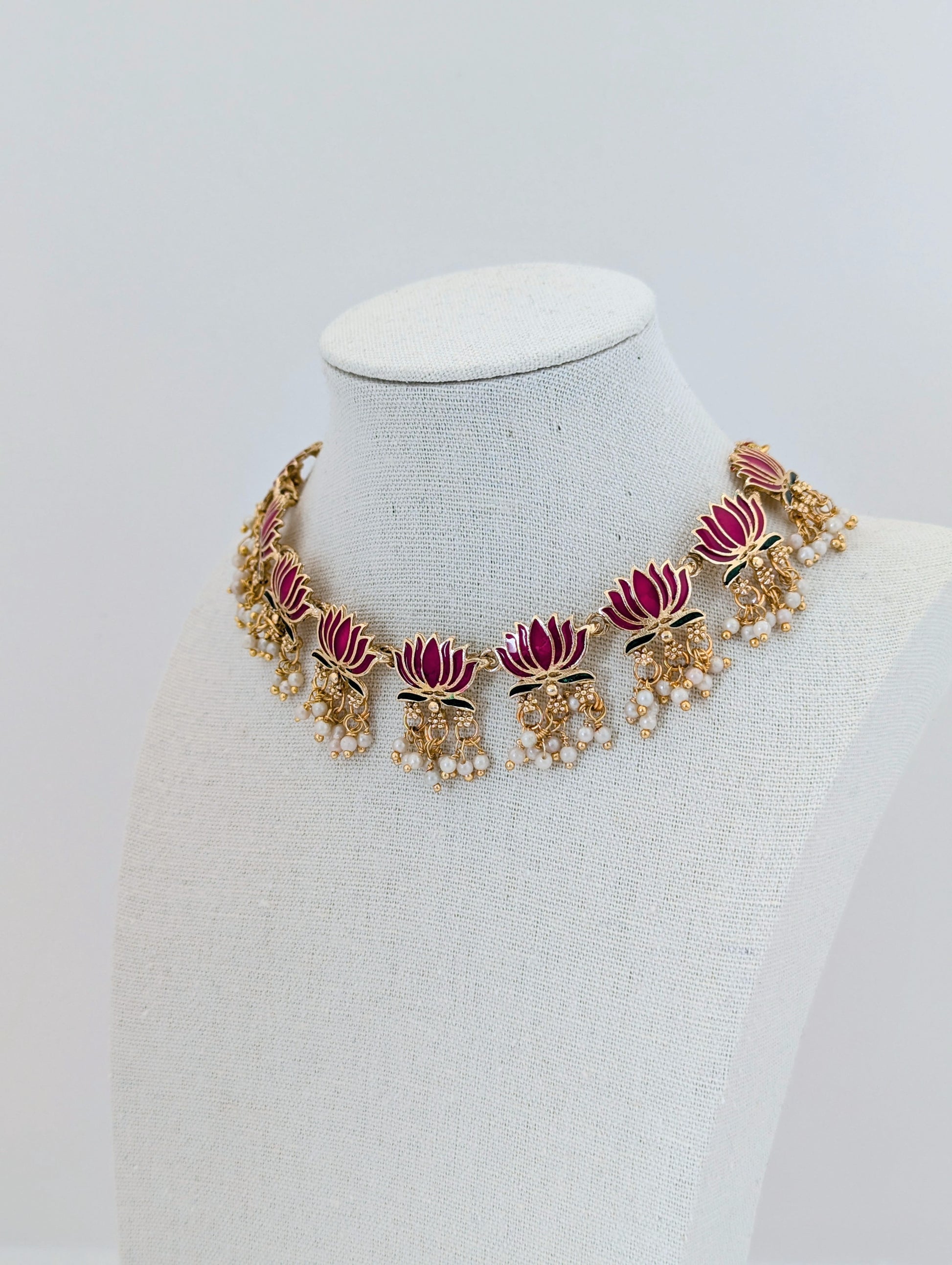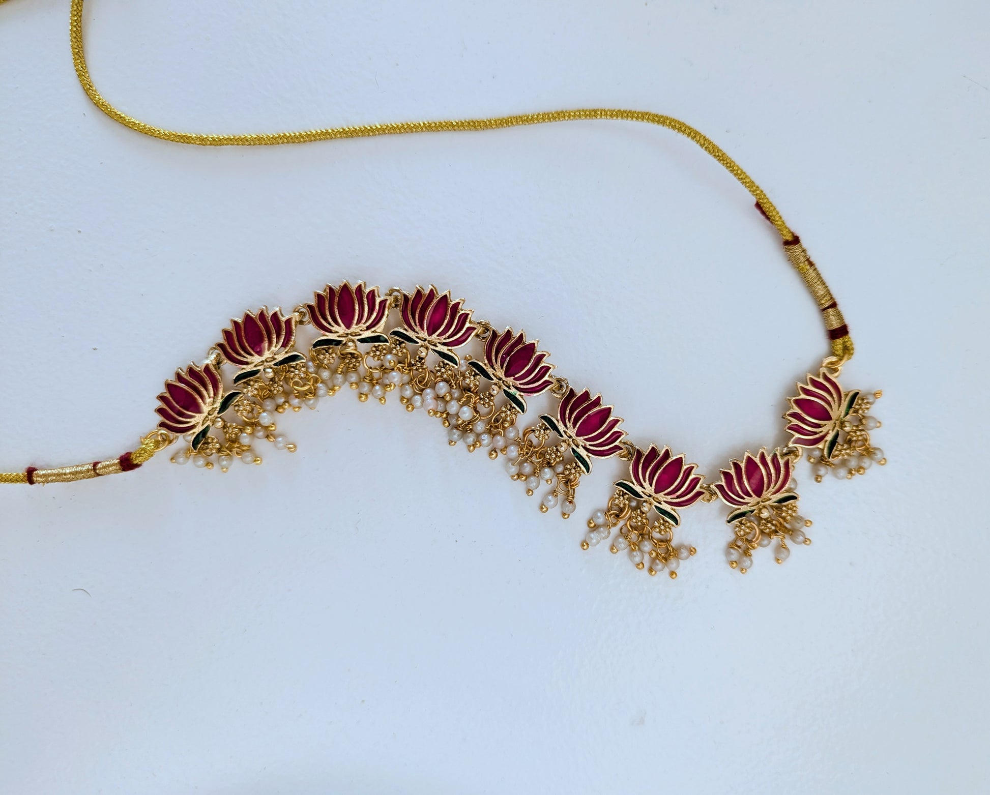 This exquisite necklace features a row of blooming lotus motifs in rich pink enamel, delicately outlined in gold. Each lotus is adorned with intricate green detailing at the base and finished with clusters of tiny white and gold beads that add graceful movement and charm. Elegant and symbolic, this piece captures the essence of divine beauty and timeless artistry — perfect for both traditional and contemporary ensembles.
