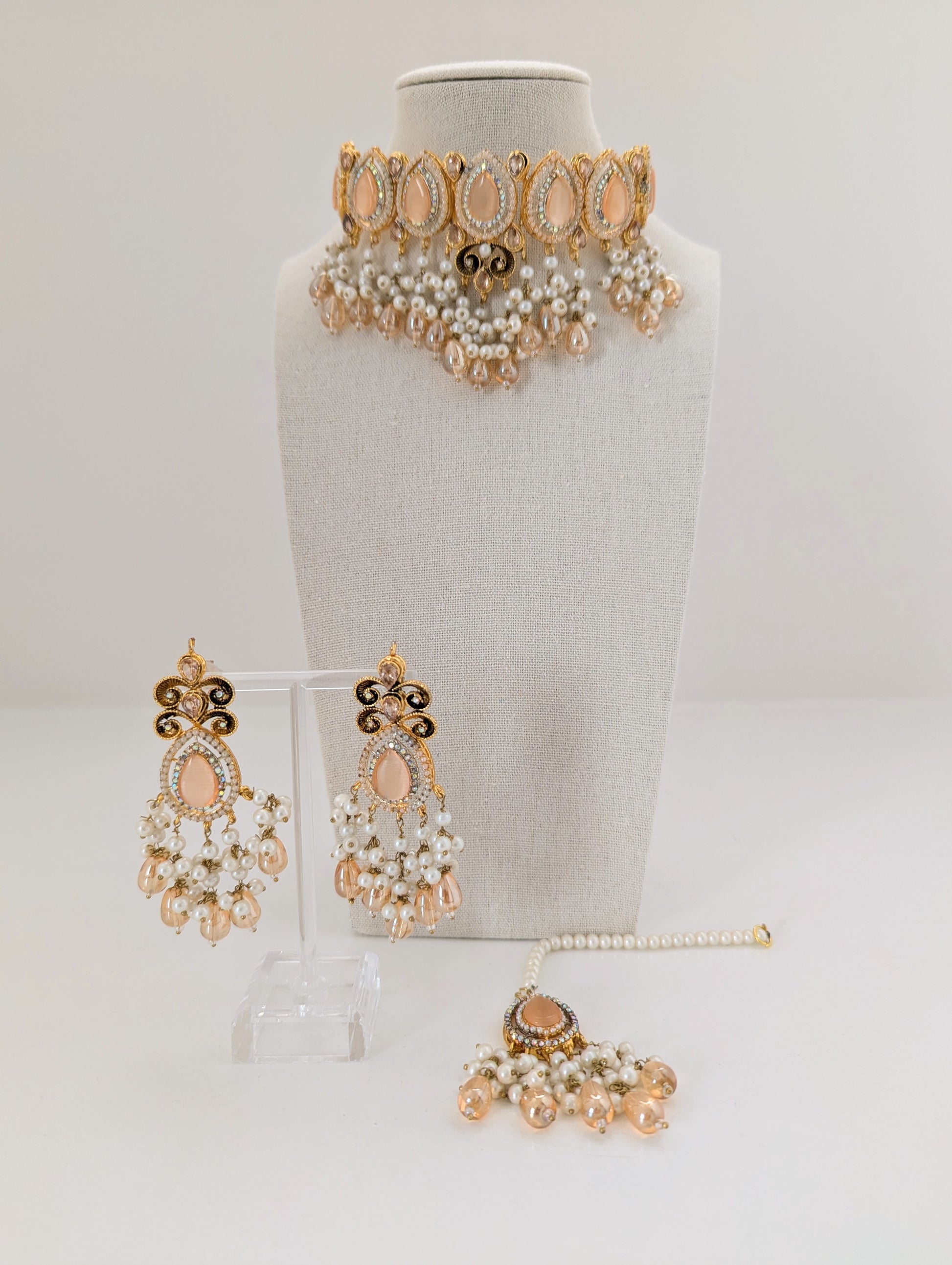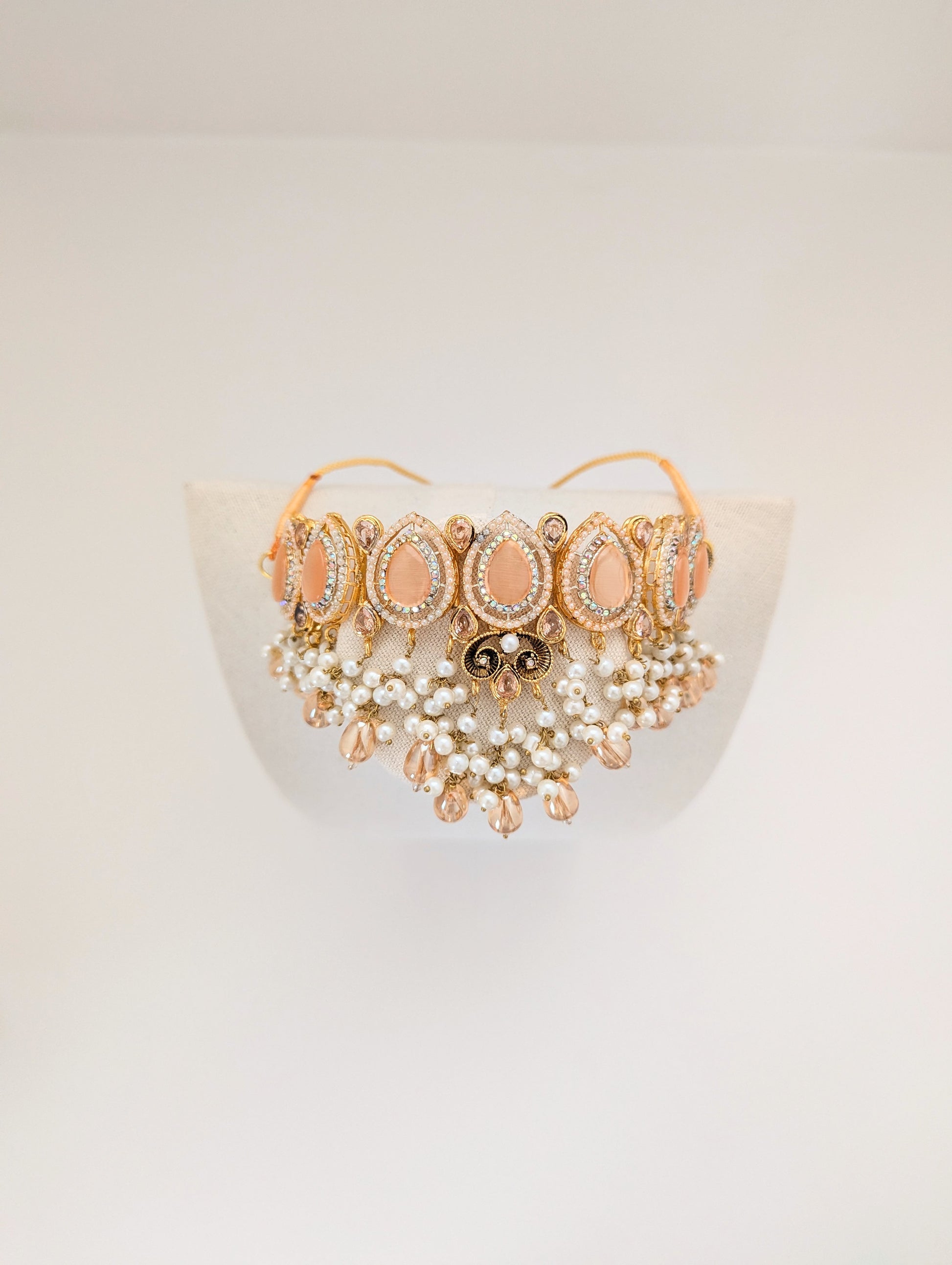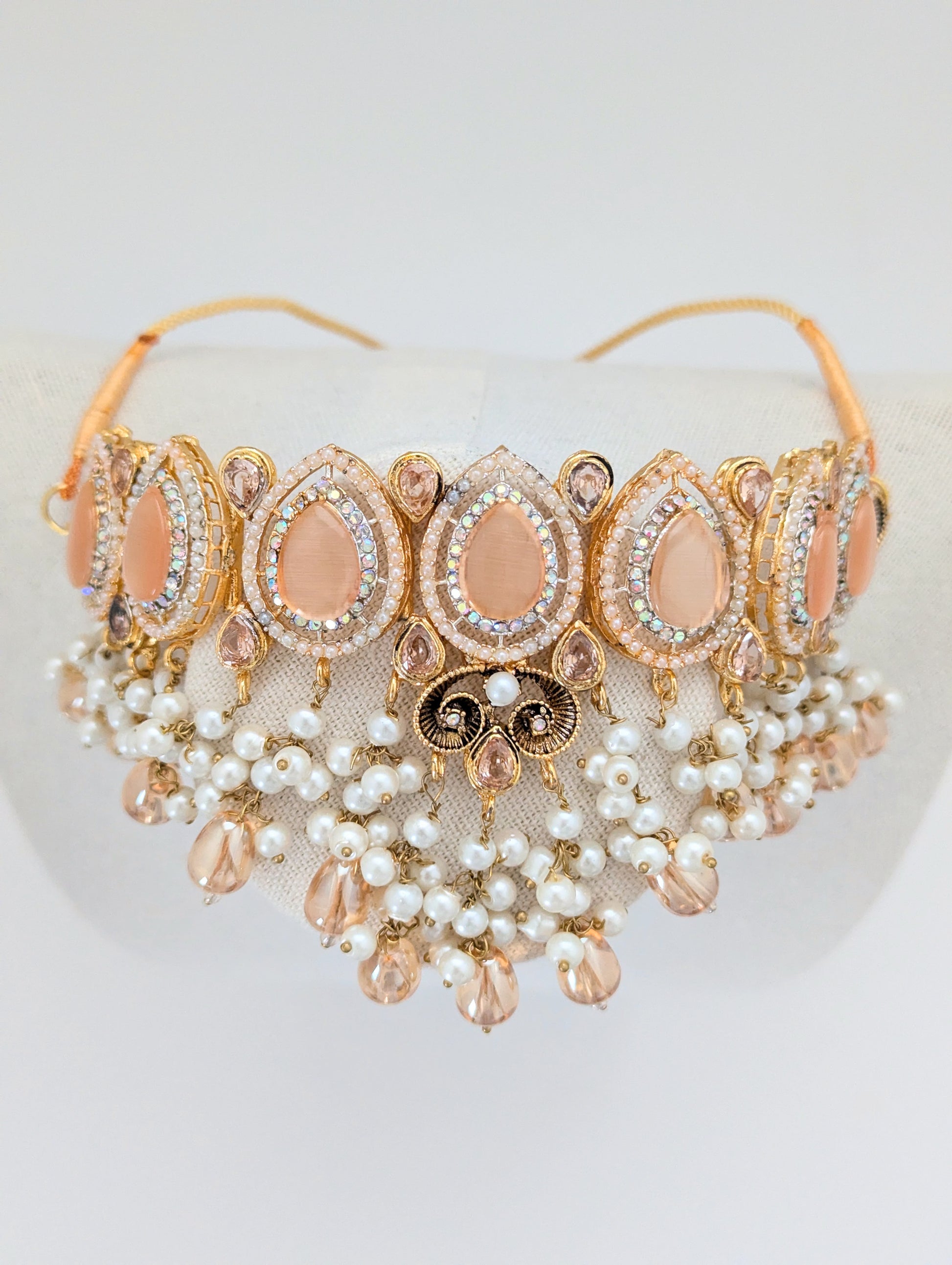 This elegant jewelry set includes a choker necklace, earrings, and a maang tikka. The pieces feature teardrop-shaped peach stones, intricate gold detailing, and pearl with peach bead accents. Perfect for weddings or festive occasions.