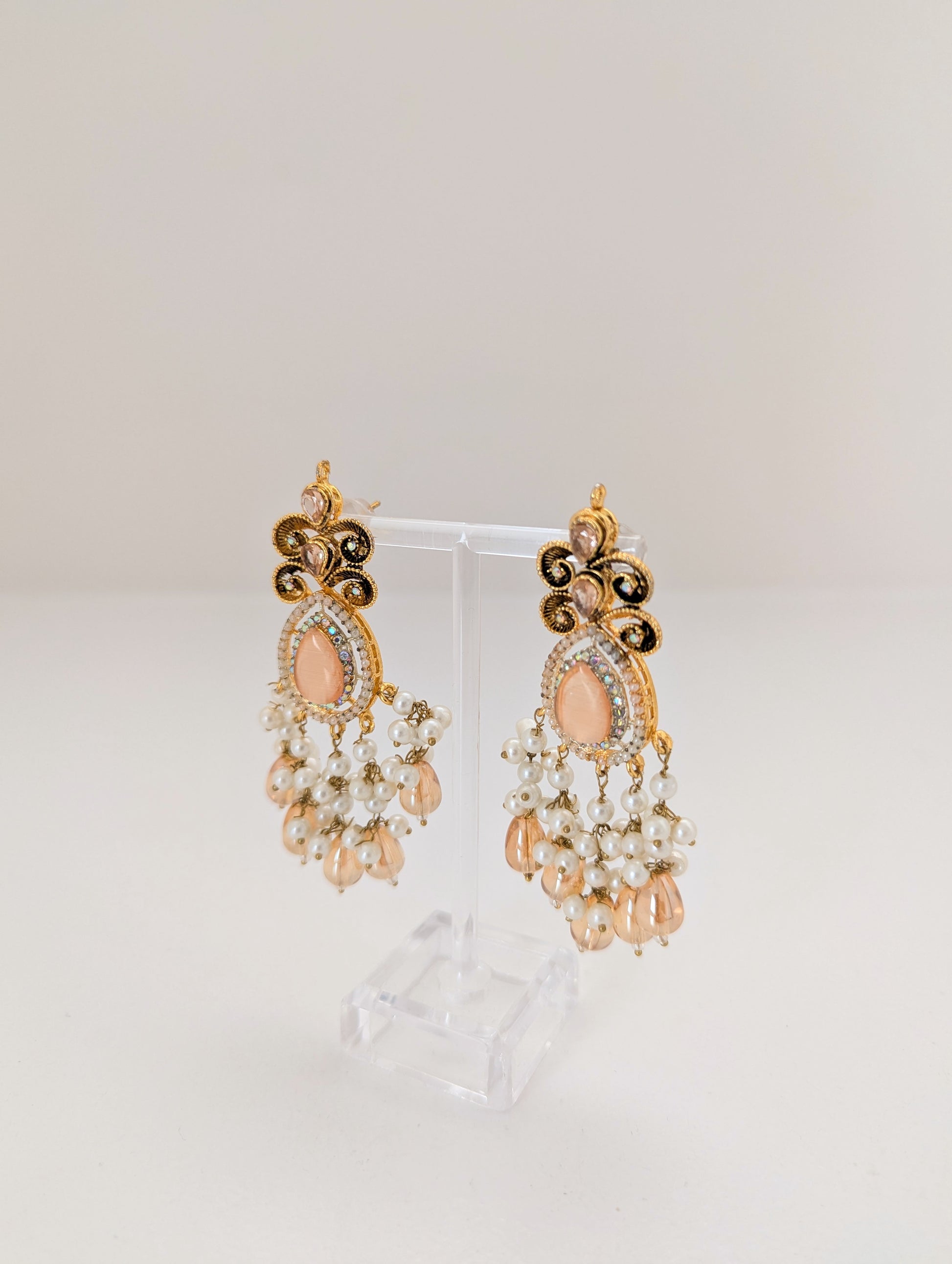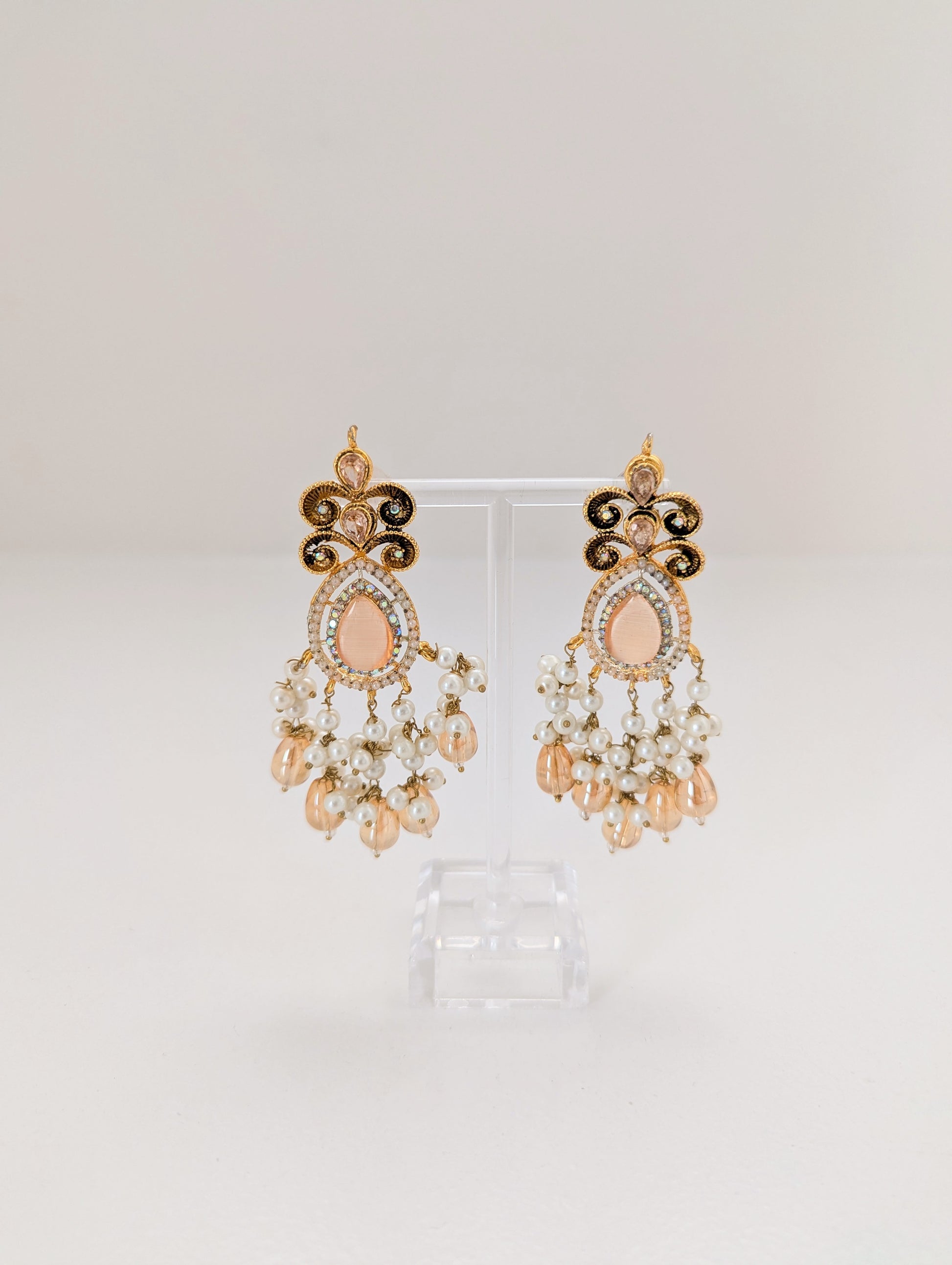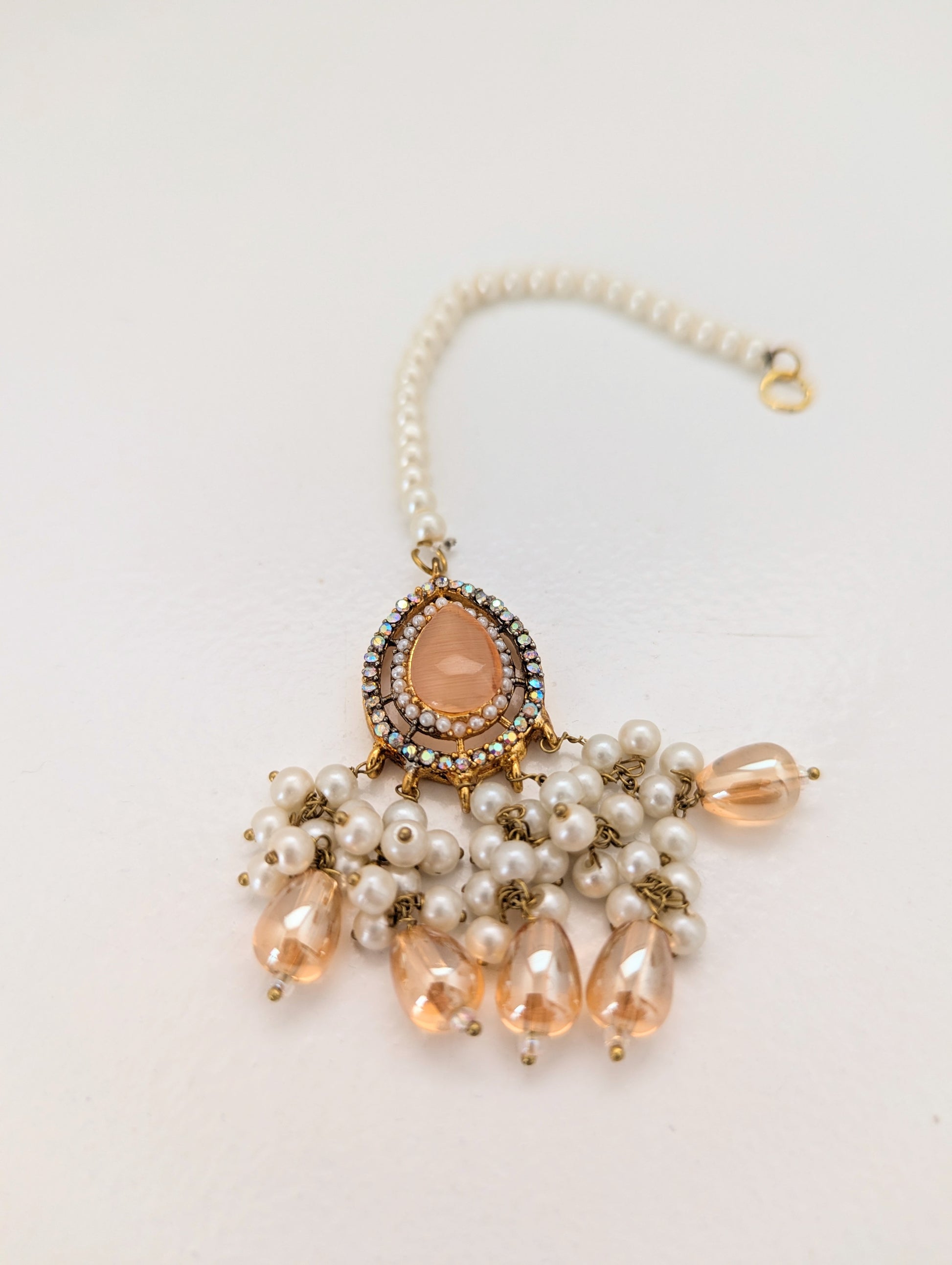This elegant jewelry set includes a choker necklace, earrings, and a maang tikka. The pieces feature teardrop-shaped peach stones, intricate gold detailing, and pearl with peach bead accents. Perfect for weddings or festive occasions.