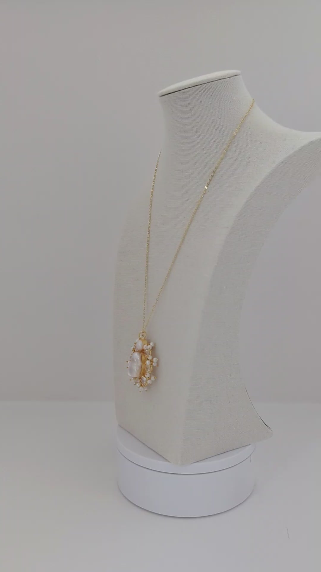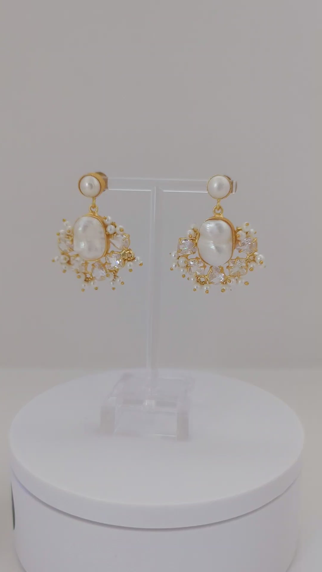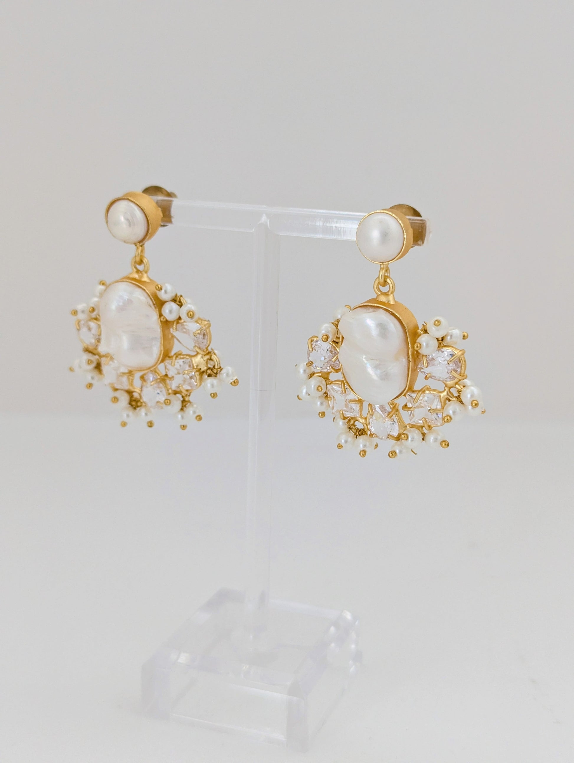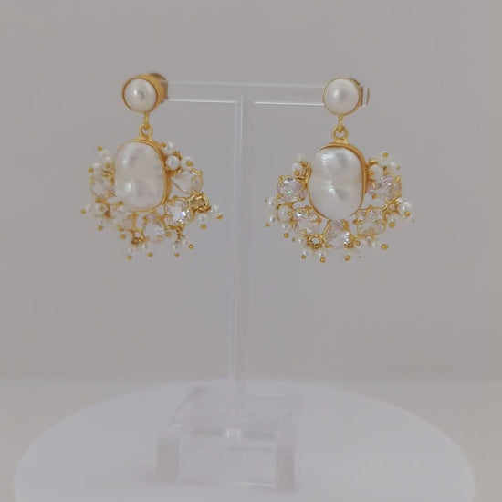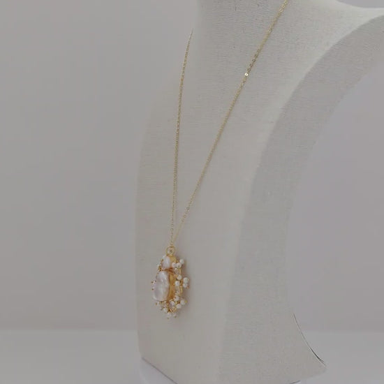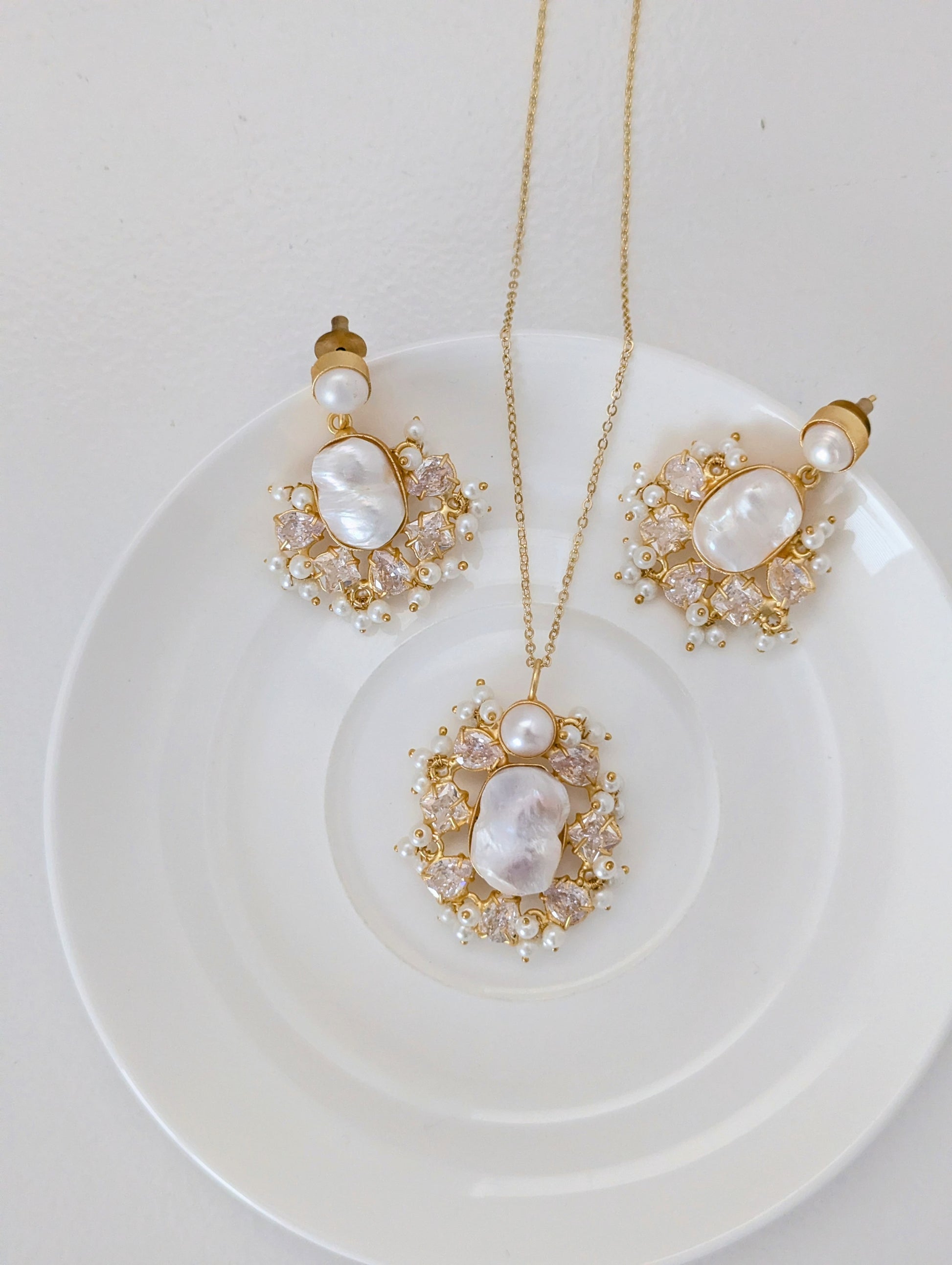 A luminous pearl jewelry set featuring a delicate gold-tone finish, this matching necklace and earring duo is centered around organic mother-of-pearl stones framed by sparkling crystal accents and tiny pearl clusters. Elegant yet softly modern, the design catches the light beautifully, making it perfect for weddings, festive occasions, or refined everyday wear.