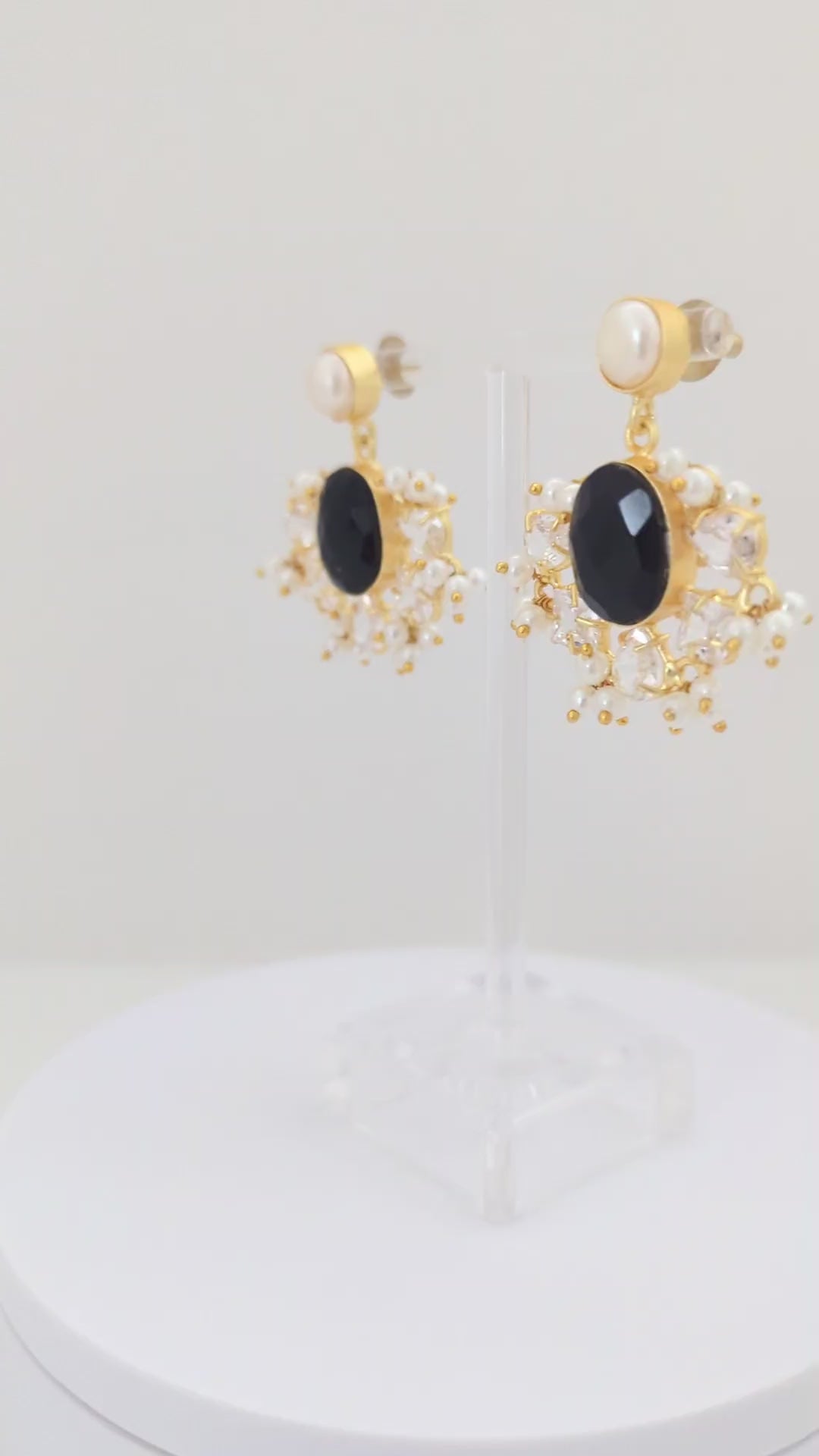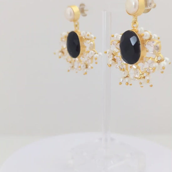 A striking pearl jewelry set with a refined gold-tone finish, this matching necklace and earring duo features a bold black center stone framed by shimmering crystal accents and delicate pearl clusters. The contrast between the dark centerpiece and luminous pearls creates an elegant, statement-making look—perfect for evening wear, weddings, and special occasions where understated luxury shines.
