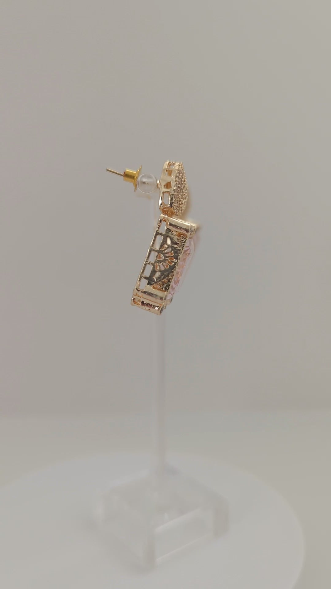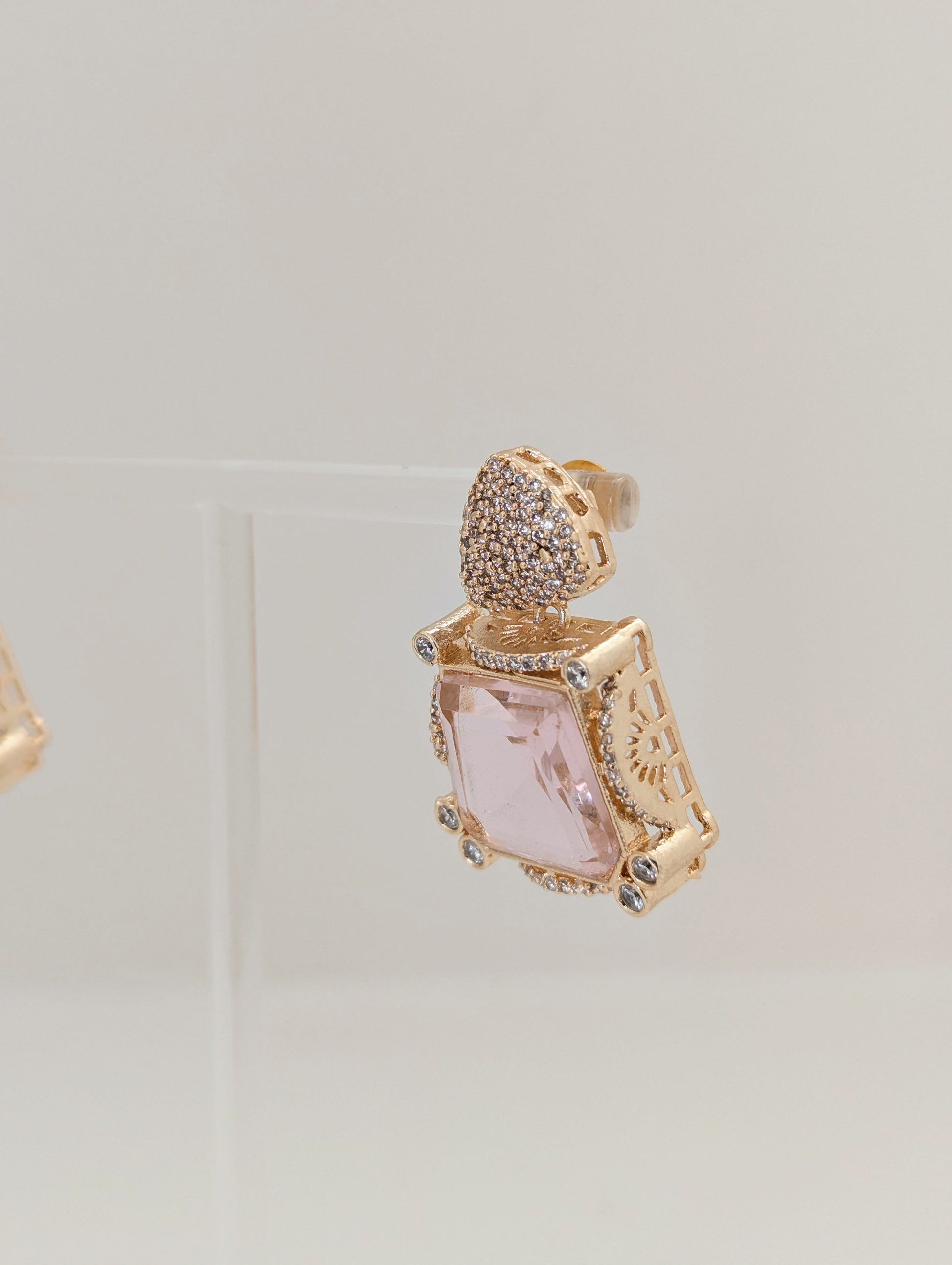 These elegant earrings feature a striking Pink geometric stone set in a gold-toned frame. The top portion is adorned with a pavé of small, shimmering crystals in a teardrop shape, adding a luxurious sparkle. The main gem is bordered by a halo of tiny clear stones, enhancing its brilliance and opulence. The design blends vintage charm with a modern edge, making these earrings a statement accessory for formal occasions.