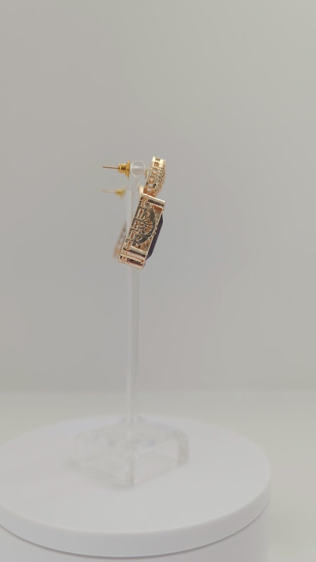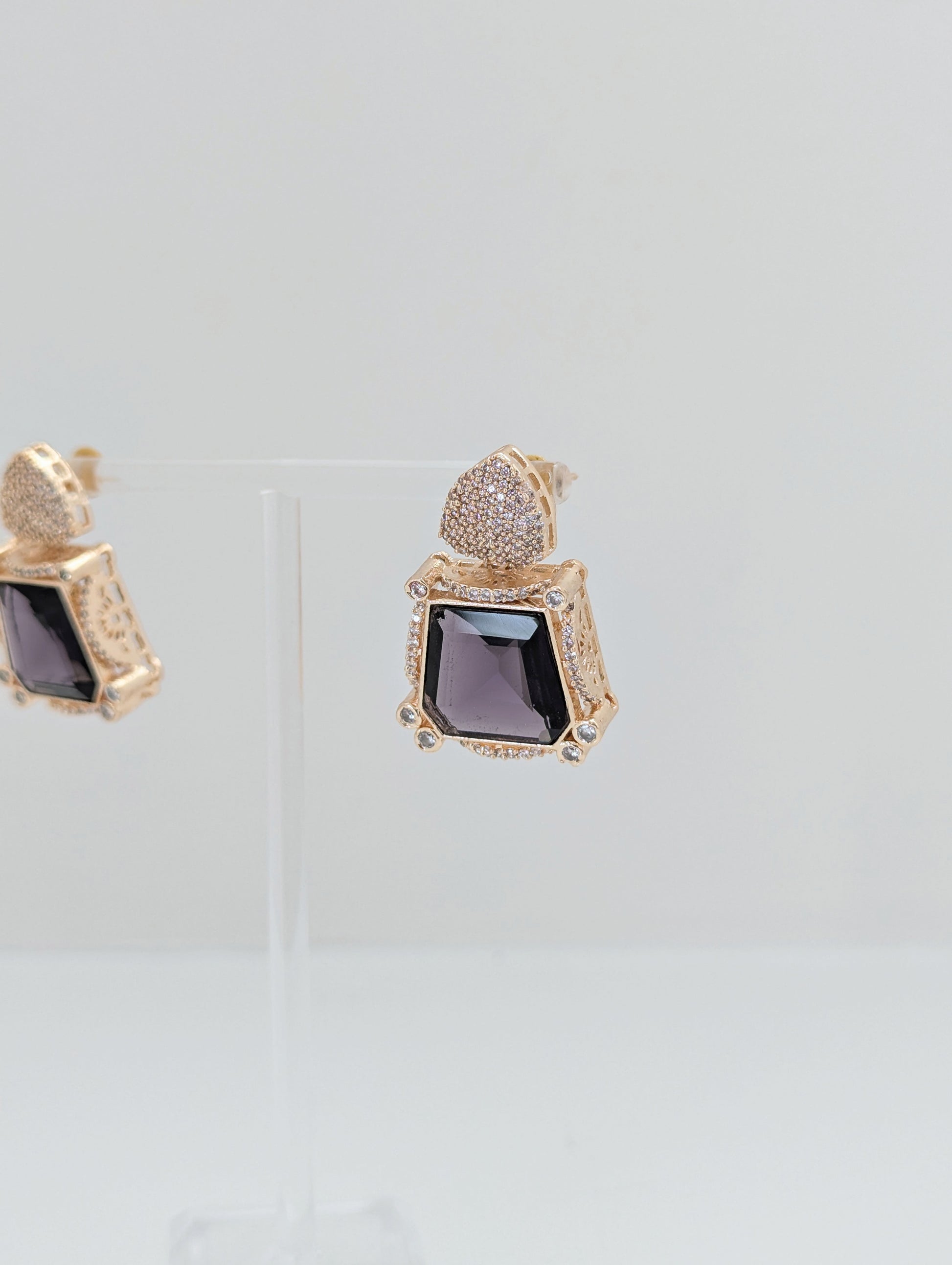 These elegant earrings feature a striking purple geometric stone set in a gold-toned frame. The top portion is adorned with a pavé of small, shimmering crystals in a teardrop shape, adding a luxurious sparkle. The main gem is bordered by a halo of tiny clear stones, enhancing its brilliance and opulence. The design blends vintage charm with a modern edge, making these earrings a statement accessory for formal occasions.