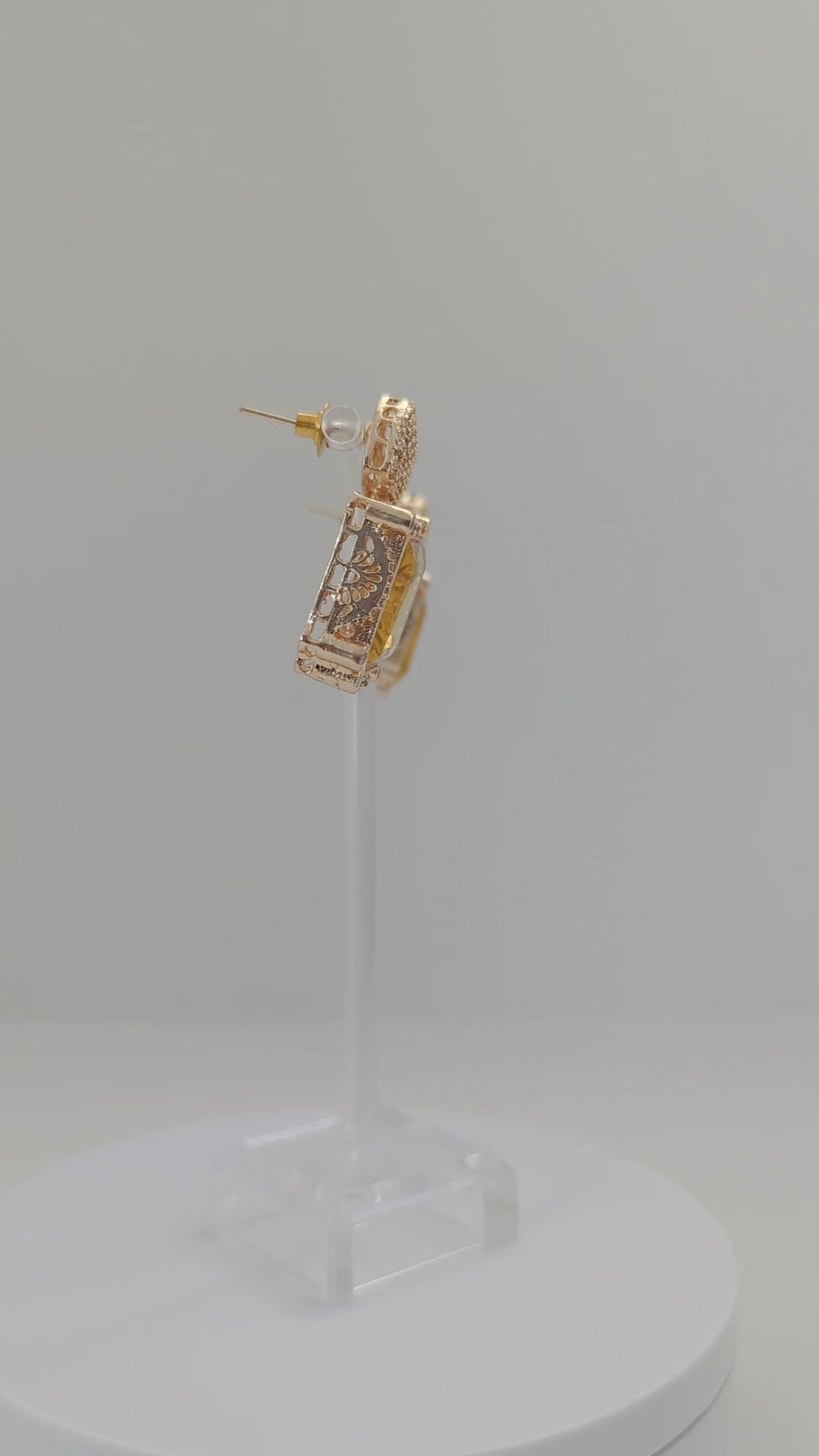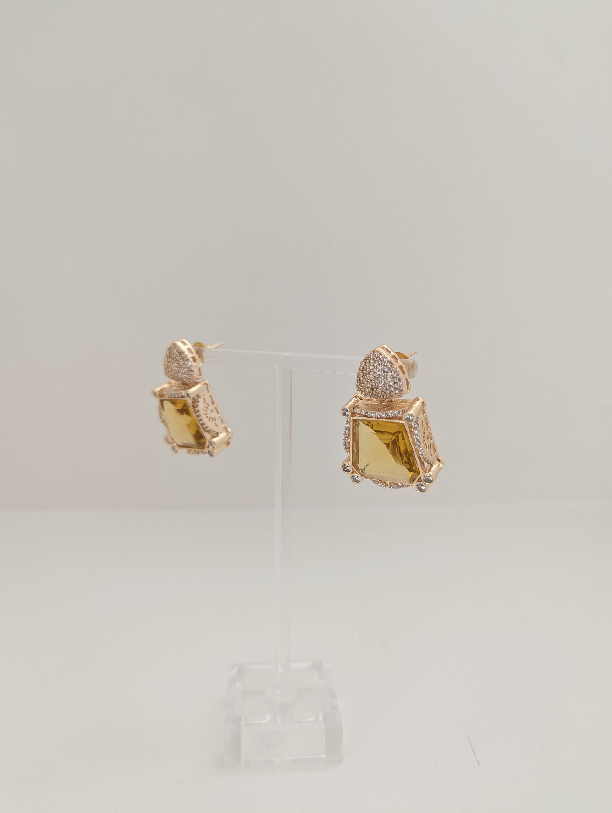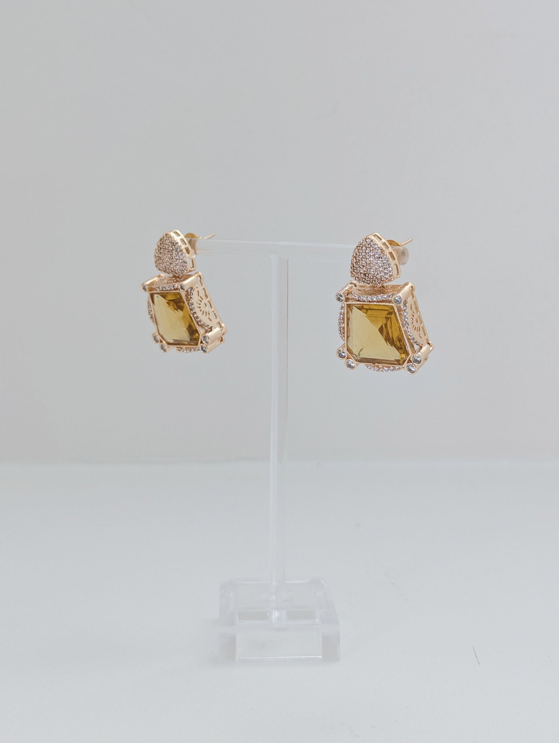 These elegant earrings feature a striking Yellow geometric stone set in a gold-toned frame. The top portion is adorned with a pavé of small, shimmering crystals in a teardrop shape, adding a luxurious sparkle. The main gem is bordered by a halo of tiny clear stones, enhancing its brilliance and opulence. The design blends vintage charm with a modern edge, making these earrings a statement accessory for formal occasions.