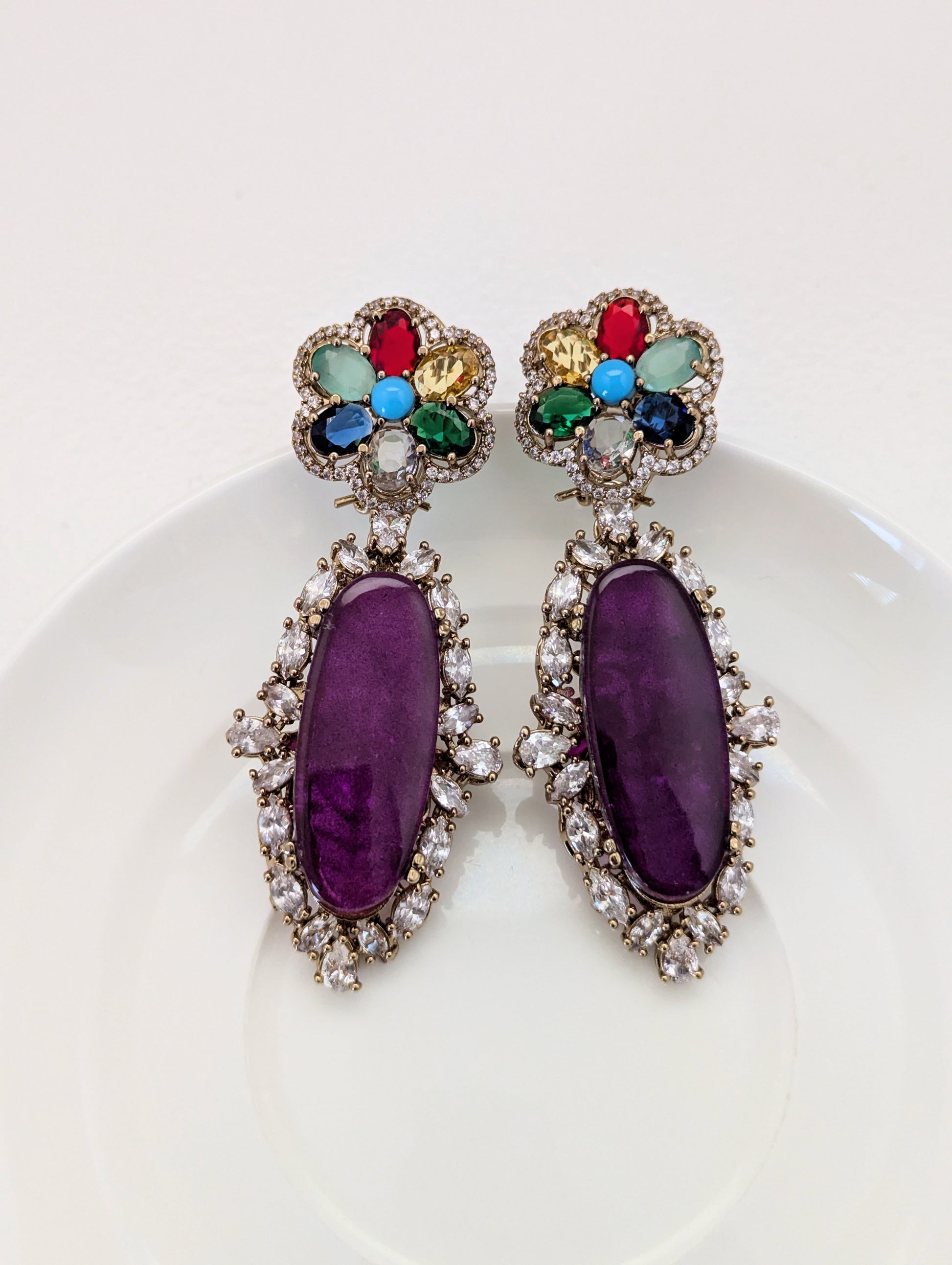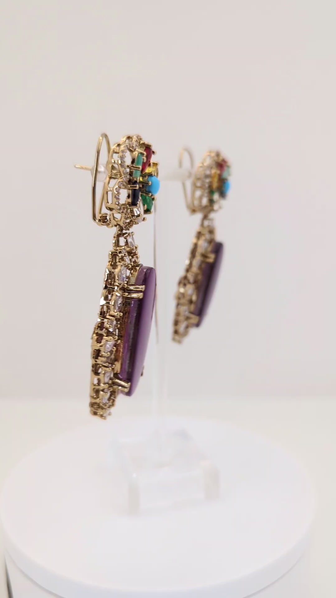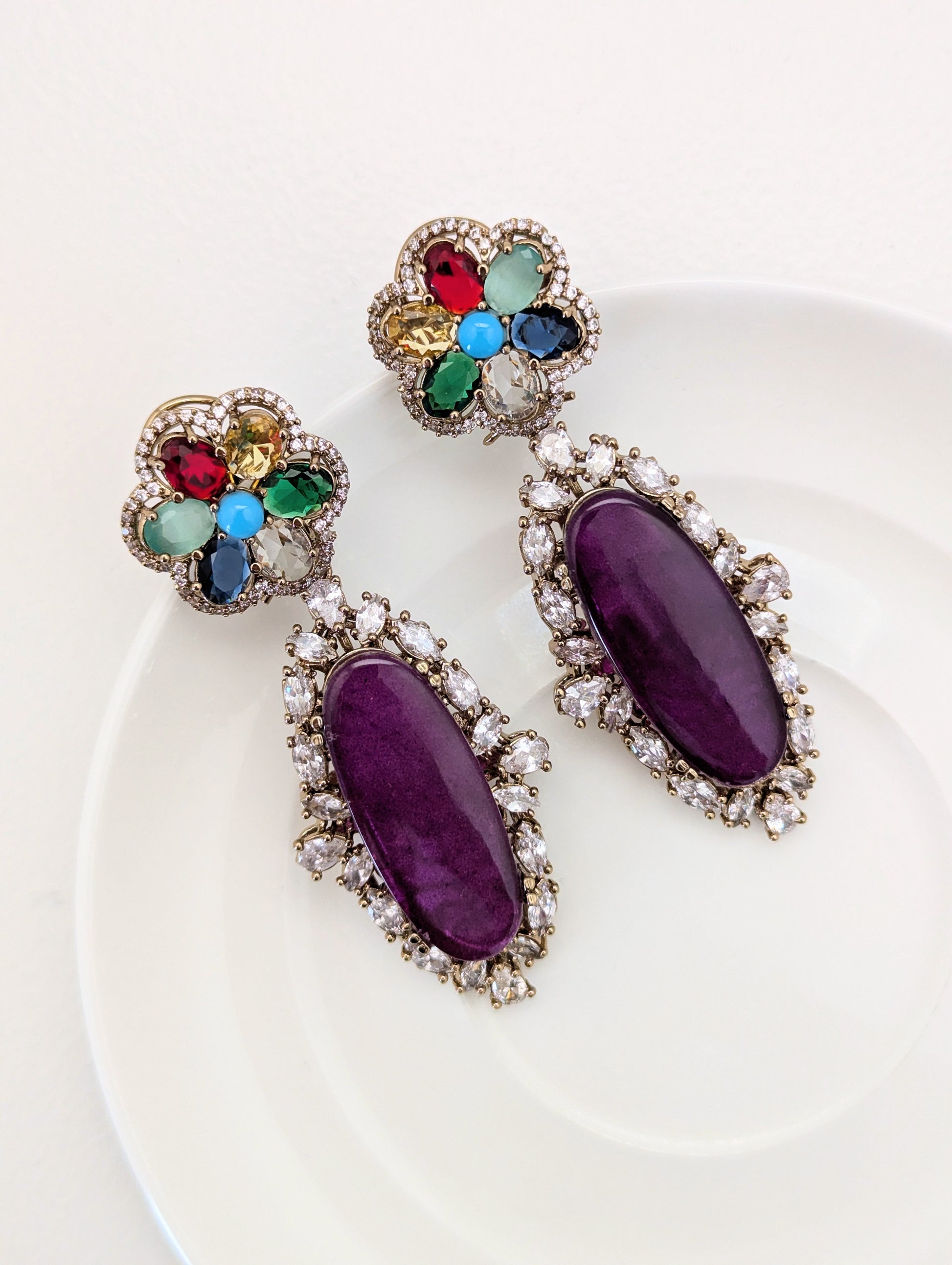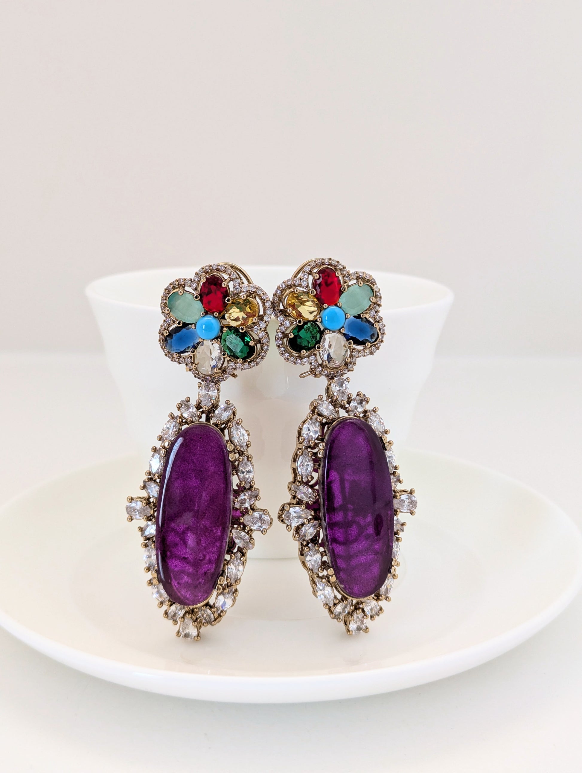These statement earrings feature a bold and regal design with large oval purple stones as the centerpiece, elegantly bordered by clusters of sparkling white crystals. The top portion showcases a floral-inspired arrangement of multicolored gemstones—red, yellow, green, blue, and turquoise—framed with shimmering accents, adding a vibrant and playful contrast to the rich green base. The combination of vivid colors and vintage-inspired settings gives these earrings a luxurious and festive charm, perfect for celebratory occasions.