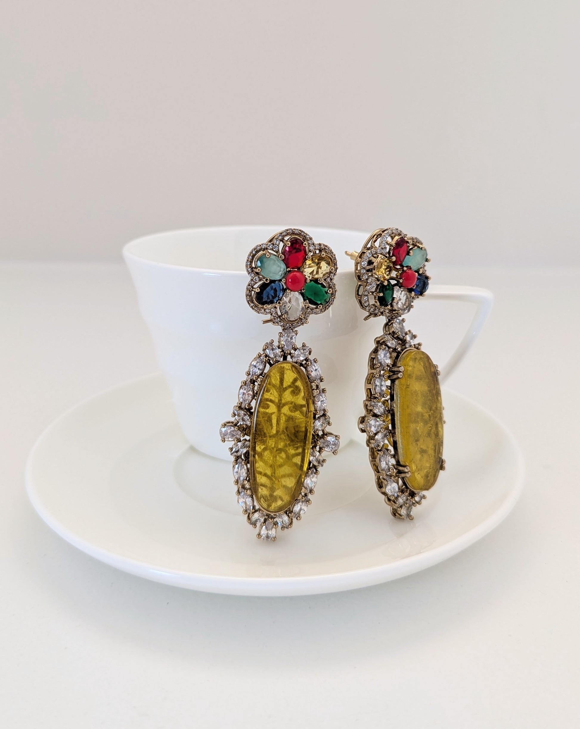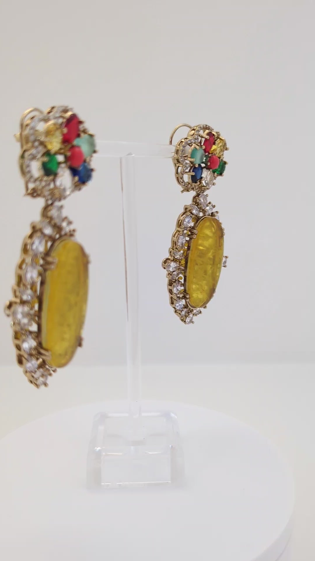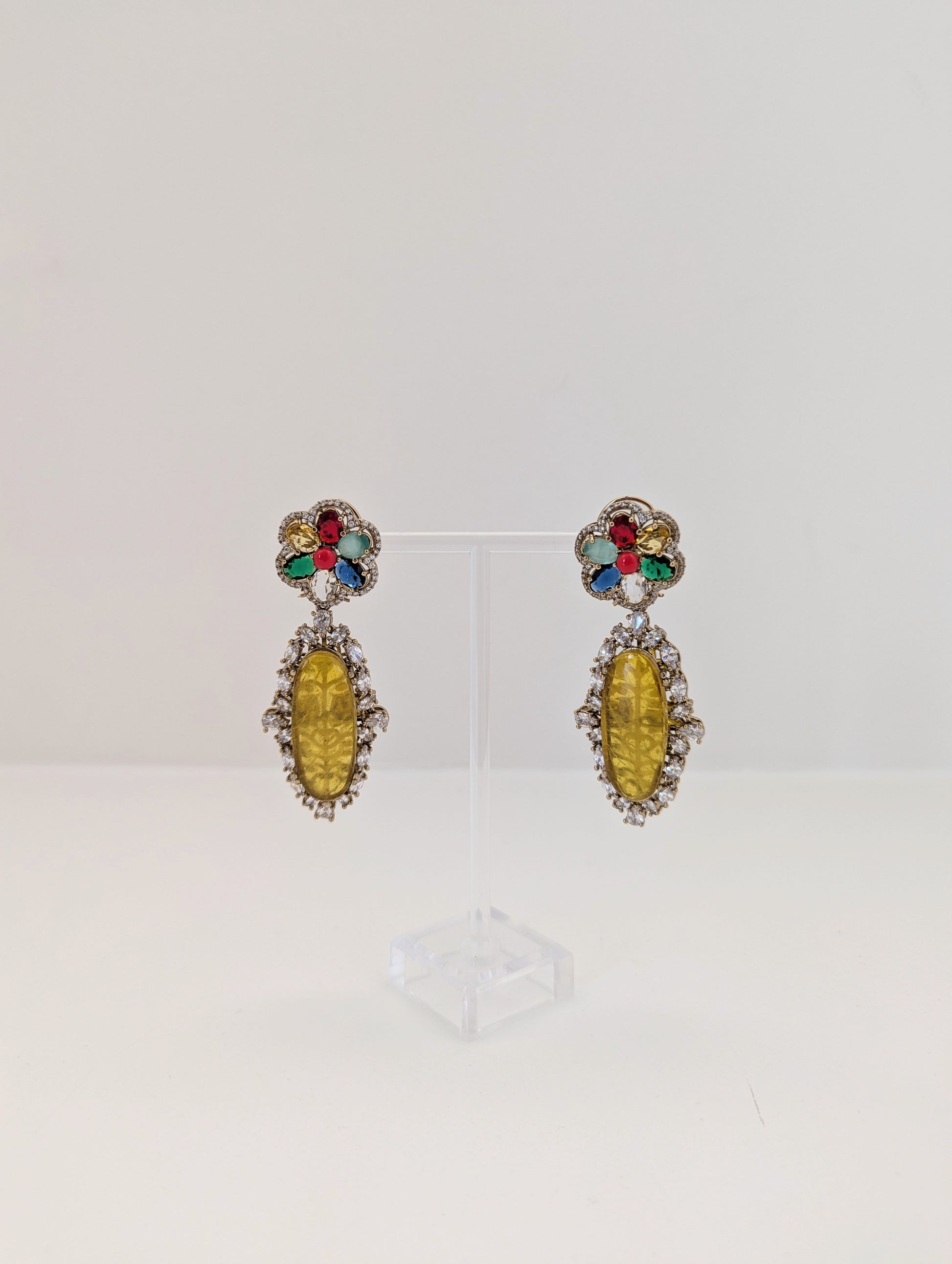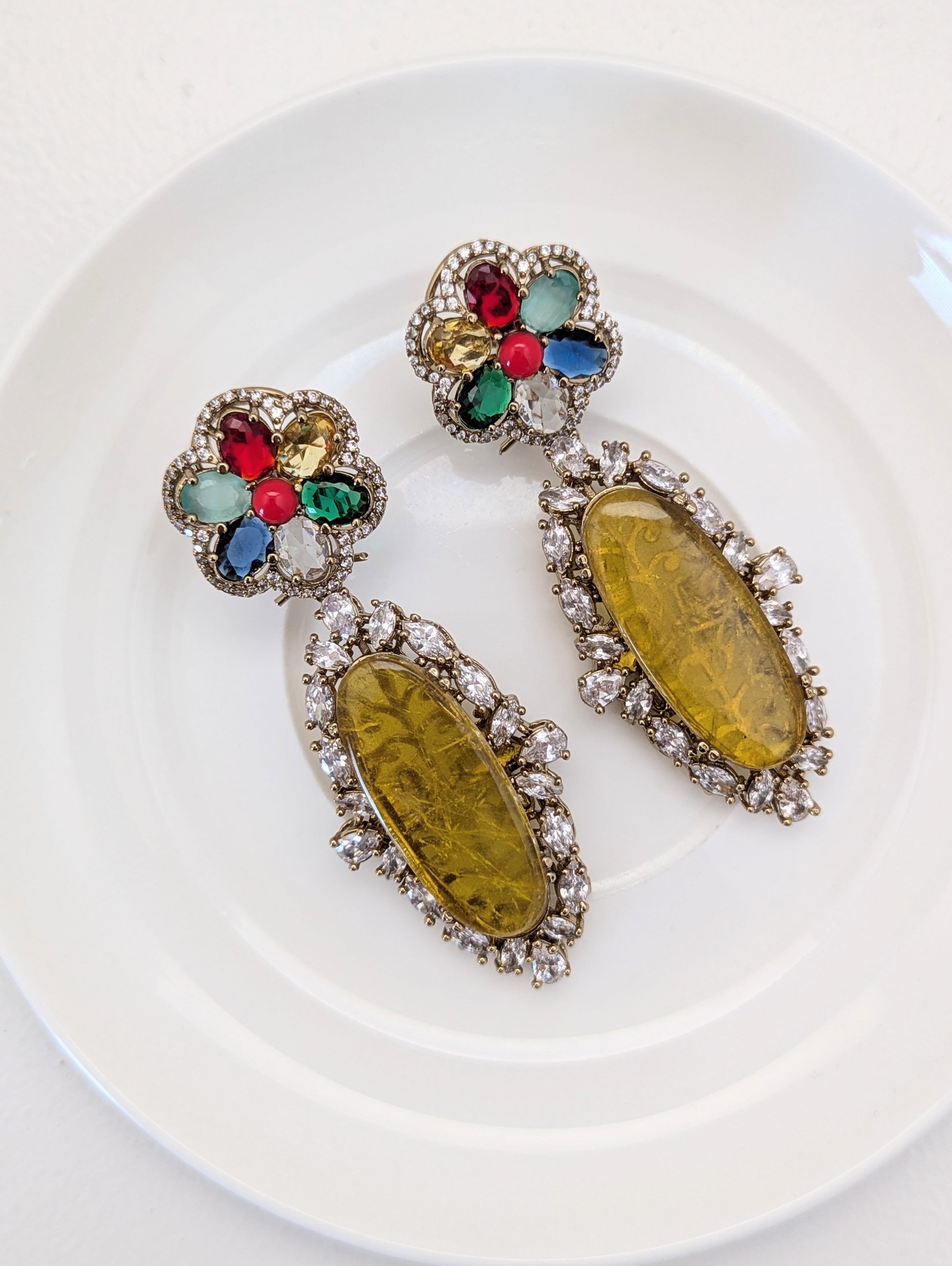 These statement earrings feature a bold and regal design with large oval yellow stones as the centerpiece, elegantly bordered by clusters of sparkling white crystals. The top portion showcases a floral-inspired arrangement of multicolored gemstones—red, yellow, green, blue, and turquoise—framed with shimmering accents, adding a vibrant and playful contrast to the rich green base. The combination of vivid colors and vintage-inspired settings gives these earrings a luxurious and festive charm, perfect for celebratory occasions.