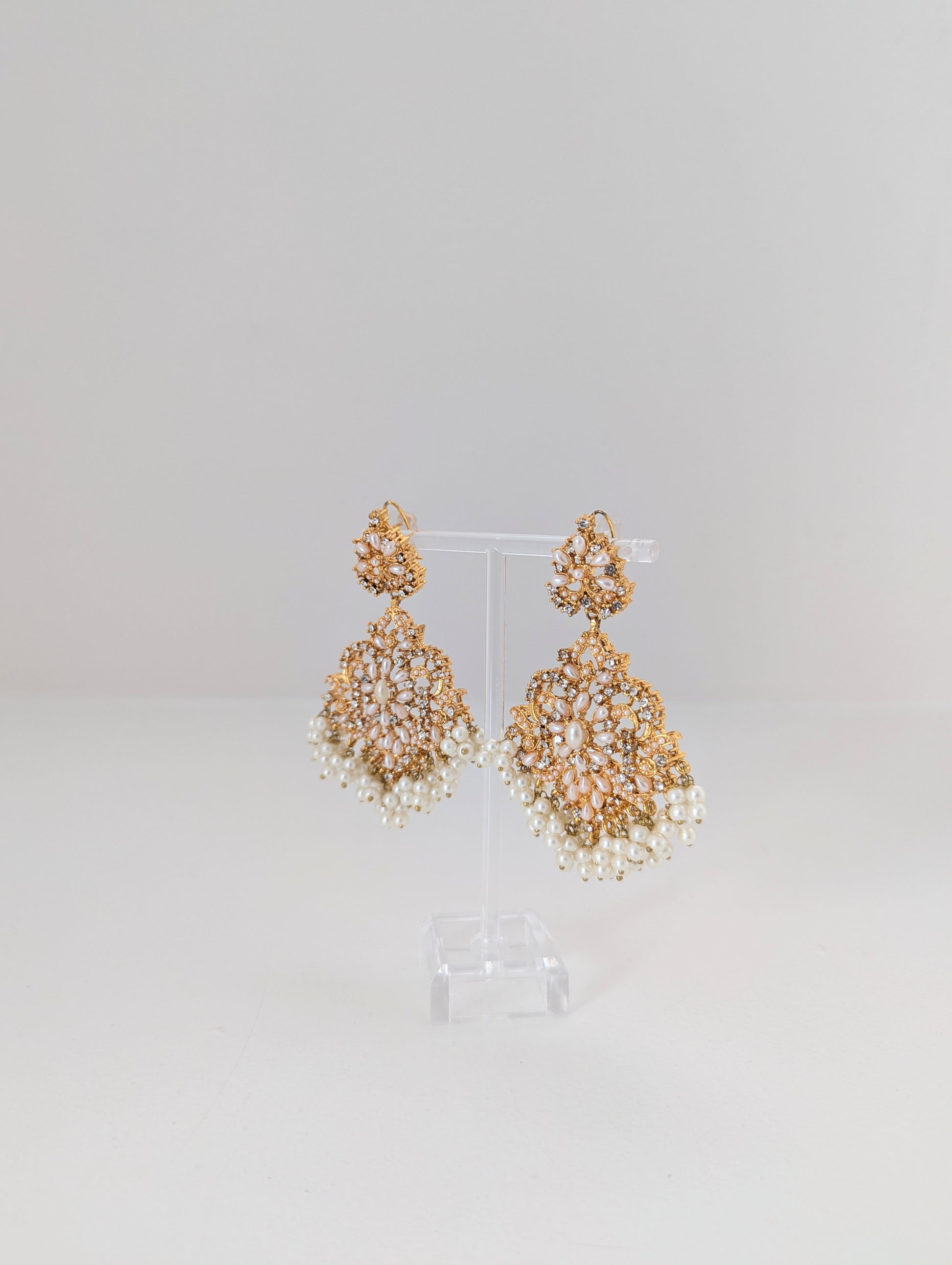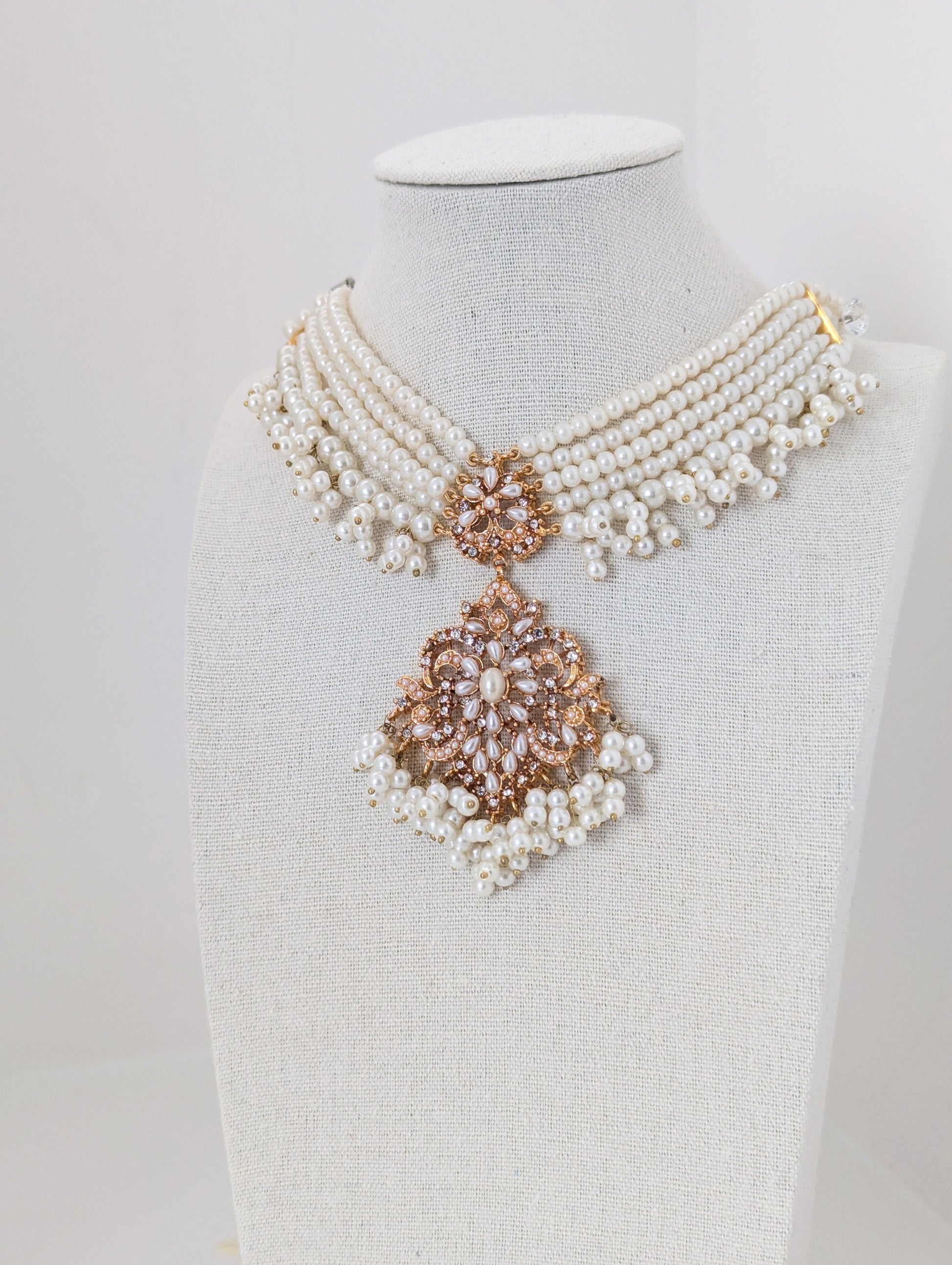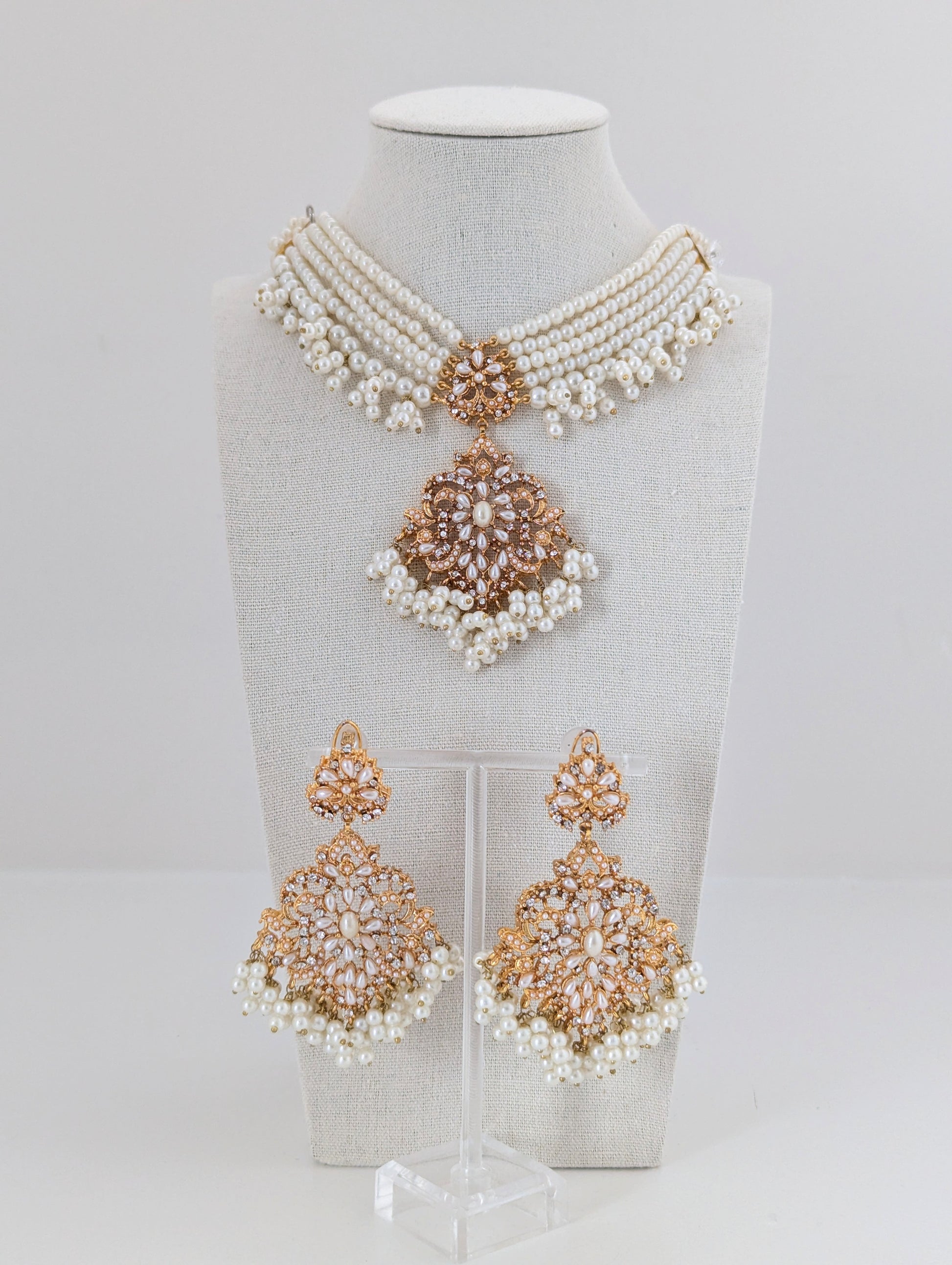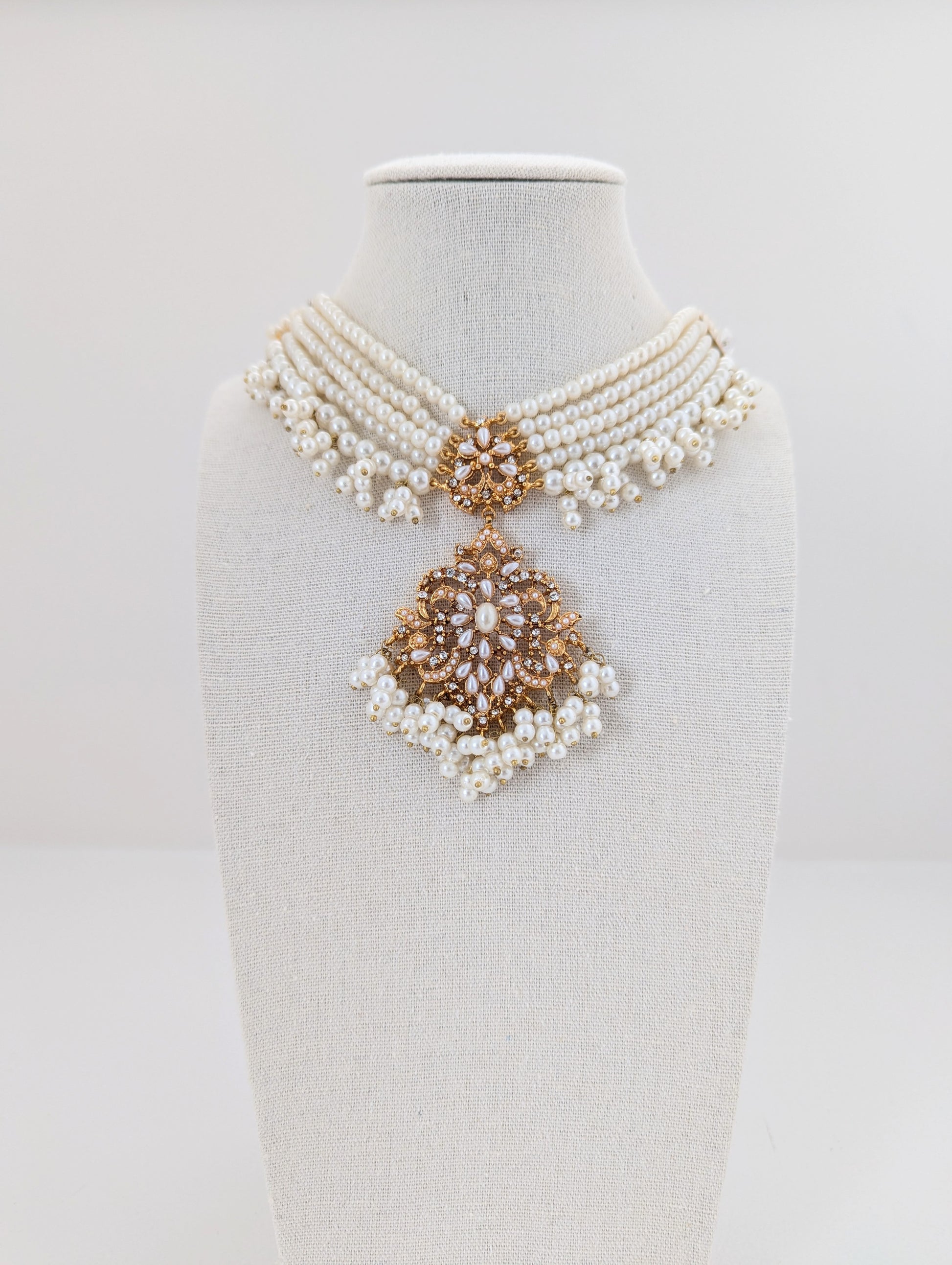This is an elegant jewelry set featuring a off-white bead choker necklace with pearl accents and a floral gold pendant, paired with matching chandelier earrings adorned with stones, pearls, and intricate gold detailing.