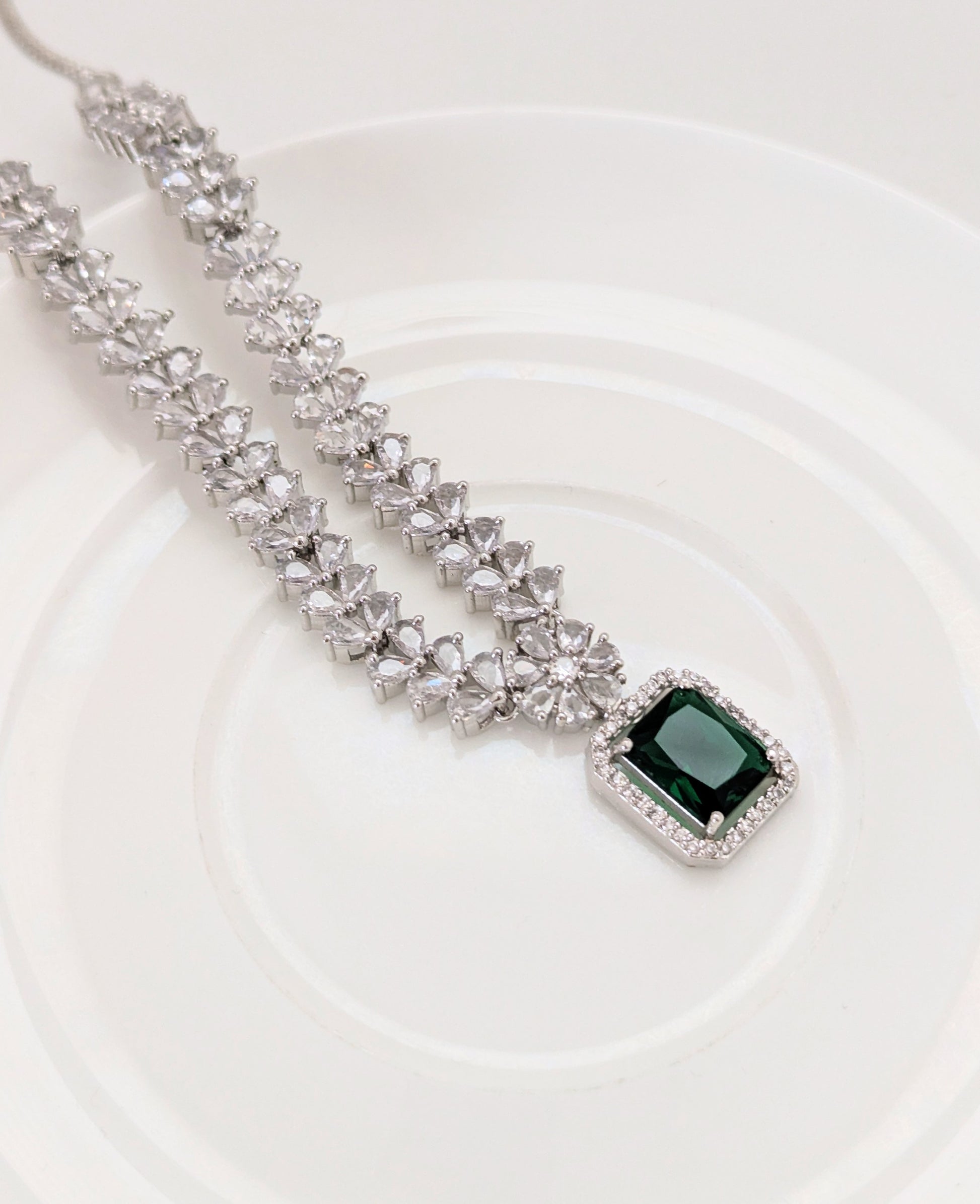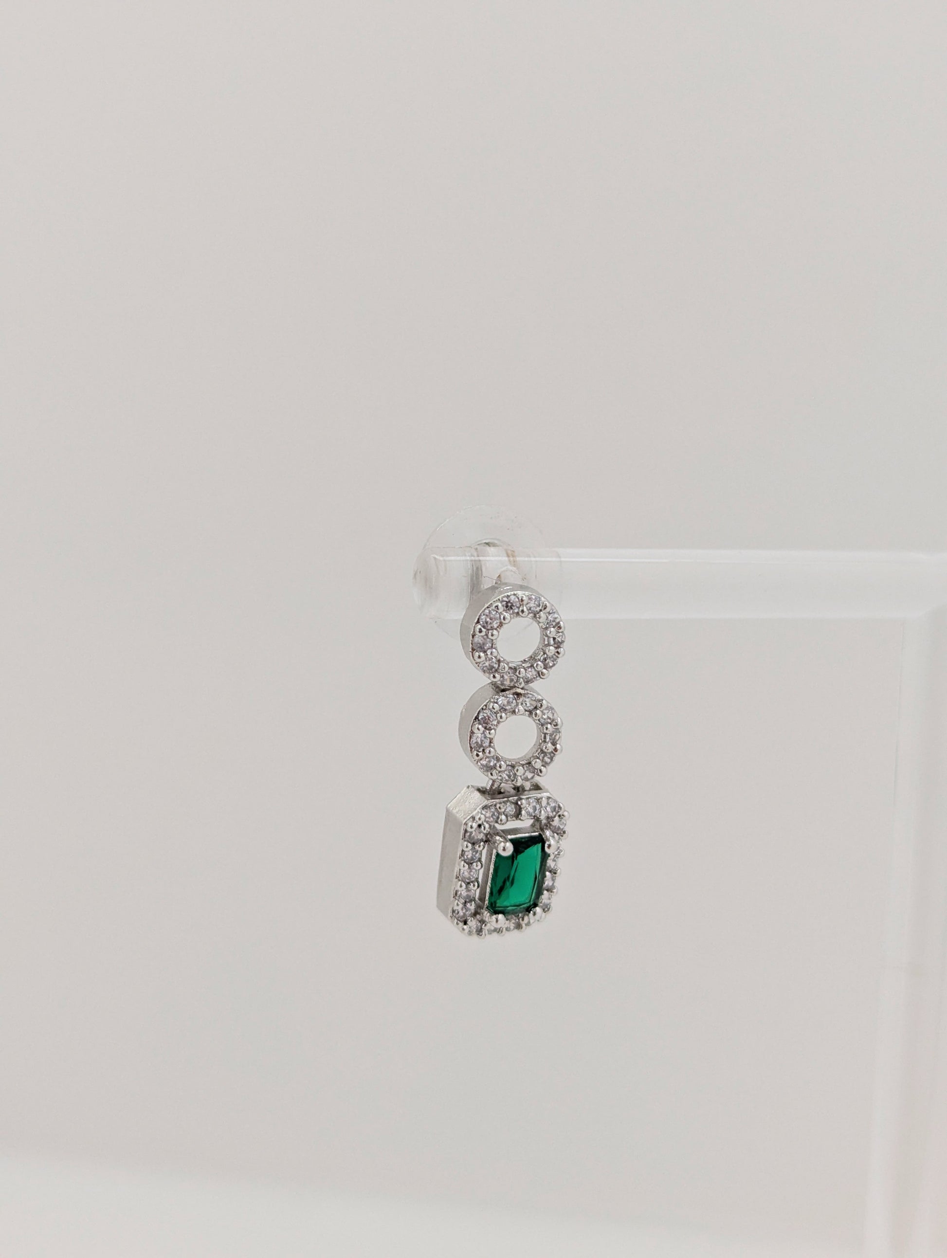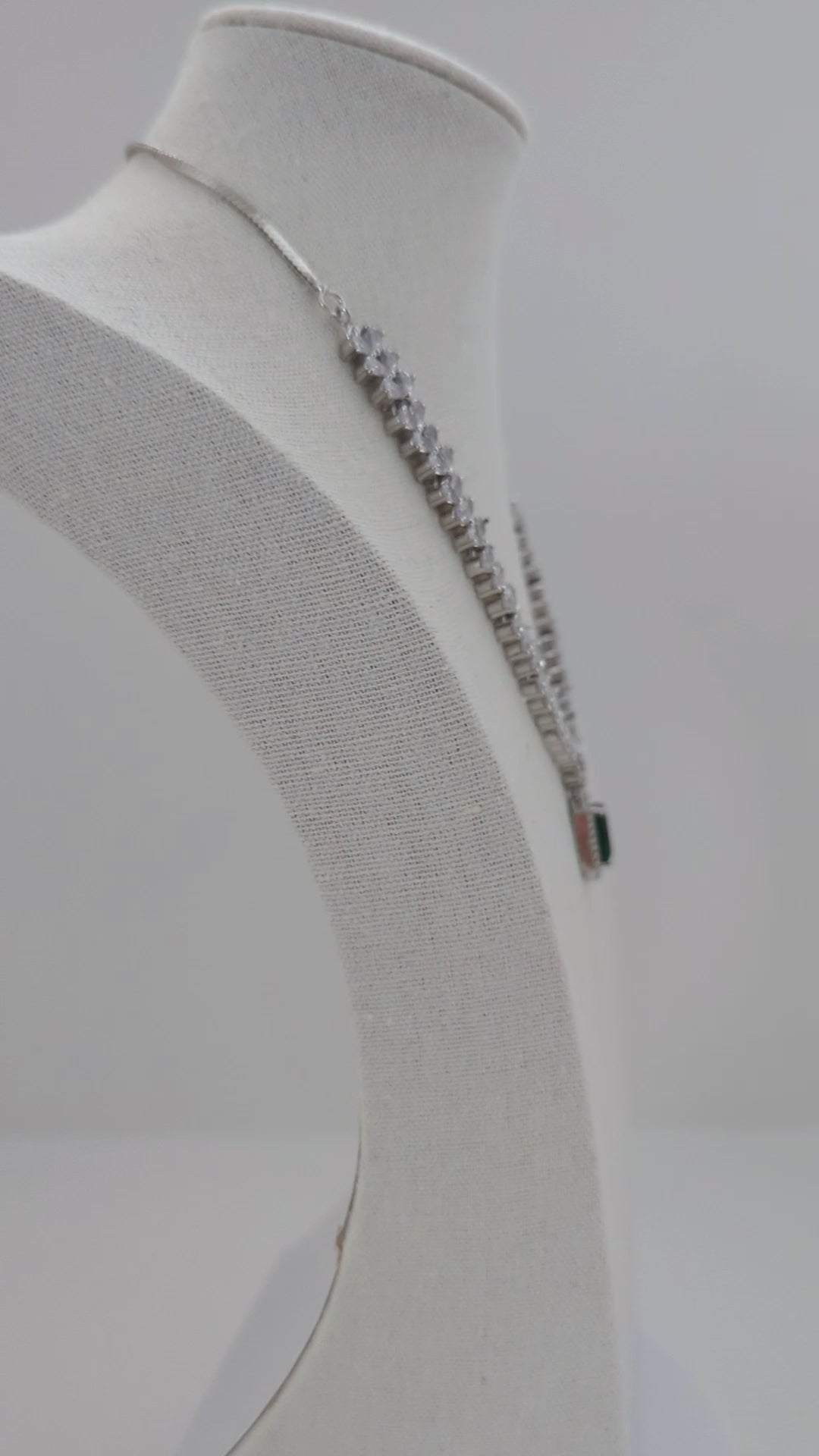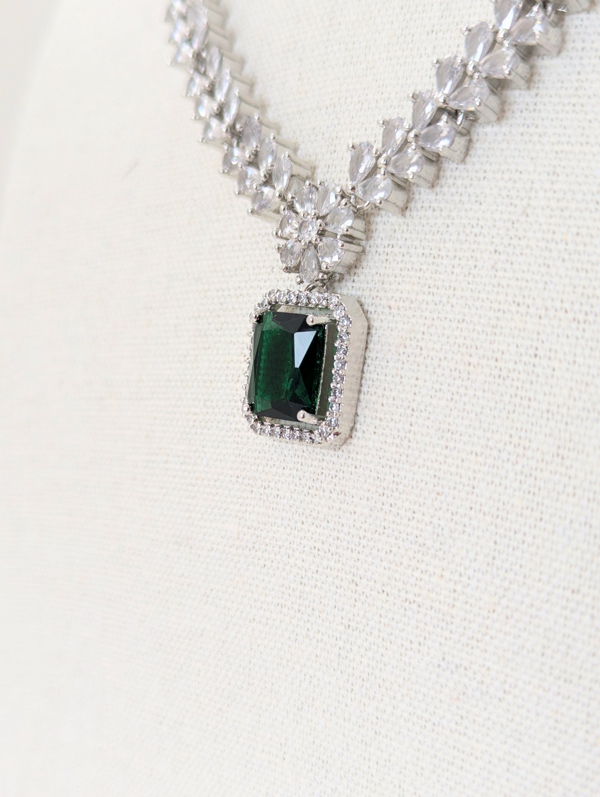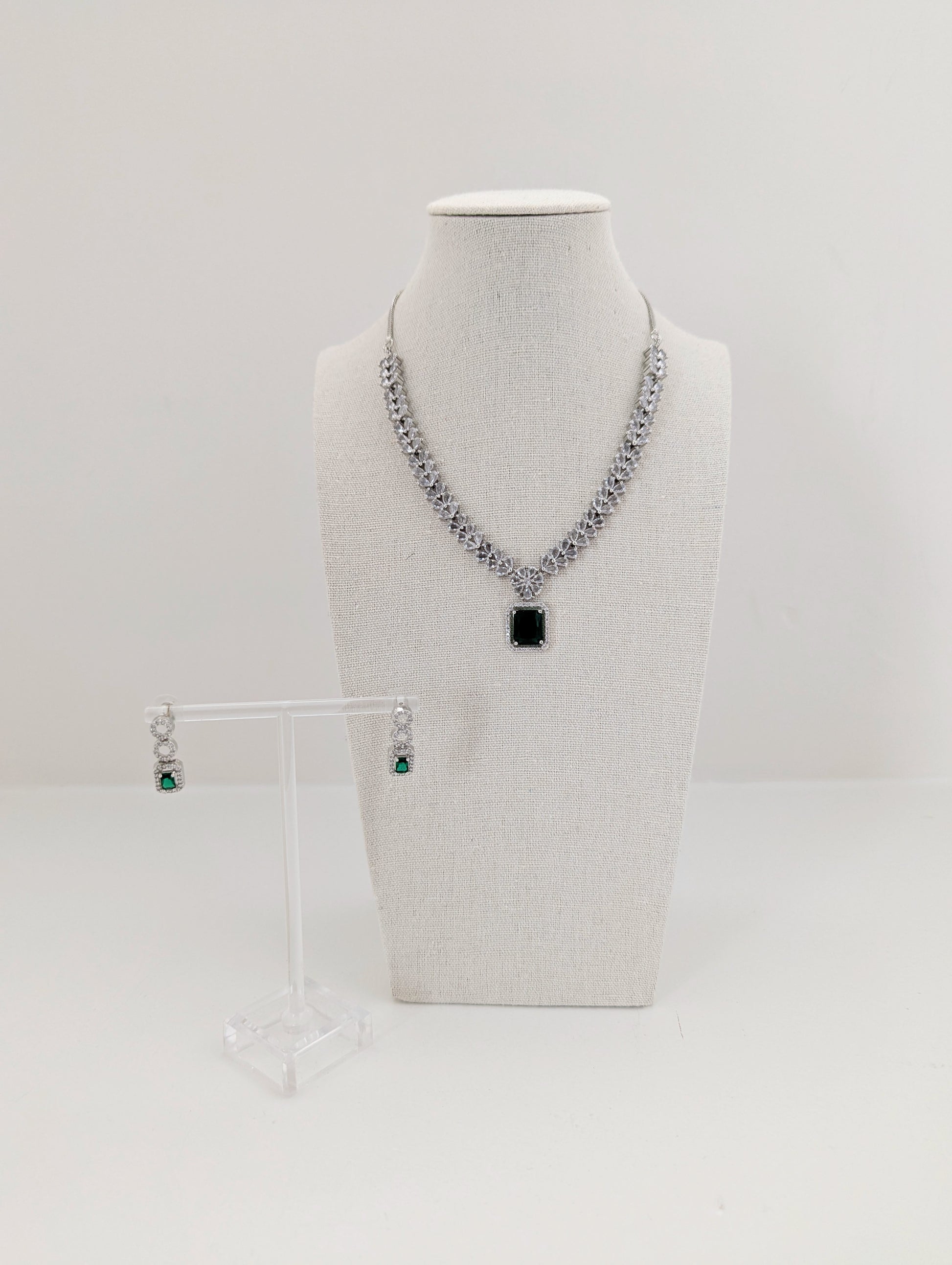This elegant jewelry set features a coordinated design of silver-toned metal adorned with sparkling clear stones and striking deep green emerald-cut gems. The set includes a pair of drop earrings showcasing a rectangular green gemstone surrounded by delicate clear crystals, suspended from a double halo of circular crystal settings. The matching necklace boasts a luxurious chain of floral-inspired clusters, culminating in a prominent green emerald-cut pendant bordered by shimmering clear stones. Perfect for formal occasions, this set combines classic sophistication with a touch of vibrant color.