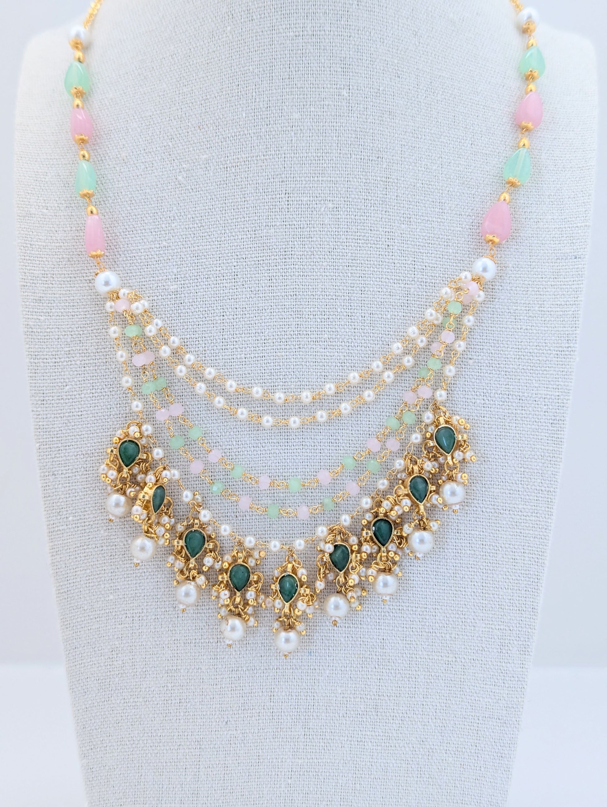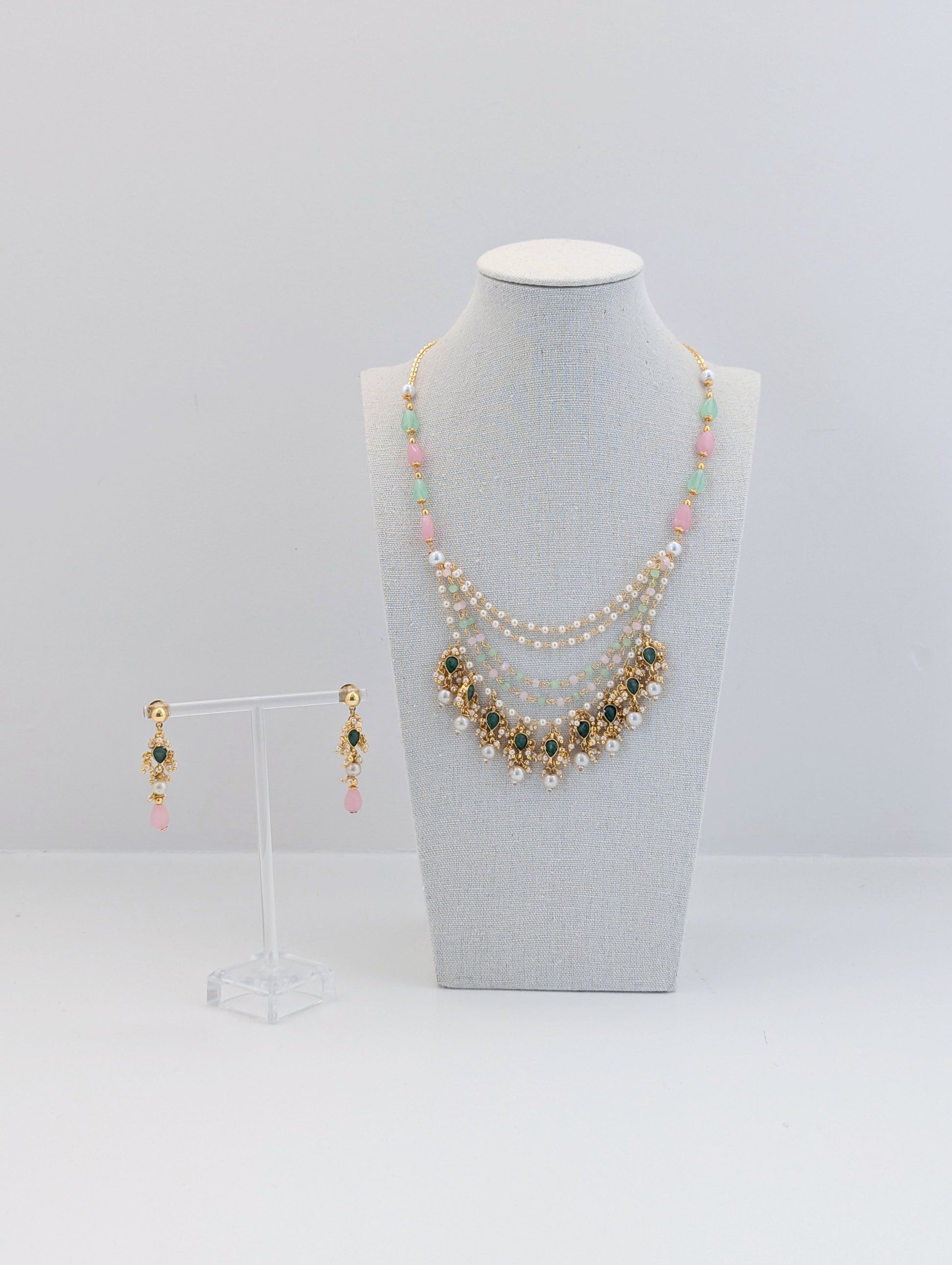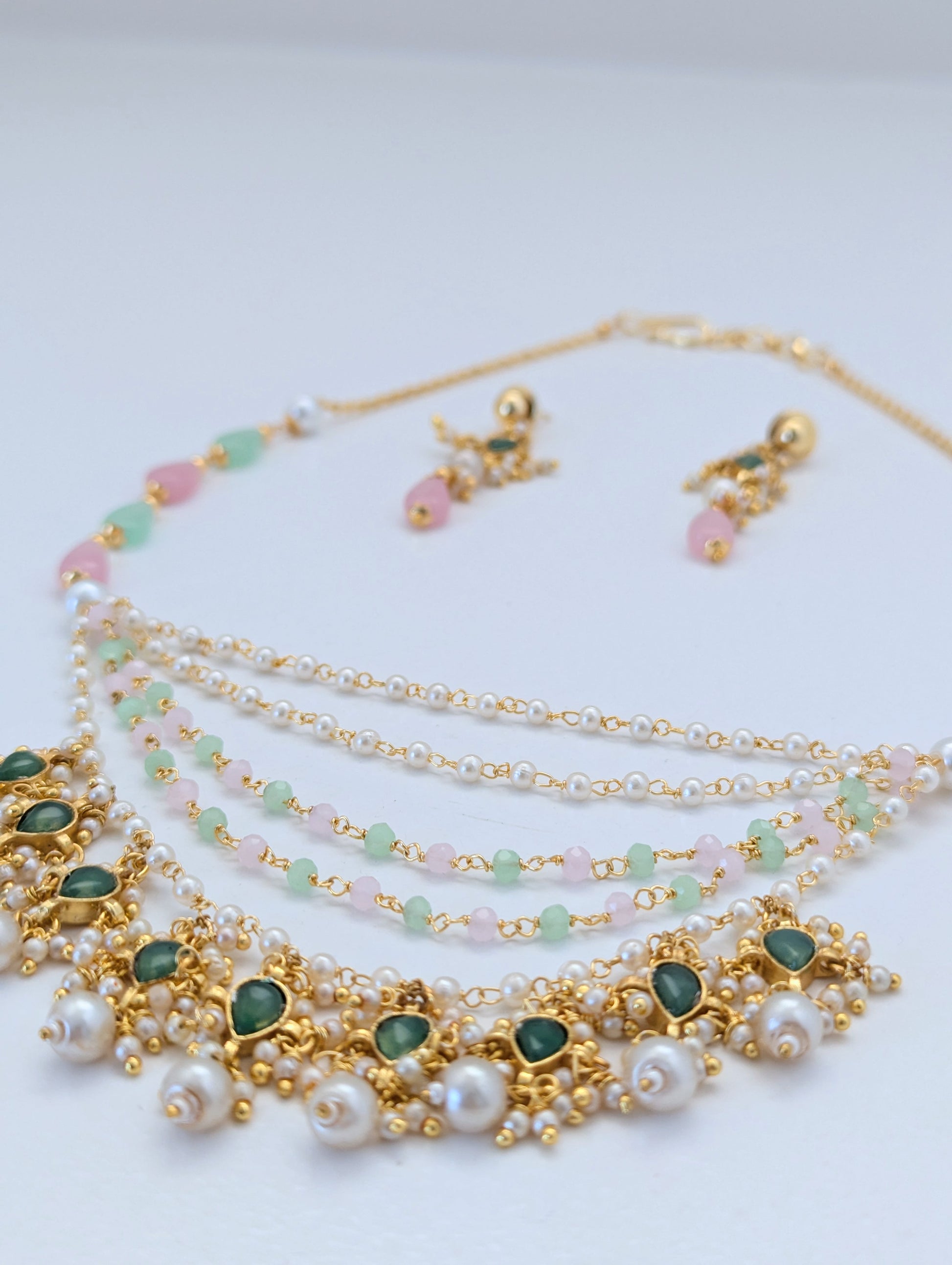 This elegant Pachi Kundan set is crafted with intricate detailing and features semi-precious stones in soft pastel hues of pink and green. The layered necklace is adorned with lustrous pearls and gold-toned elements, showcasing traditional artistry with a contemporary touch. Matching earrings with green kundan centers, dainty pearls, and pink drops complete the look. A perfect blend of grace and tradition, ideal for festive occasions or weddings.