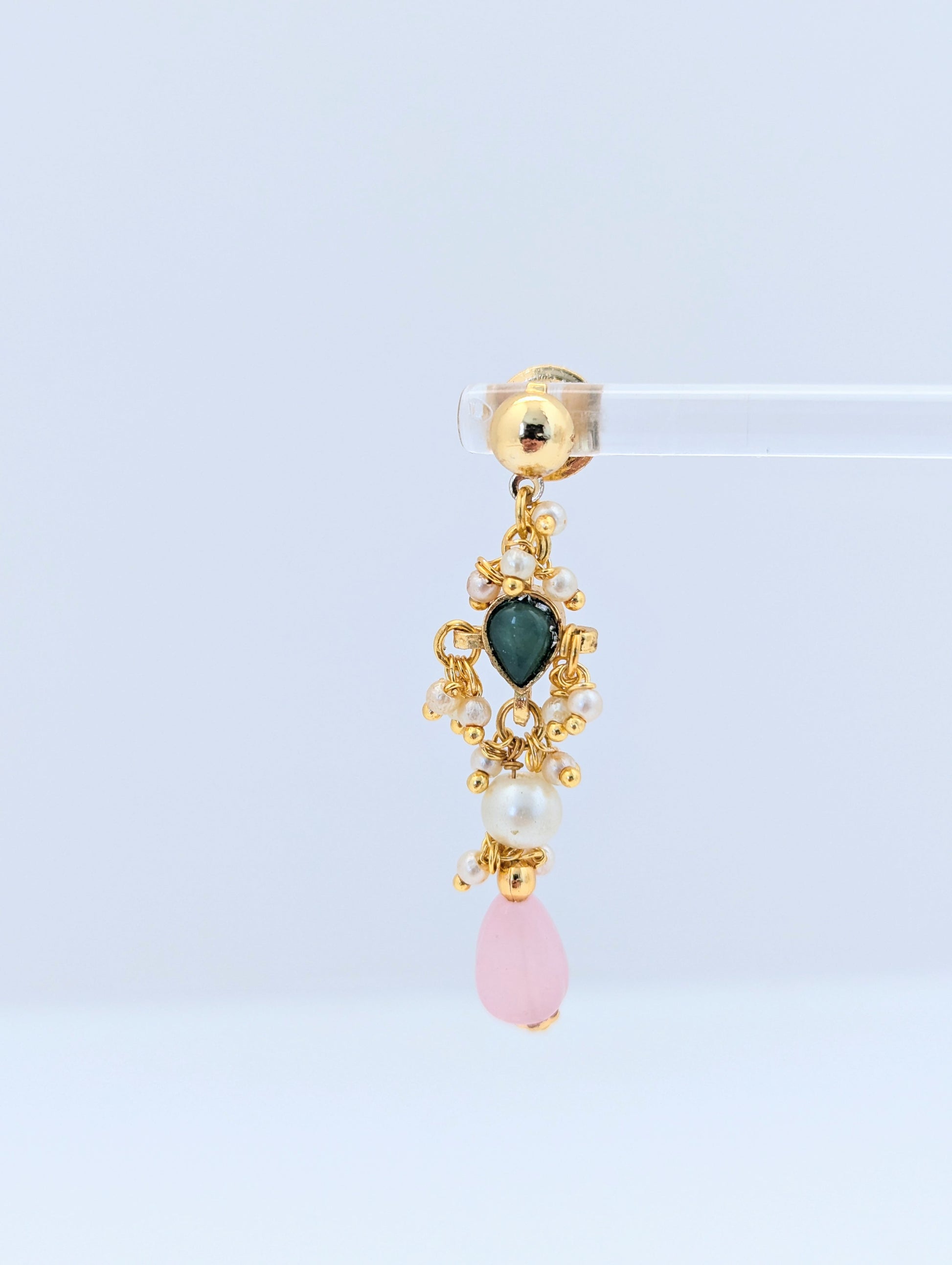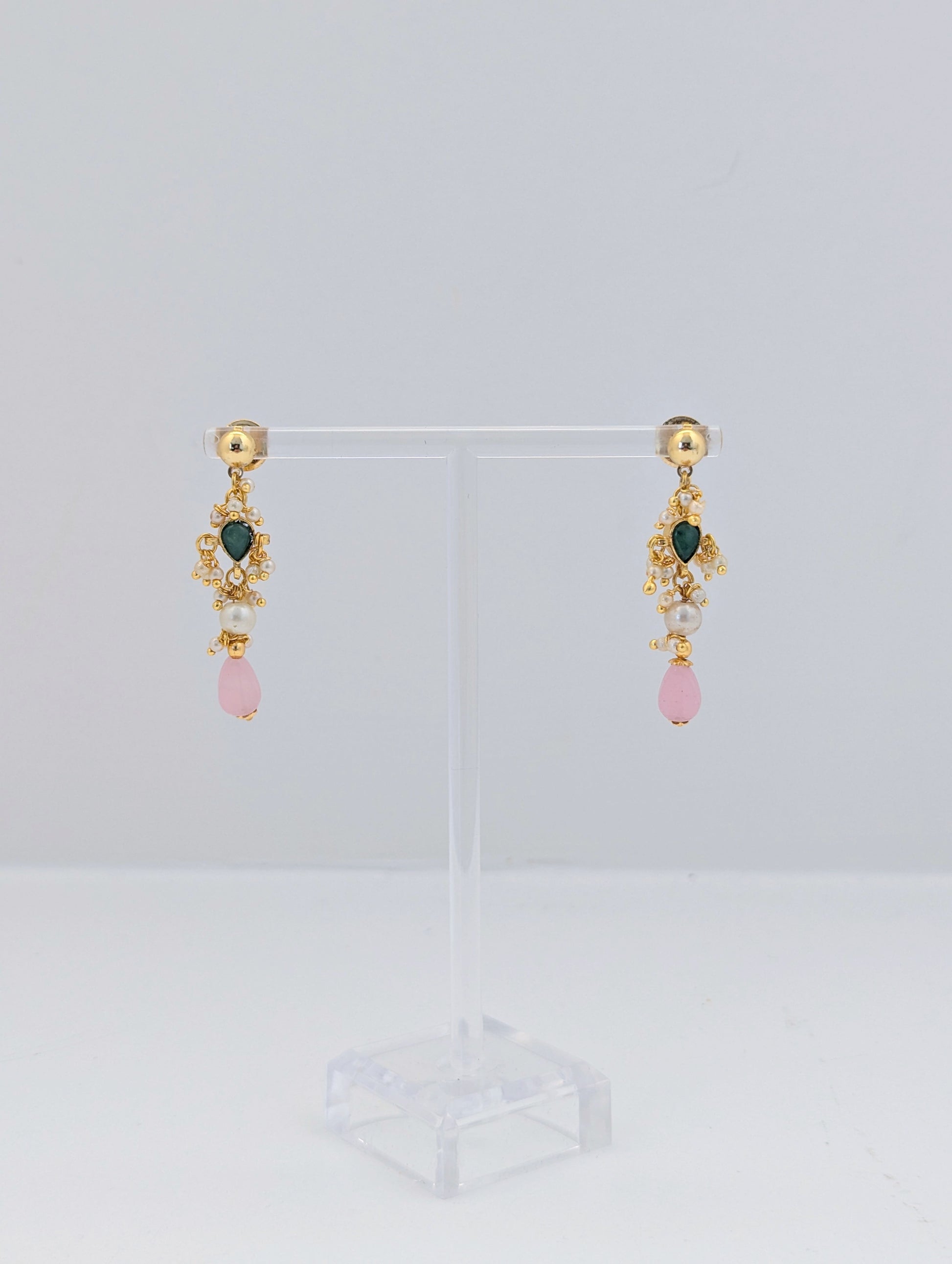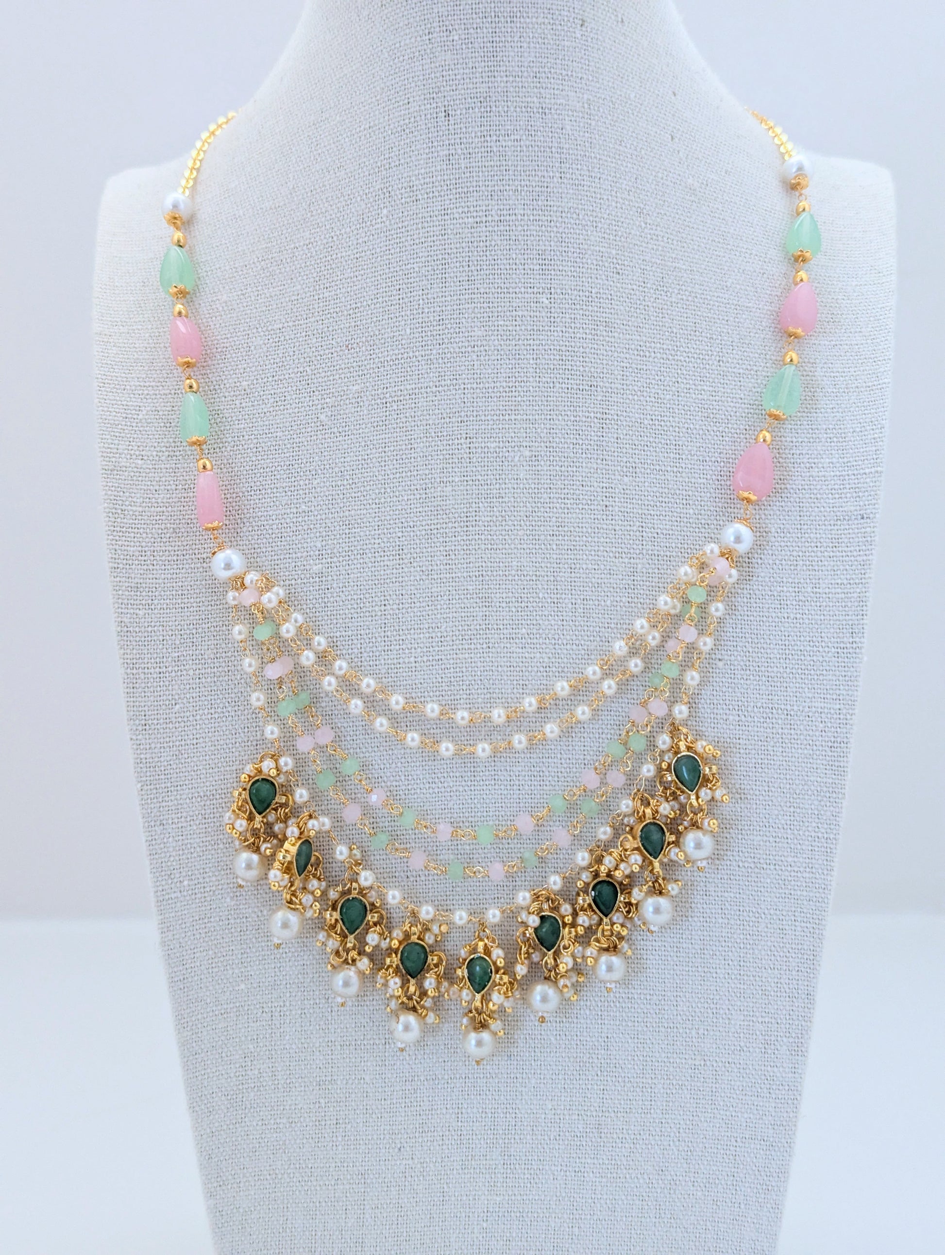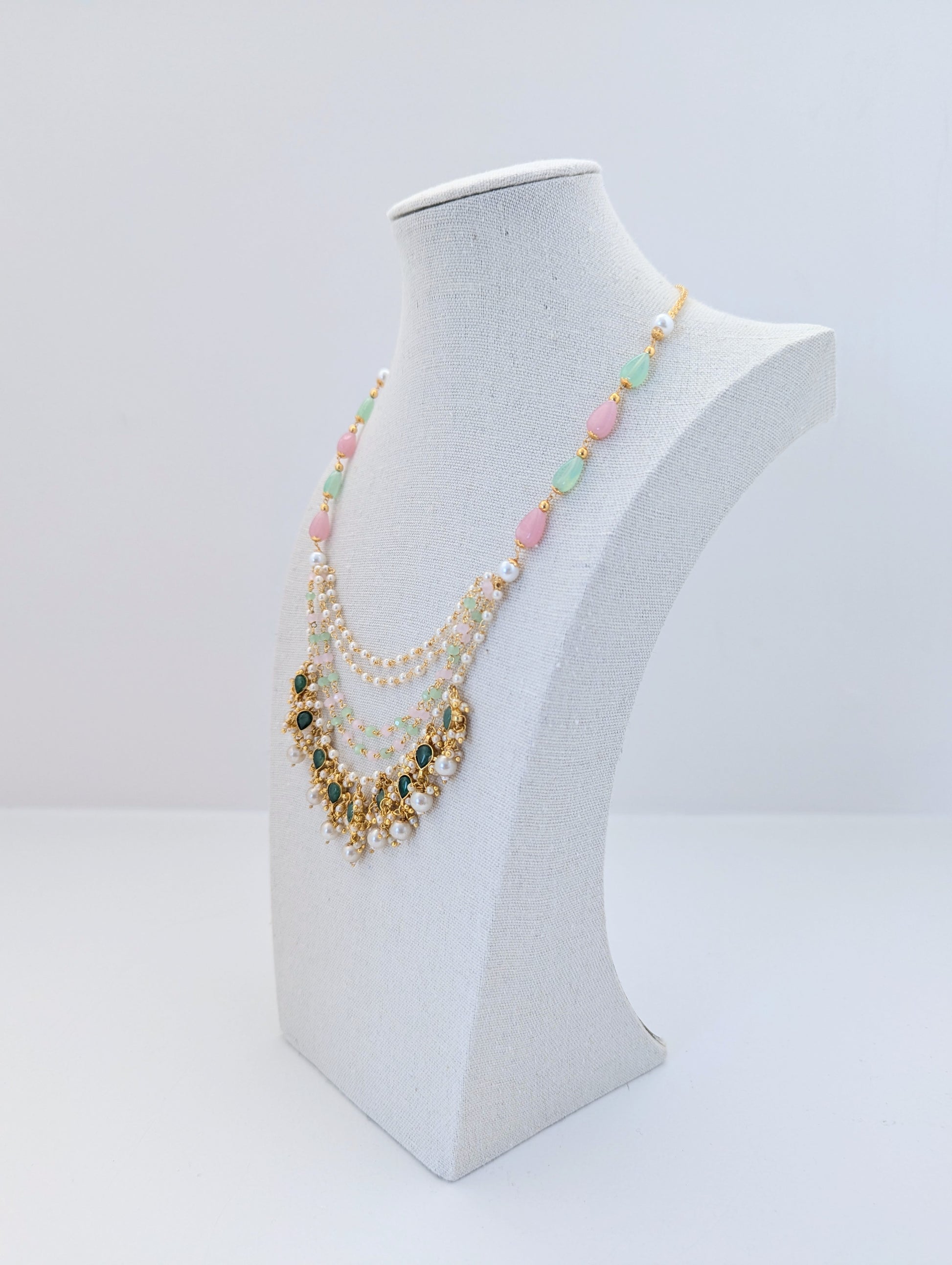 This elegant Pachi Kundan set is crafted with intricate detailing and features semi-precious stones in soft pastel hues of pink and green. The layered necklace is adorned with lustrous pearls and gold-toned elements, showcasing traditional artistry with a contemporary touch. Matching earrings with green kundan centers, dainty pearls, and pink drops complete the look. A perfect blend of grace and tradition, ideal for festive occasions or weddings.