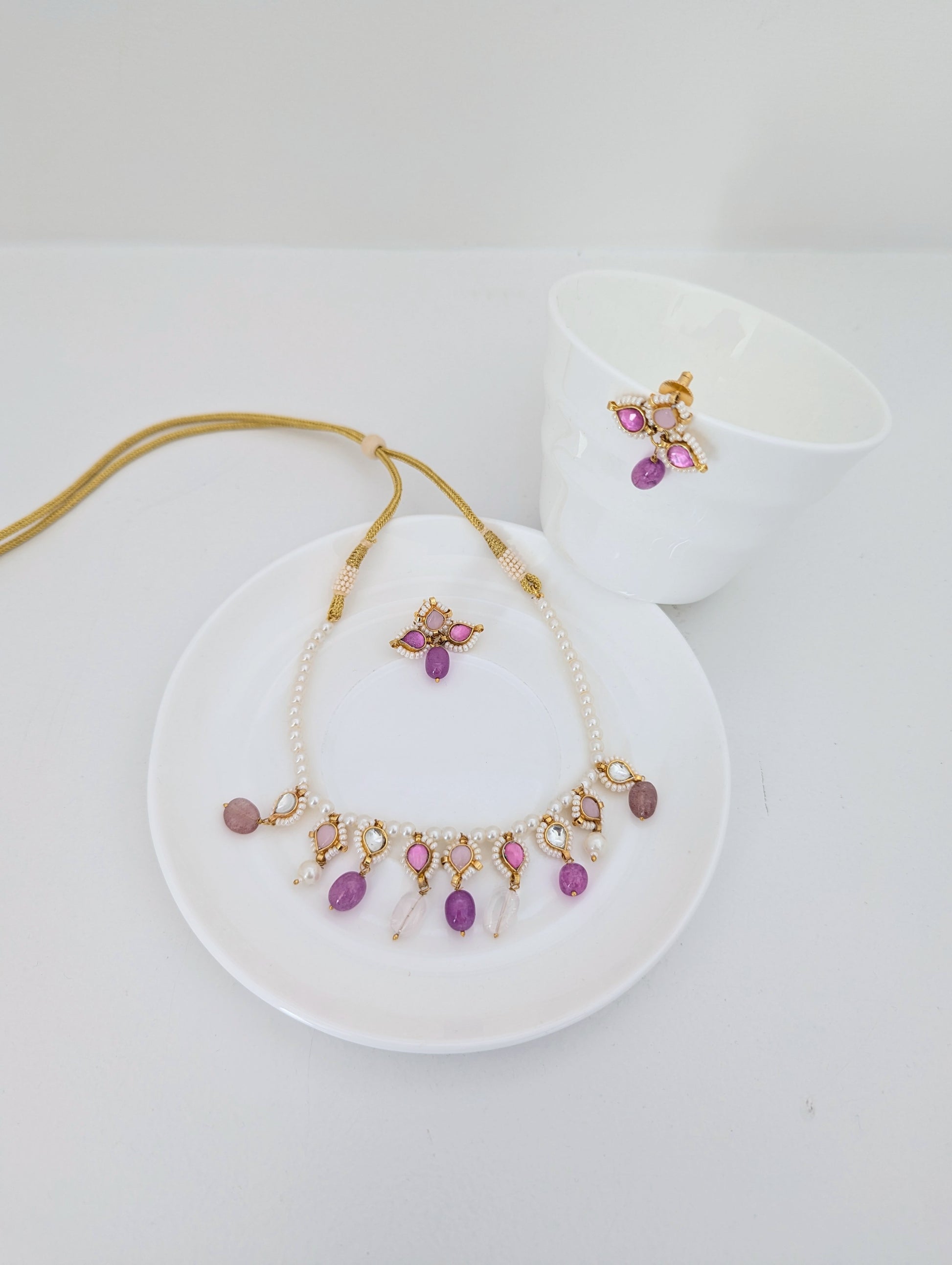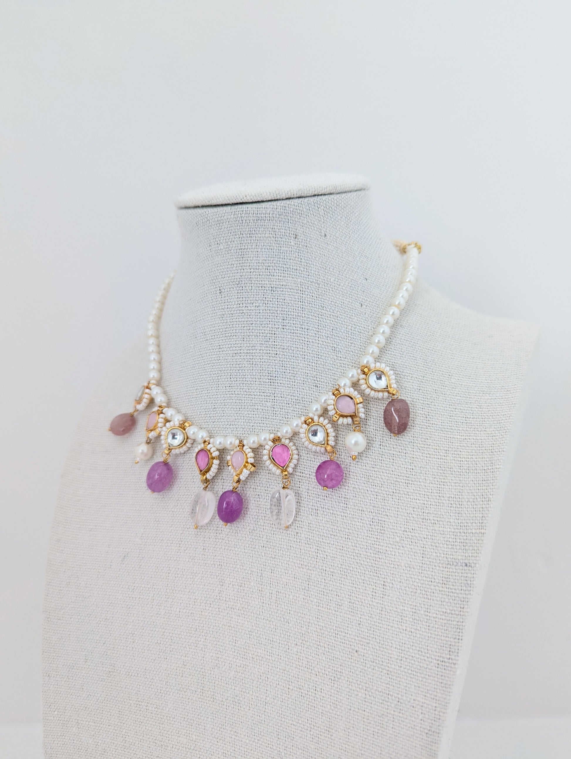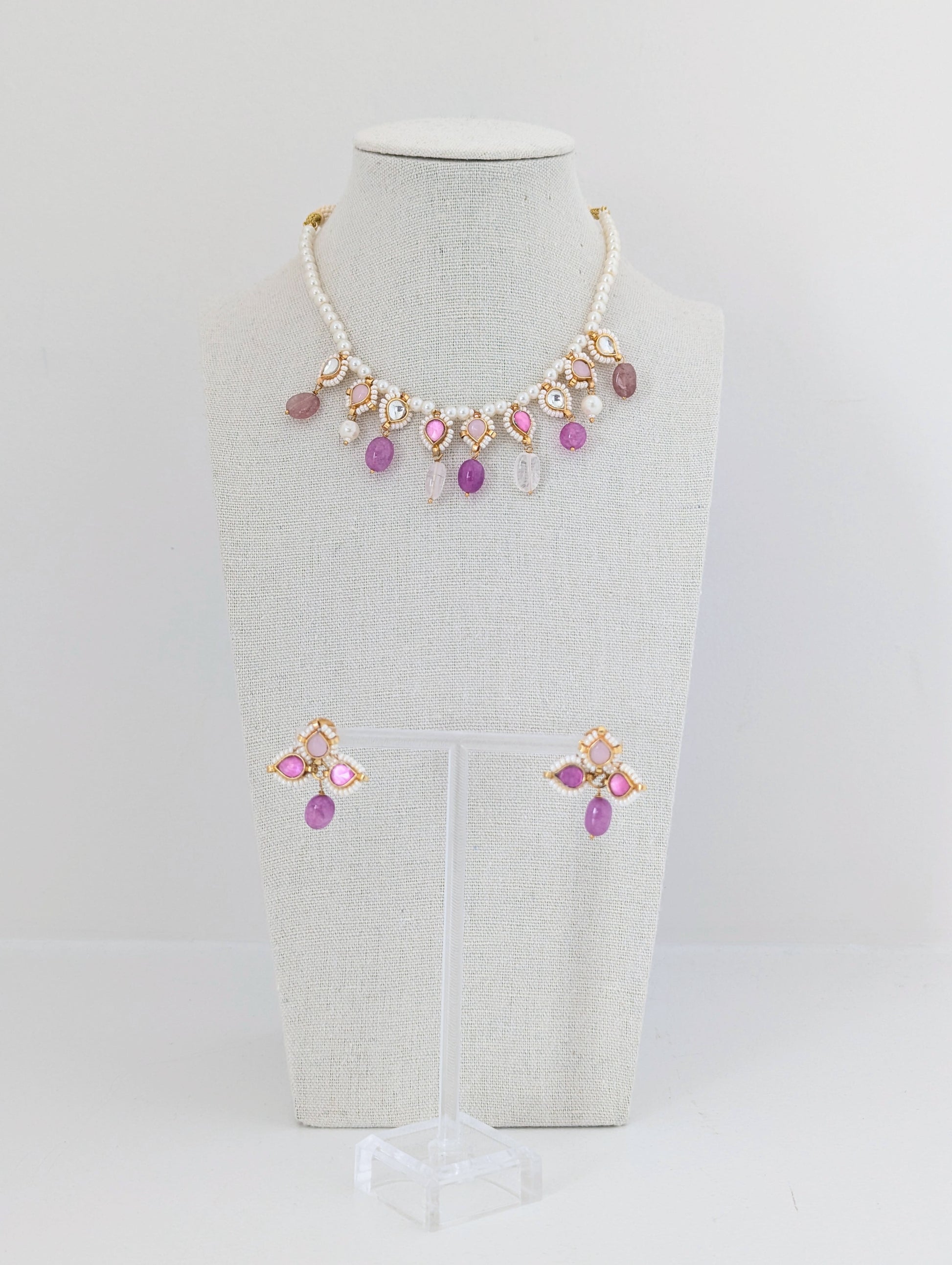 Elevate your elegance with this regal jewelry set, fit for royalty. Featuring a delicately handcrafted necklace and matching earrings, this set dazzles with lustrous pearls, radiant pink and violet gemstones, and intricate gold detailing. The opulent design evokes the grace of royal courts, making it a timeless statement for any grand occasion.