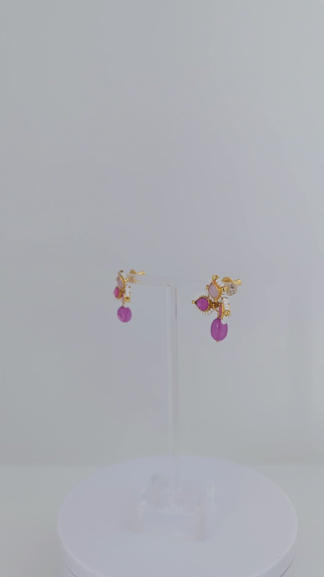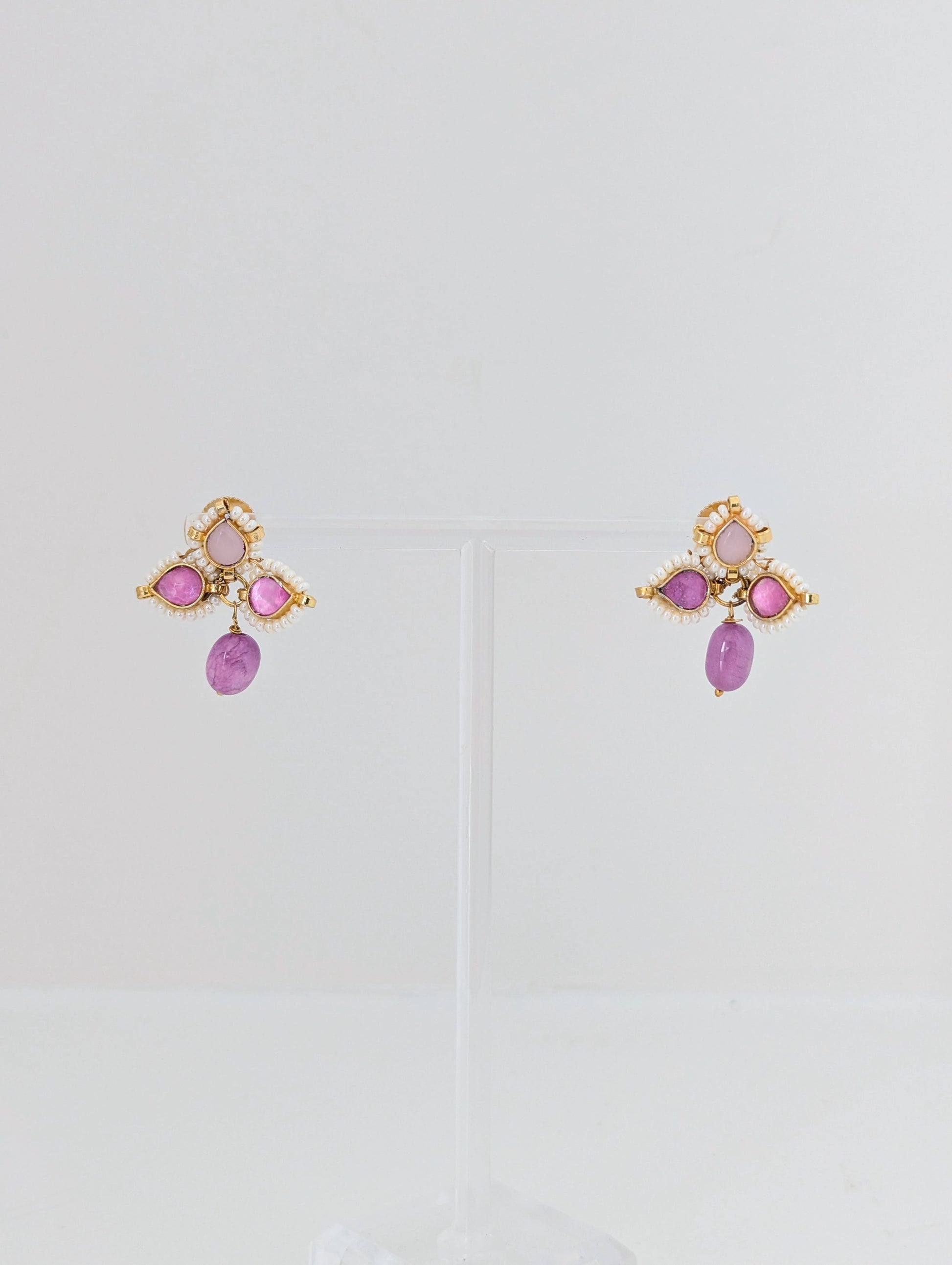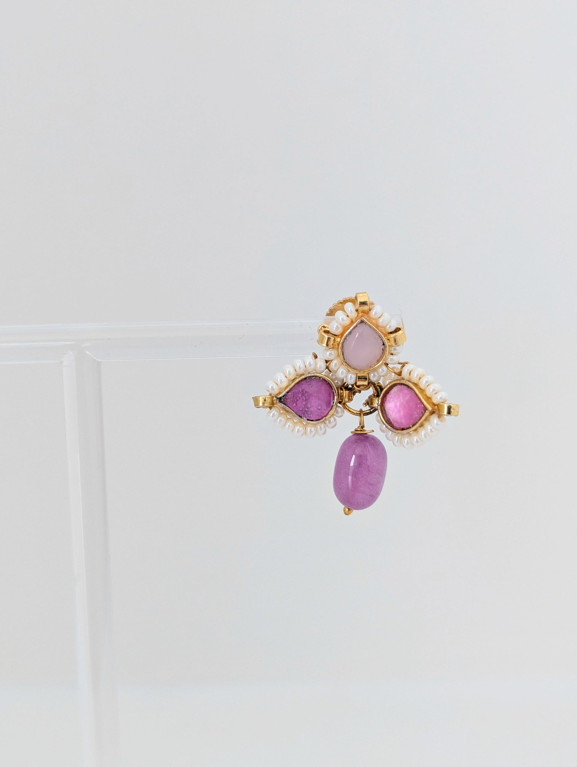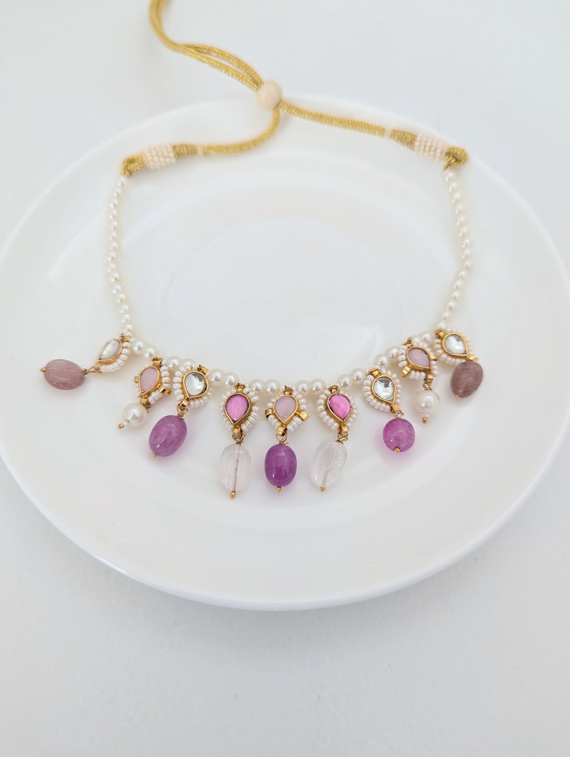 Elevate your elegance with this regal jewelry set, fit for royalty. Featuring a delicately handcrafted necklace and matching earrings, this set dazzles with lustrous pearls, radiant pink and violet gemstones, and intricate gold detailing. The opulent design evokes the grace of royal courts, making it a timeless statement for any grand occasion.