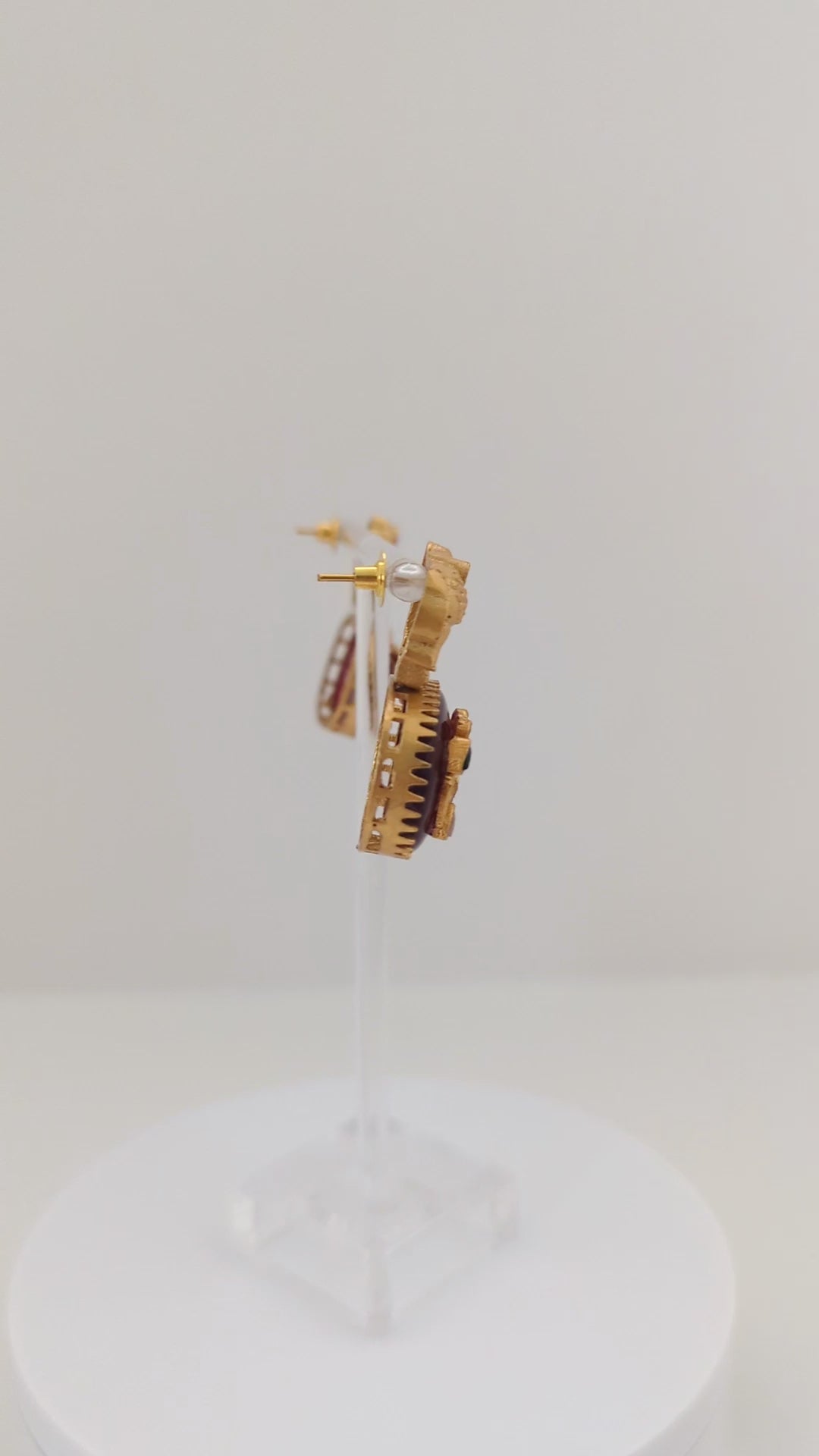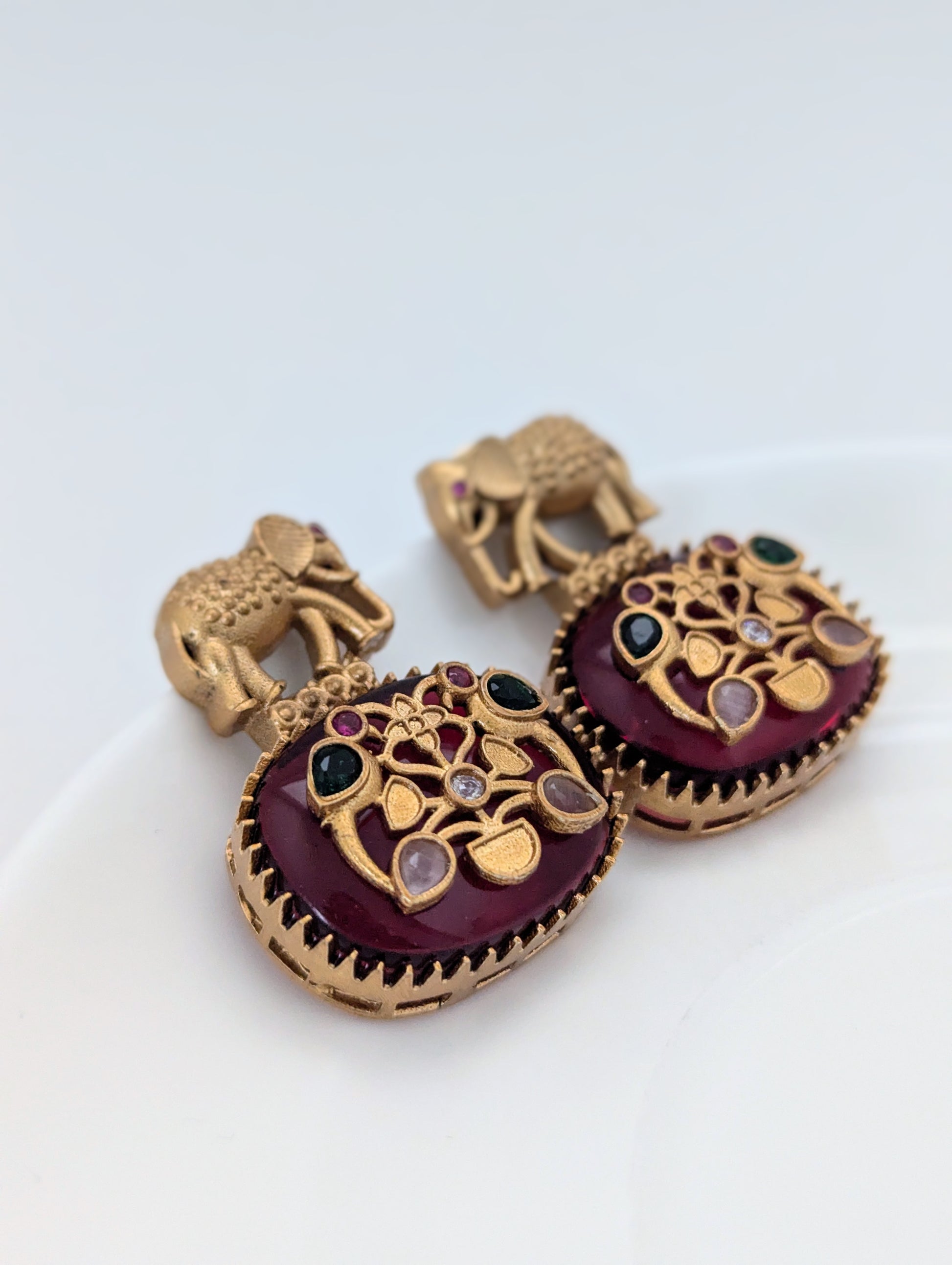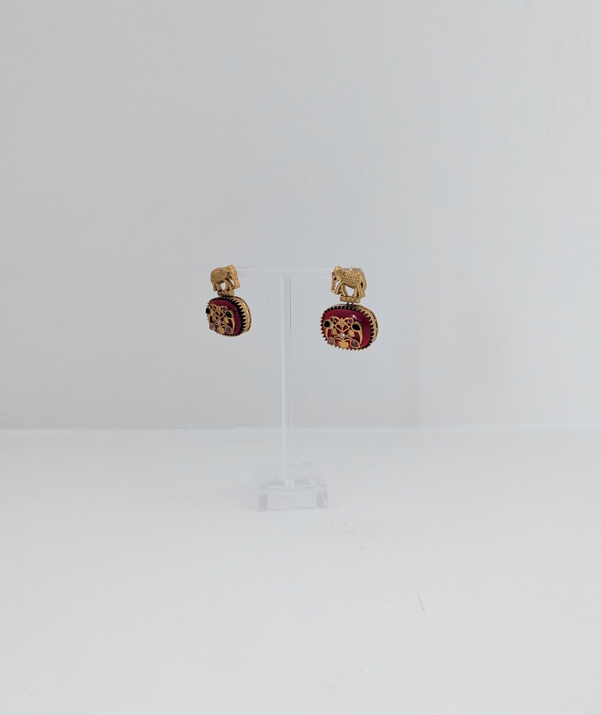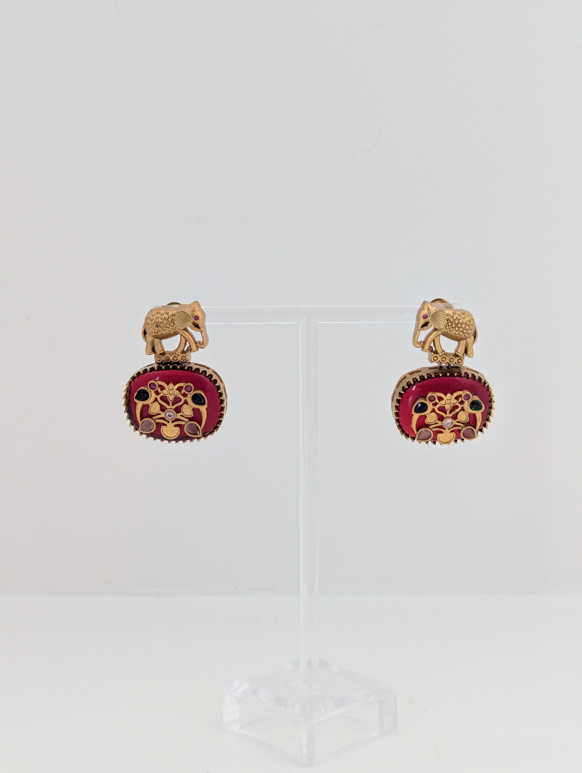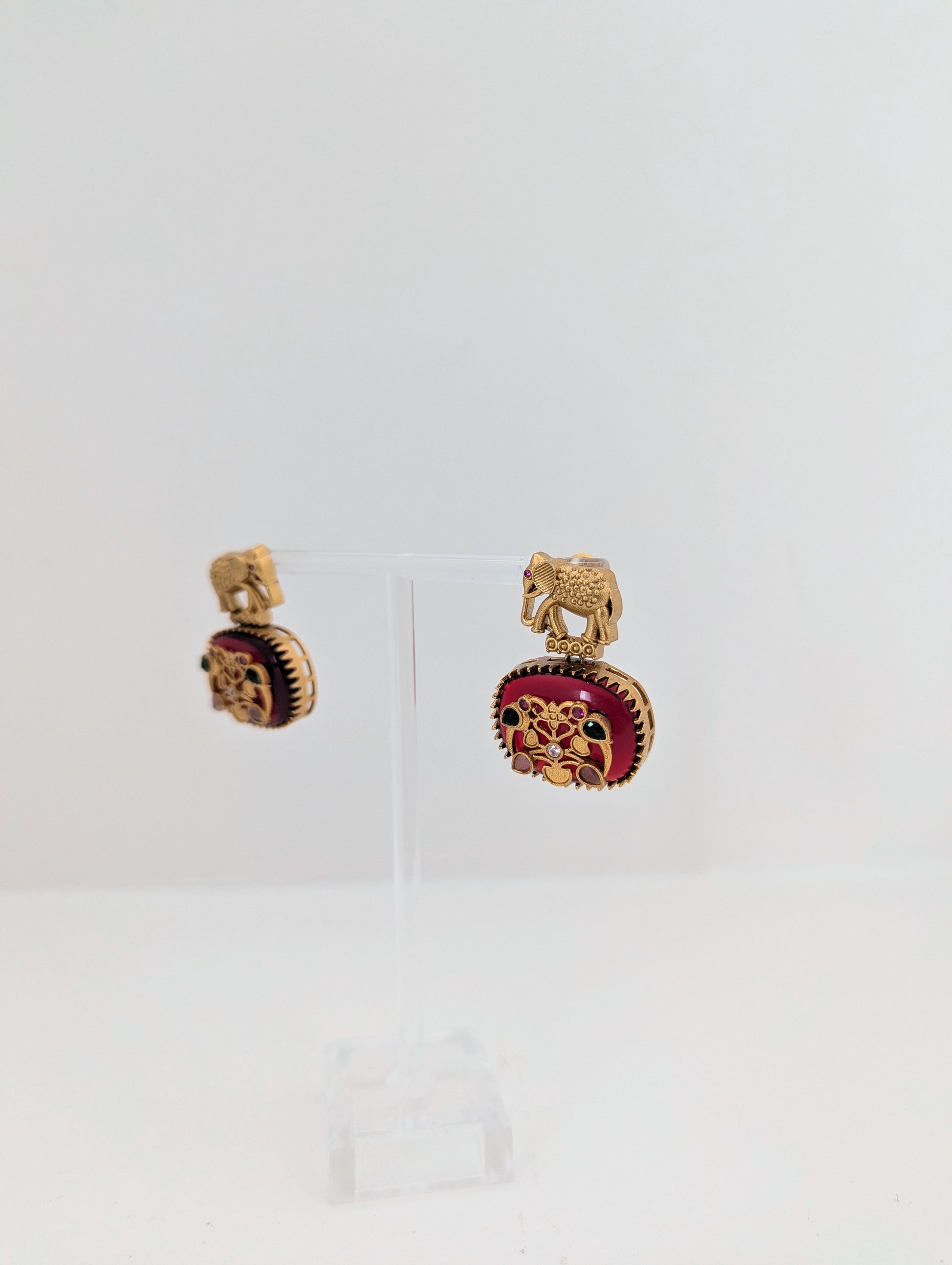 These earrings feature a striking blend of traditional and artistic design elements. Crafted in gold-tone metal, each earring showcases an intricately carved elephant motif at the top, adorned with a tiny pink gemstone for the eye. Dangling below is a rounded rectangular pendant with a rich red/burgundy background, embedded with a stylized tree of life design in gold, accented by small colored gemstones. The piece balances cultural symbolism with vibrant detailing, making it a unique and elegant accessory.