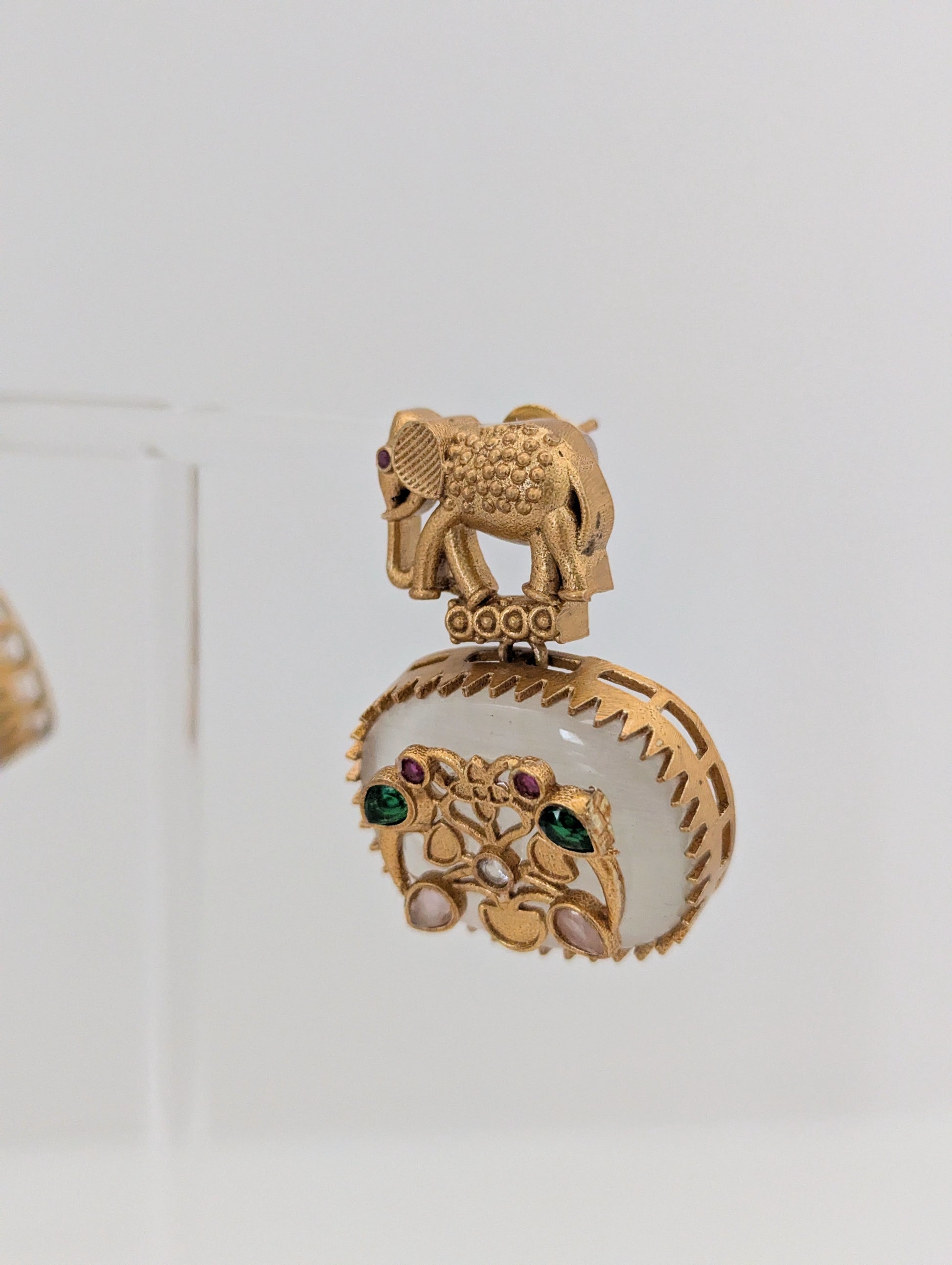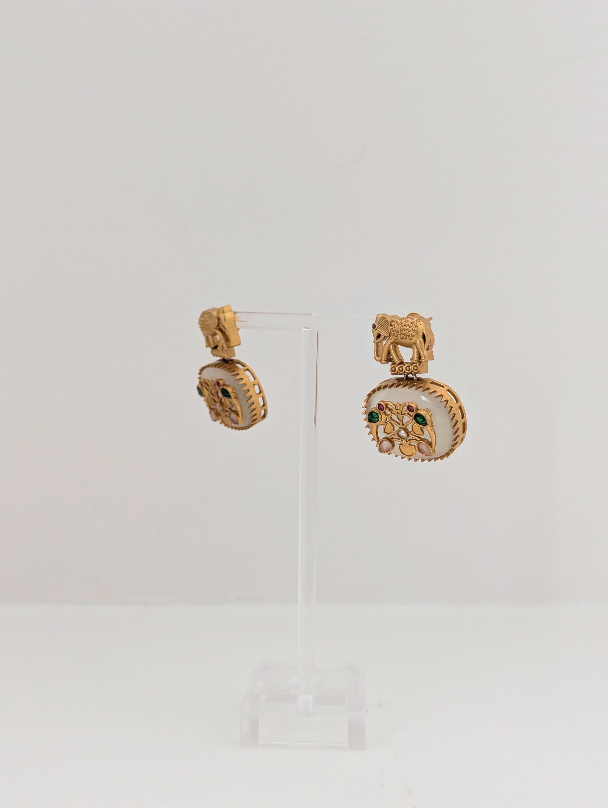 These earrings feature a striking blend of traditional and artistic design elements. Crafted in gold-tone metal, each earring showcases an intricately carved elephant motif at the top, adorned with a tiny pink gemstone for the eye. Dangling below is a rounded rectangular pendant with a rich white background, embedded with a stylized tree of life design in gold, accented by small colored gemstones. The piece balances cultural symbolism with vibrant detailing, making it a unique and elegant accessory.