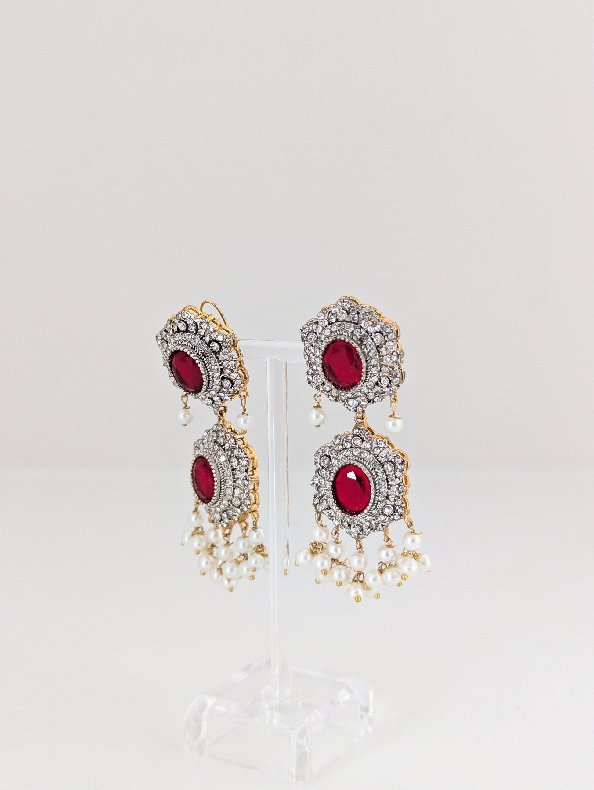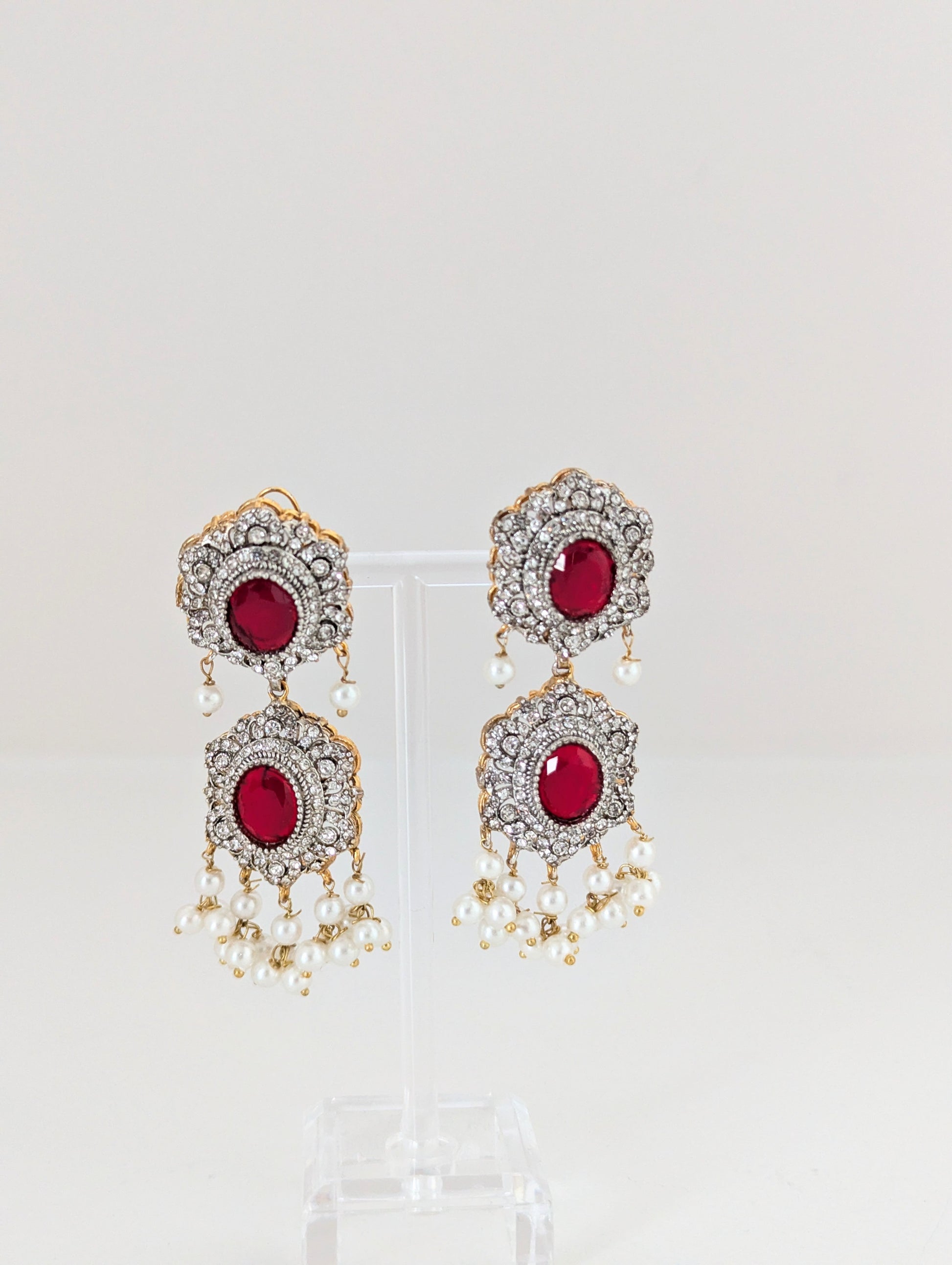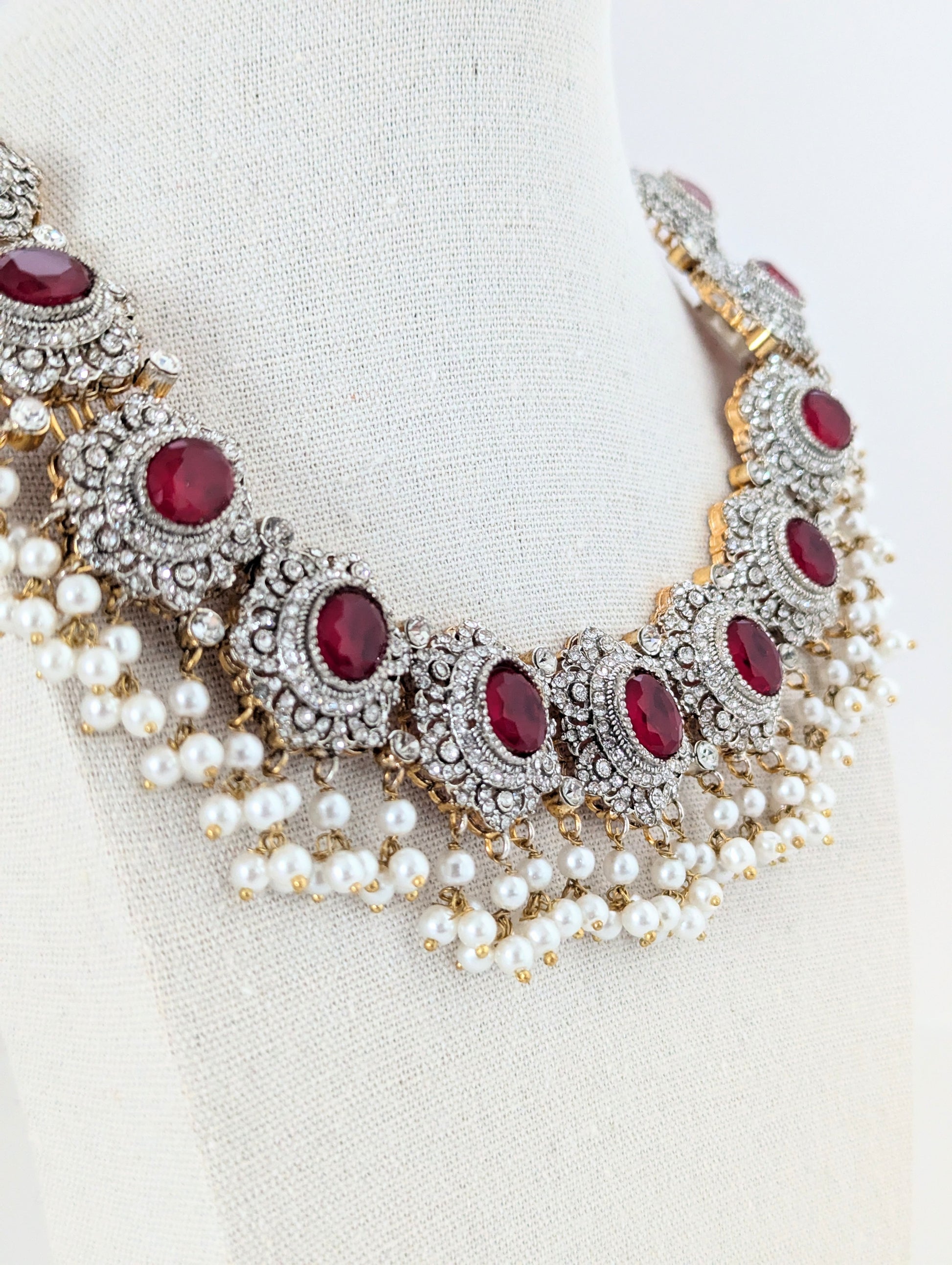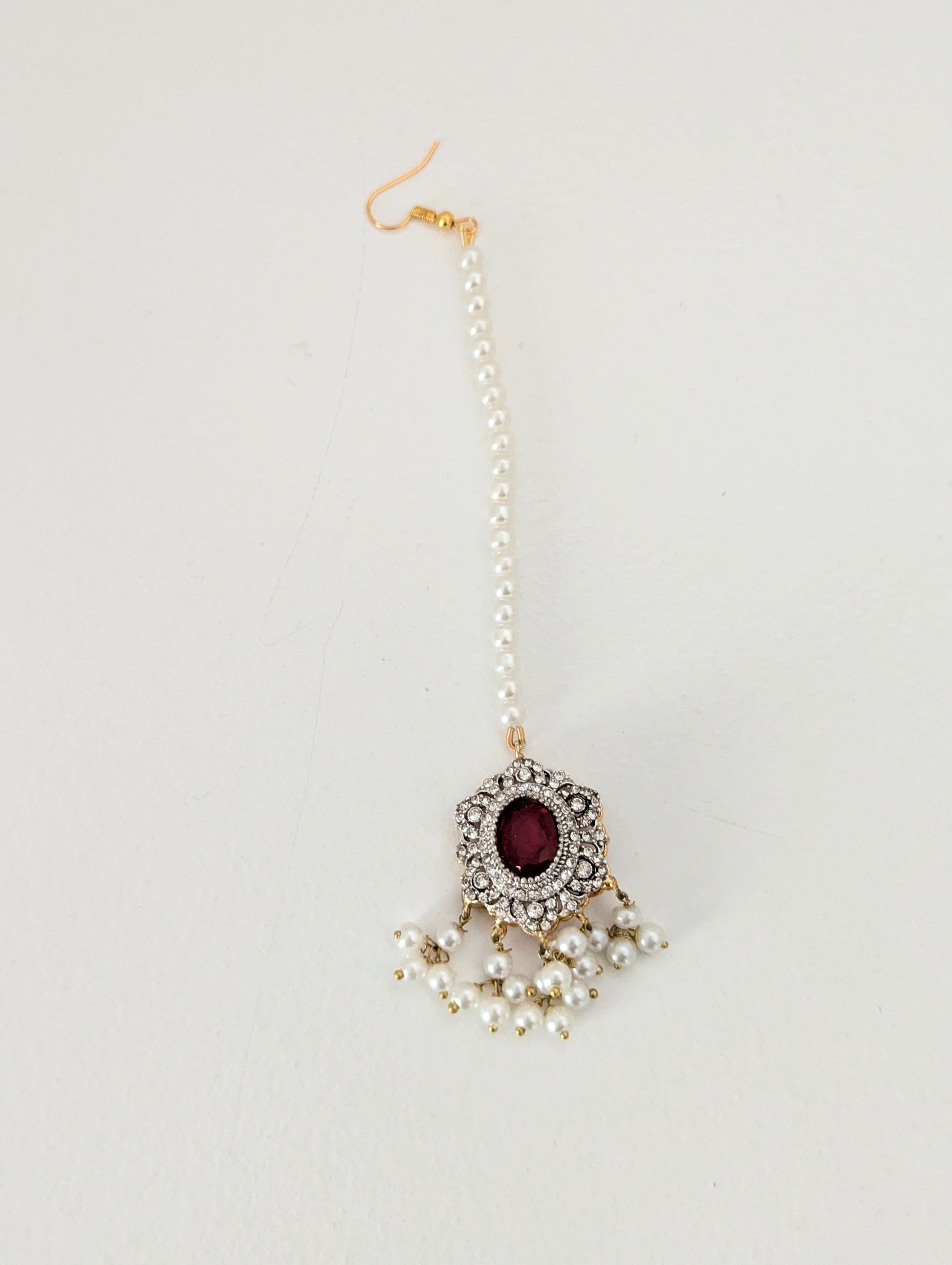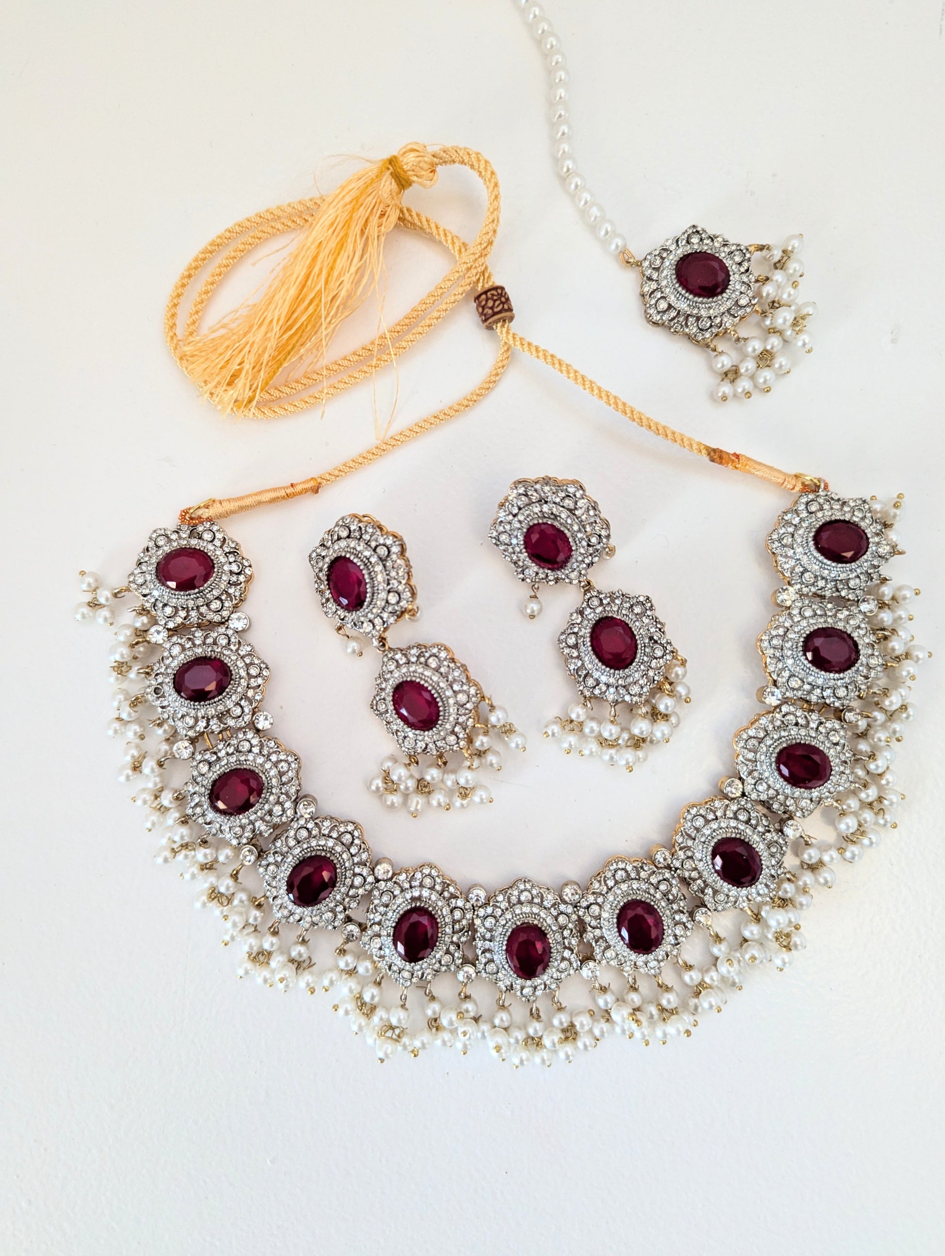 This is a traditional jewelry set consisting of a necklace, earrings, and a maang tikka. The design features oval-shaped deep red stones surrounded by intricate white stones and adorned with dangling white pearl beads. The necklace has a gold-colored thread tie, adding a traditional touch.