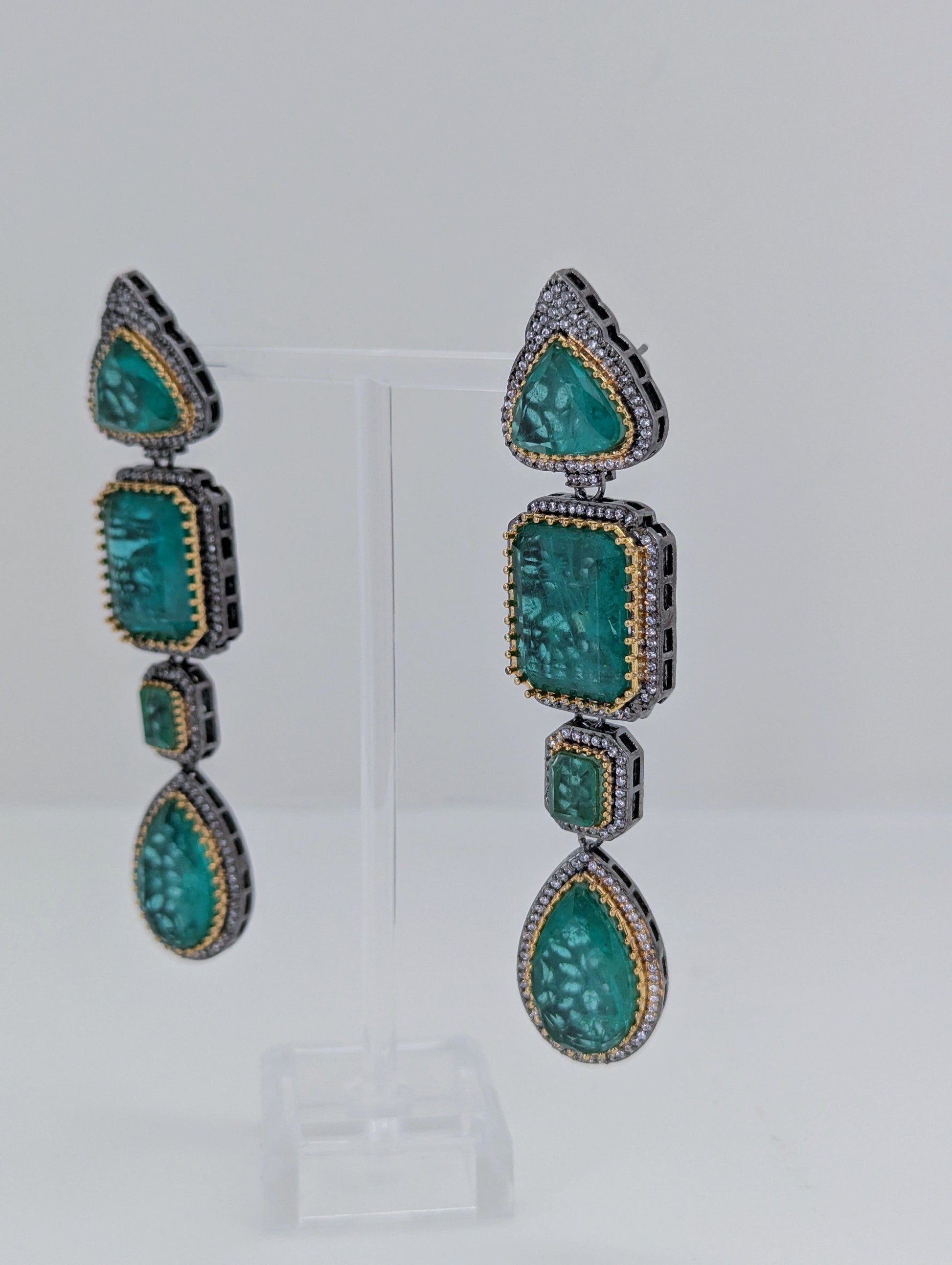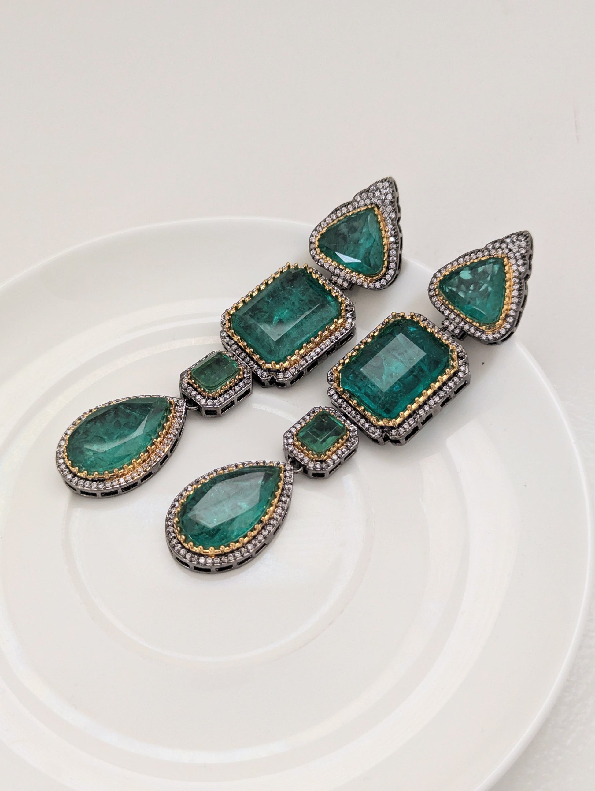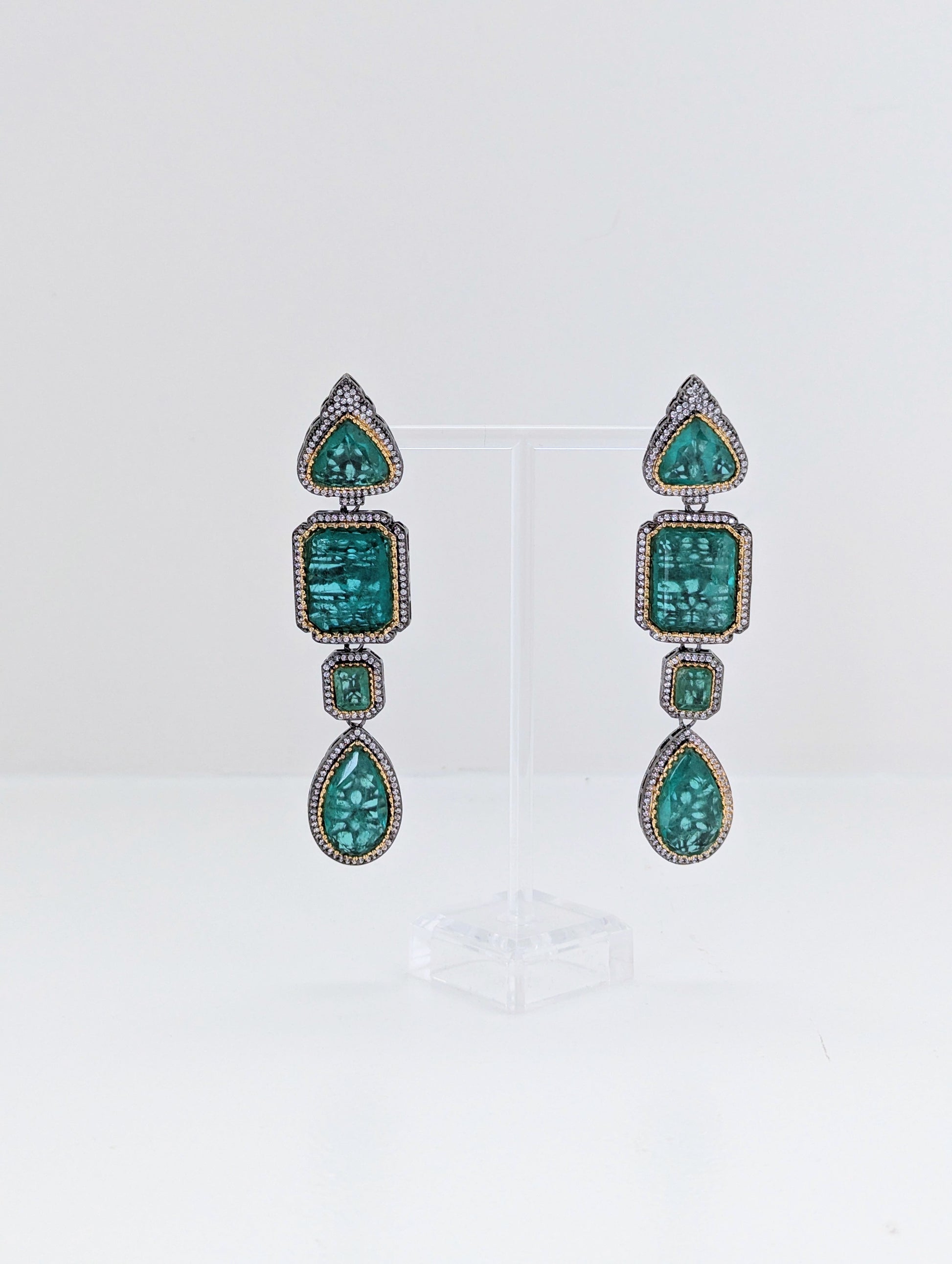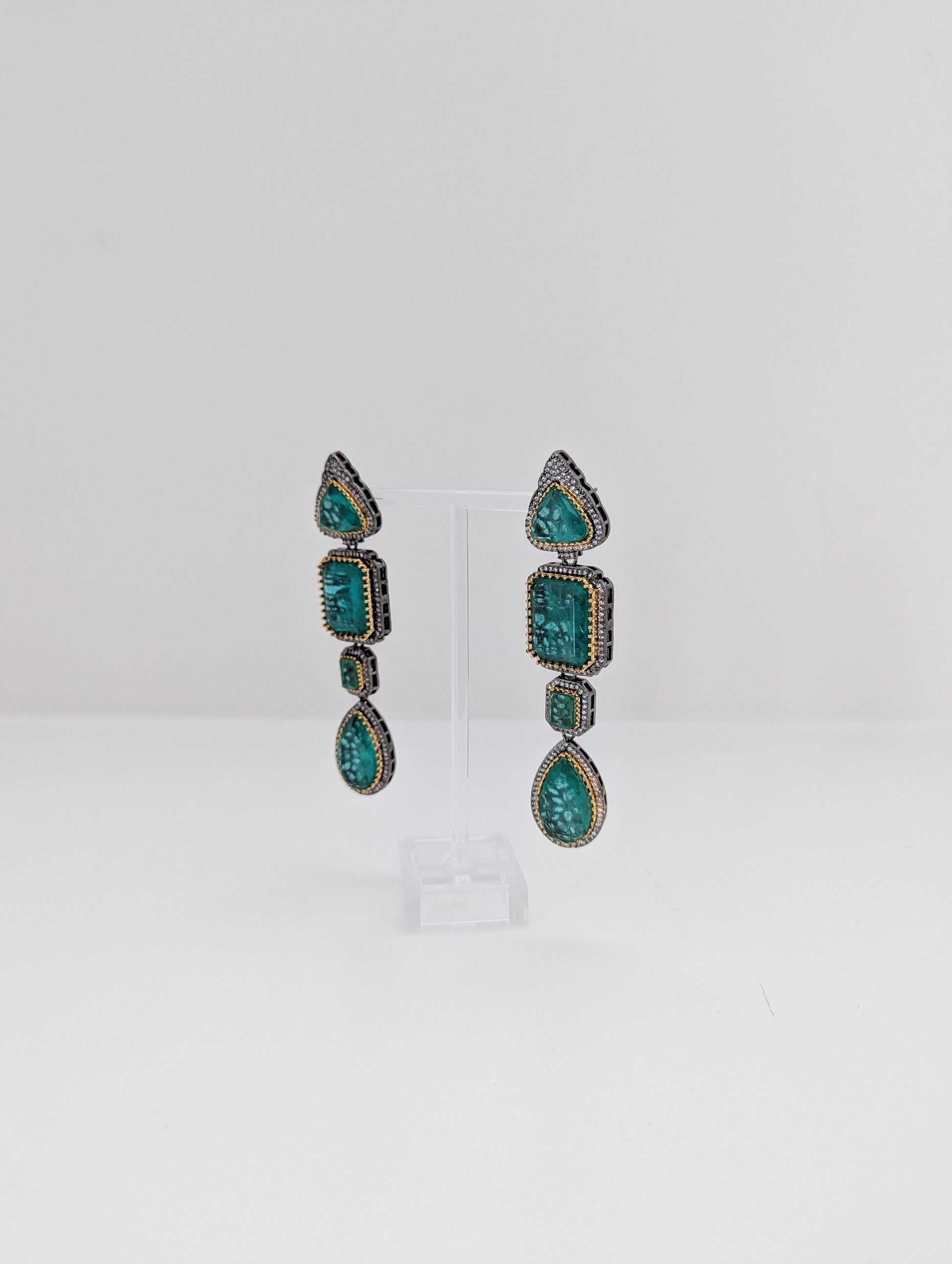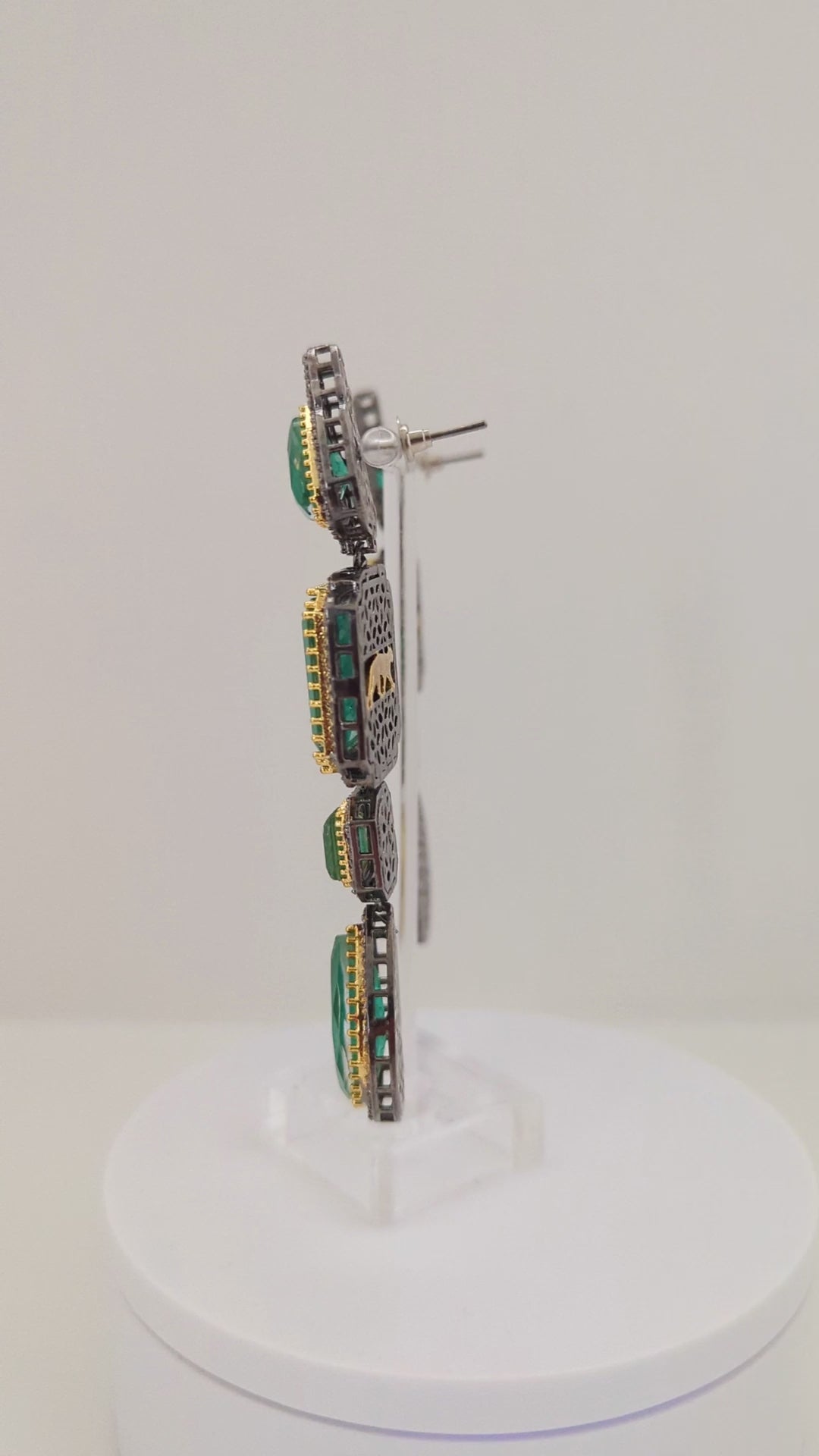 These statement earrings feature an elegant cascading design composed of four green stones in various shapes: a triangle, rectangle, square, and teardrop. Each stone is framed with intricate detailing—alternating between gold-toned and silver-toned halos accented with small sparkling crystals. The rich green hue of the stones adds a bold and luxurious touch, making these earrings perfect for formal occasions or standout evening wear.