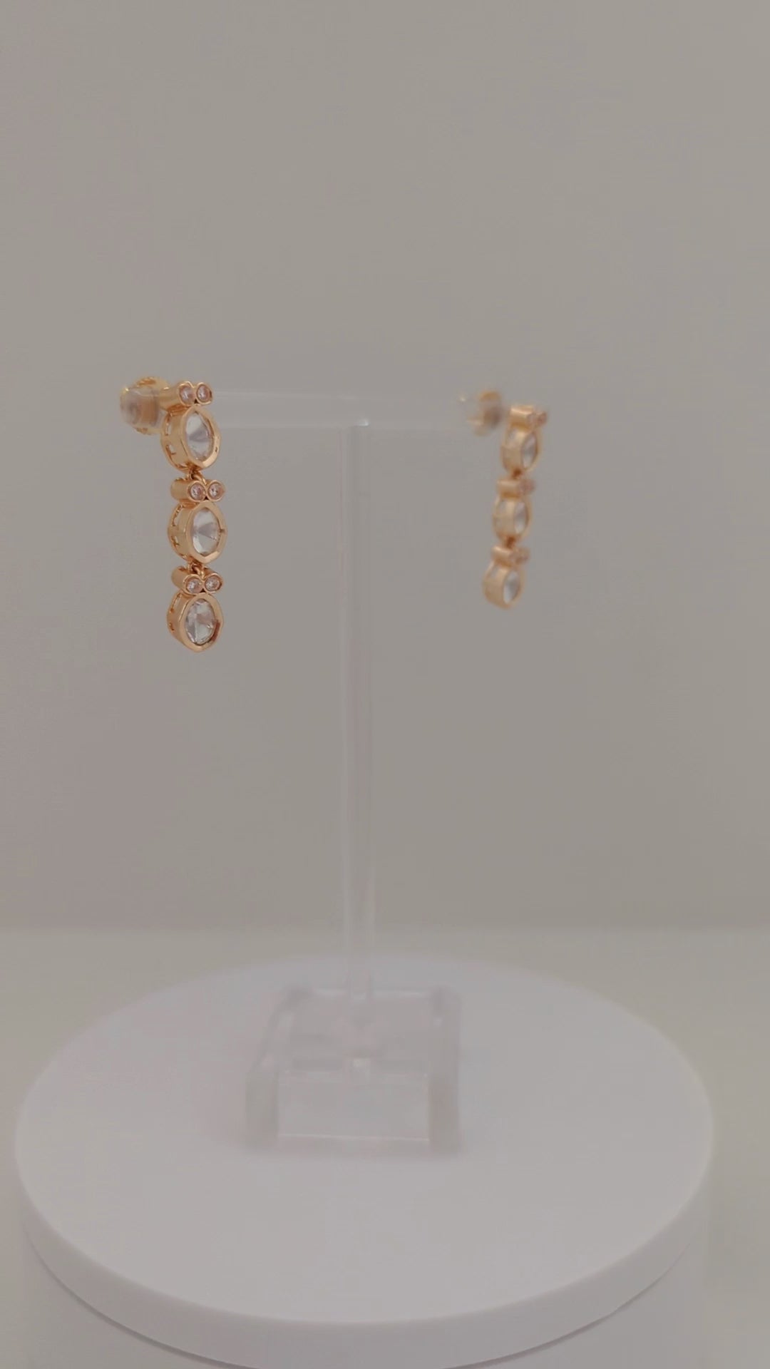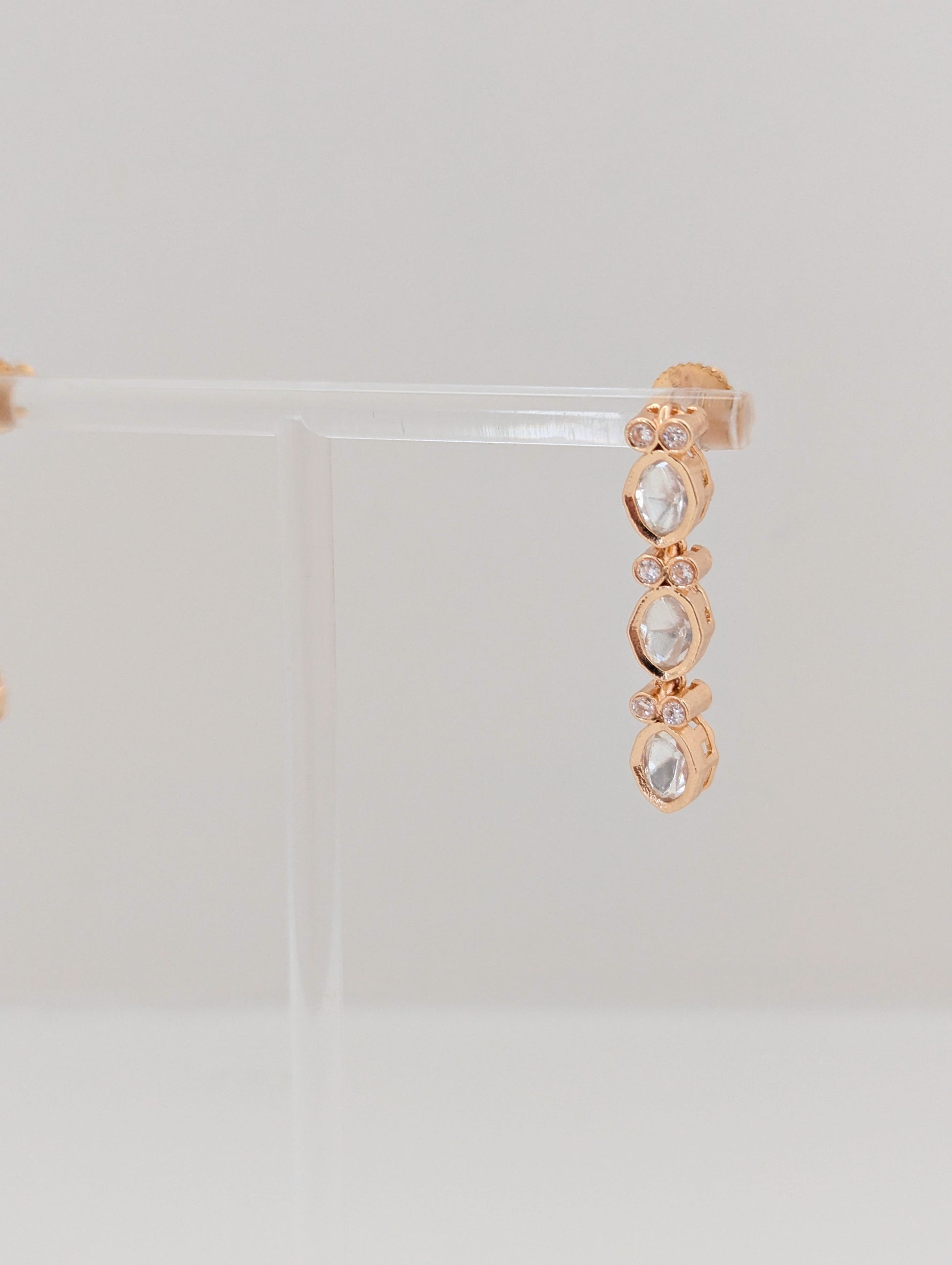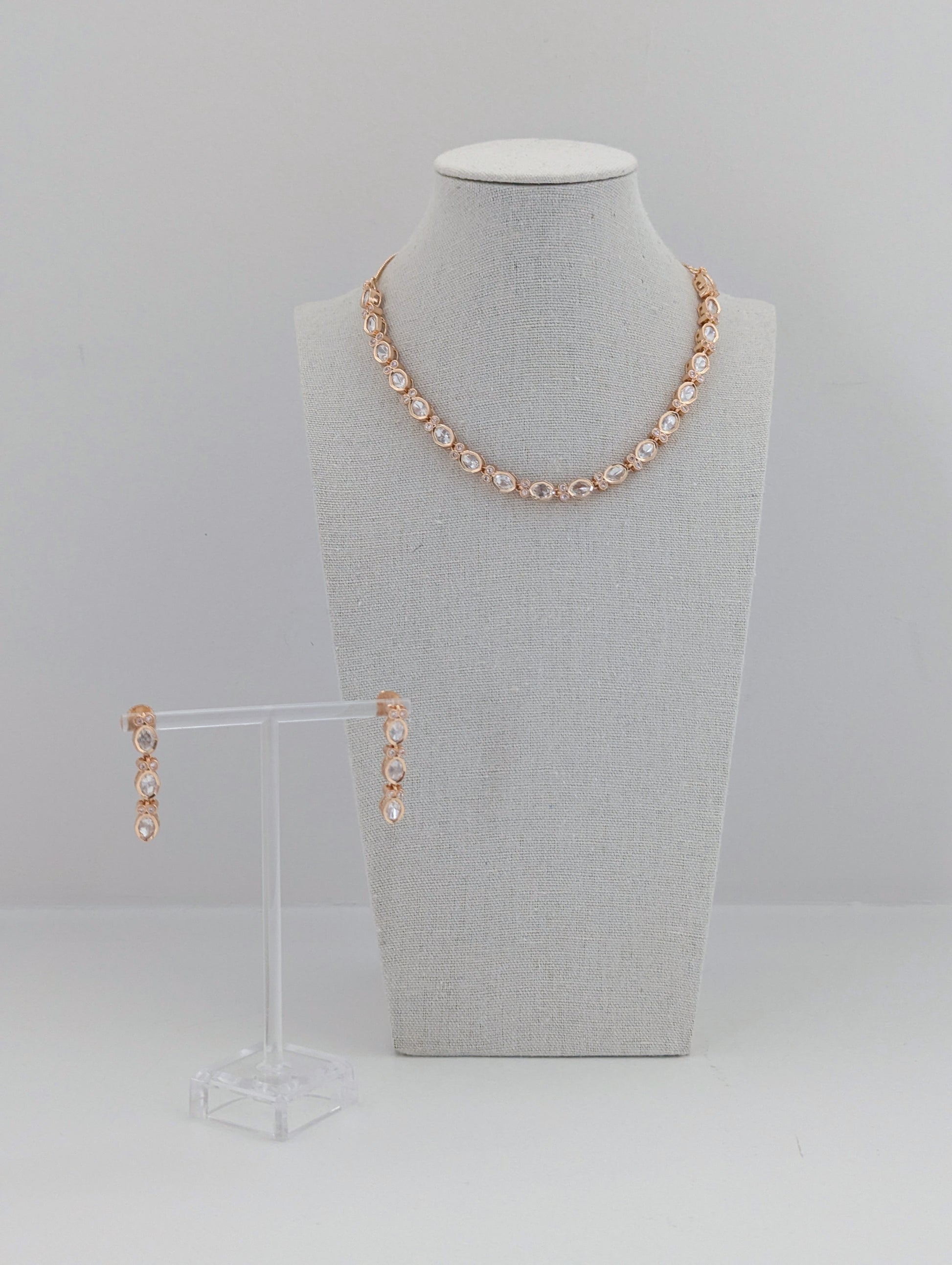 This elegant jewelry set features a delicate pair of drop earrings and a matching necklace, both crafted in warm gold tones. The set is adorned with clear, brilliant stones set in repeating oval and round patterns, each highlighted with petite sparkling crystals. The earrings showcase a linear design of three oval-shaped stones, while the necklace features a continuous arrangement of oval stones linked by small circular motifs, creating a refined and sophisticated look. The soft glow of the gold complements the shimmering stones, making this set a perfect choice for special occasions and an exquisite addition to any jewelry collection.