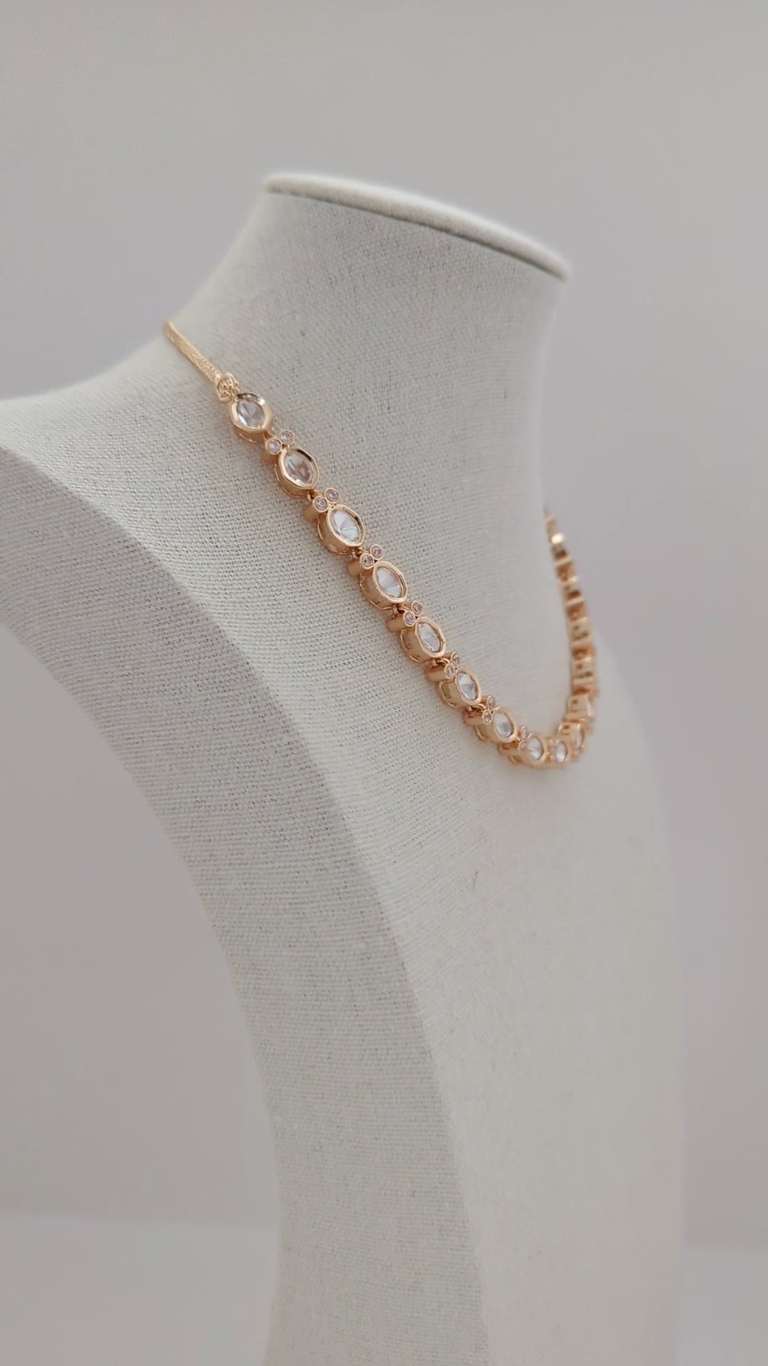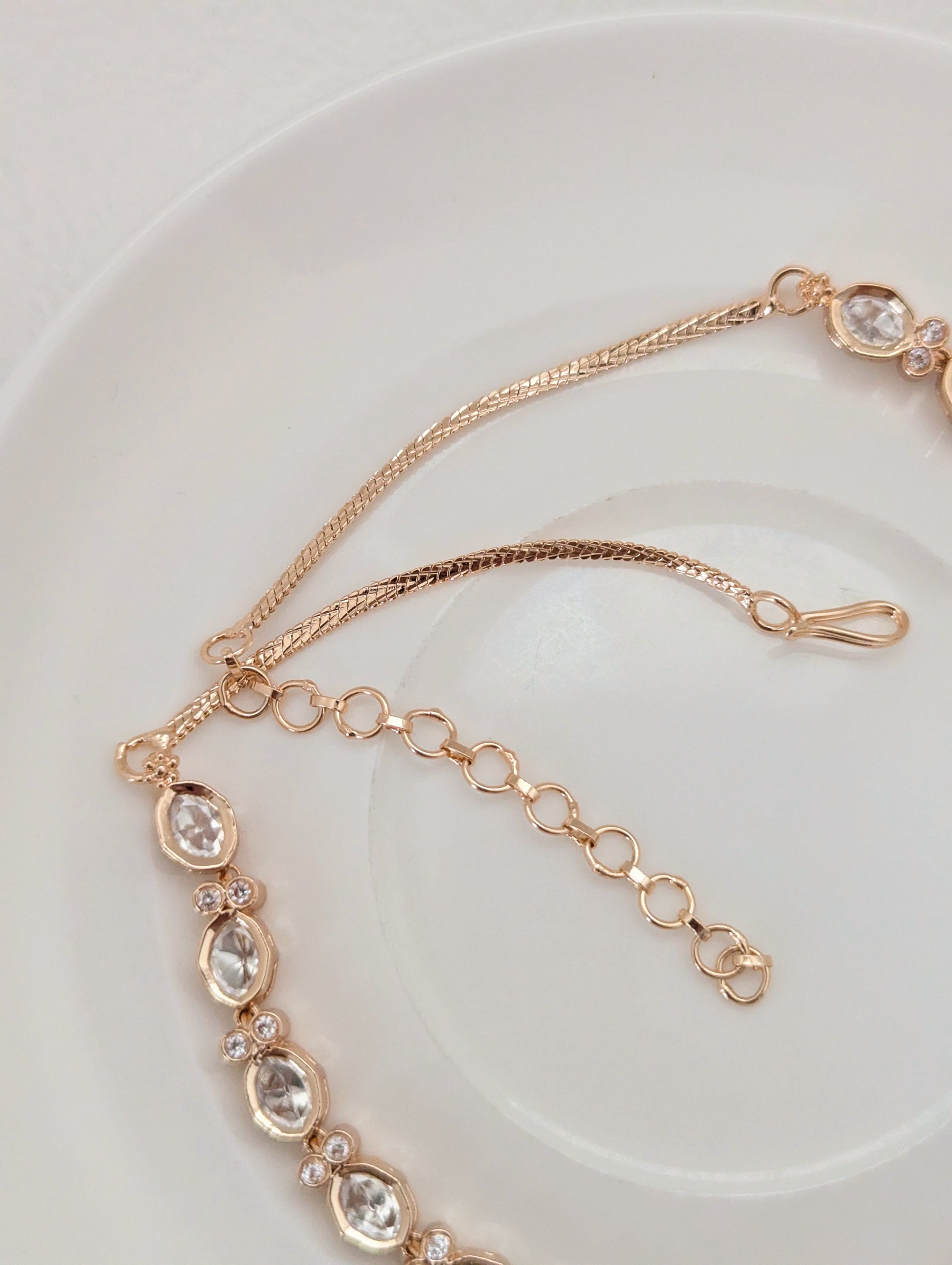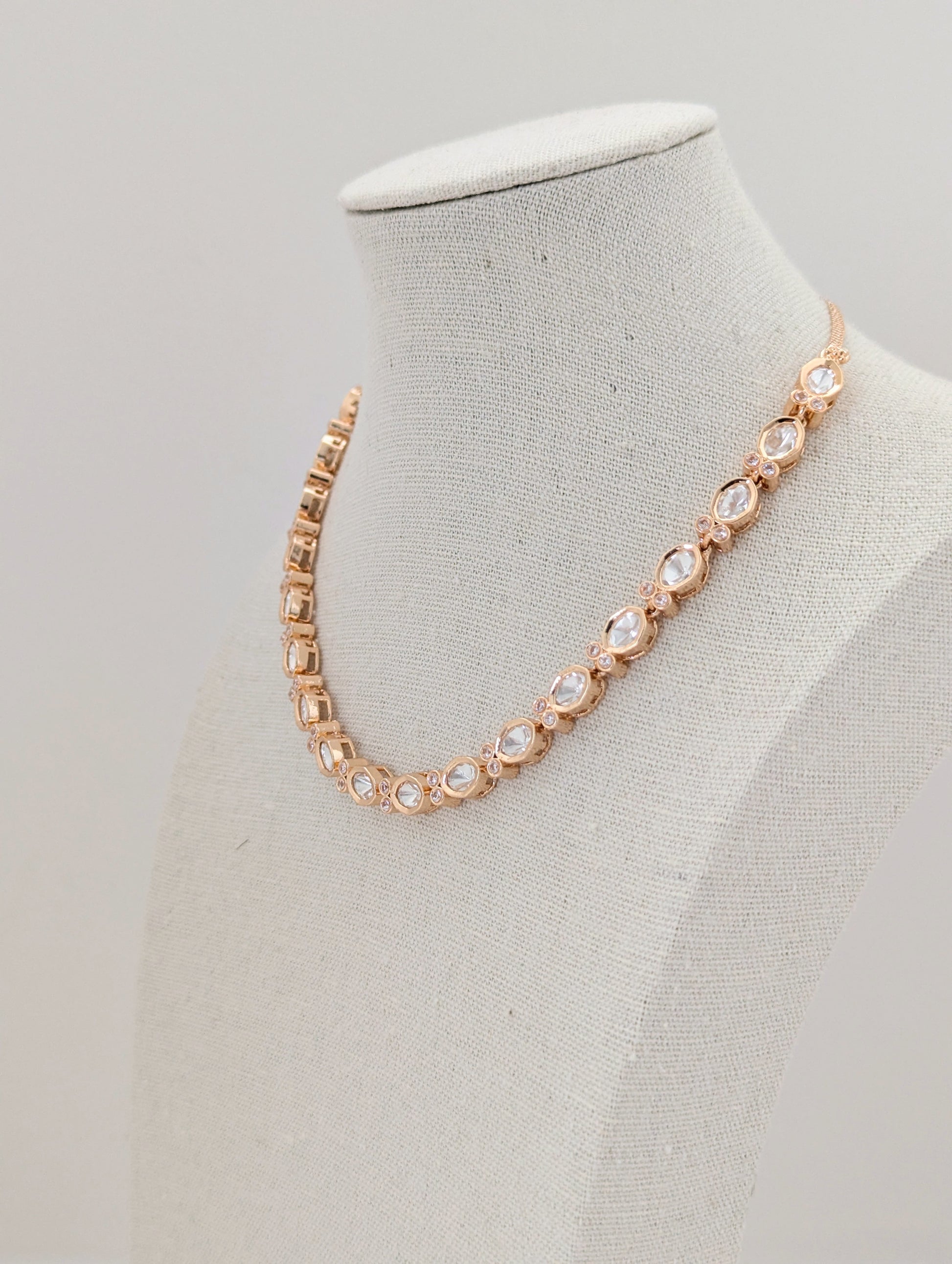 This elegant jewelry set features a delicate pair of drop earrings and a matching necklace, both crafted in warm gold tones. The set is adorned with clear, brilliant stones set in repeating oval and round patterns, each highlighted with petite sparkling crystals. The earrings showcase a linear design of three oval-shaped stones, while the necklace features a continuous arrangement of oval stones linked by small circular motifs, creating a refined and sophisticated look. The soft glow of the gold complements the shimmering stones, making this set a perfect choice for special occasions and an exquisite addition to any jewelry collection.