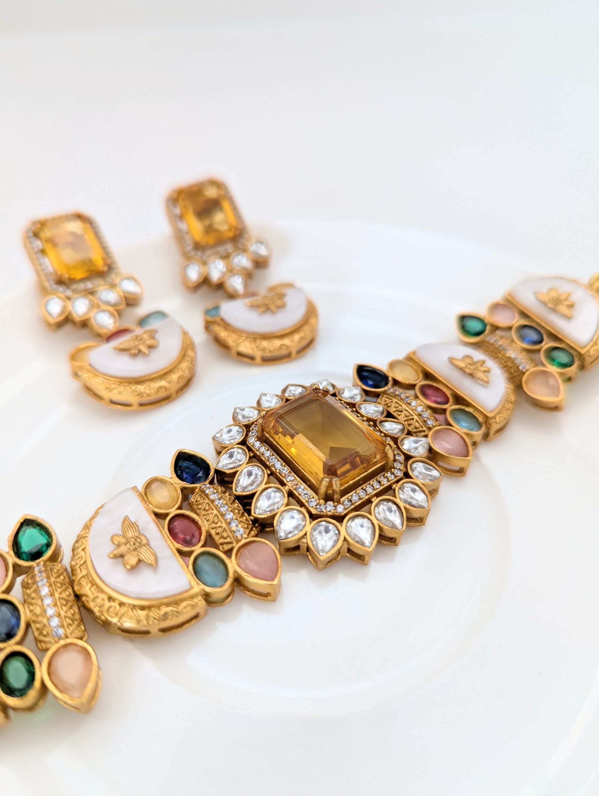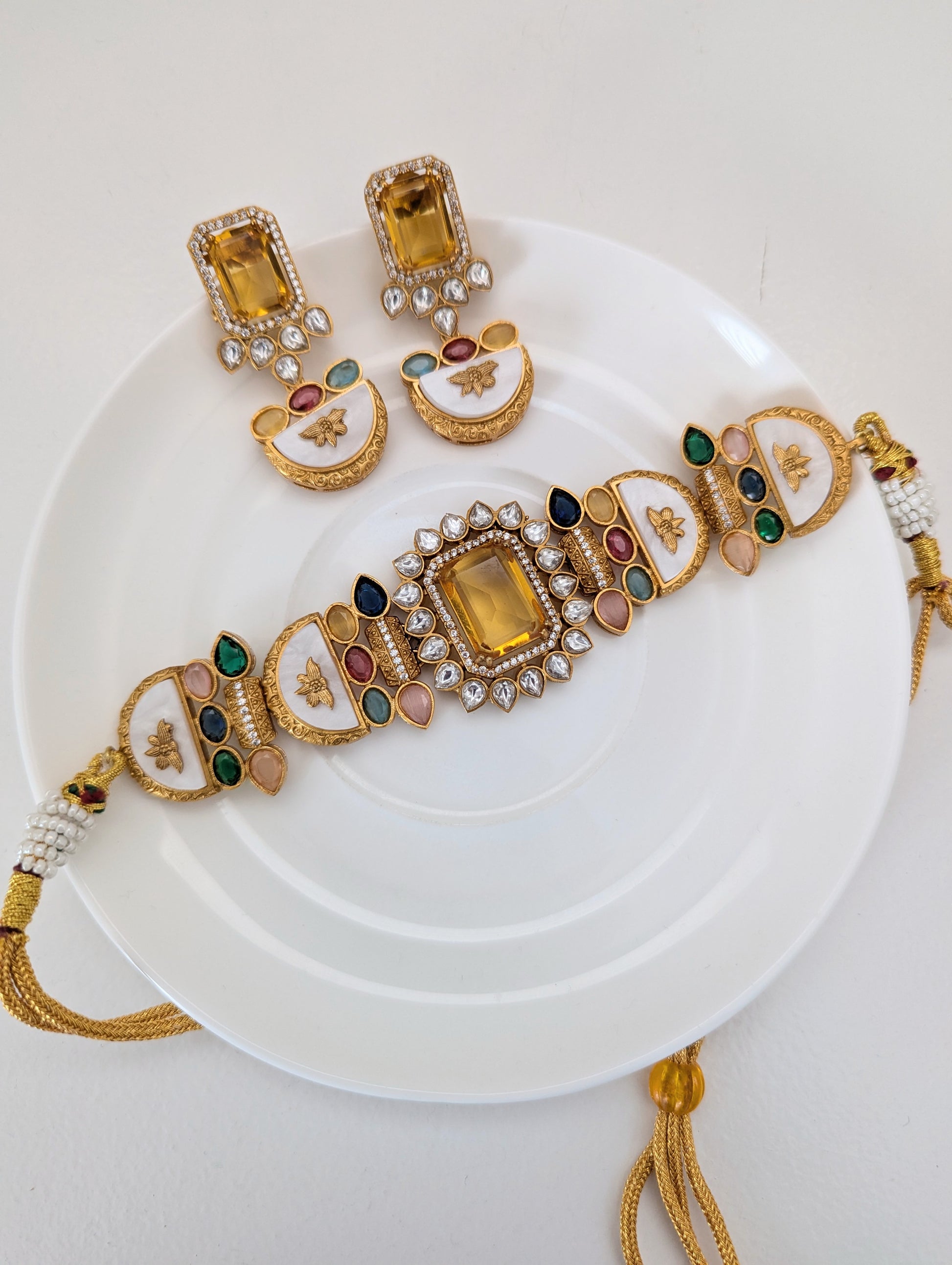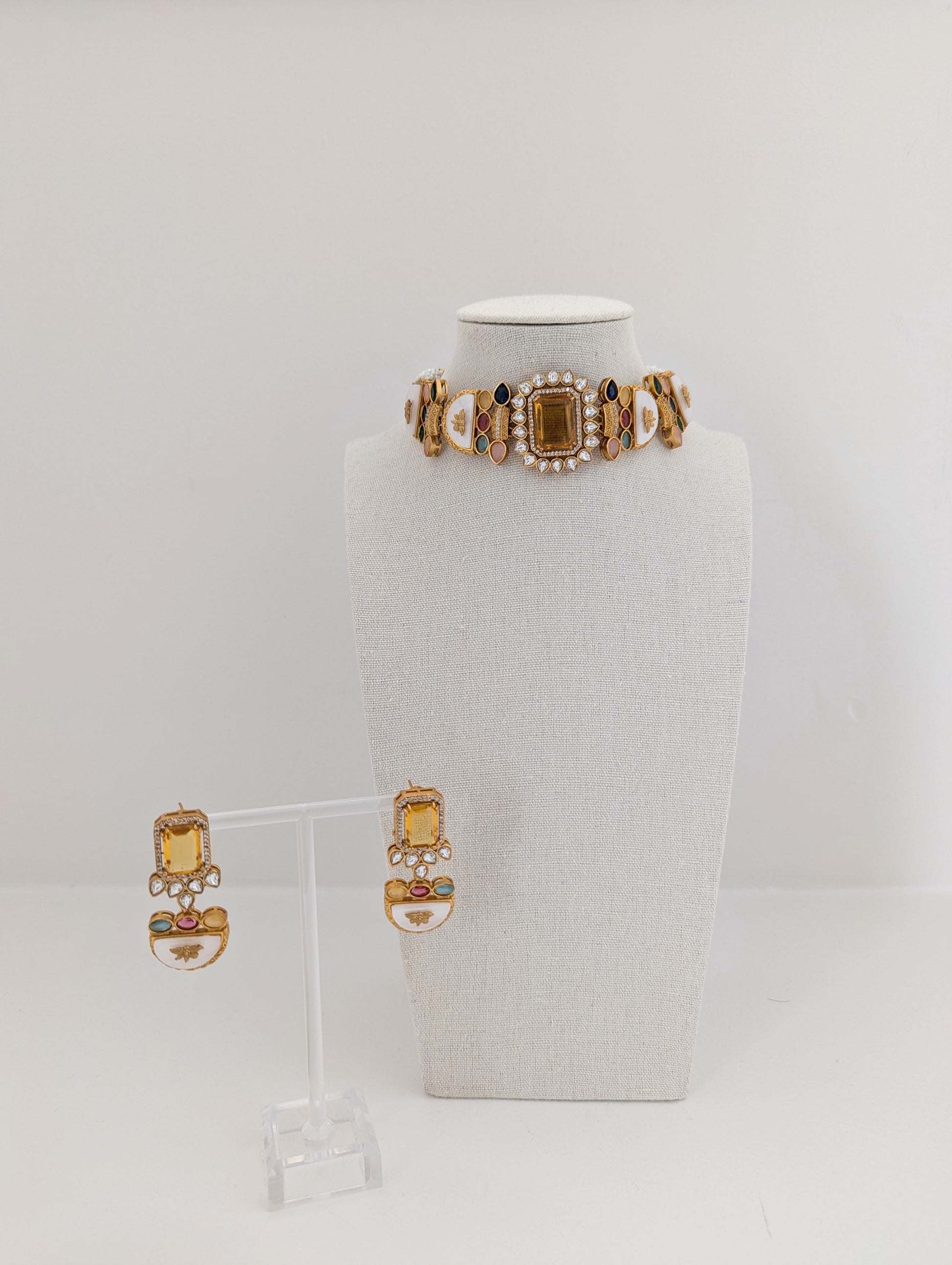 This exquisite jewelry set features a regal choker necklace and matching earrings, intricately crafted with a blend of vibrant multicolored stones, kundan-style accents, and enamel work. The centerpiece of the choker showcases a large yellow stone framed with sparkling clear crystals, surrounded by detailed motifs and teardrop embellishments. Coordinating earrings echo the design, highlighting the pink centerpiece, gemstone detailing, and a white enamel drop with a golden floral motif. The necklace is finished with an adjustable string for a custom fit, making it both elegant and versatile for special occasions