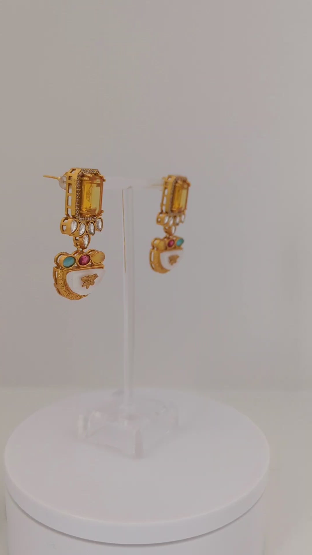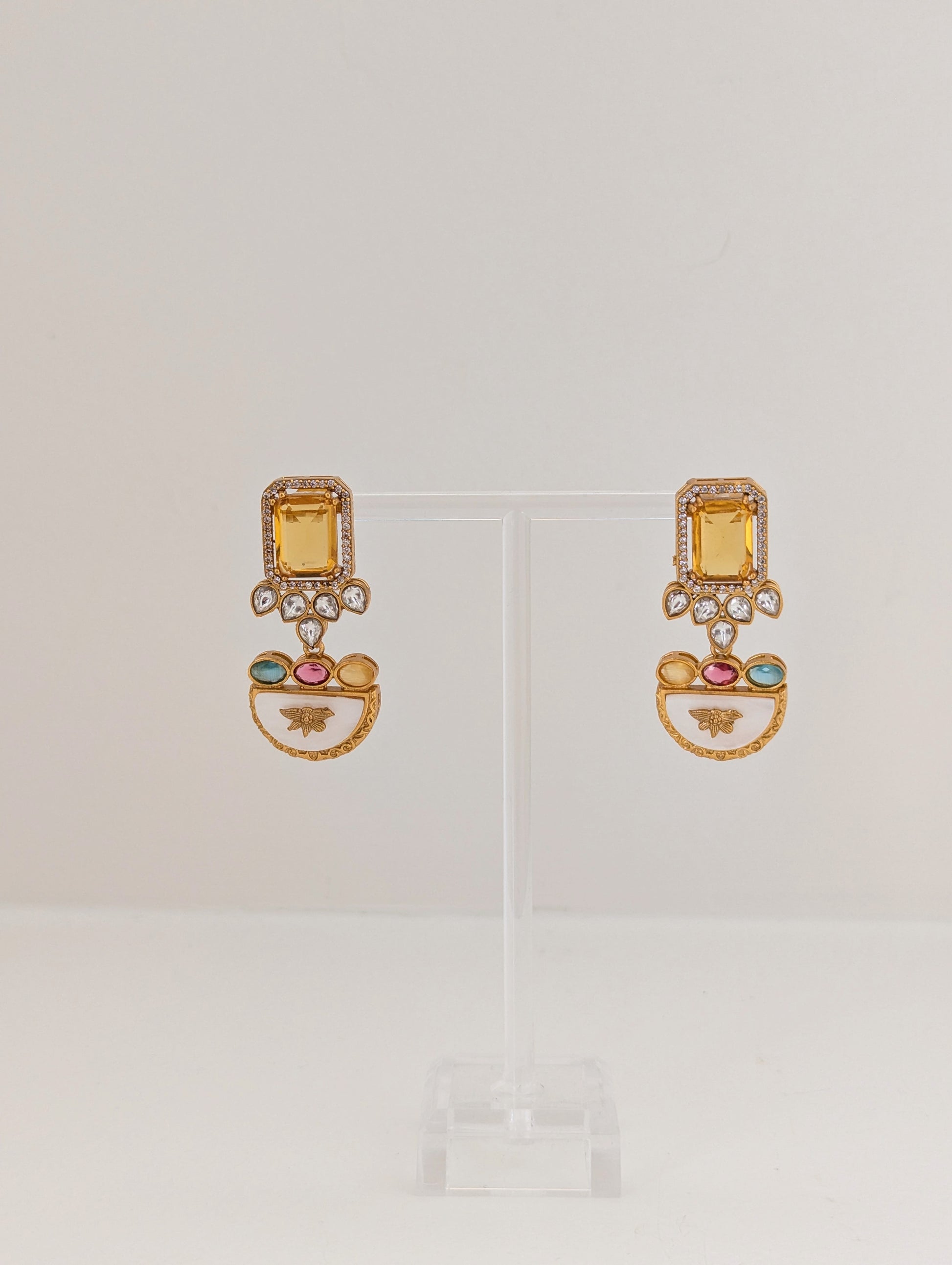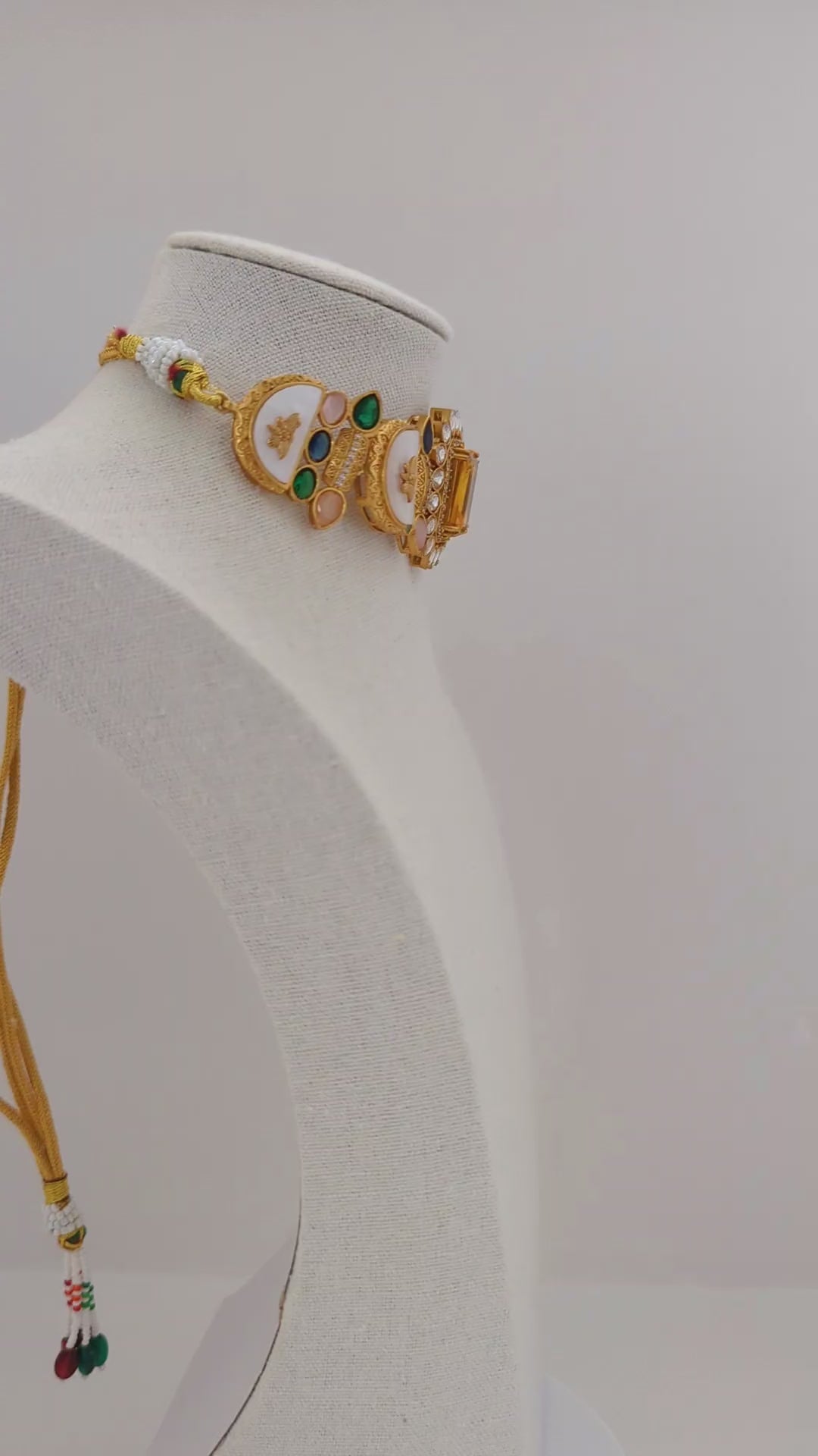 This exquisite jewelry set features a regal choker necklace and matching earrings, intricately crafted with a blend of vibrant multicolored stones, kundan-style accents, and enamel work. The centerpiece of the choker showcases a large yellow stone framed with sparkling clear crystals, surrounded by detailed motifs and teardrop embellishments. Coordinating earrings echo the design, highlighting the pink centerpiece, gemstone detailing, and a white enamel drop with a golden floral motif. The necklace is finished with an adjustable string for a custom fit, making it both elegant and versatile for special occasions