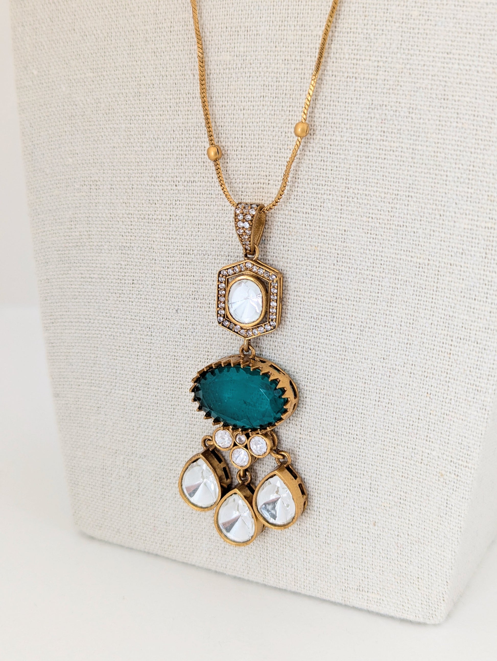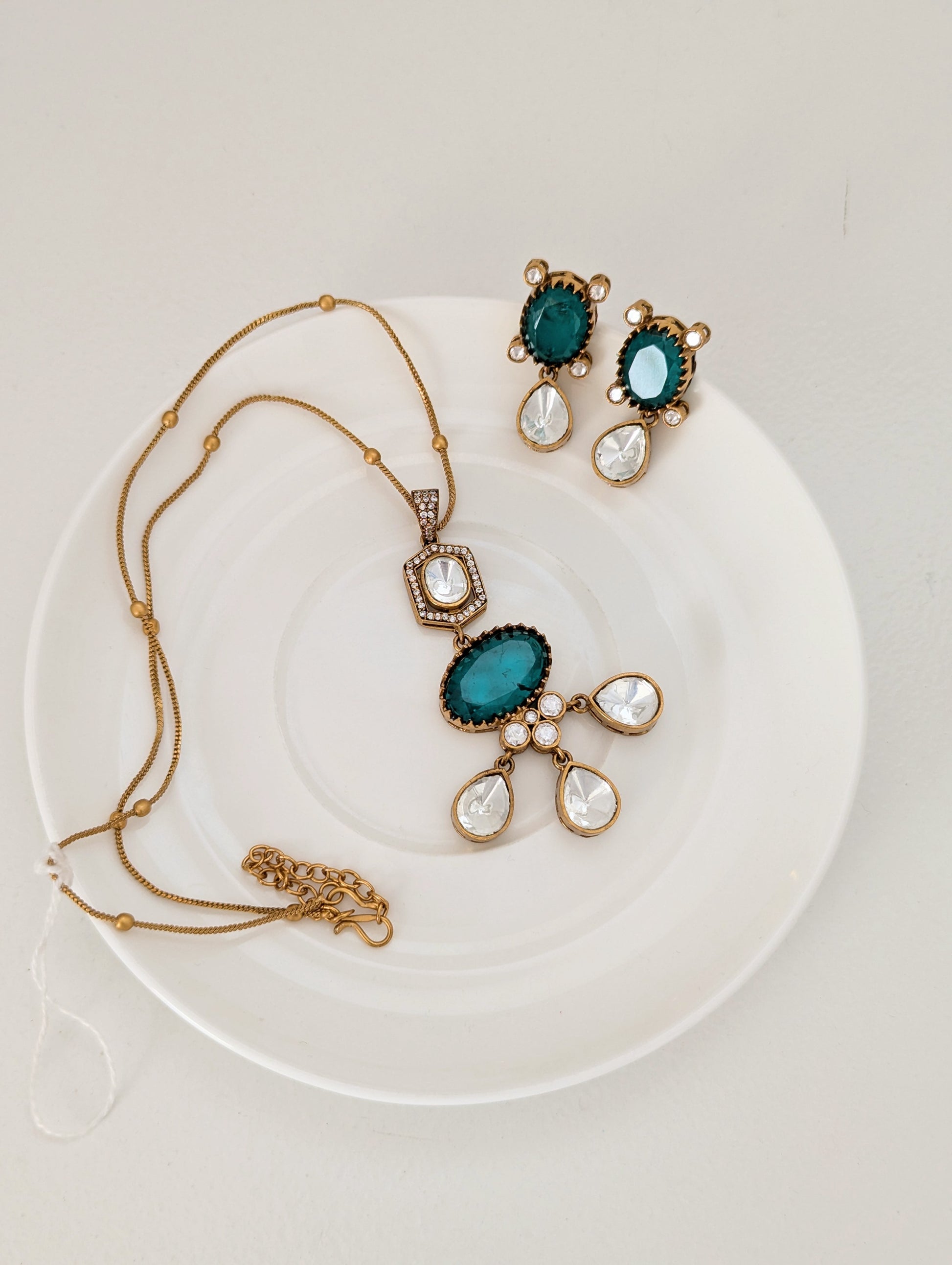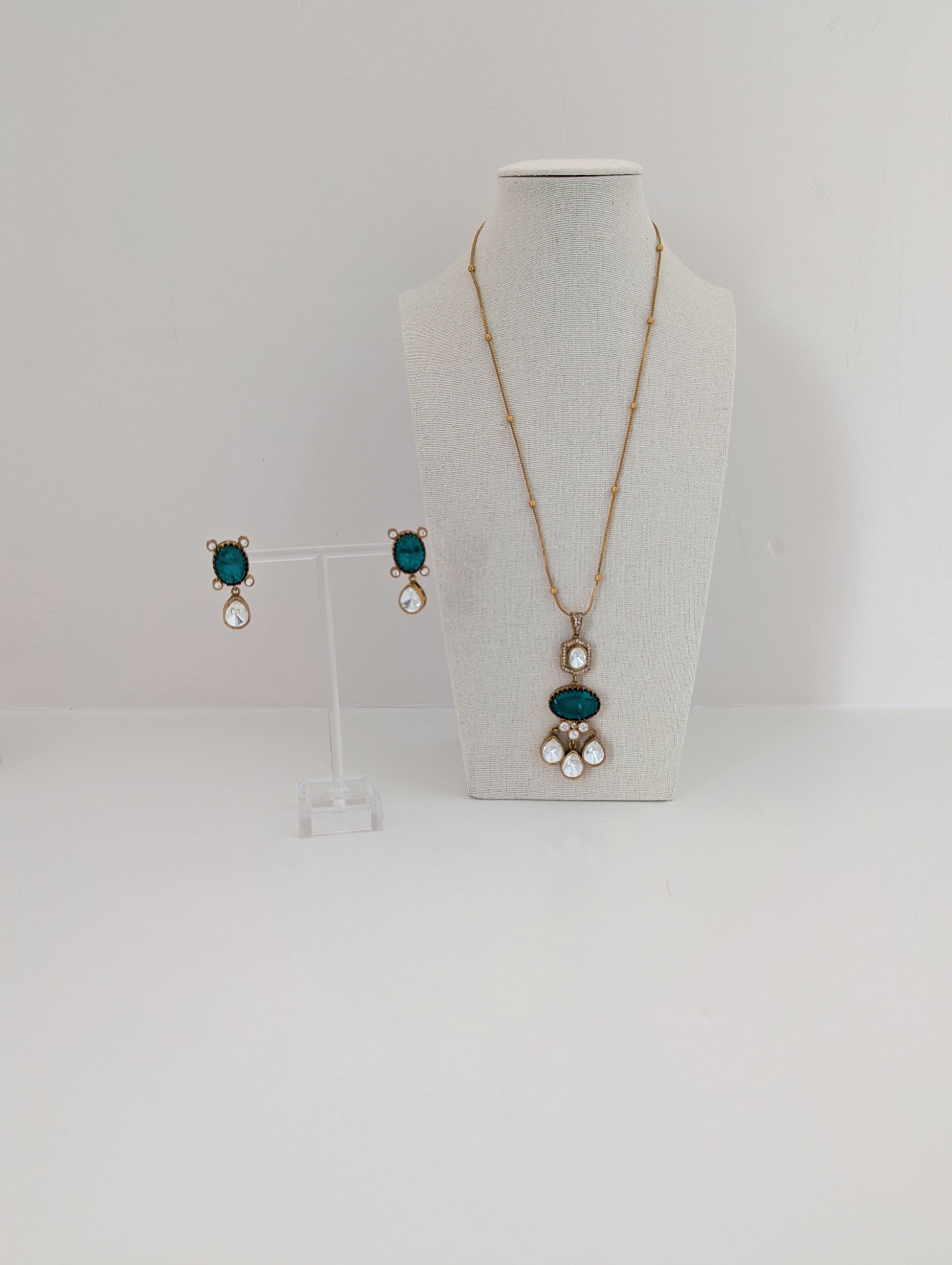 This elegant jewelry set features a gold-toned chain with a statement pendant and matching earrings. The design highlights deep teal oval stones framed in antique-finish settings, paired with glistening white tear-shaped and round stones for a touch of shimmer. The necklace's pendant is gracefully tiered, creating a regal silhouette, while the coordinating earrings mirror the same refined balance of color and sparkle. Perfect for traditional occasions or adding a classic charm to your look.