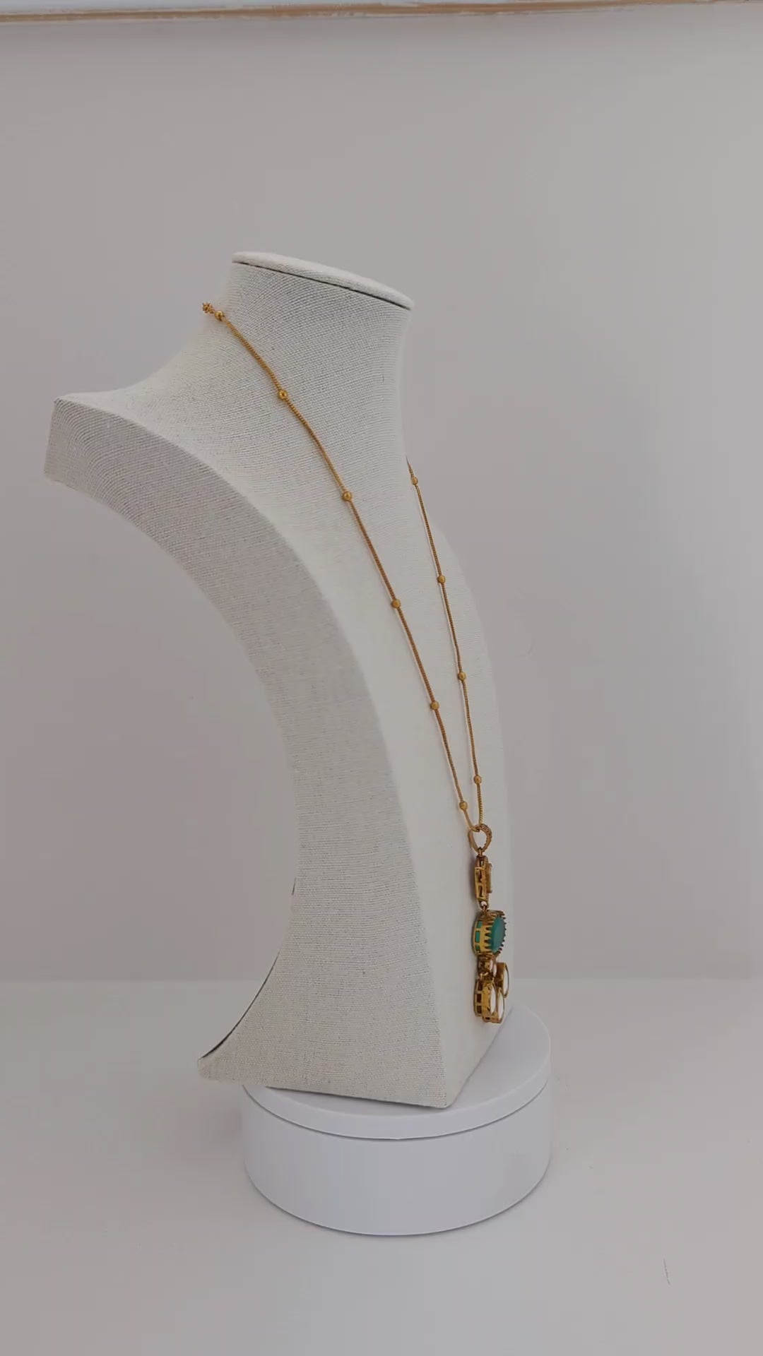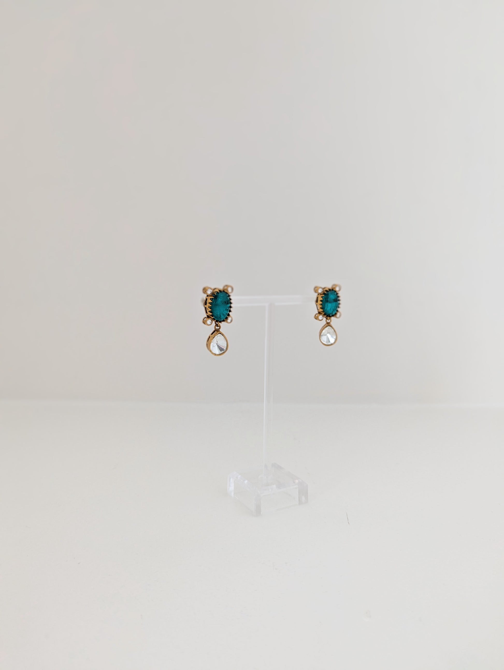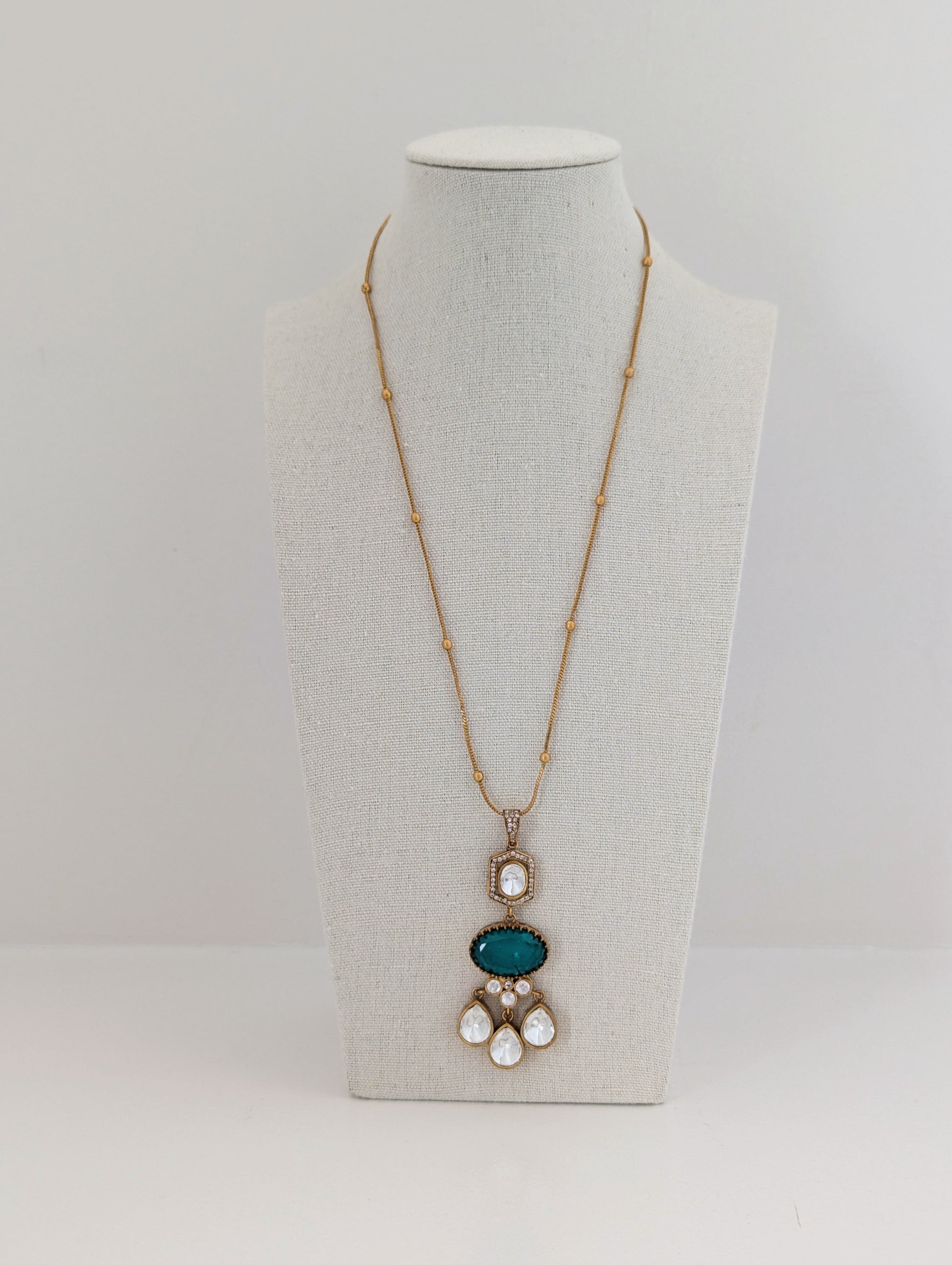 This elegant jewelry set features a gold-toned chain with a statement pendant and matching earrings. The design highlights deep teal oval stones framed in antique-finish settings, paired with glistening white tear-shaped and round stones for a touch of shimmer. The necklace's pendant is gracefully tiered, creating a regal silhouette, while the coordinating earrings mirror the same refined balance of color and sparkle. Perfect for traditional occasions or adding a classic charm to your look.
