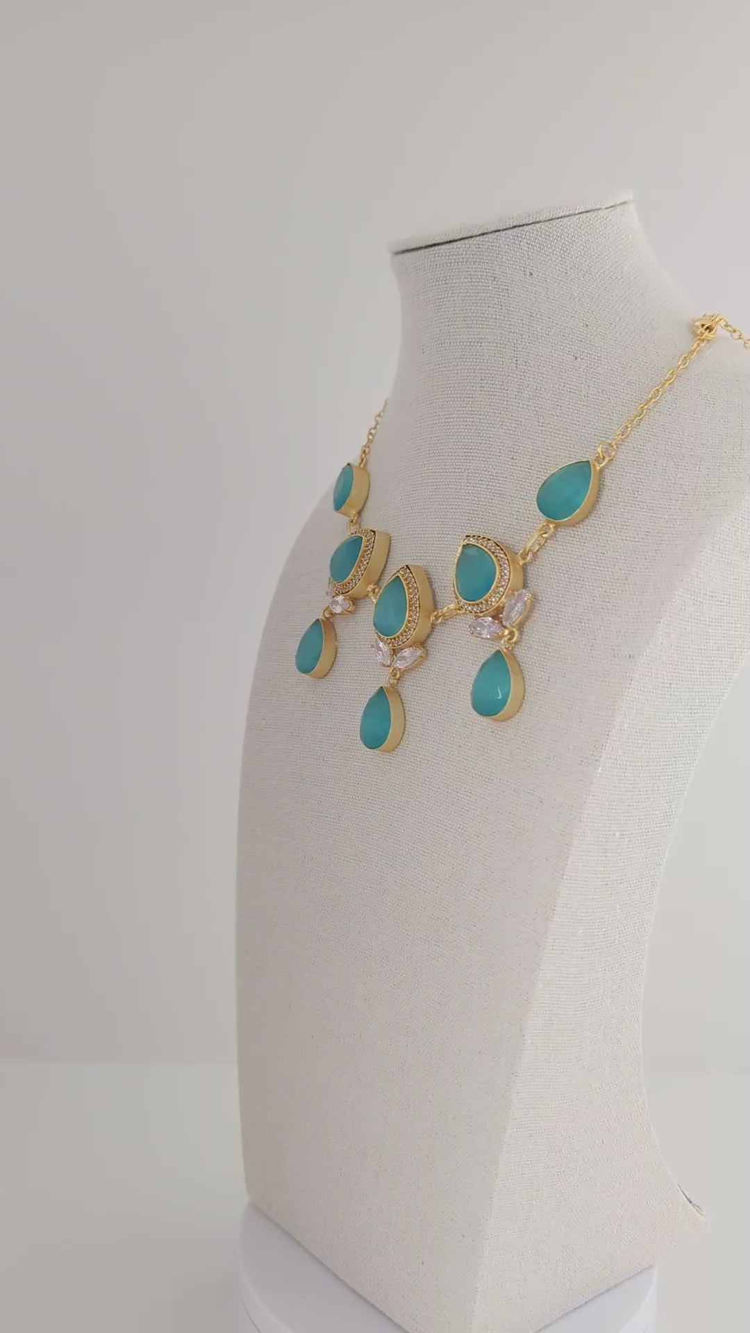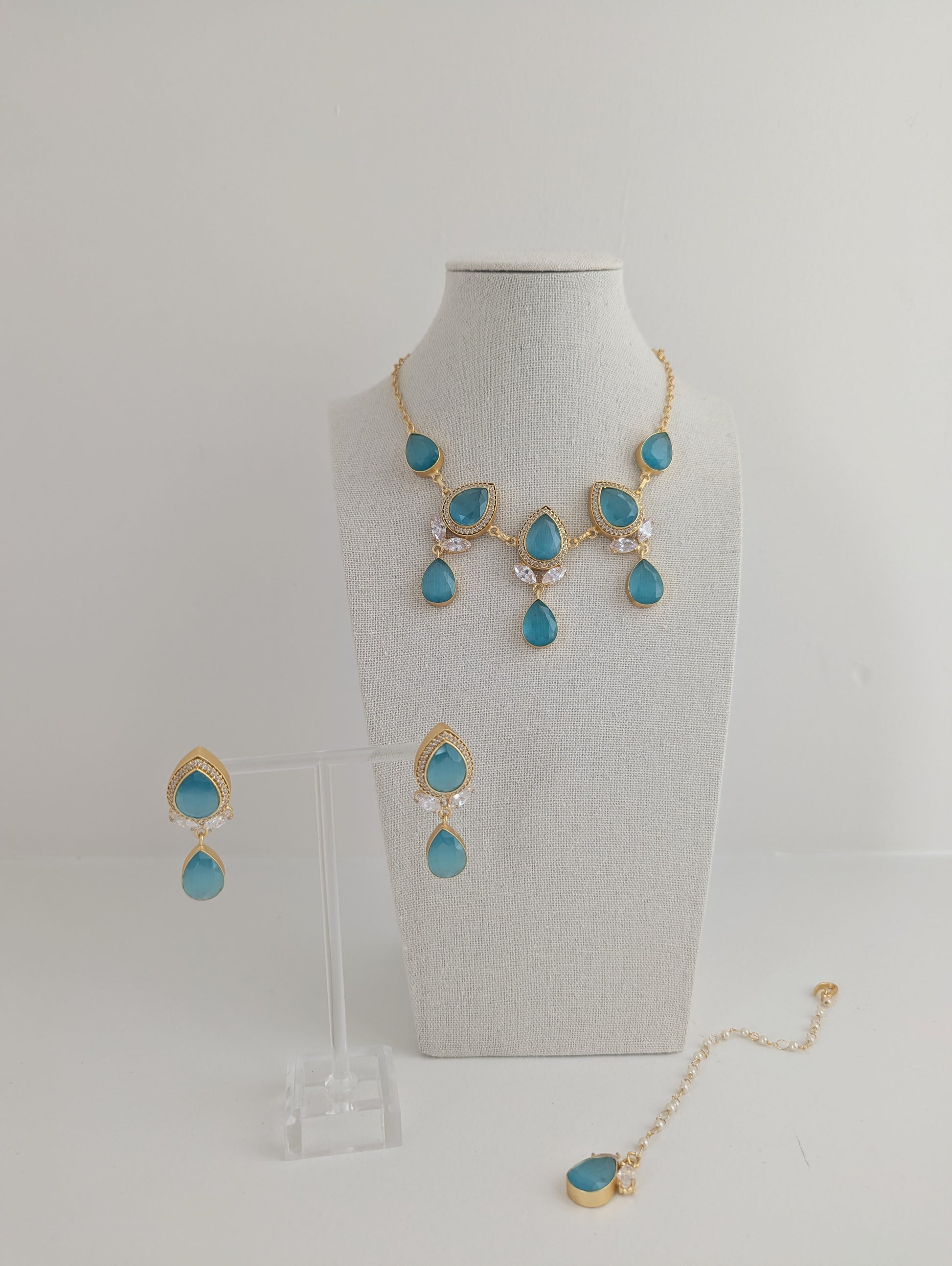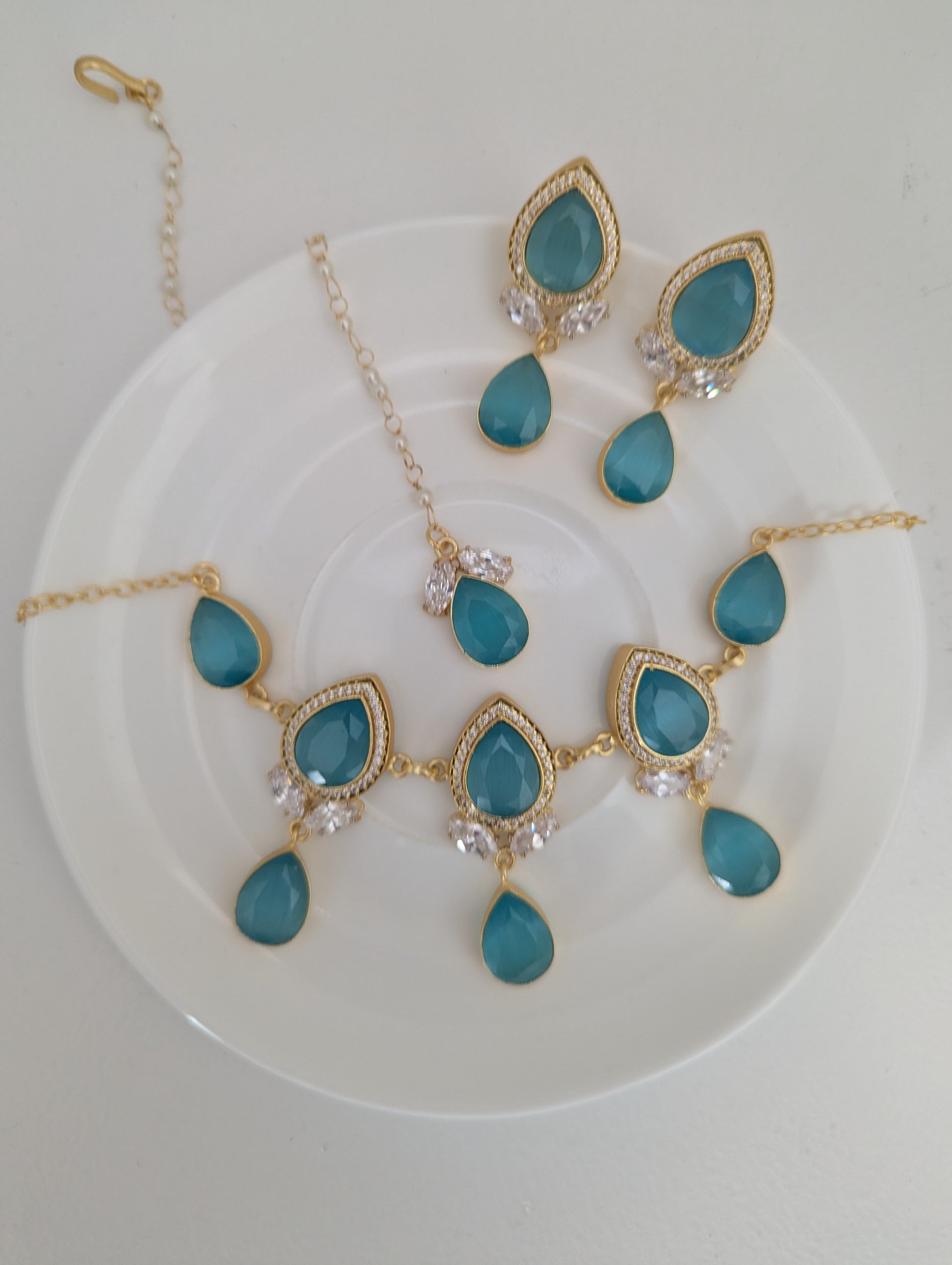 This elegant jewelry set features rich teal, teardrop-shaped stones framed in a warm gold-tone finish, accented with sparkling clear crystals for added brilliance. The necklace showcases a graceful drop design that sits beautifully along the neckline, perfectly complemented by matching drop earrings and a coordinating bracelet. Refined yet eye-catching, this set is ideal for weddings, festive occasions, or elevating an evening look with a touch of timeless glamour.
