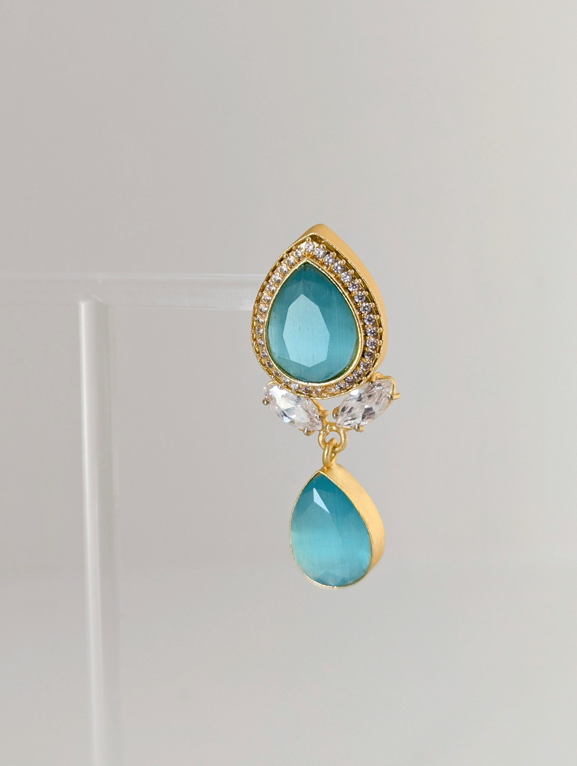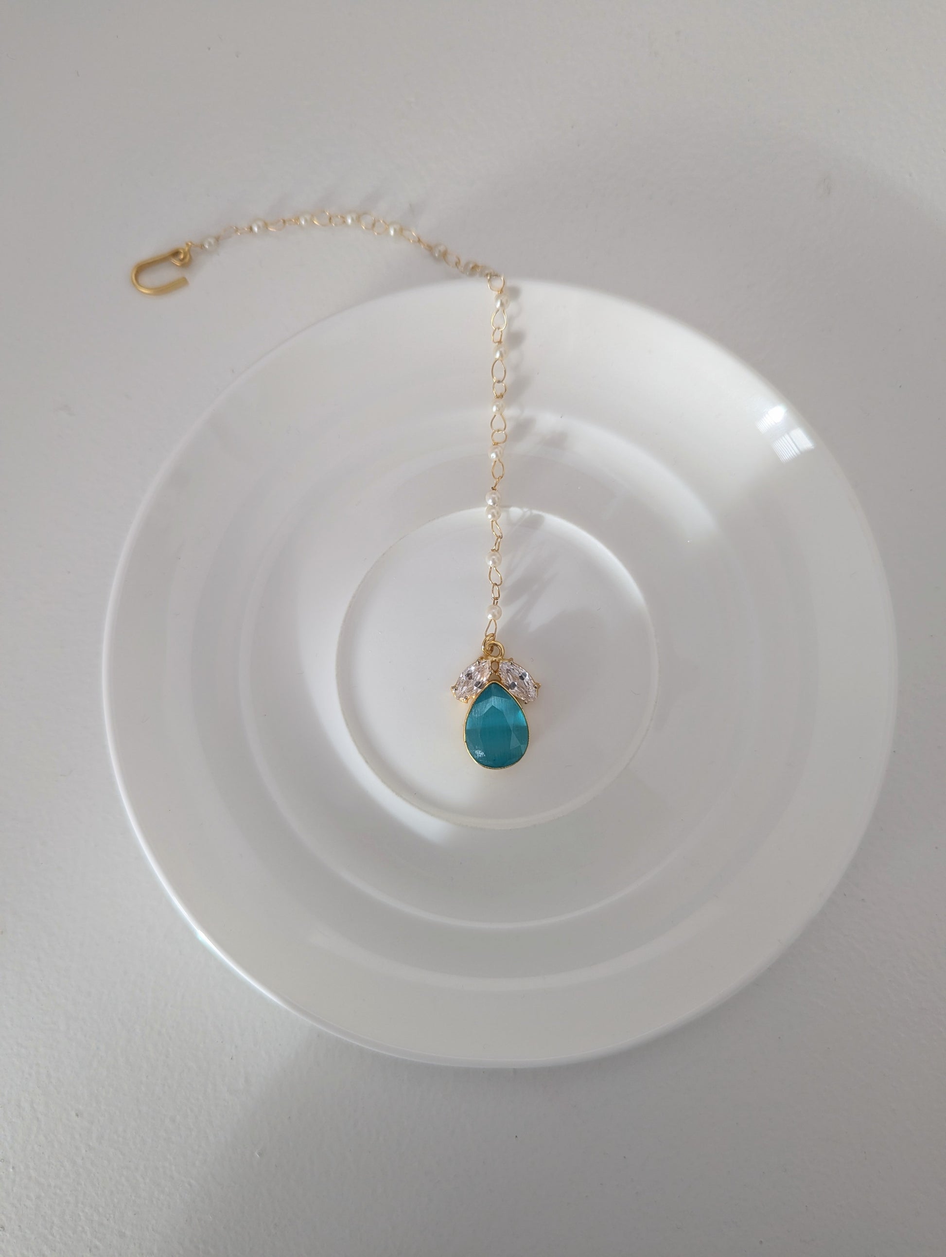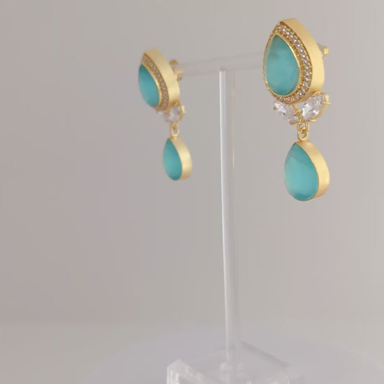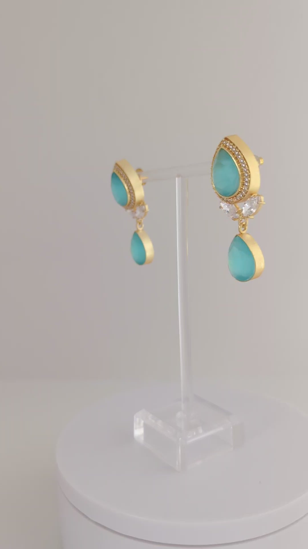 This elegant jewelry set features rich teal, teardrop-shaped stones framed in a warm gold-tone finish, accented with sparkling clear crystals for added brilliance. The necklace showcases a graceful drop design that sits beautifully along the neckline, perfectly complemented by matching drop earrings and a coordinating bracelet. Refined yet eye-catching, this set is ideal for weddings, festive occasions, or elevating an evening look with a touch of timeless glamour.