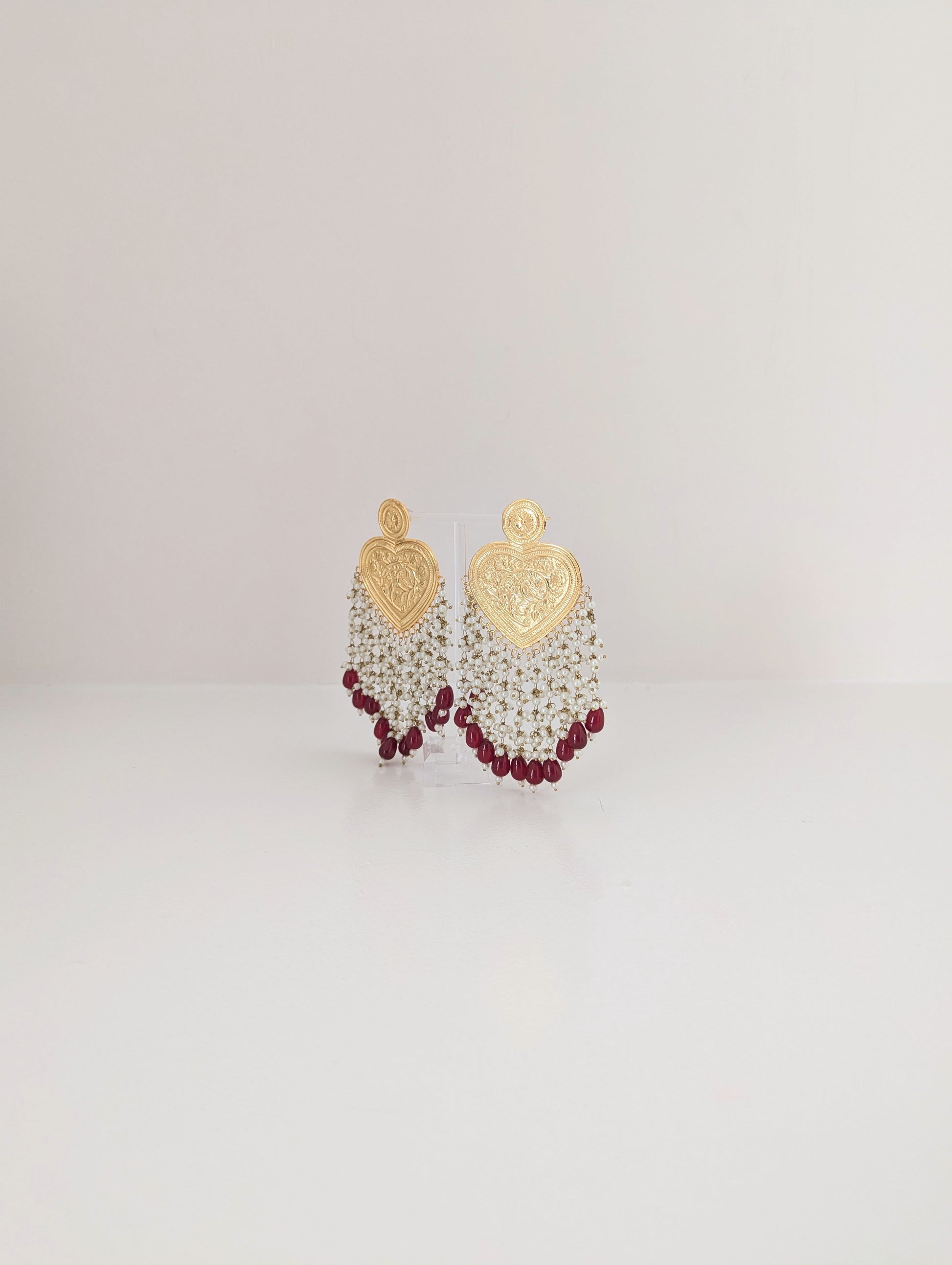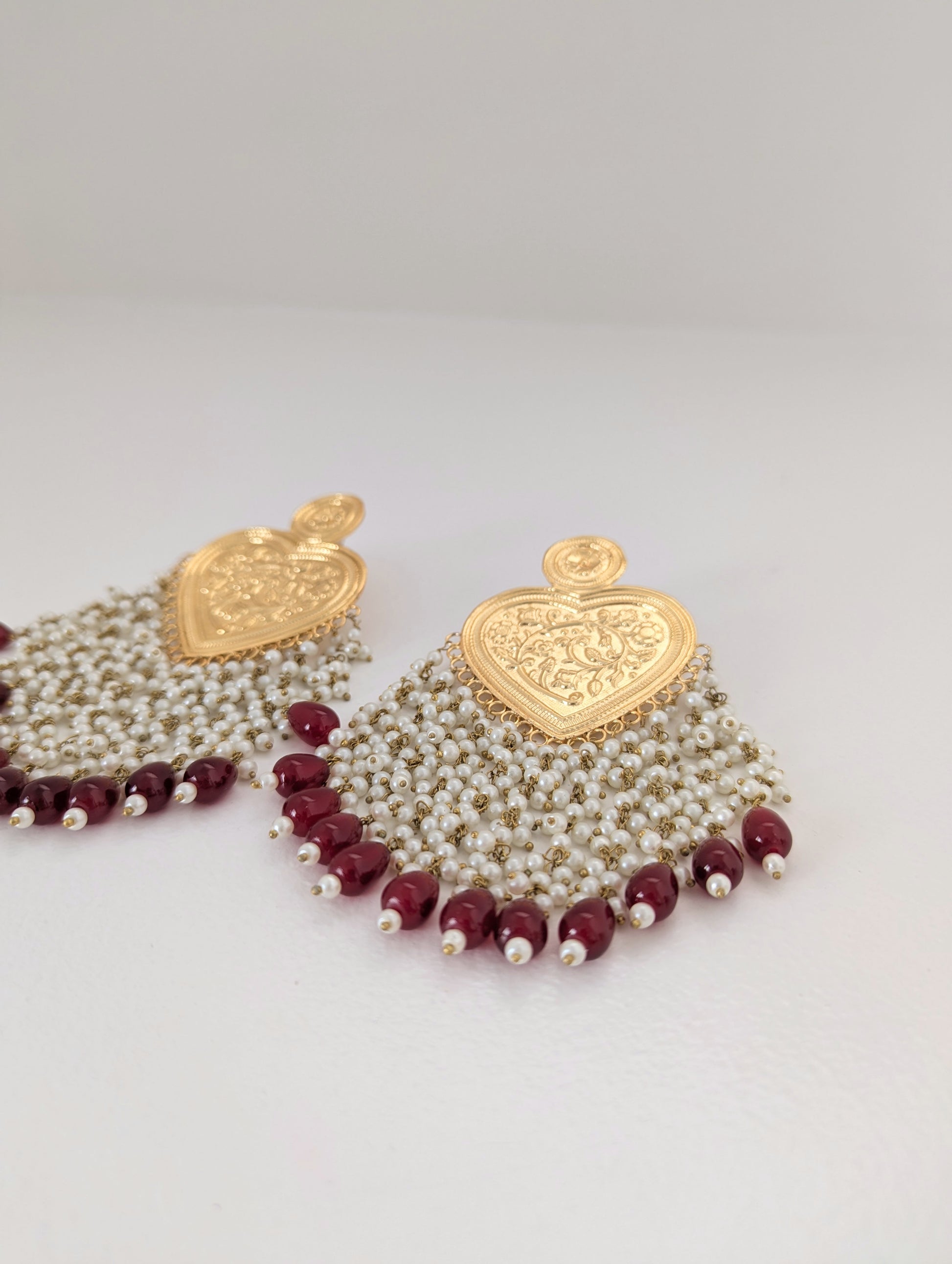 These exquisite statement earrings feature intricately engraved gold heart-shaped tops, exuding a vintage charm. Cascading below is a delicate arrangement of small pearls interwoven with golden links, creating a luxurious drape. Burgundy beads complete the design, adding a touch of romance and femininity. A perfect blend of elegance and tradition, these earrings are ideal for special occasions.