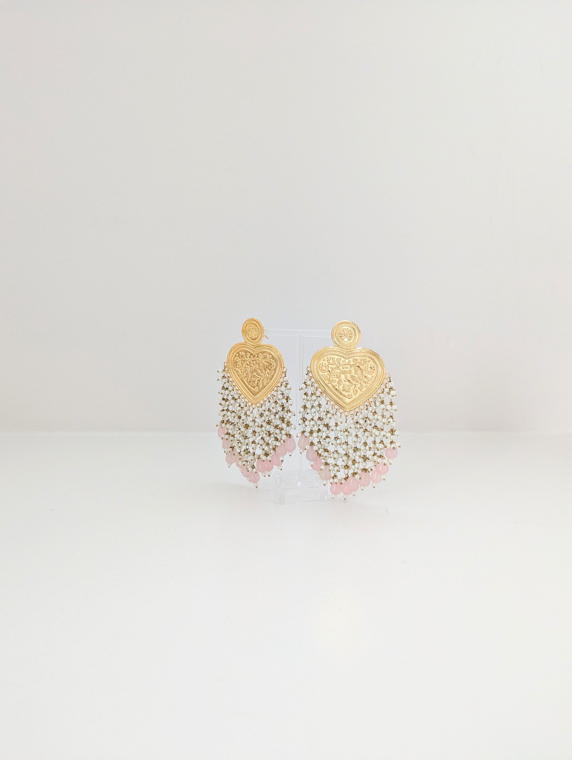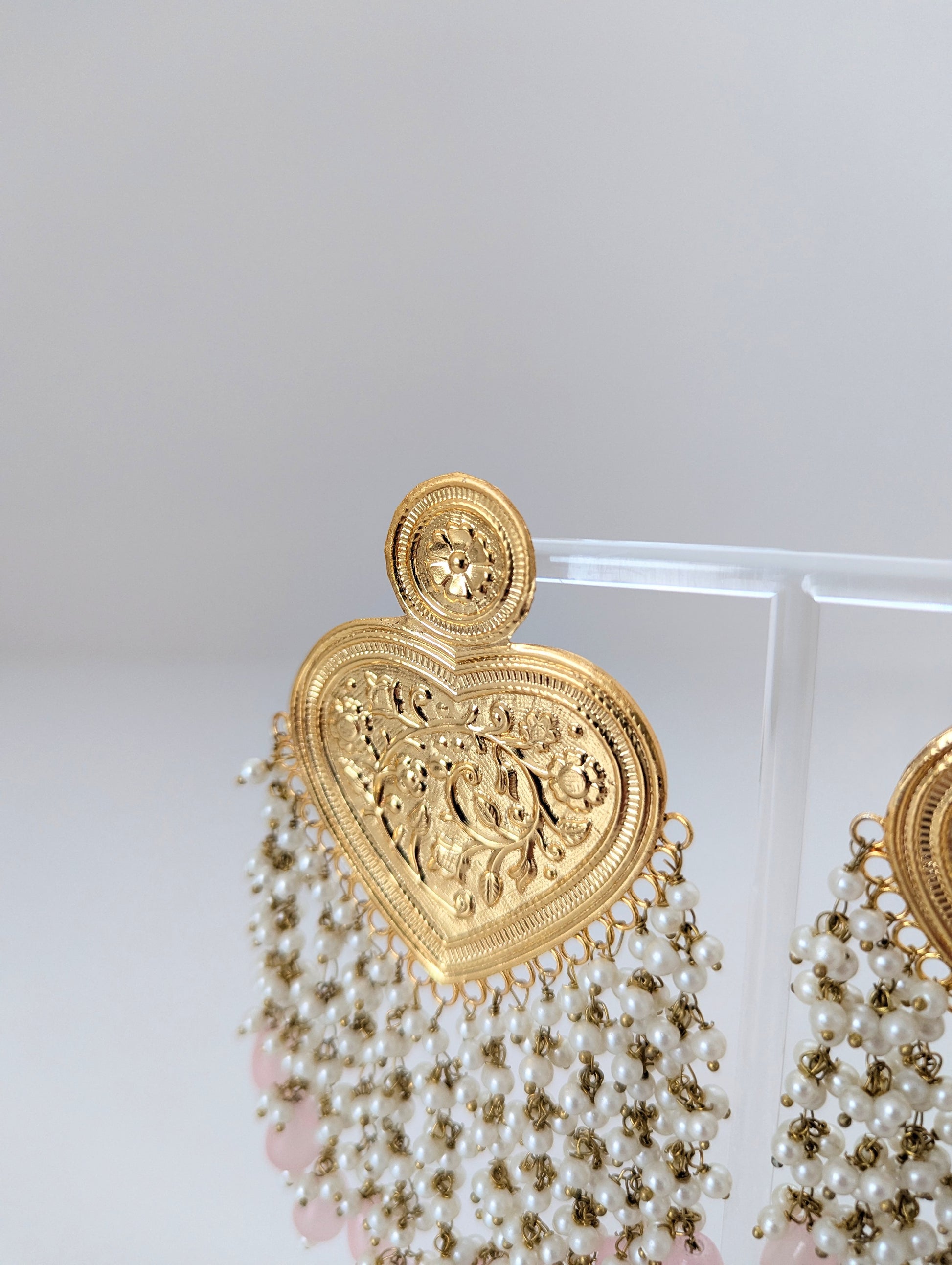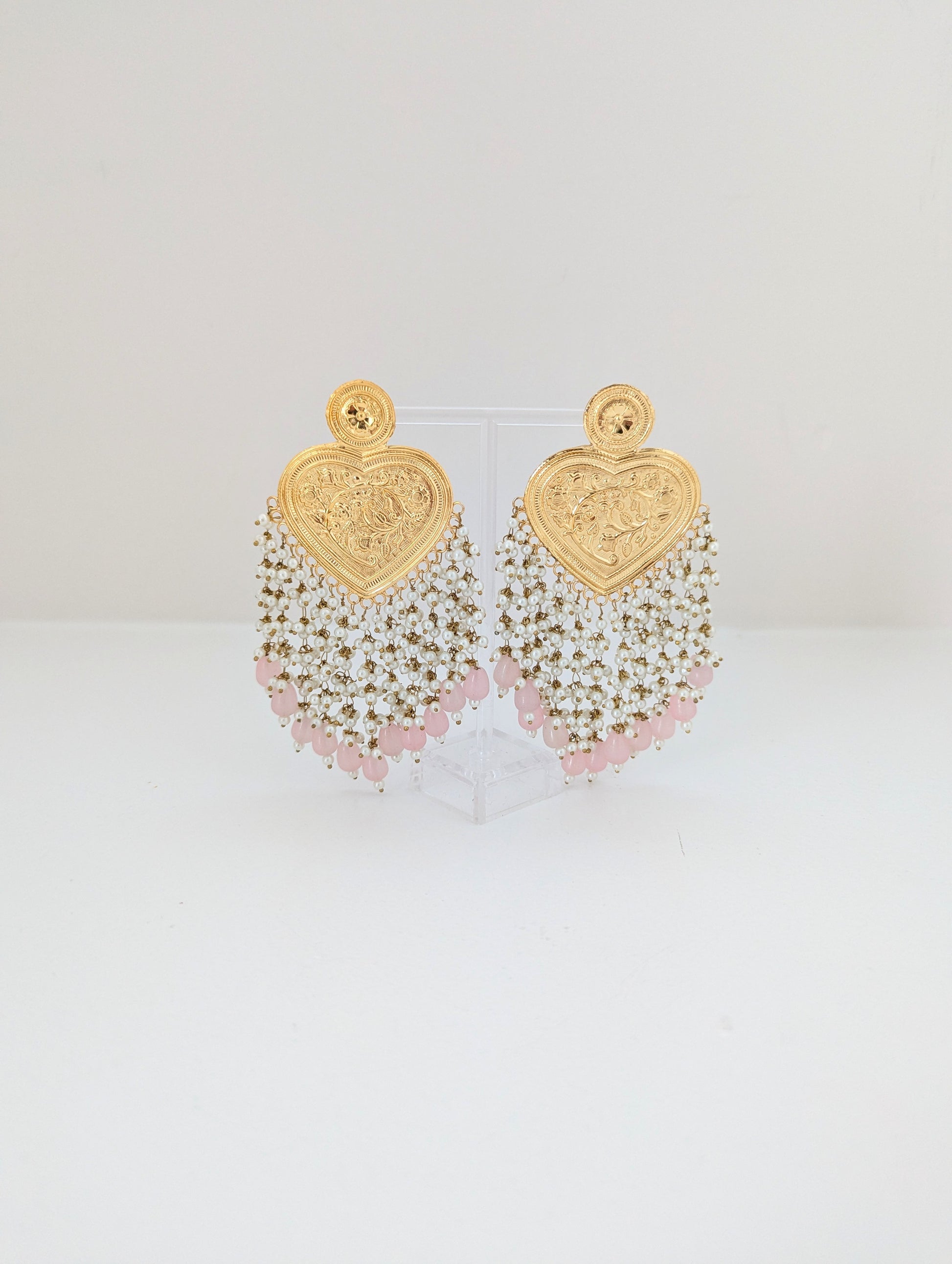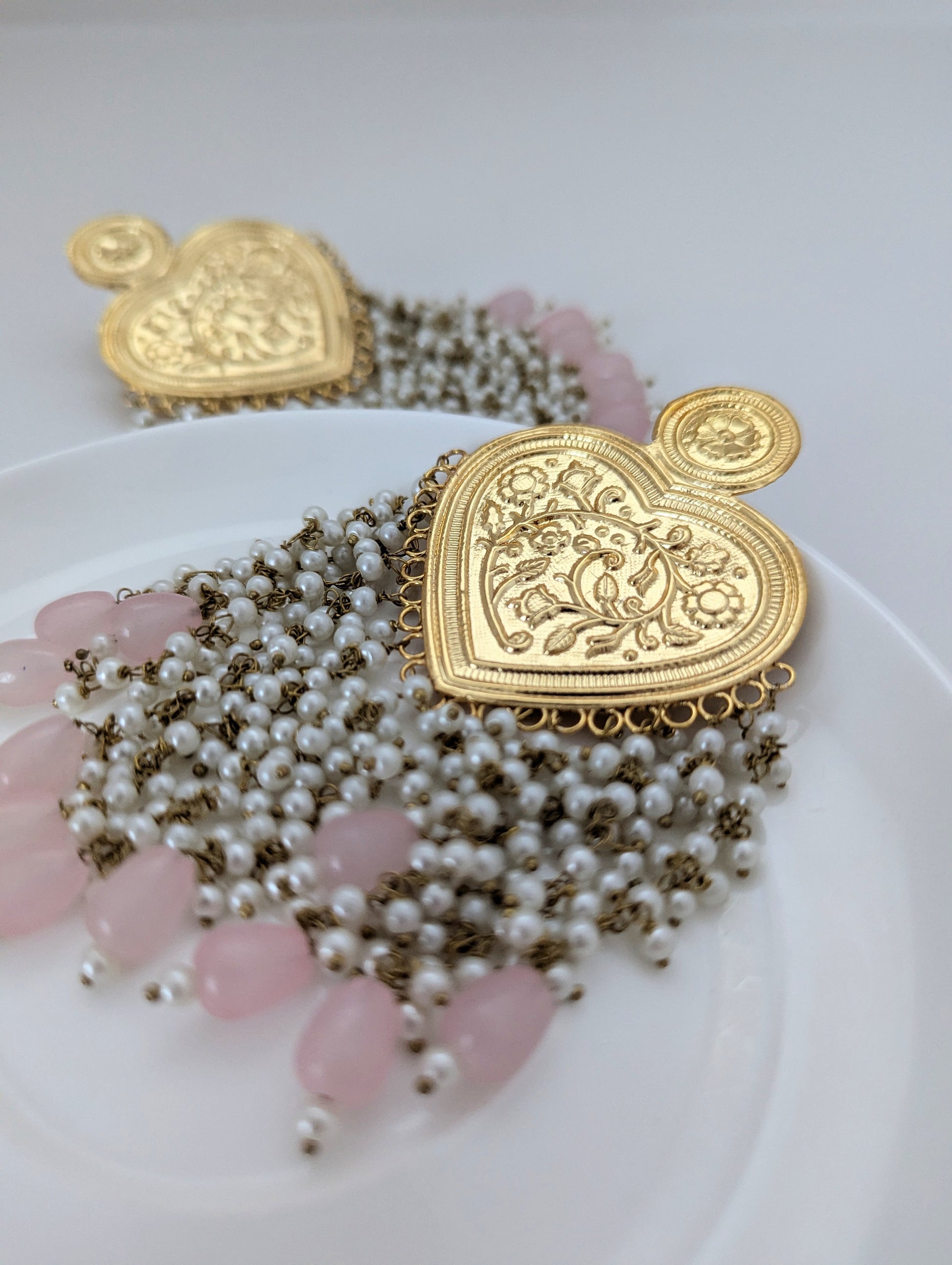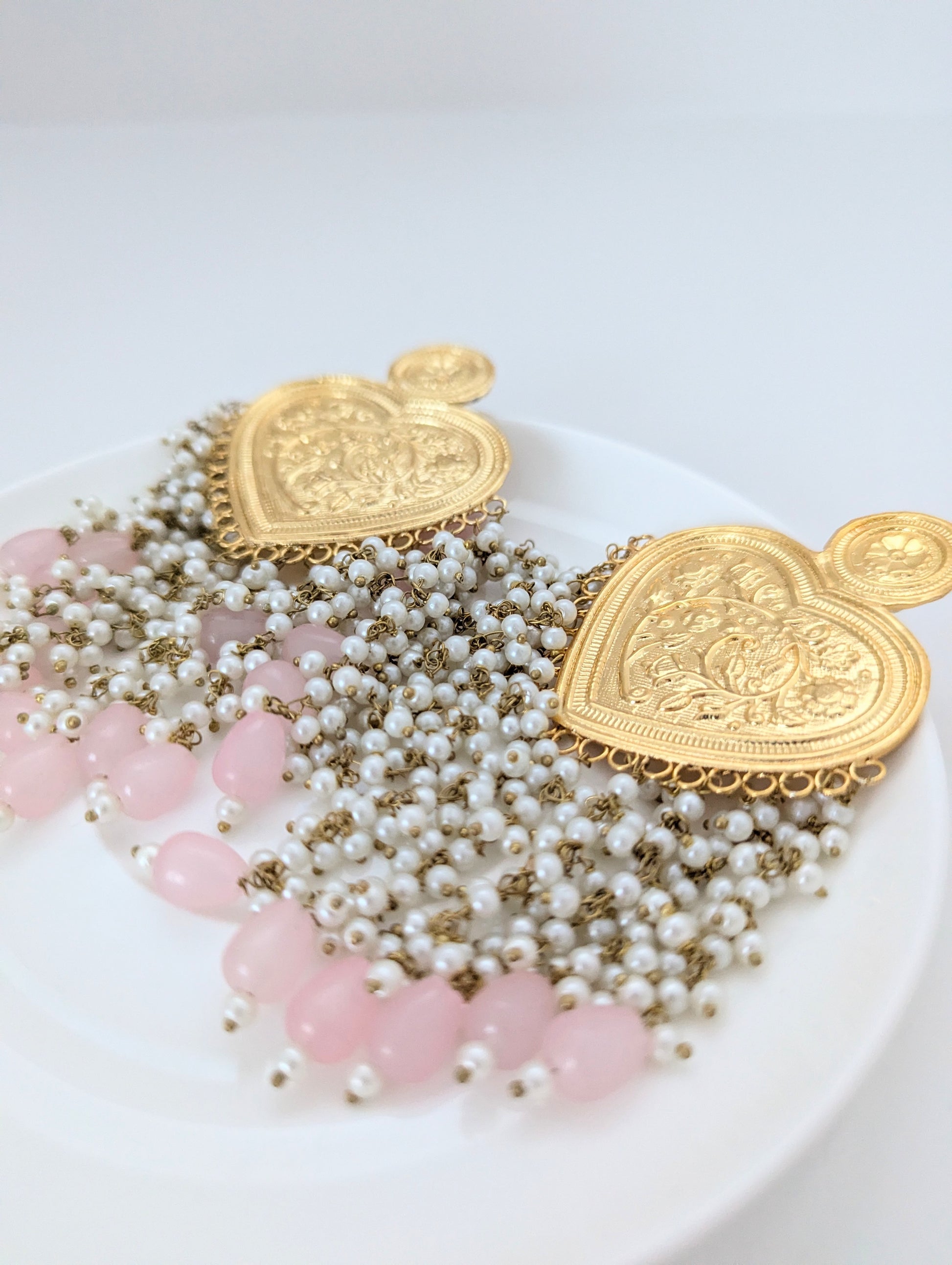 These exquisite statement earrings feature intricately engraved gold heart-shaped tops, exuding a vintage charm. Cascading below is a delicate arrangement of small pearls interwoven with golden links, creating a luxurious drape. Soft pink teardrop beads complete the design, adding a touch of romance and femininity. A perfect blend of elegance and tradition, these earrings are ideal for special occasions.