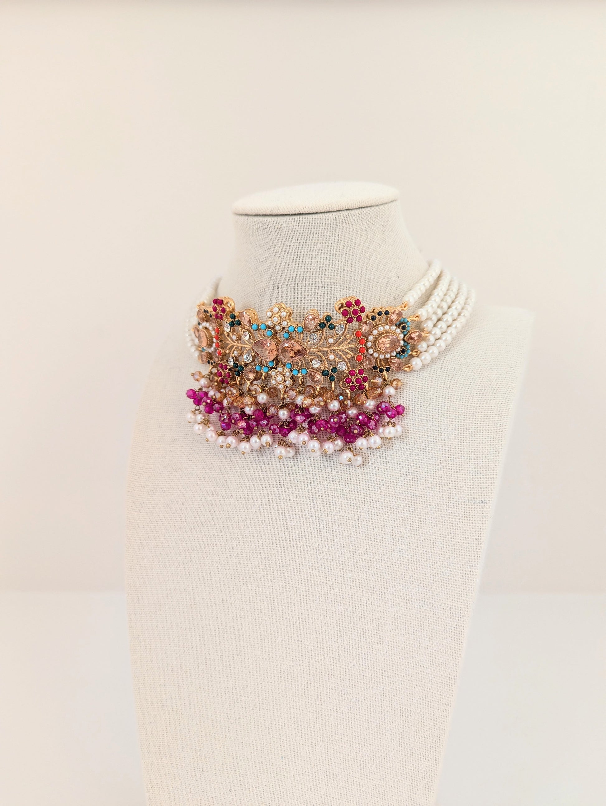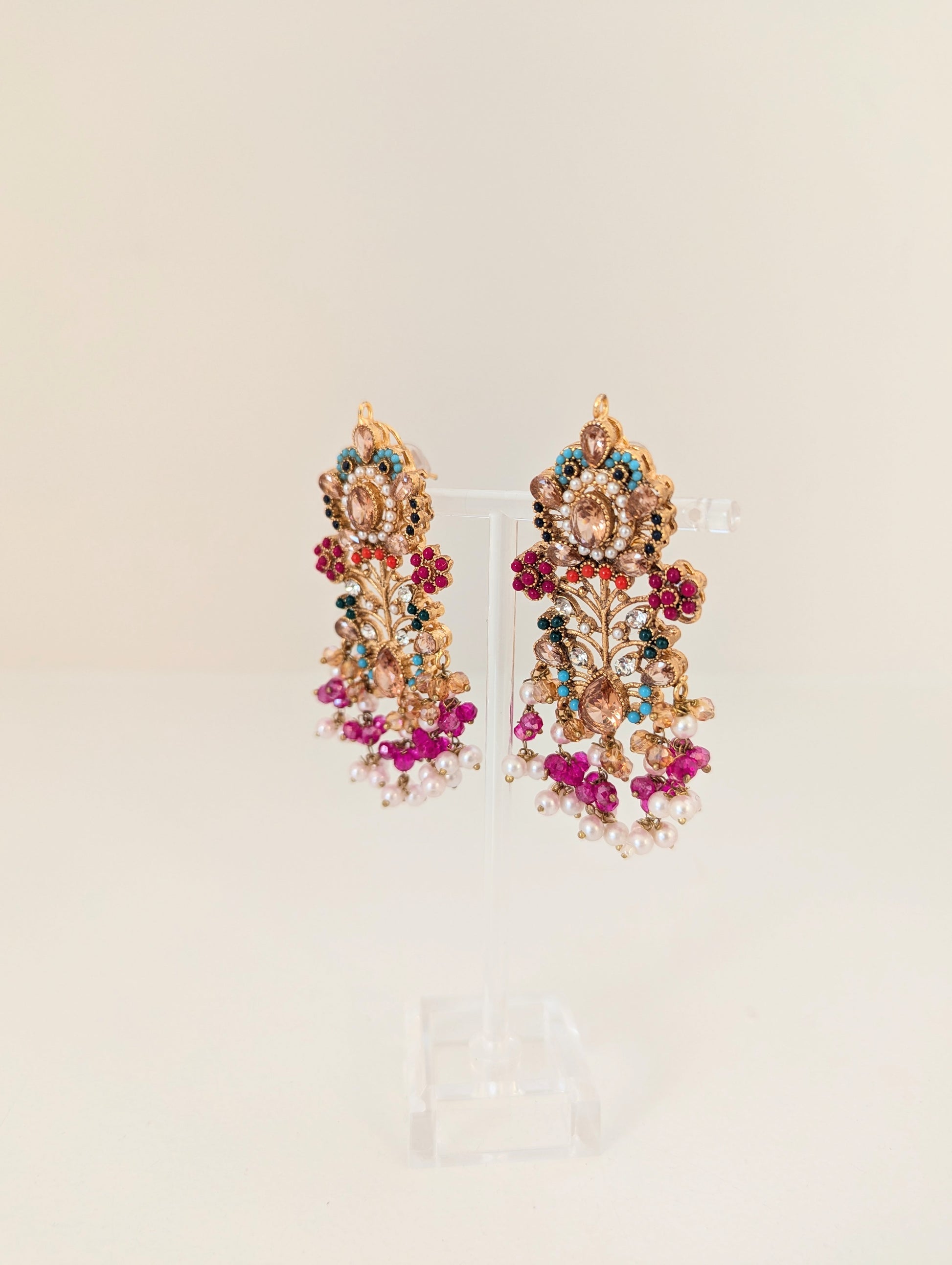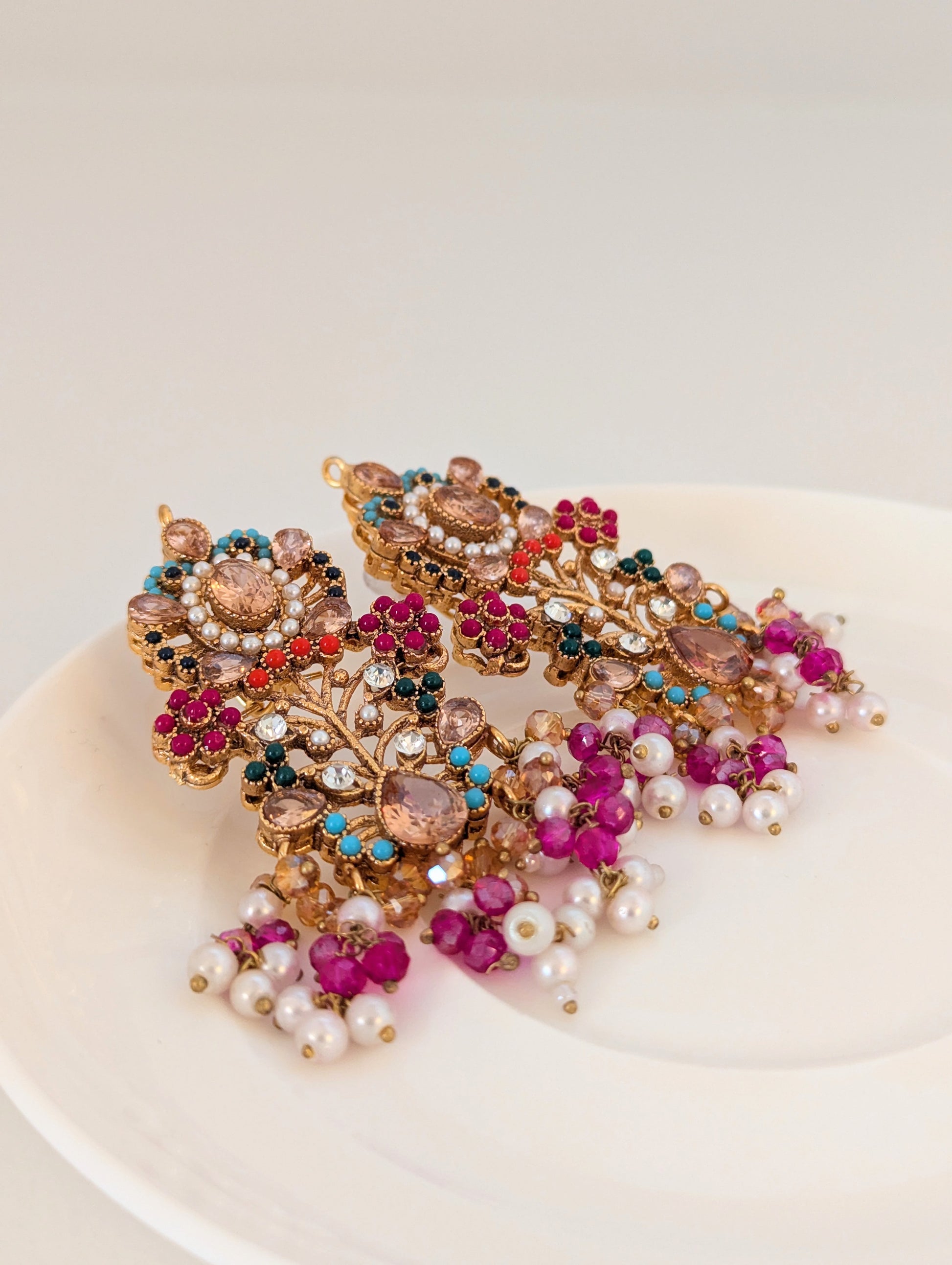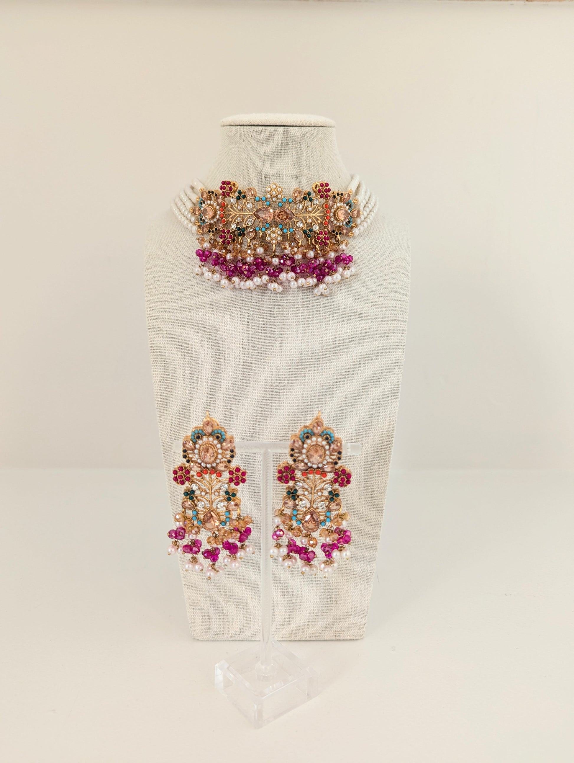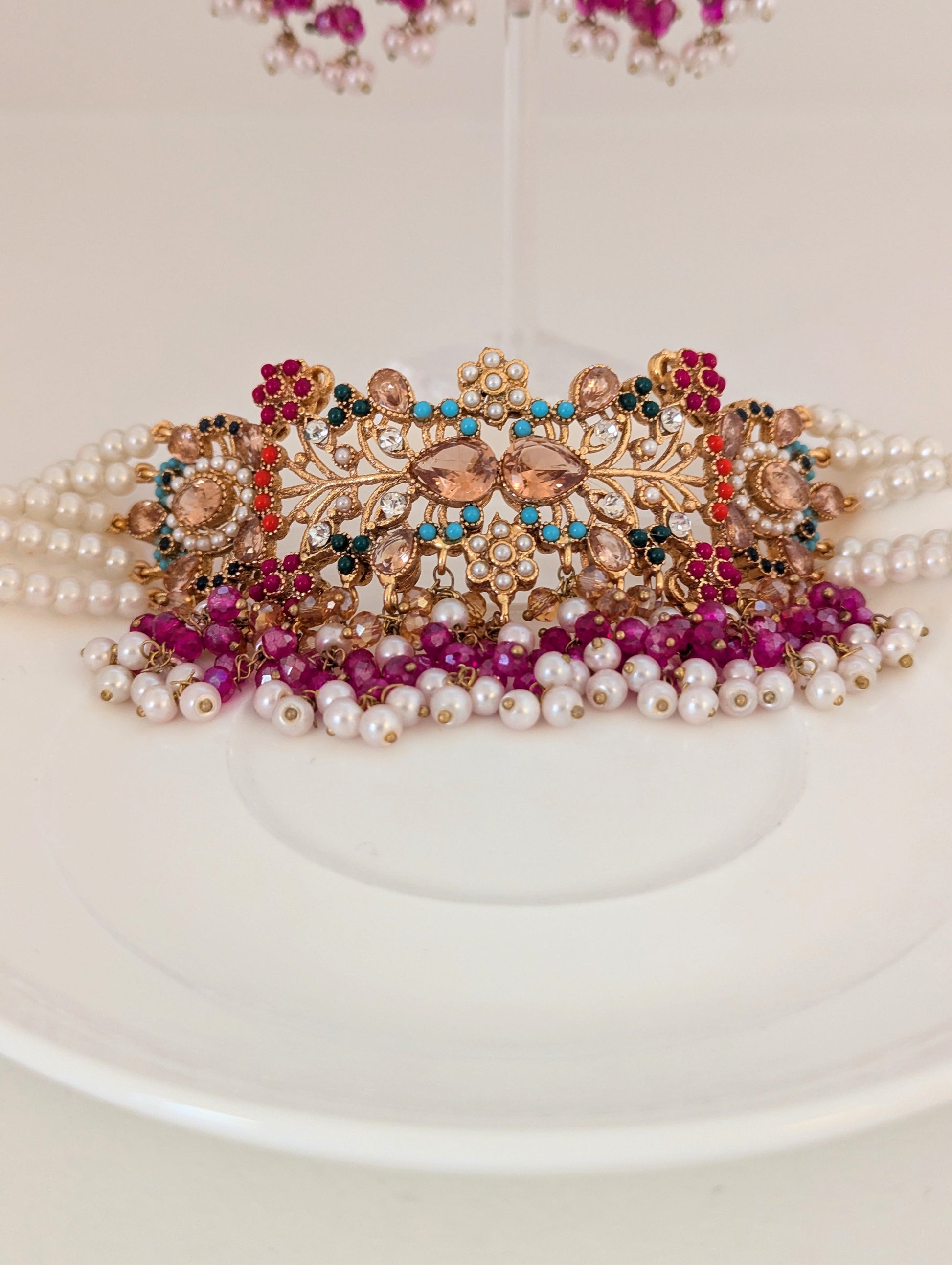 This jewelry set features a beautifully intricate design with gold-toned metalwork, adorned with champagne gemstones and delicate white pearls. The floral and vine-like patterns, embellished with small crystal accents, give it an elegant and regal look. The cascading bead detailing adds a touch of sophistication, making it perfect for traditional or festive occasions.