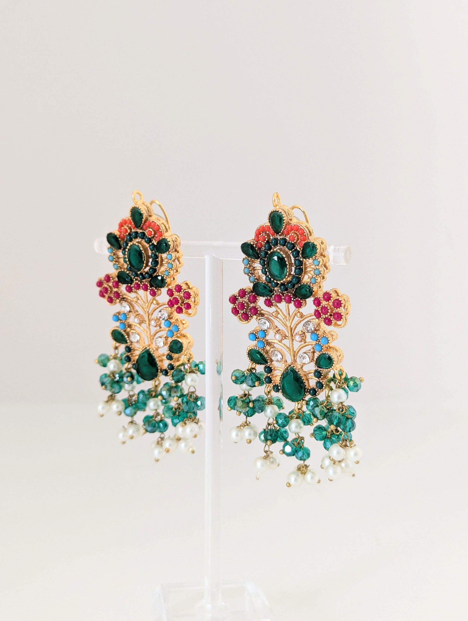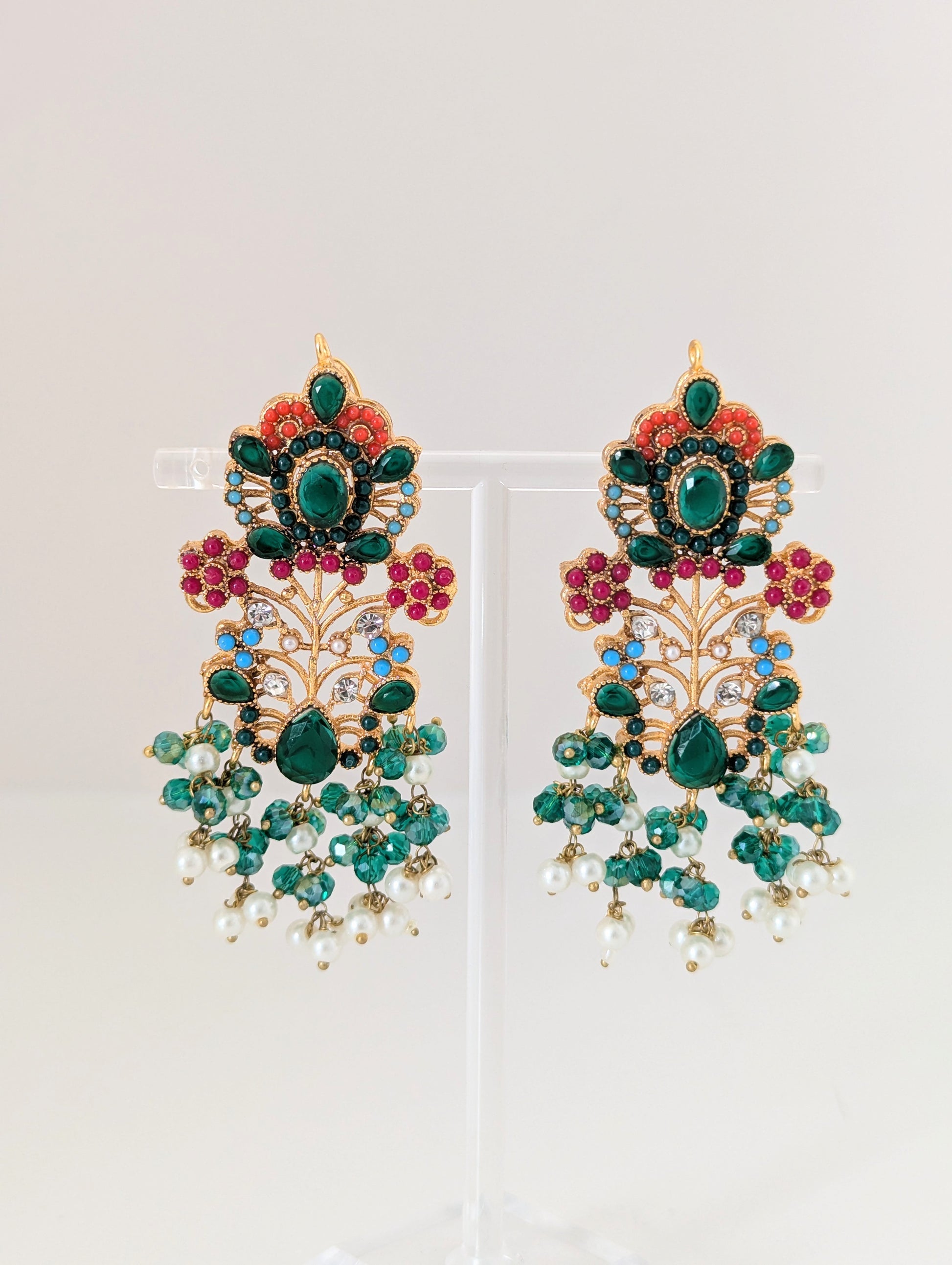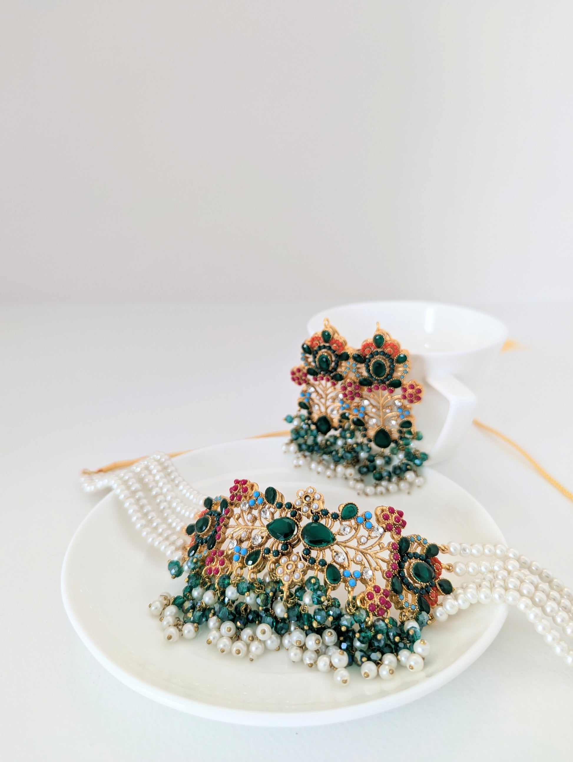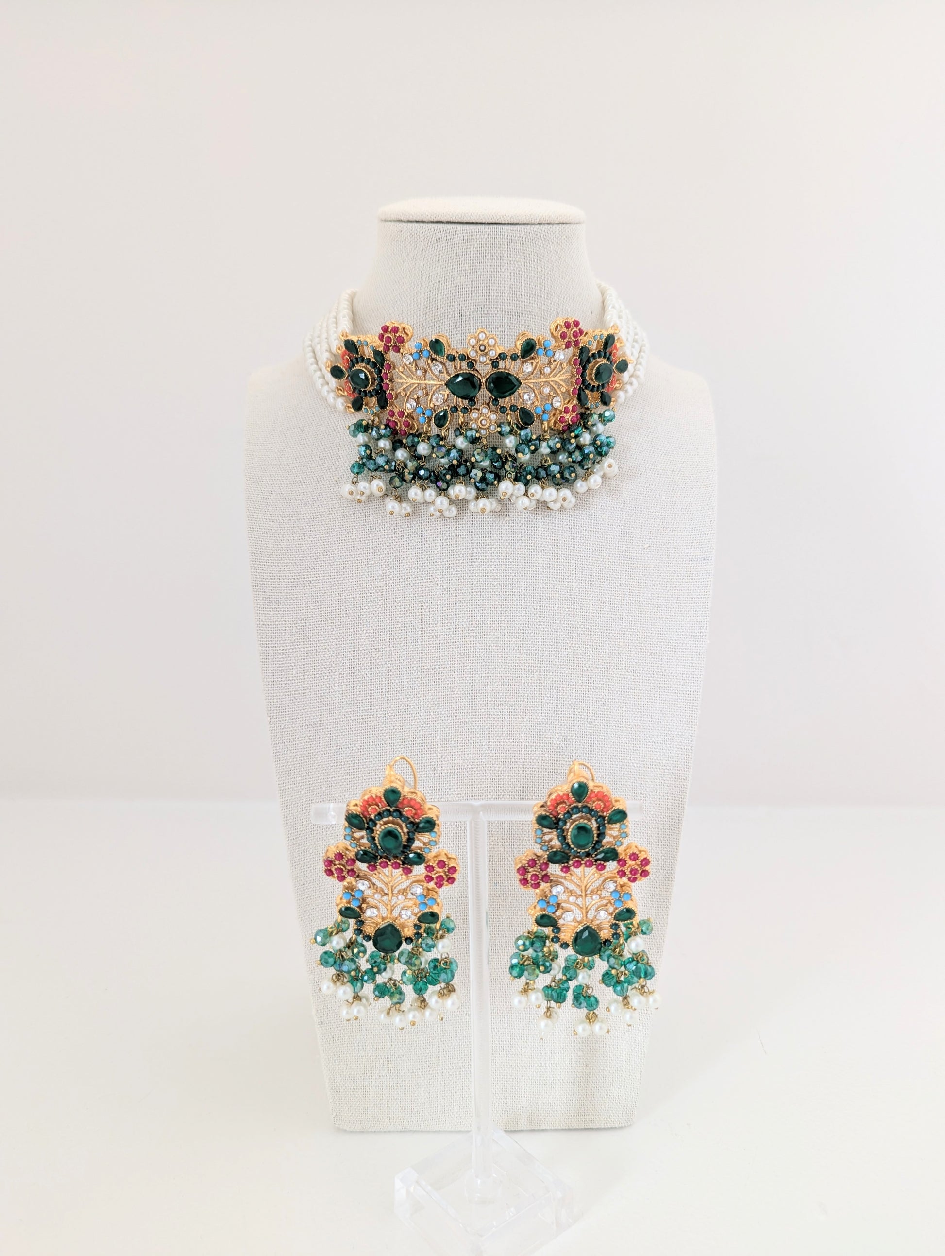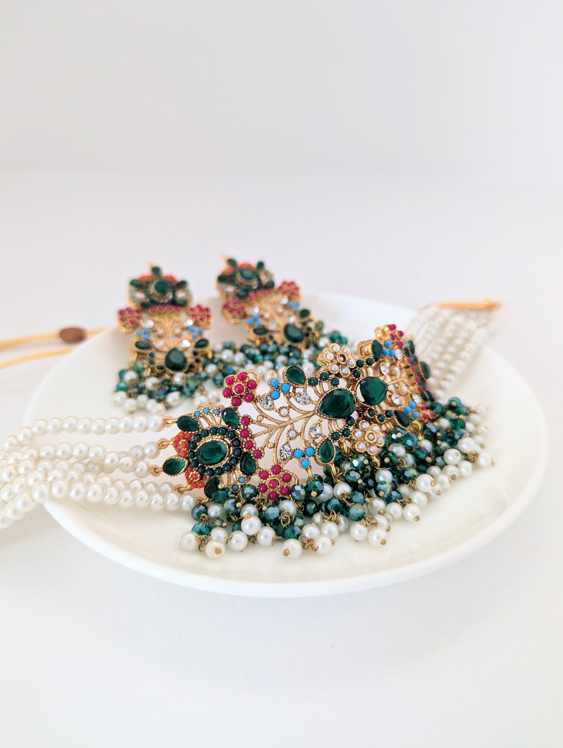 This exquisite jewelry set features a regal choker necklace and matching statement earrings, crafted with intricate gold filigree work. The set is adorned with deep green gemstones, vibrant pink and blue accents, and an array of pearls that add a luxurious touch. The cascading pearl and bead detailing enhances its elegance, making it a perfect choice for special occasions or traditional attire.