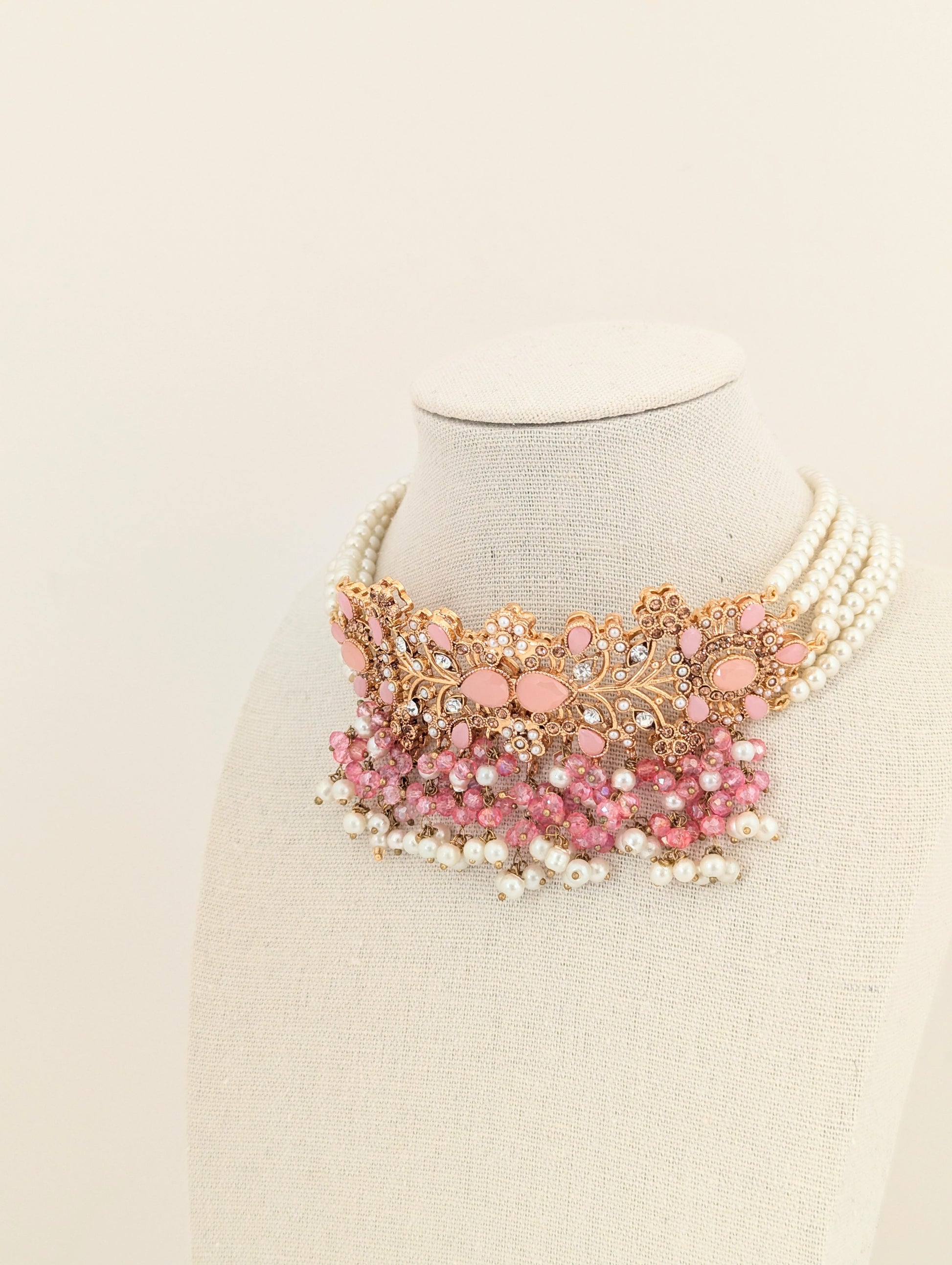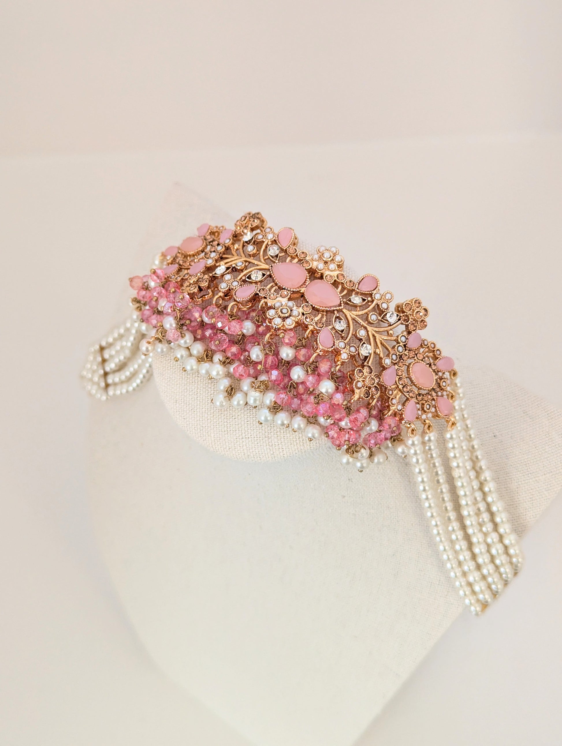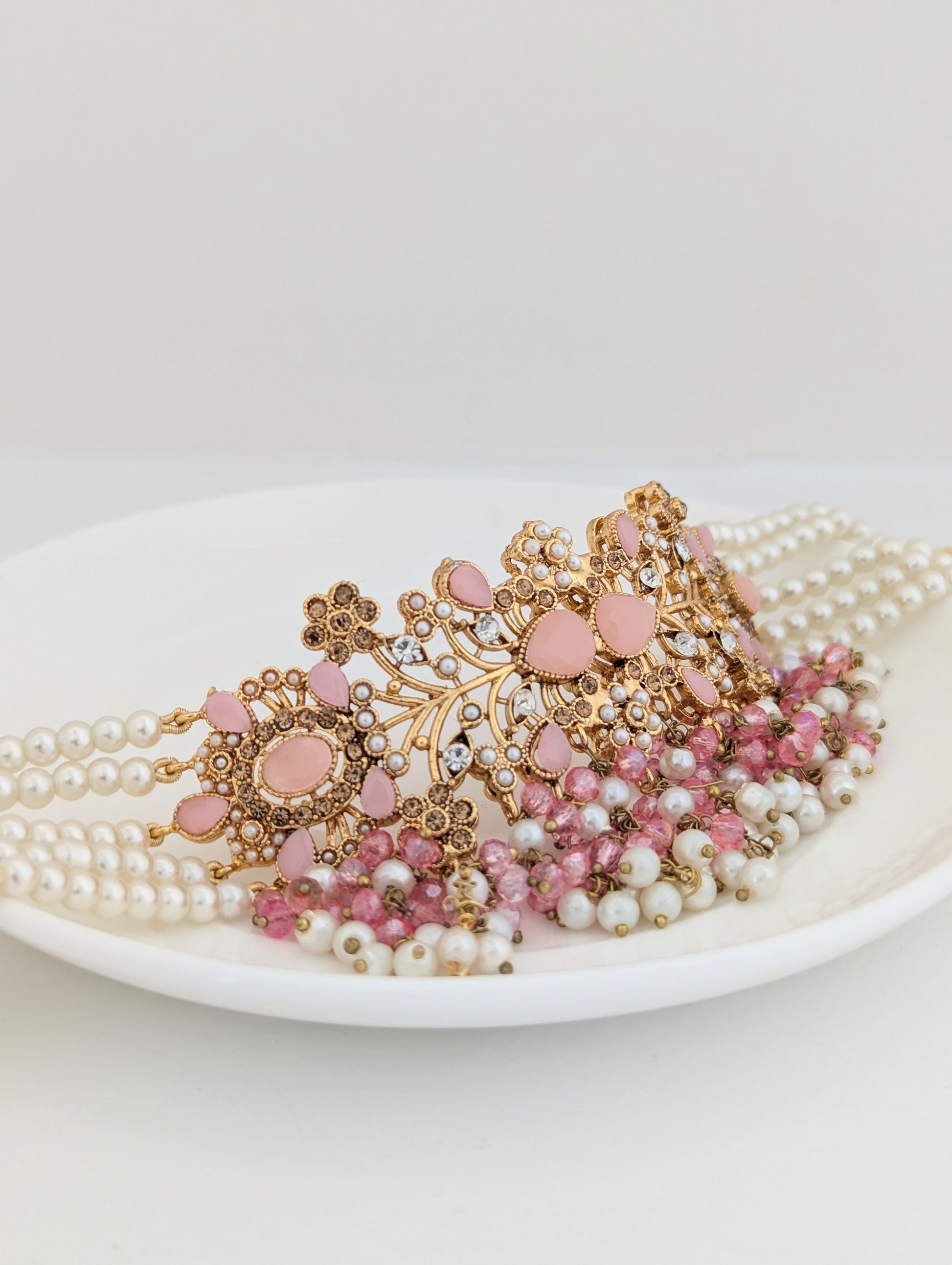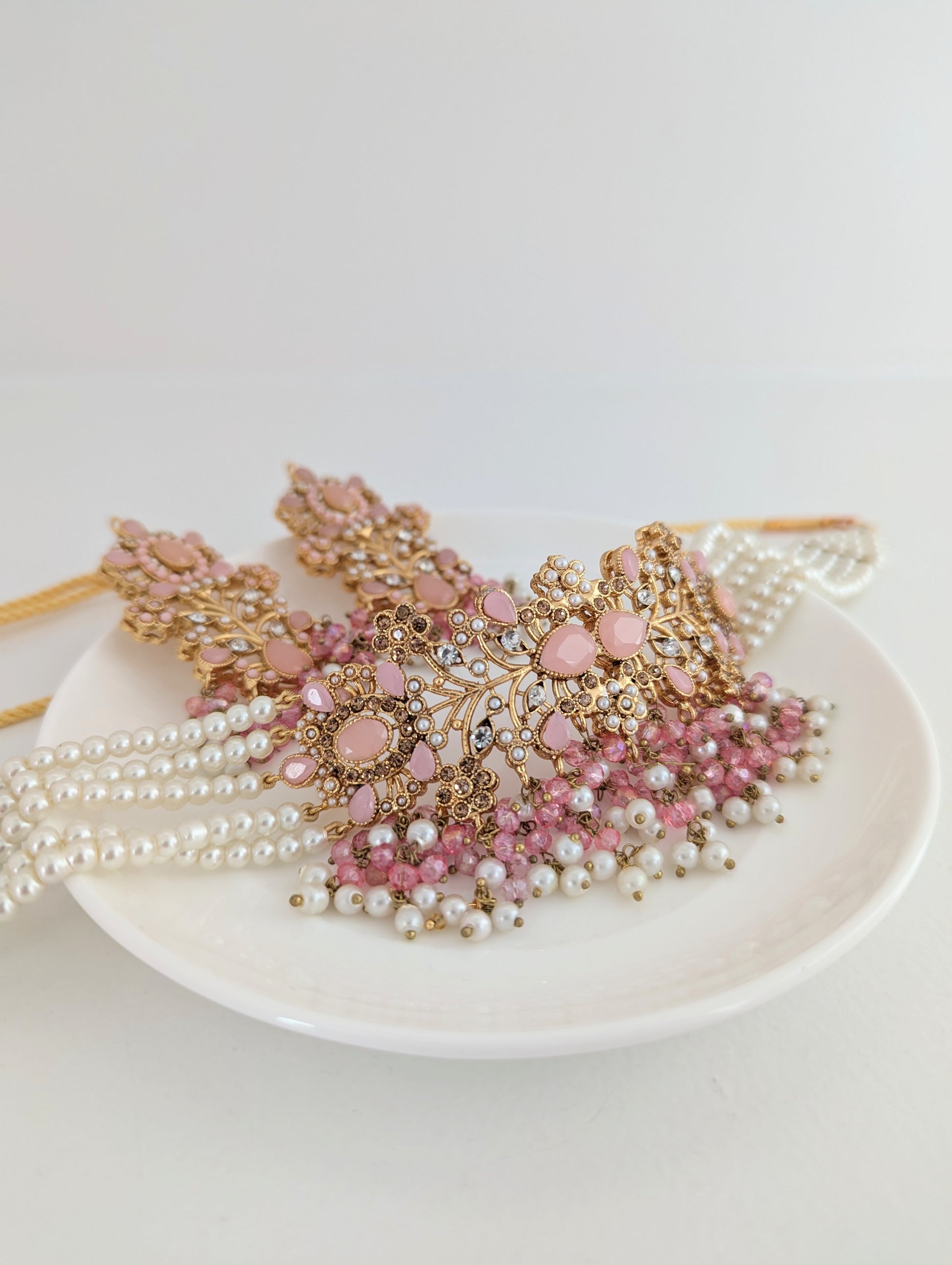 This jewelry set features a beautifully intricate design with gold-toned metalwork, adorned with soft pink gemstones and delicate white pearls. The floral and vine-like patterns, embellished with small crystal accents, give it an elegant and regal look. The cascading pearl and pink bead detailing adds a touch of sophistication, making it perfect for traditional or festive occasions.