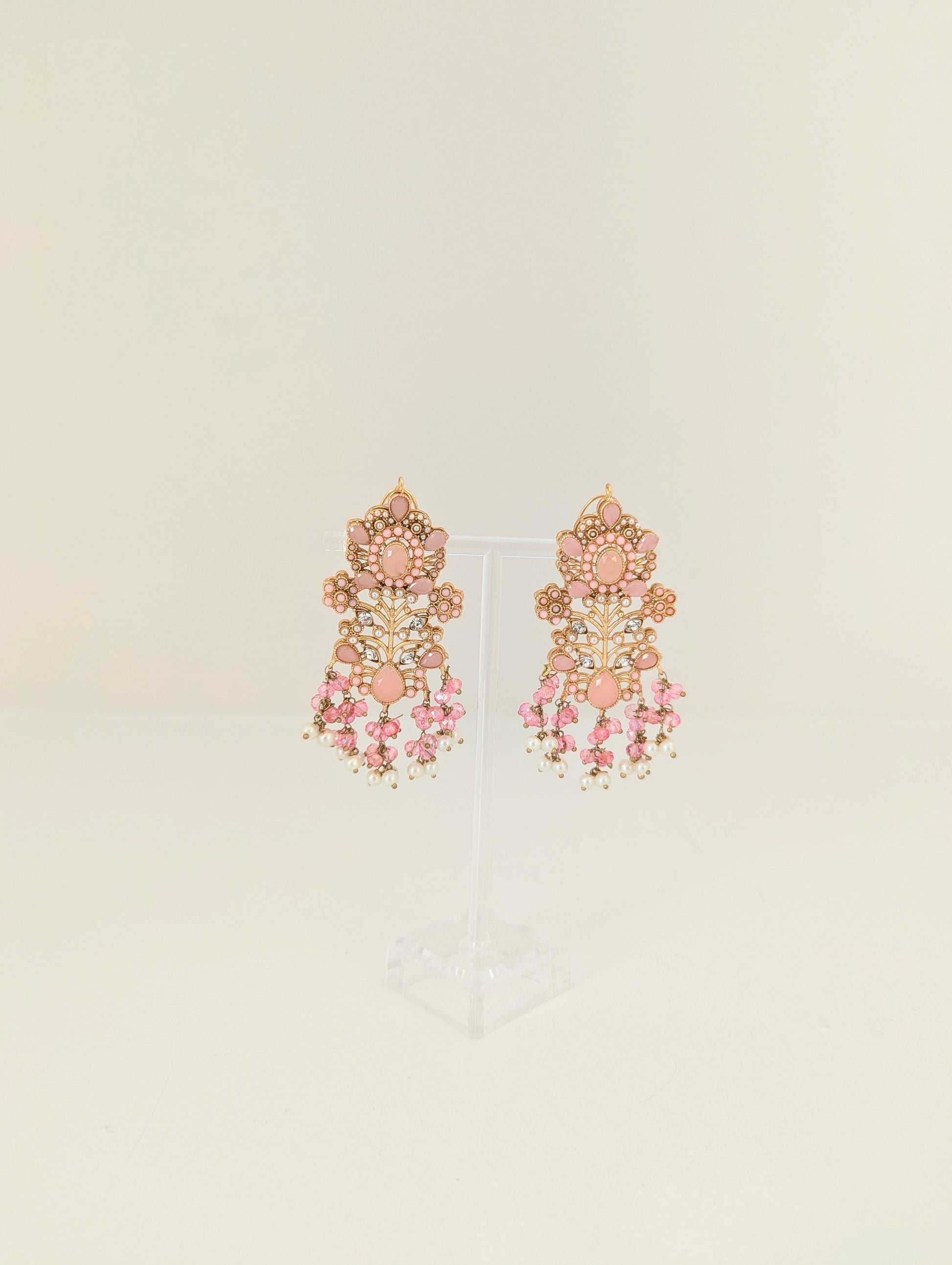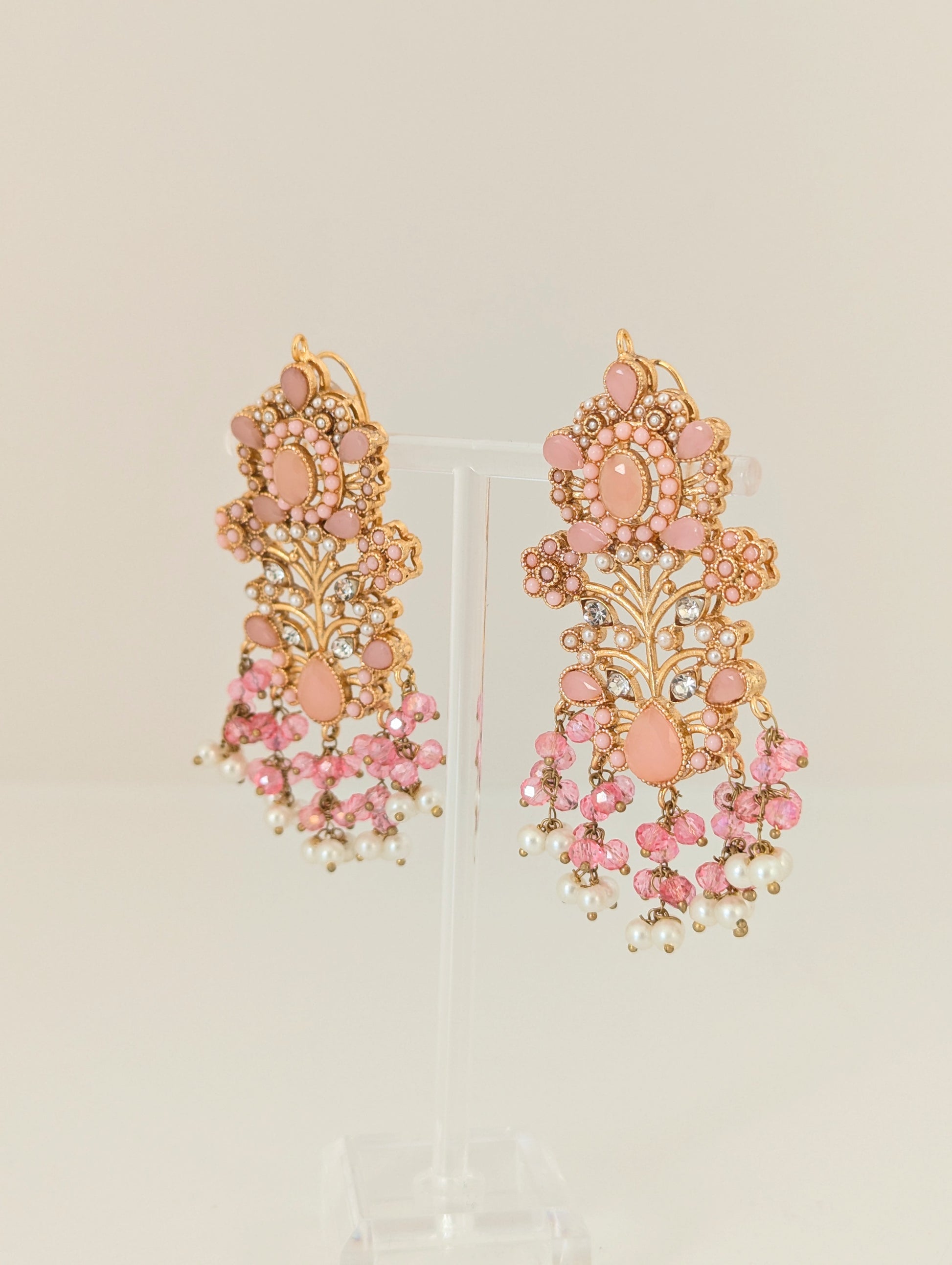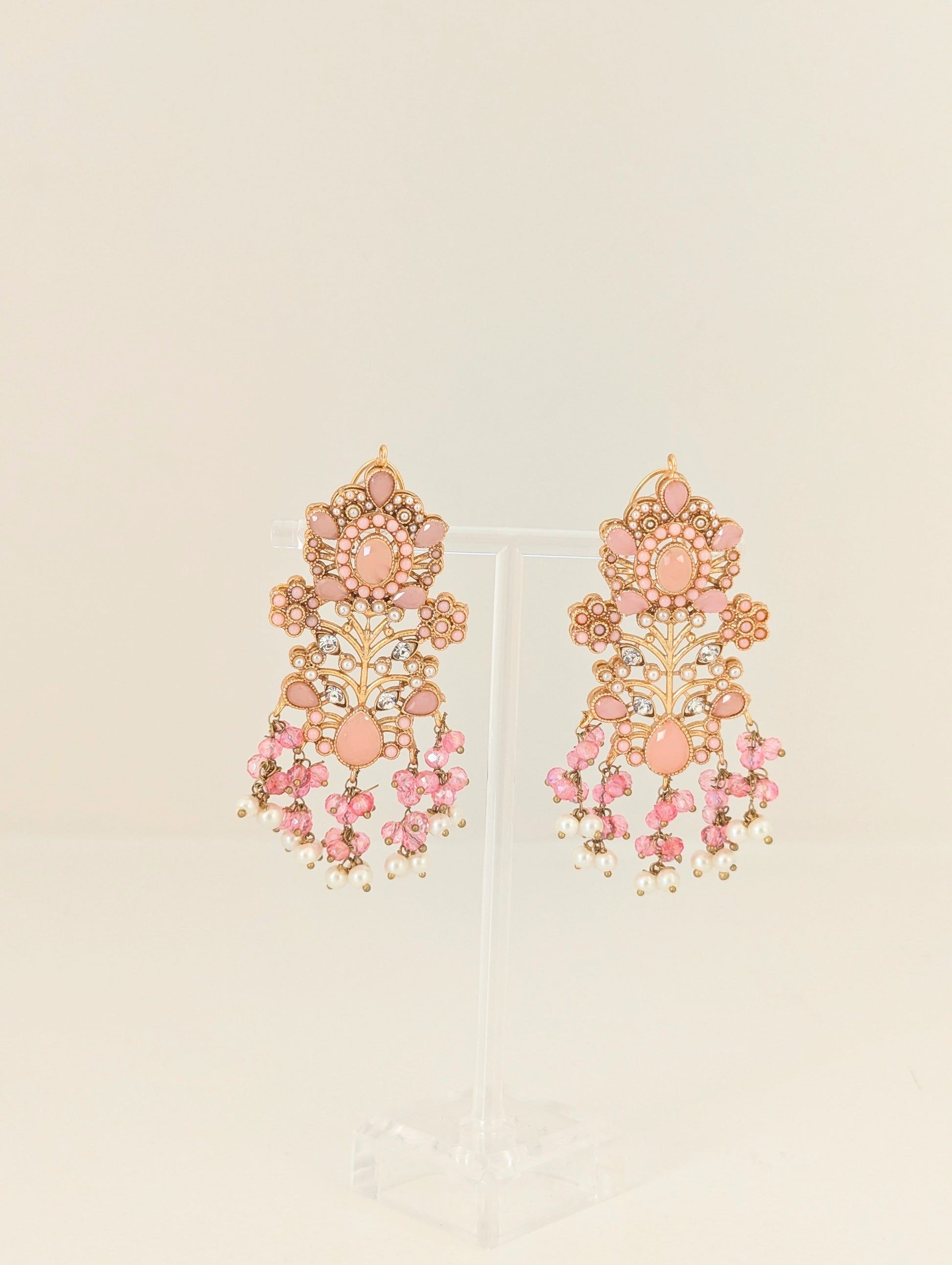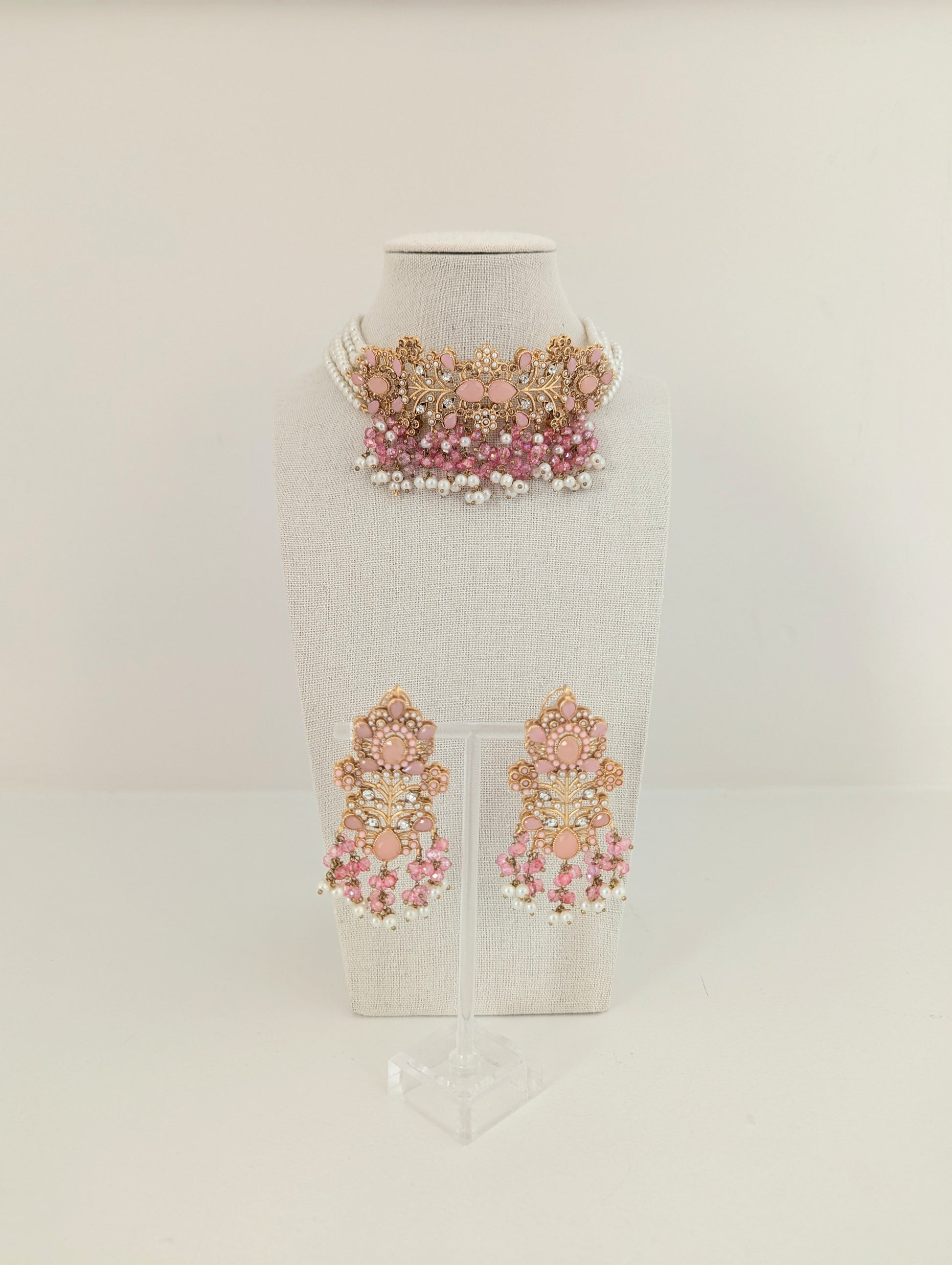 This jewelry set features a beautifully intricate design with gold-toned metalwork, adorned with soft pink gemstones and delicate white pearls. The floral and vine-like patterns, embellished with small crystal accents, give it an elegant and regal look. The cascading pearl and pink bead detailing adds a touch of sophistication, making it perfect for traditional or festive occasions.