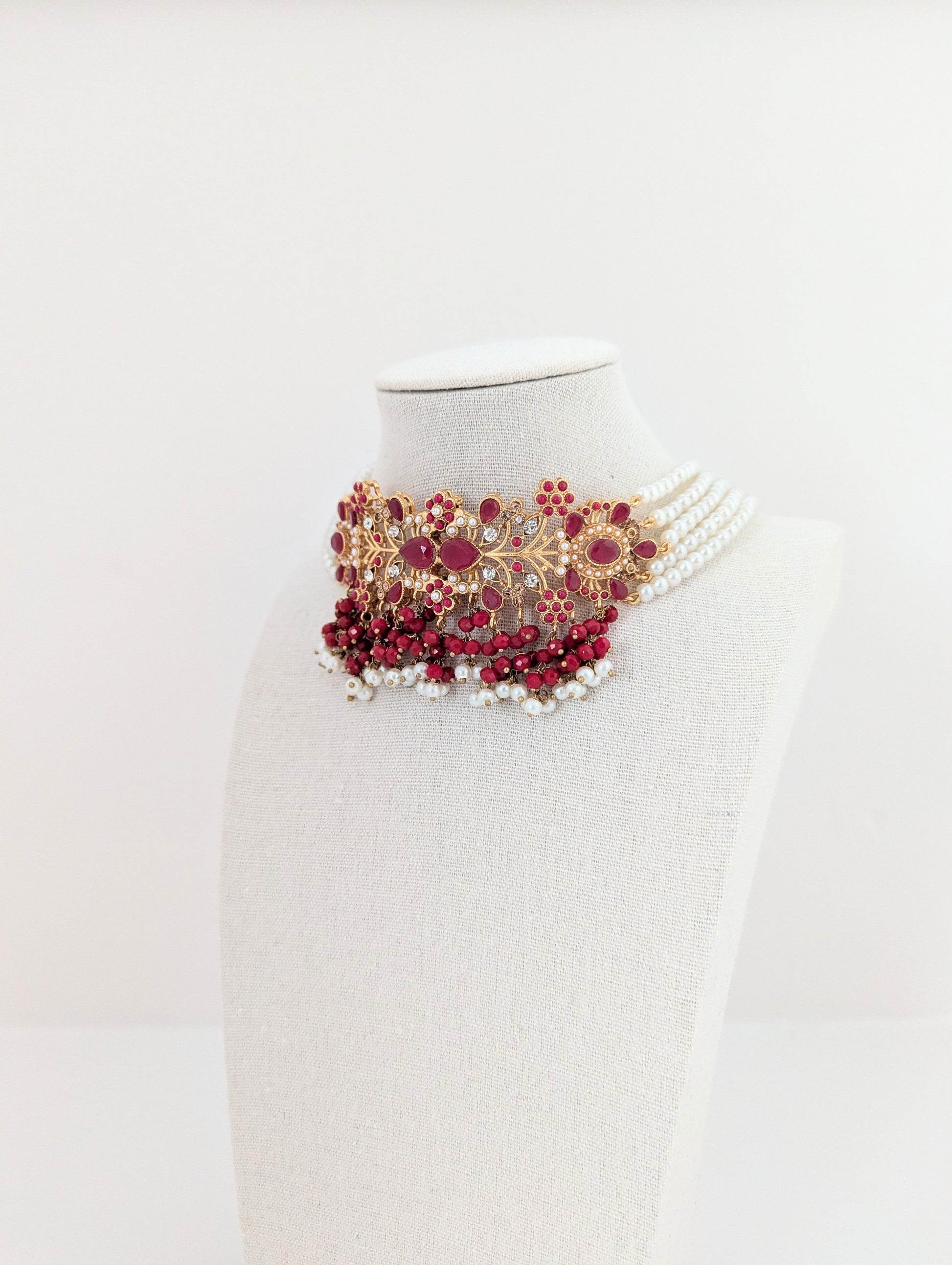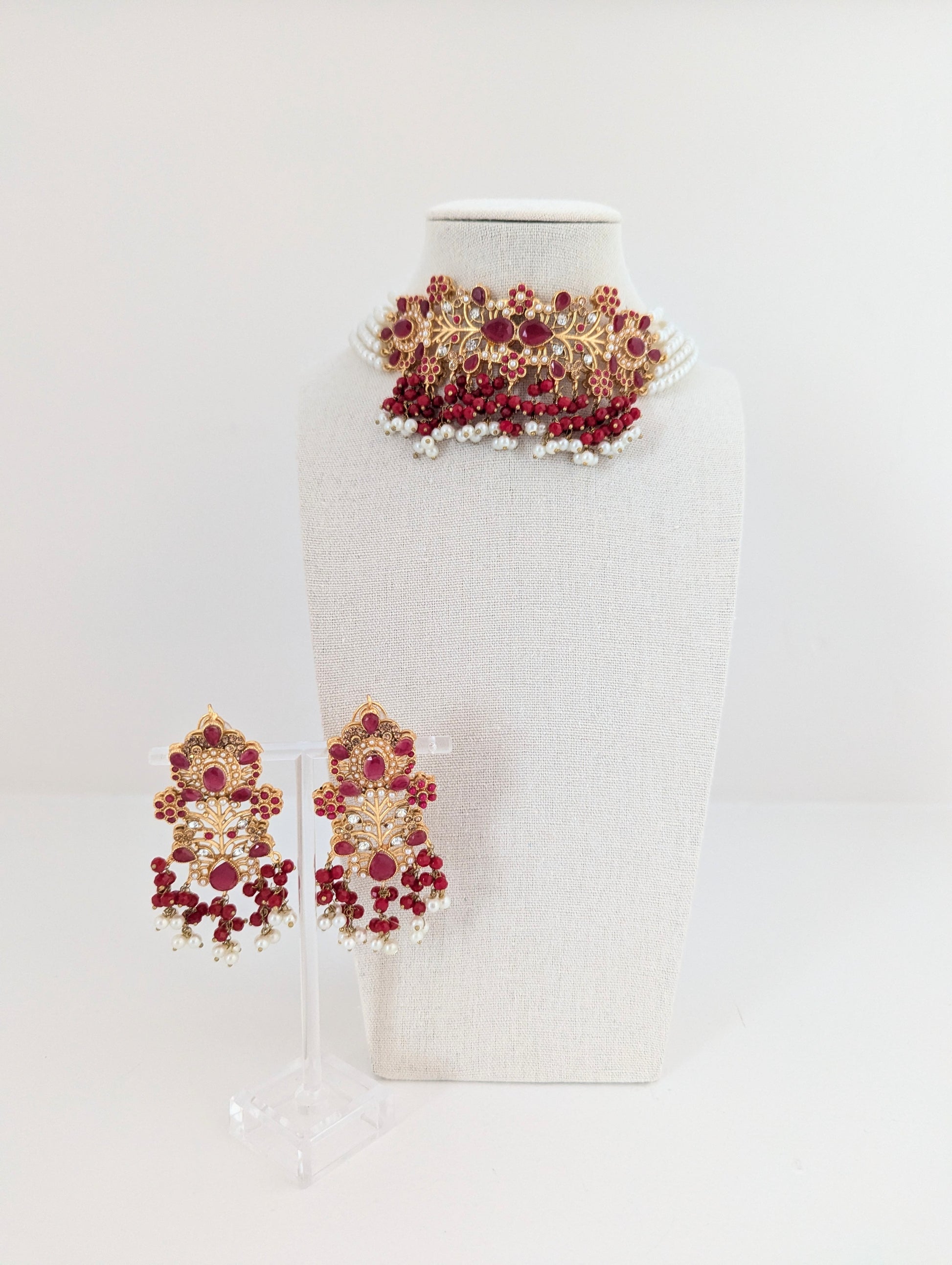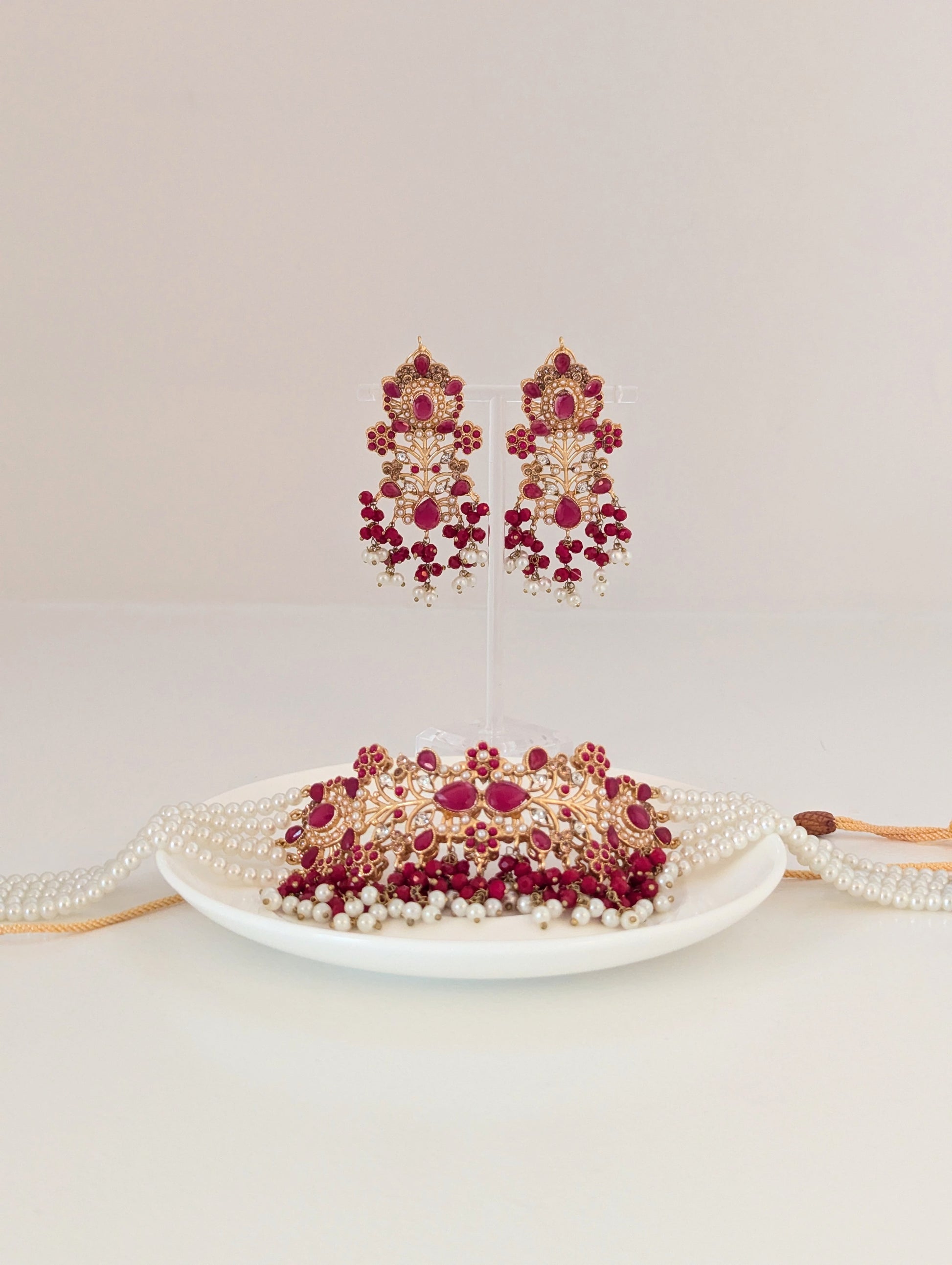 This jewelry set consists of a pair of intricate gold-toned chandelier earrings and a matching choker necklace. The pieces are adorned with deep red gemstones, and small white pearls. The design features floral and vine motifs, giving it a regal and traditional aesthetic. The choker has pearl strands extending on either side, adding elegance and structure. The combination of red and white elements enhances its rich, festive appeal, making it ideal for special occasions.