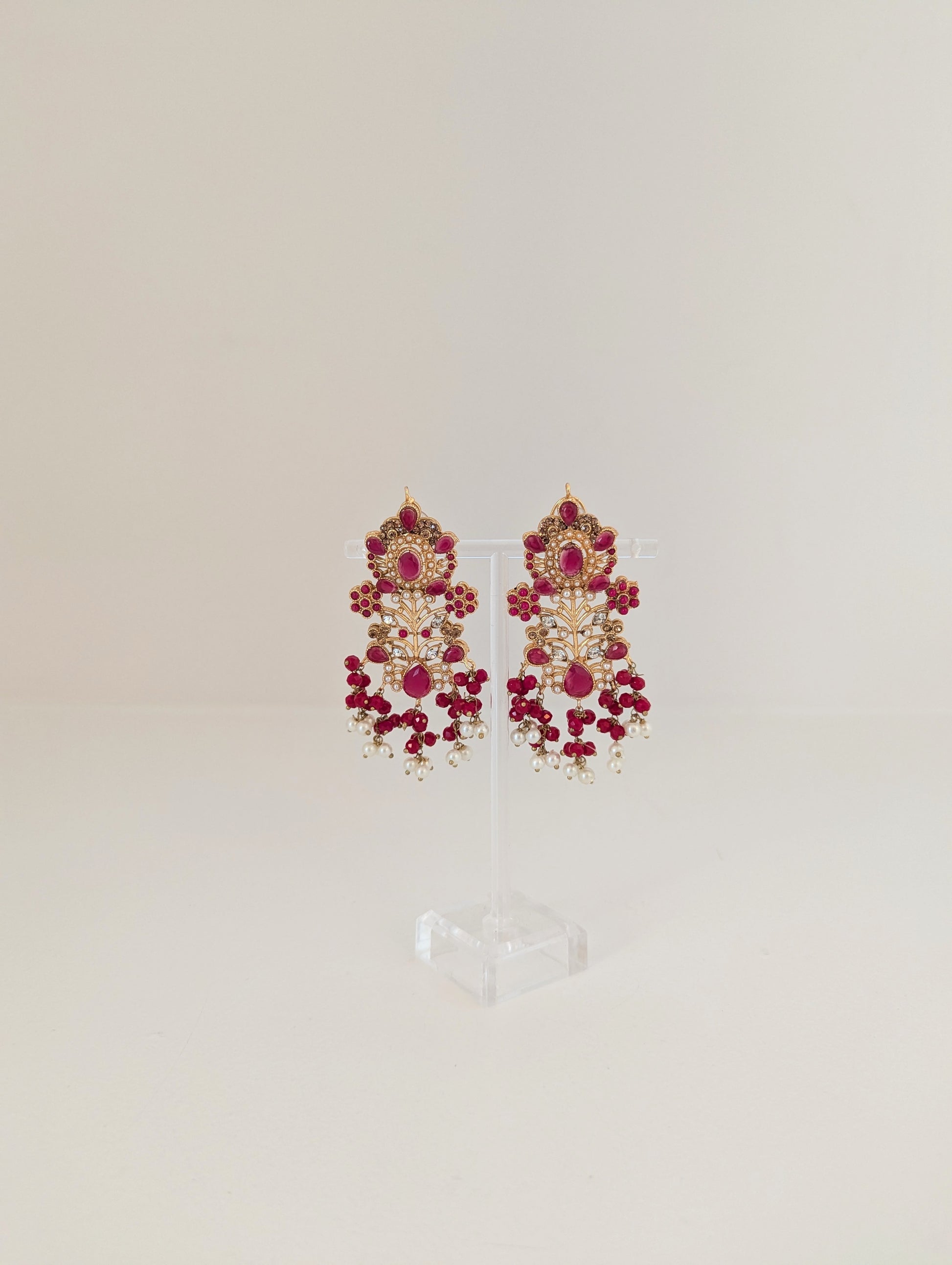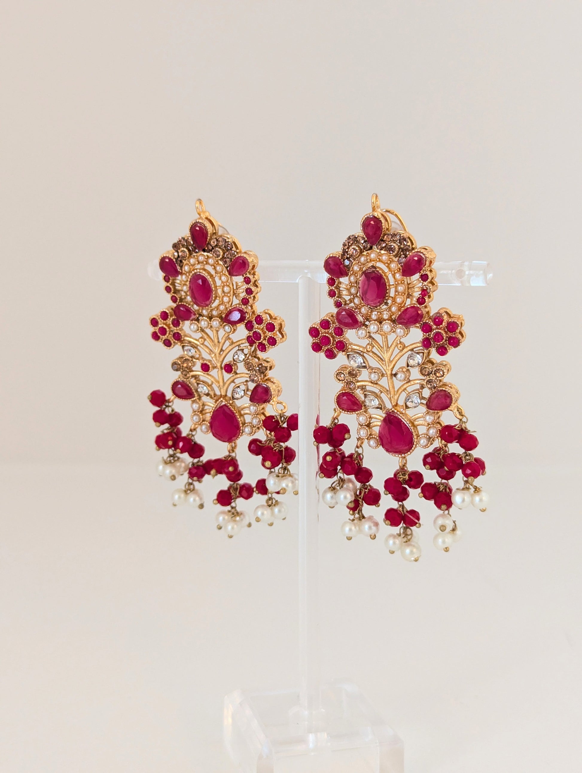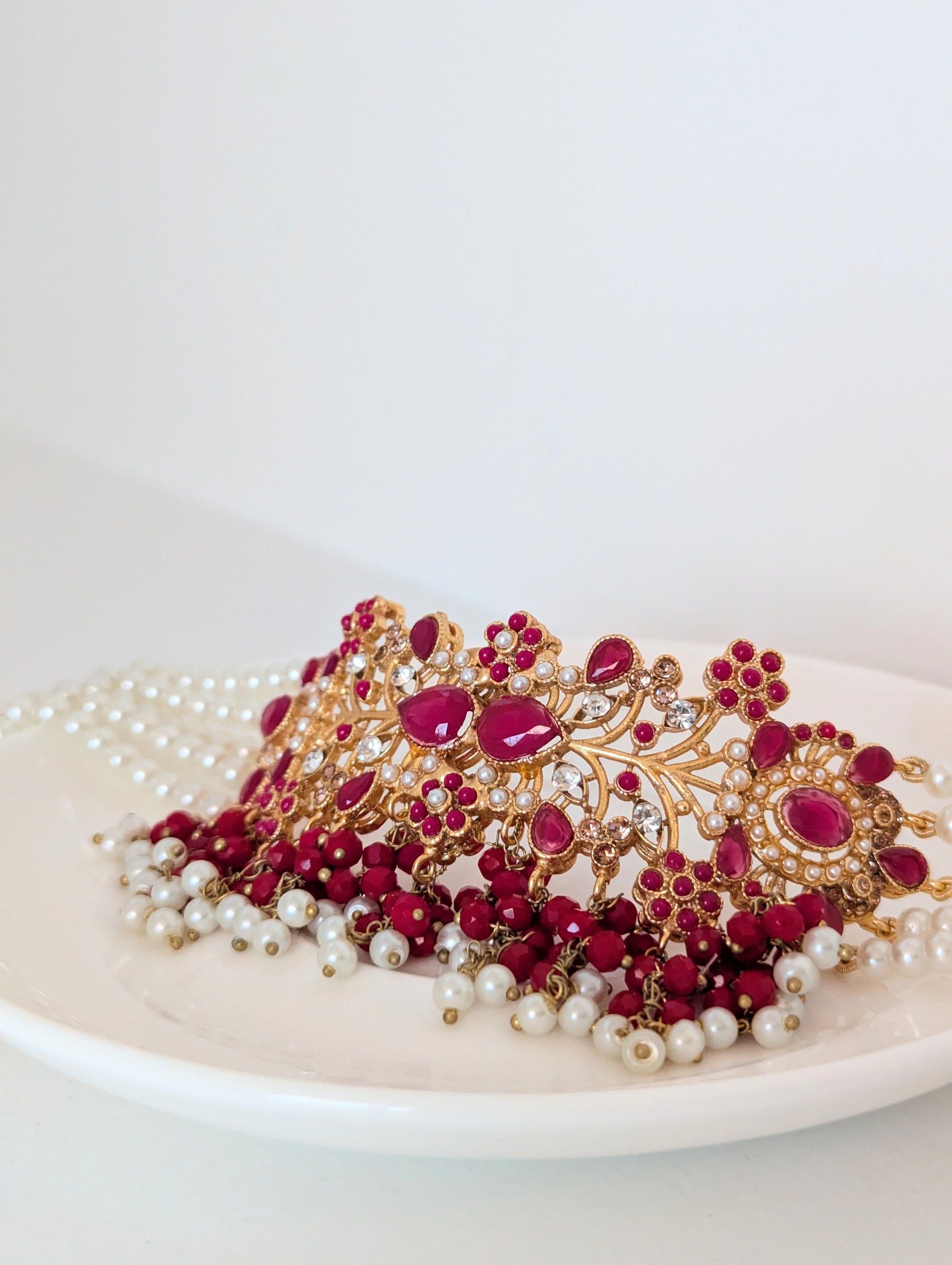 This jewelry set consists of a pair of intricate gold-toned chandelier earrings and a matching choker necklace. The pieces are adorned with deep red gemstones, and small white pearls. The design features floral and vine motifs, giving it a regal and traditional aesthetic. The choker has pearl strands extending on either side, adding elegance and structure. The combination of red and white elements enhances its rich, festive appeal, making it ideal for special occasions.