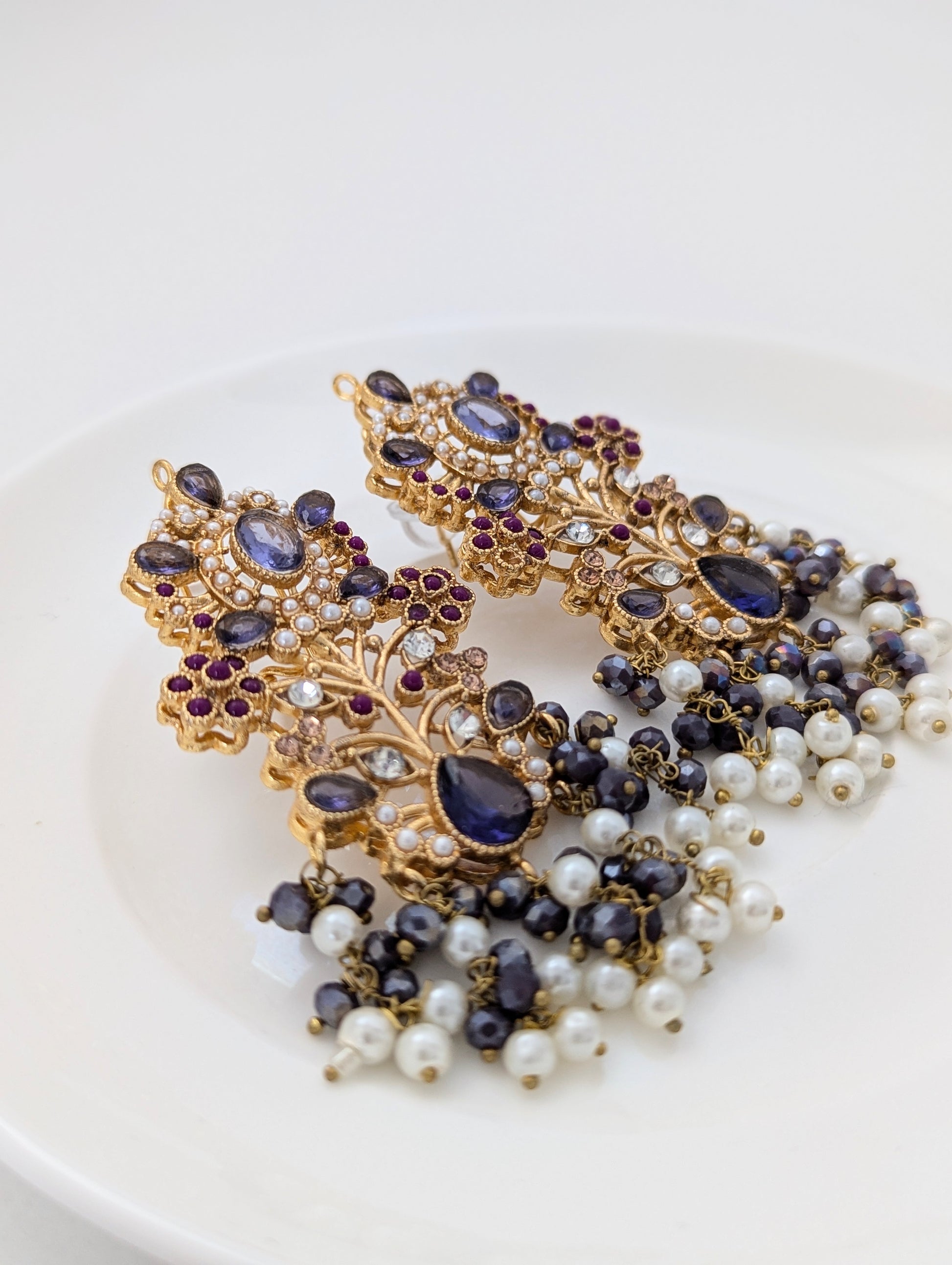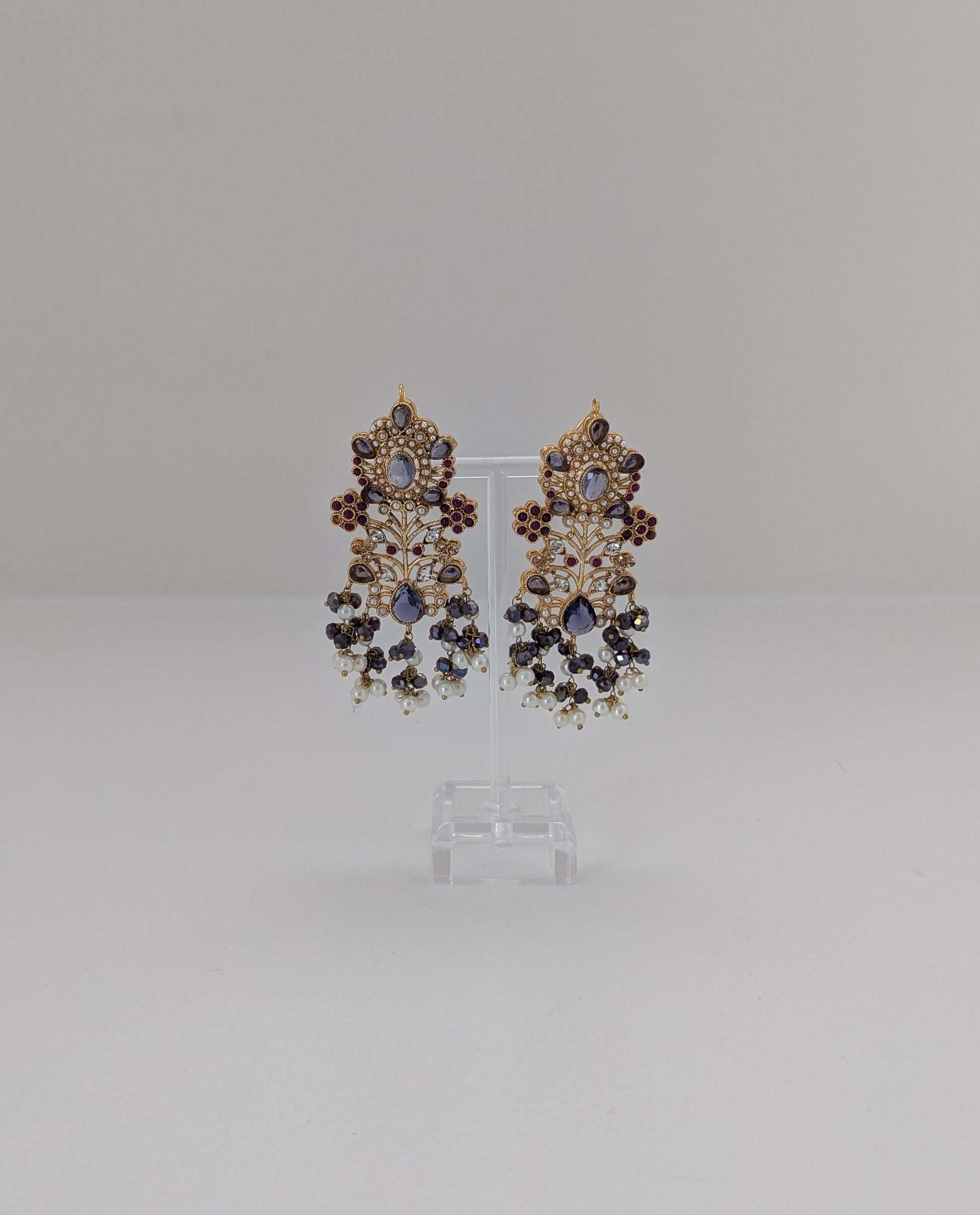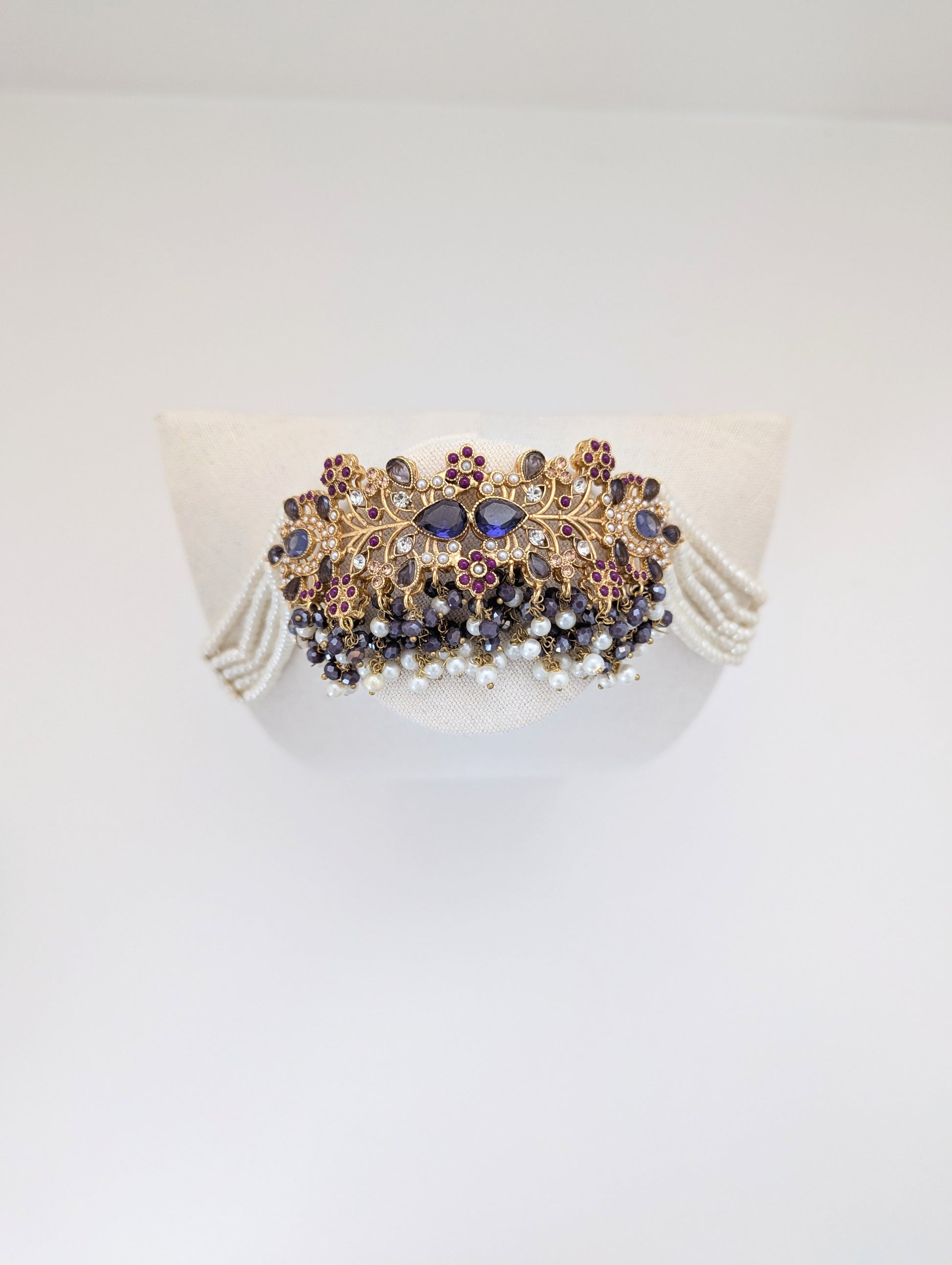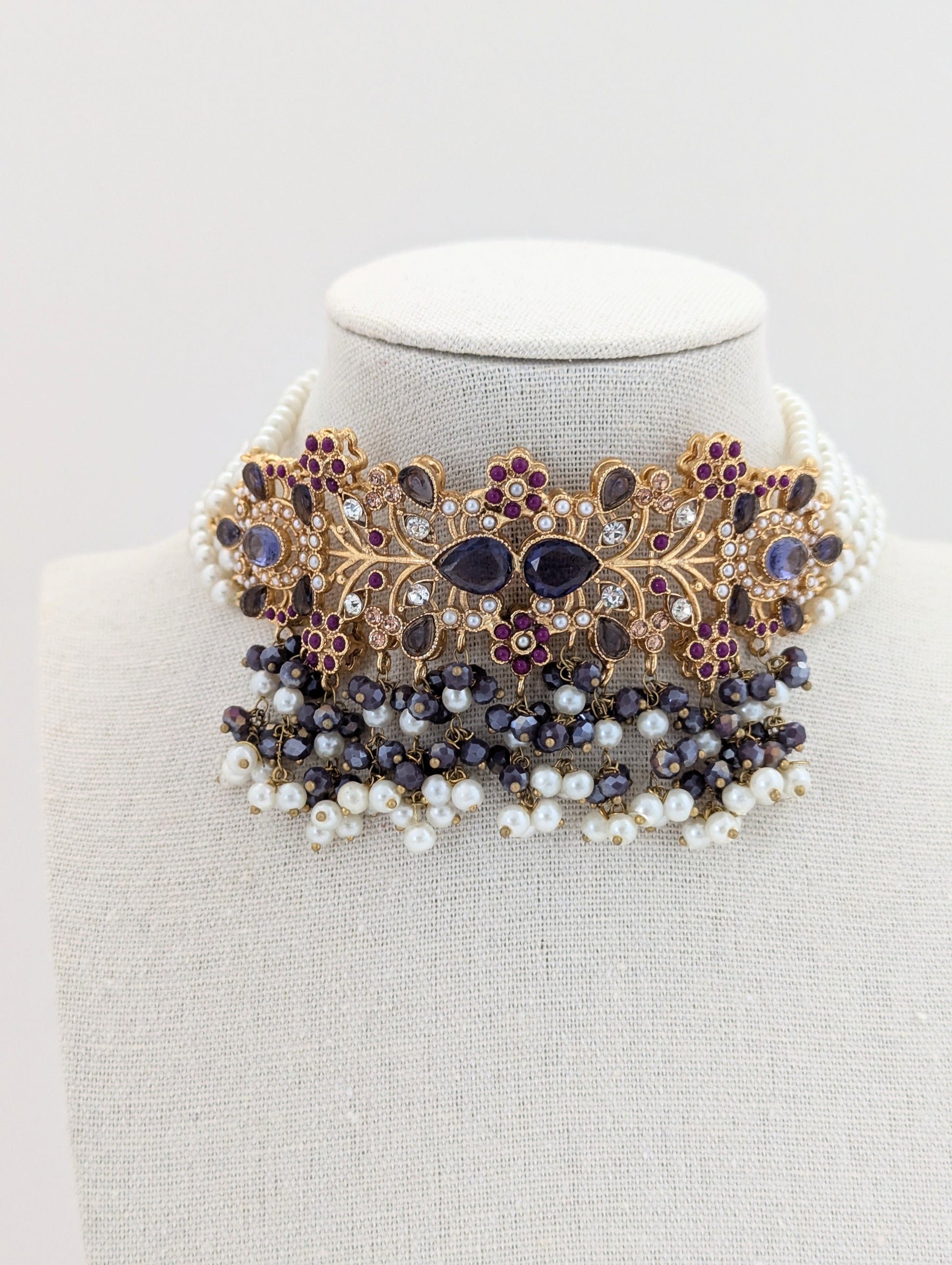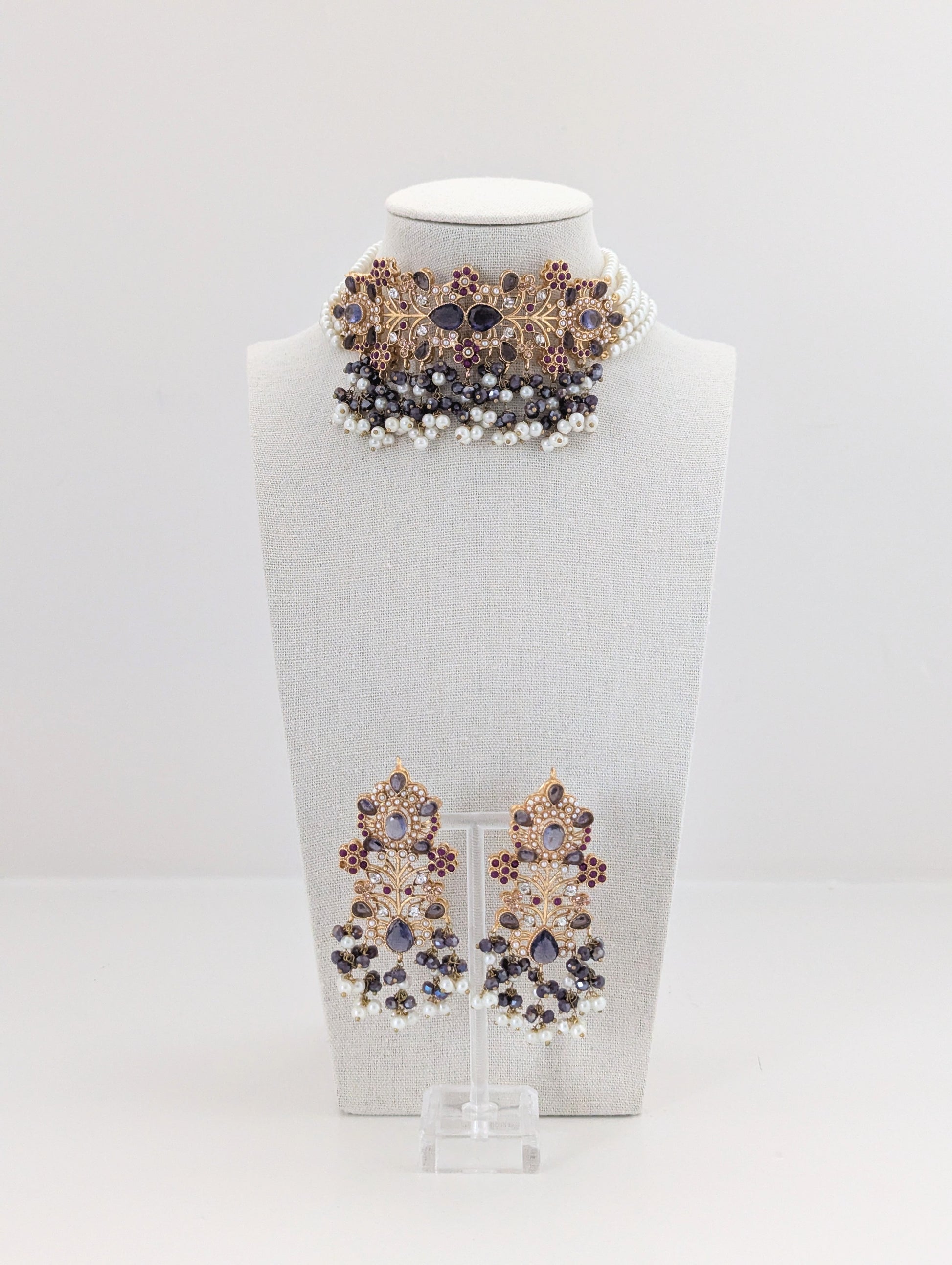 The set features a combination of gold, purple, ruby red, white pearls, and dark gray beads, giving it a regal and elegant appearance.