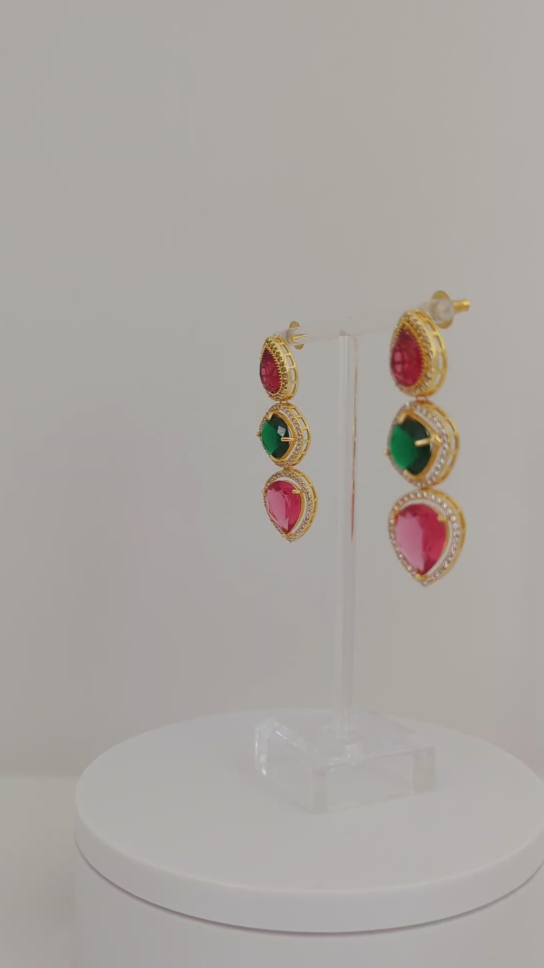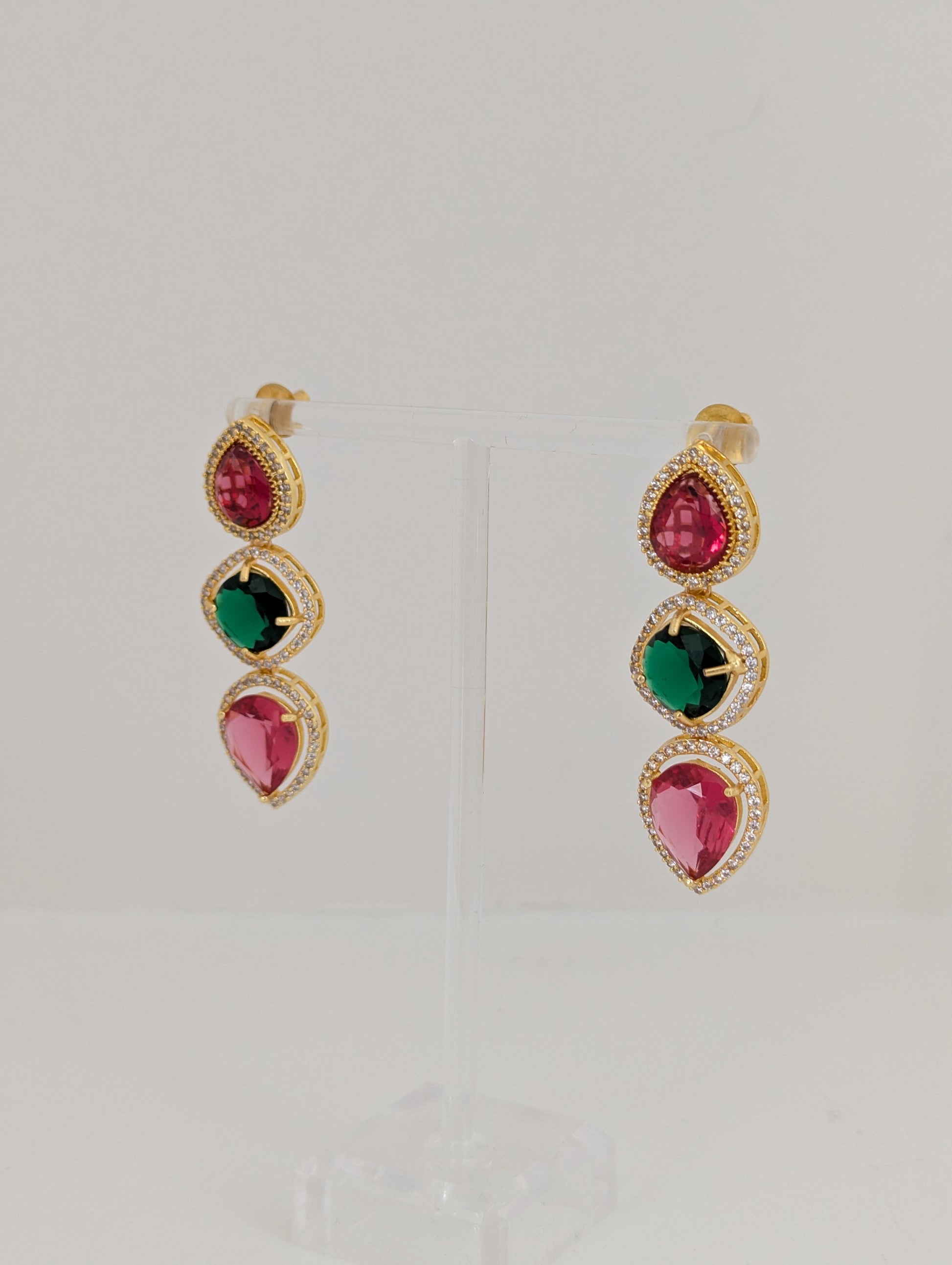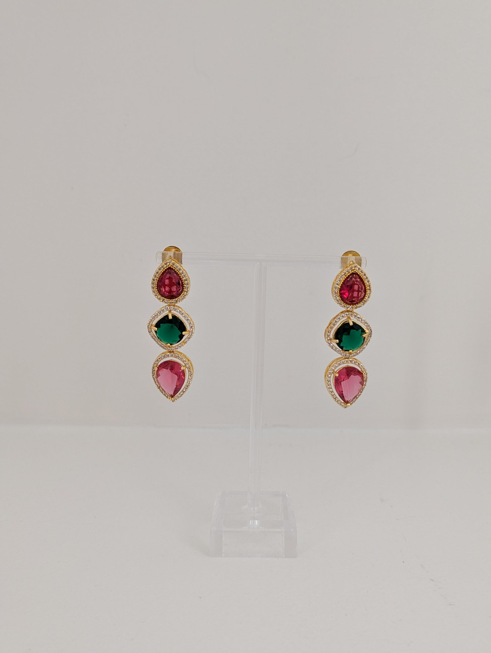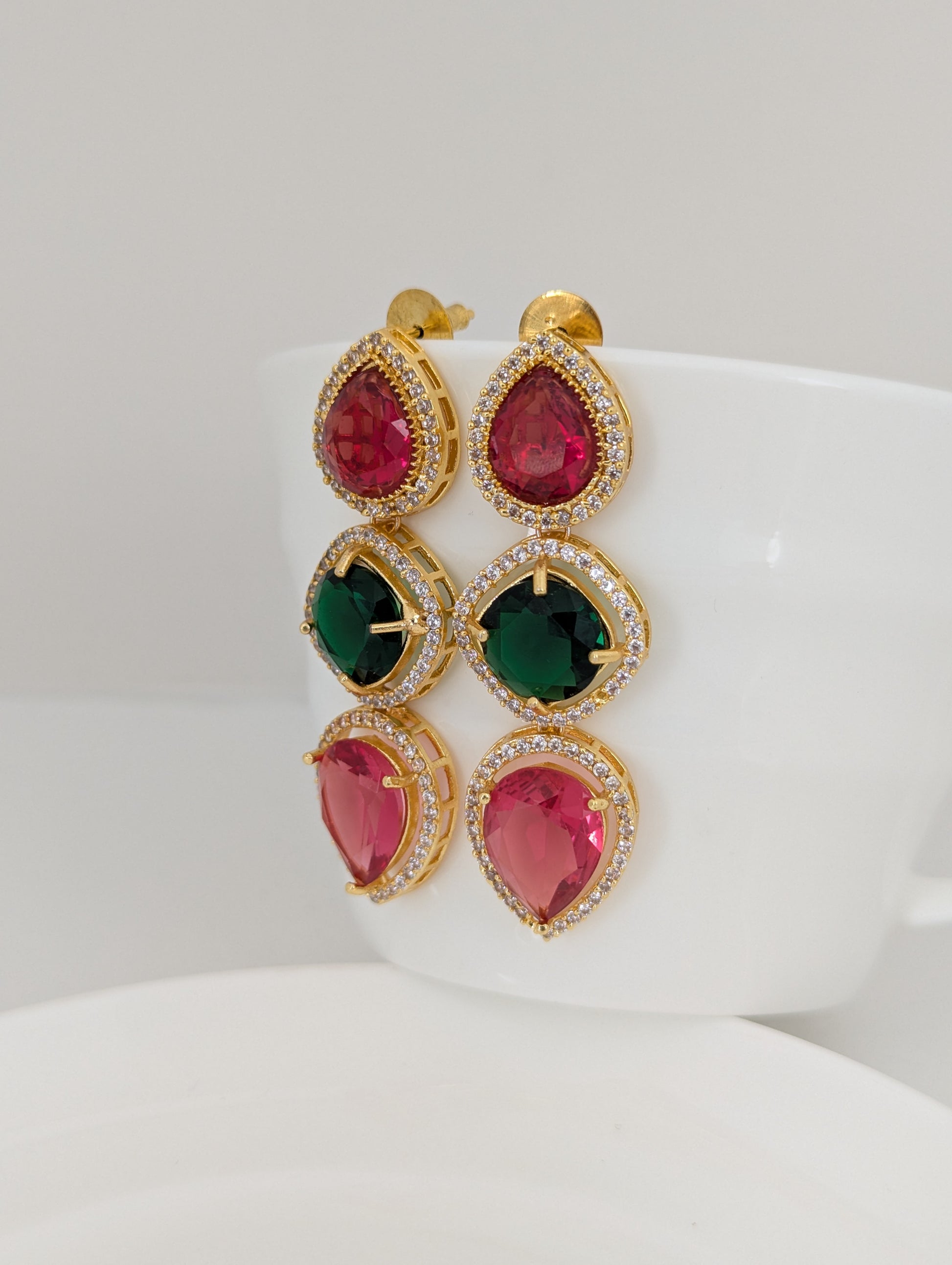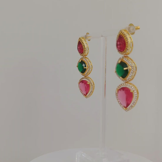 These elegant earrings feature a trio of teardrop and round-cut stones in rich ruby red, deep emerald green, and vibrant fuchsia hues. Each gem is framed with a halo of delicate white stones, all set in a lustrous gold base that enhances their brilliance. A perfect blend of bold color and timeless sophistication, these earrings add a regal touch to any look.