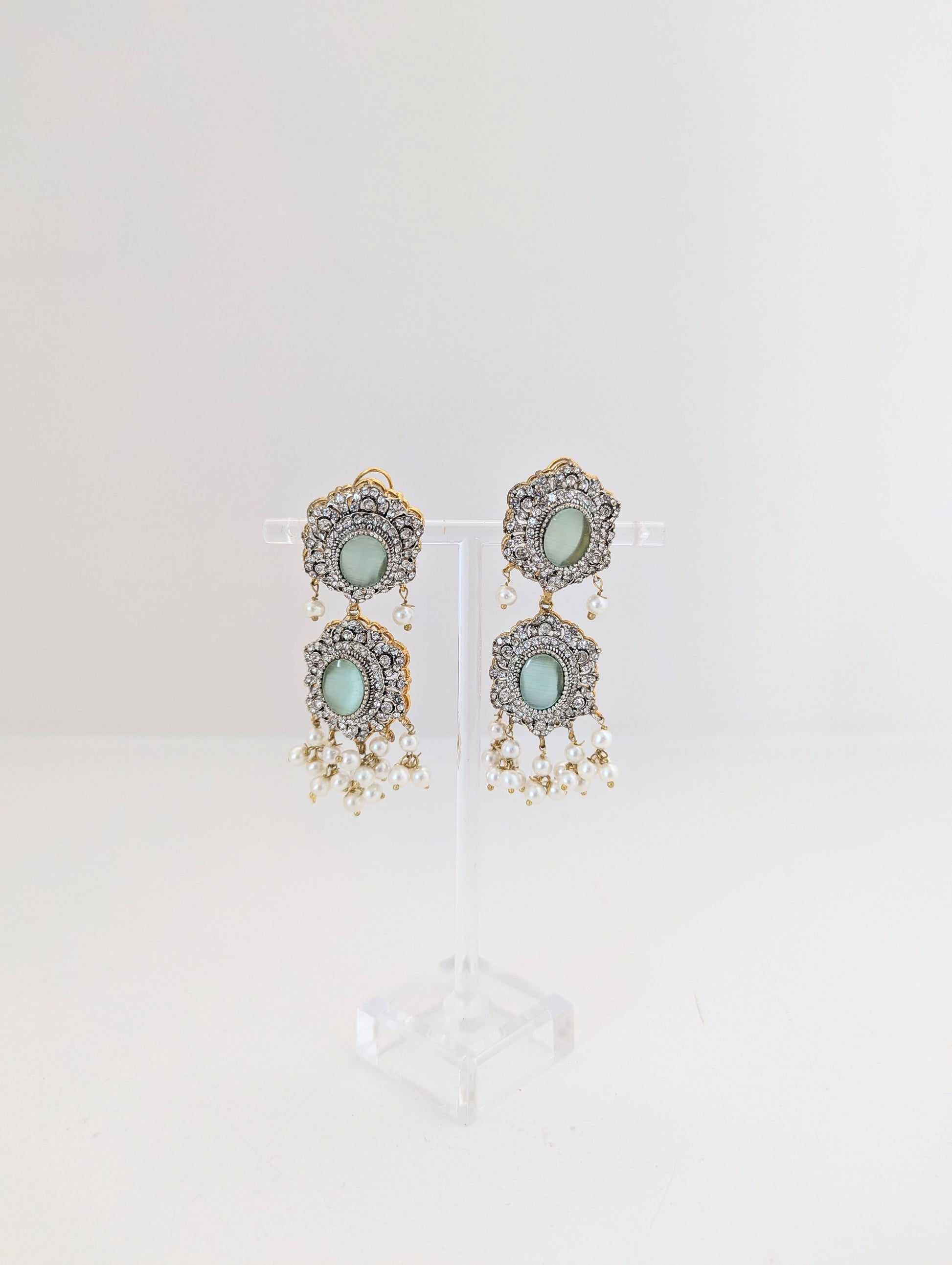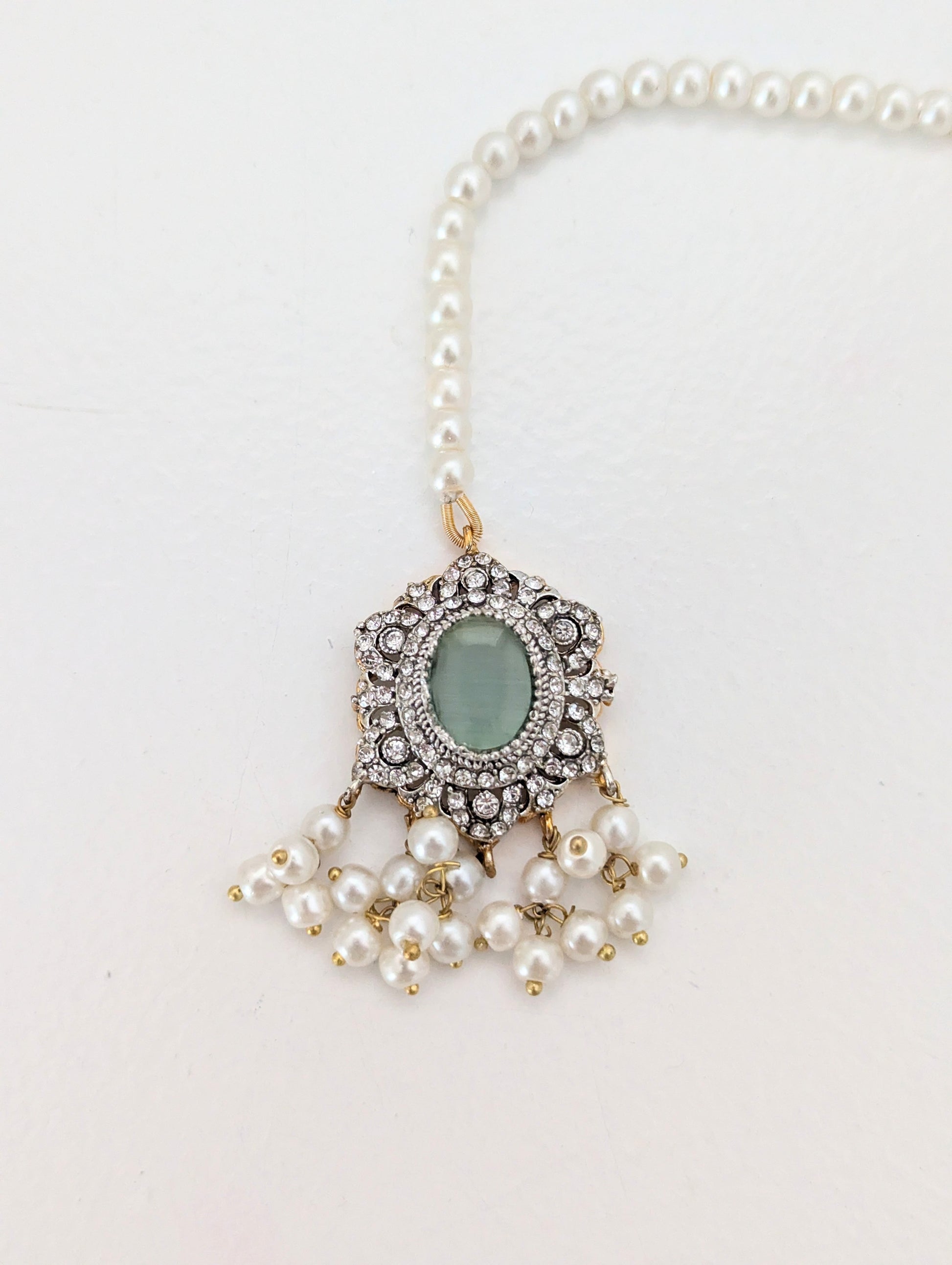 These elegant earrings and tikka feature soft mint-green oval stones at their center, surrounded by intricate crystal detailing in a floral-inspired design. The pieces are adorned with delicate dangling pearl beads, adding a graceful touch. Perfect for traditional or festive occasions, they exude timeless charm.